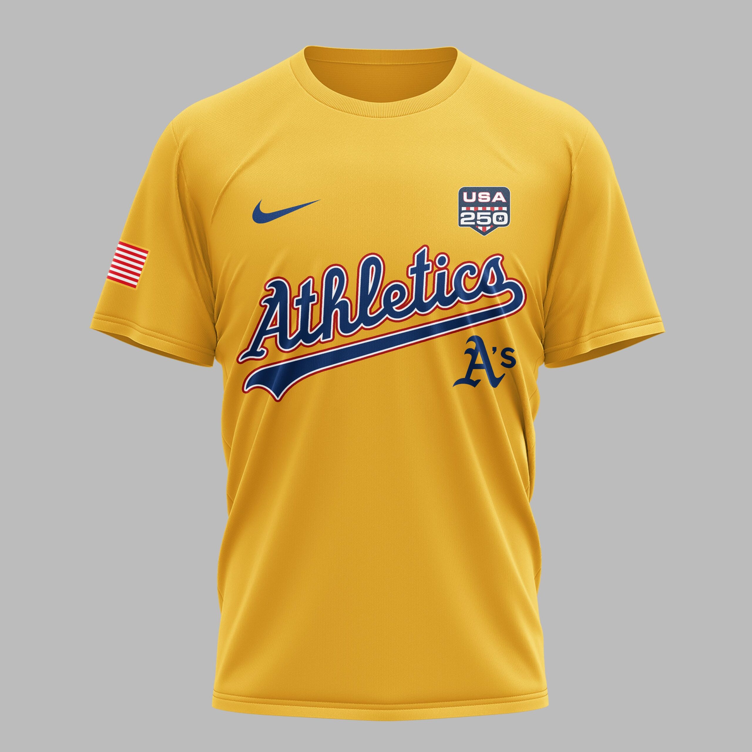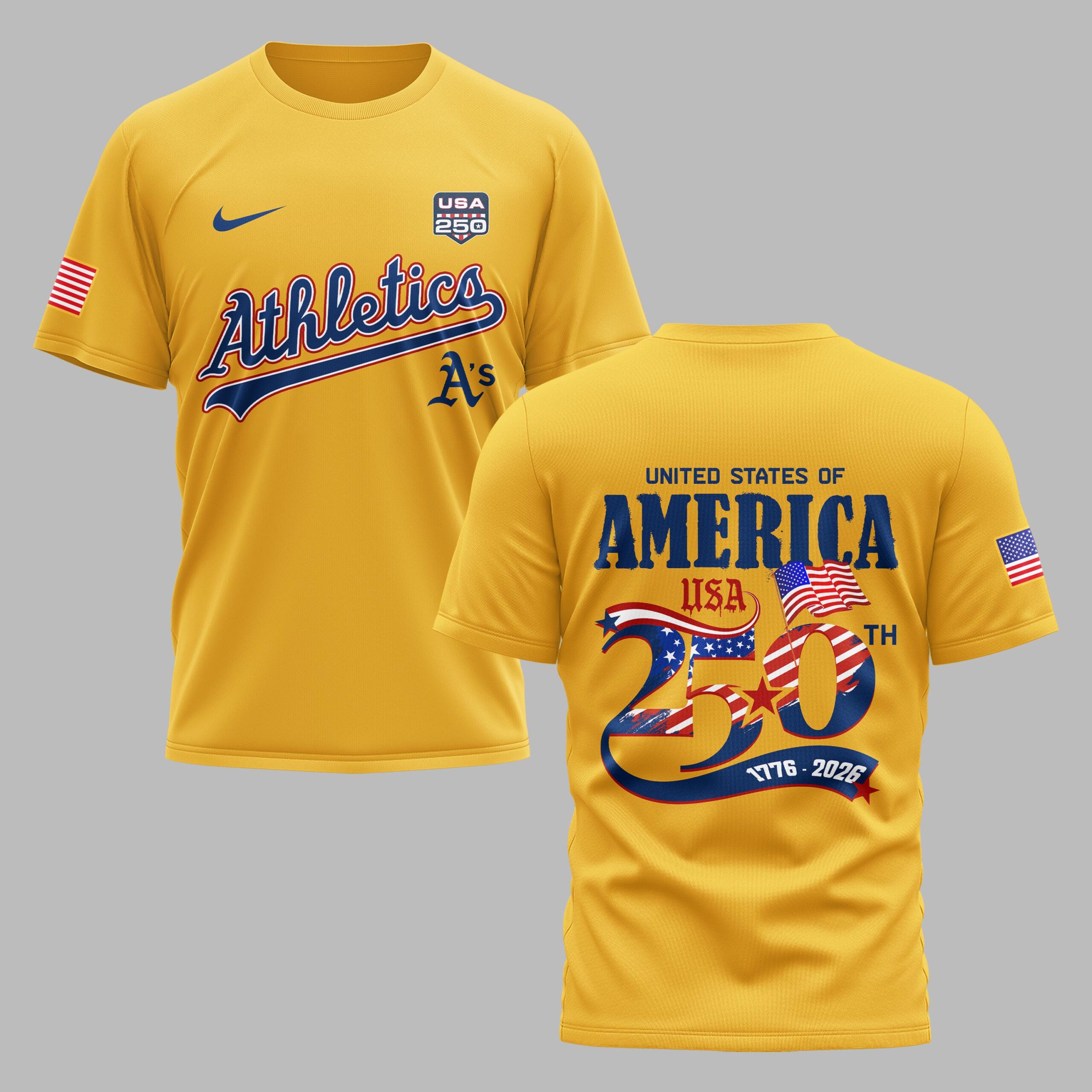 Athletics fans, get ready to celebrate a historic milestone in style. This Athletics USA 250 Independence T-Shirt is the ultimate tribute to both your favorite team and the nation’s semiquincentennial. Designed for fans who value tradition and national pride, this shirt combines the classic spirit of baseball with a bold, patriotic aesthetic that stands out in any crowd. The front showcases the legendary Athletics script and A’s logo, complemented by a USA 250 patch and an American flag on the sleeve. The back is a true showstopper, featuring a large United States of America graphic and a star-spangled 250th commemorative design marking the years 1776 to 2026. The vibrant red, white, and blue elements pop brilliantly against the team’s signature green background. This is the perfect choice for game days at the ballpark, Independence Day celebrations, or everyday wear for any proud supporter. Show off your Athletics loyalty while honoring 250 years of American history.