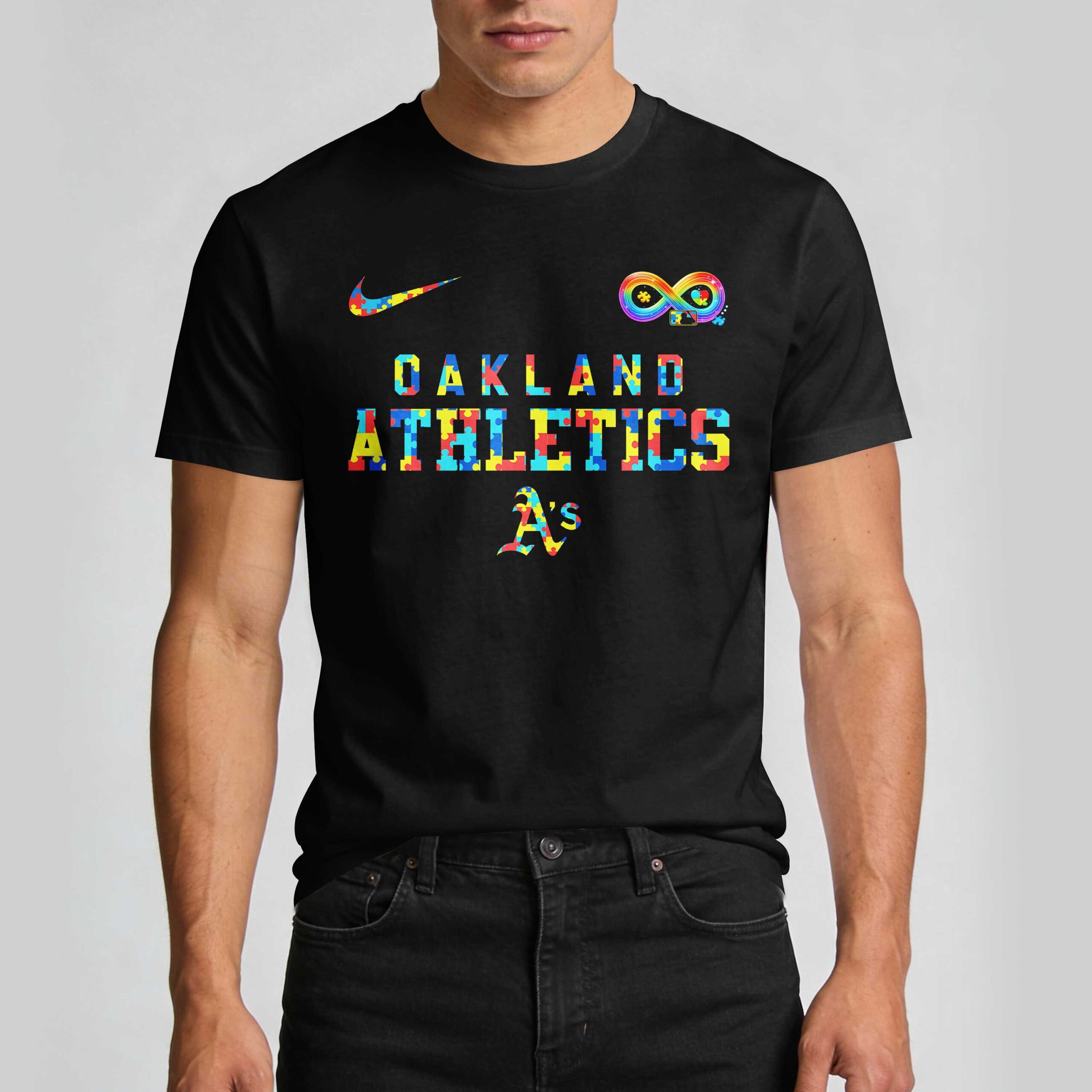 Celebrate your Oakland Athletics pride and show your unwavering support for autism awareness with this unique fan shirt. It’s more than just game day apparel; it’s a heartfelt statement of acceptance and love, blending vibrant team spirit with a meaningful cause that truly matters. The front proudly displays OAKLAND ATHLETICS and the iconic A’s logo, both featuring a striking puzzle piece pattern, symbolizing autism awareness. Accompanying this is a colorful infinity symbol and a puzzle-piece Nike swoosh, adding a powerful visual touch. On the back, ACCEPT. UNDERSTAND. LOVE. is boldly printed, alongside an adorable elephant mascot in a baseball uniform, also adorned with the distinctive puzzle piece design, ready to hit a home run for inclusion. Perfect for game days at the stadium, casual outings, or community events, this shirt lets you represent your favorite team while championing a cause close to many hearts. Wear it to show solidarity, spread positivity, and connect with fellow fans and advocates alike, all with a touch of spirited team pride.
