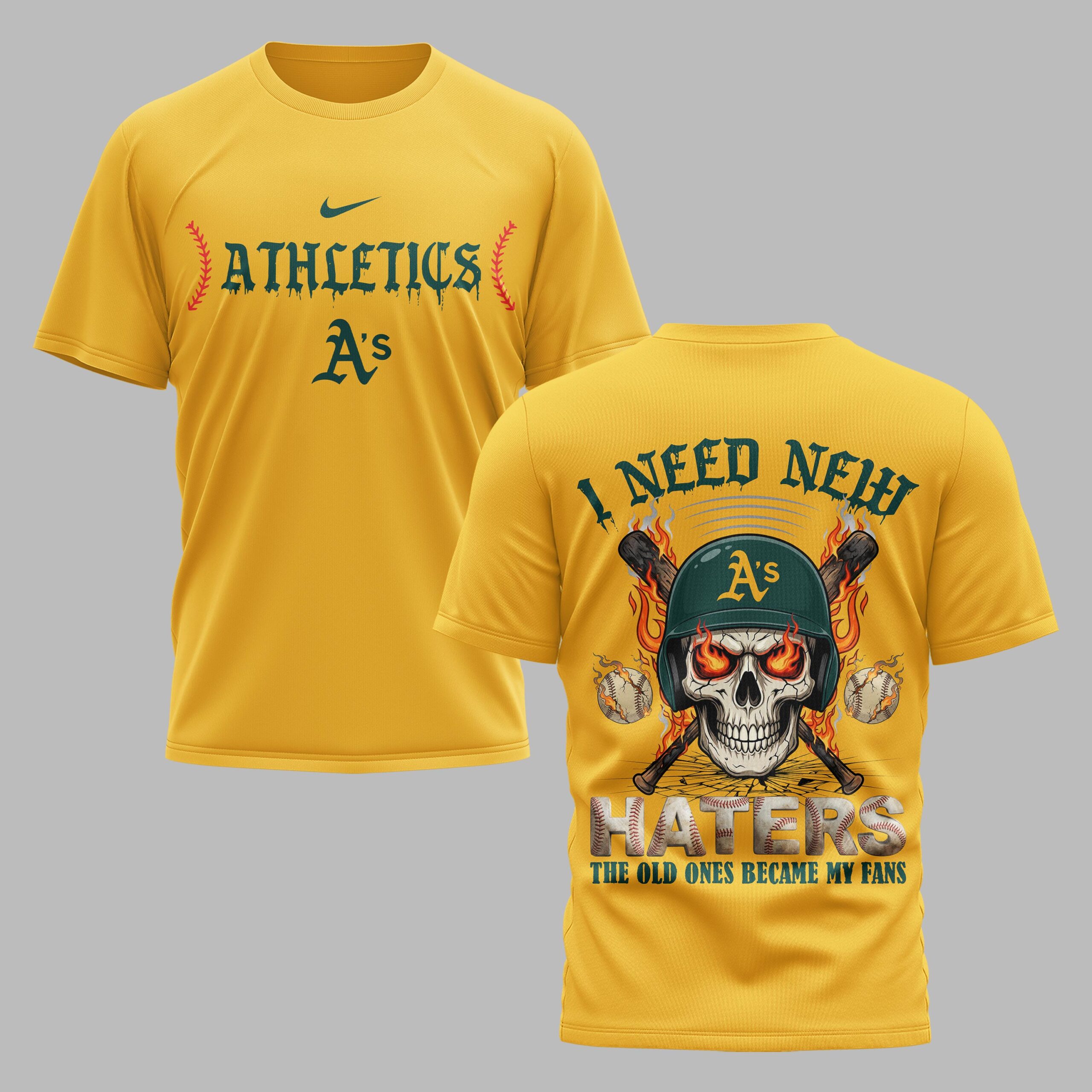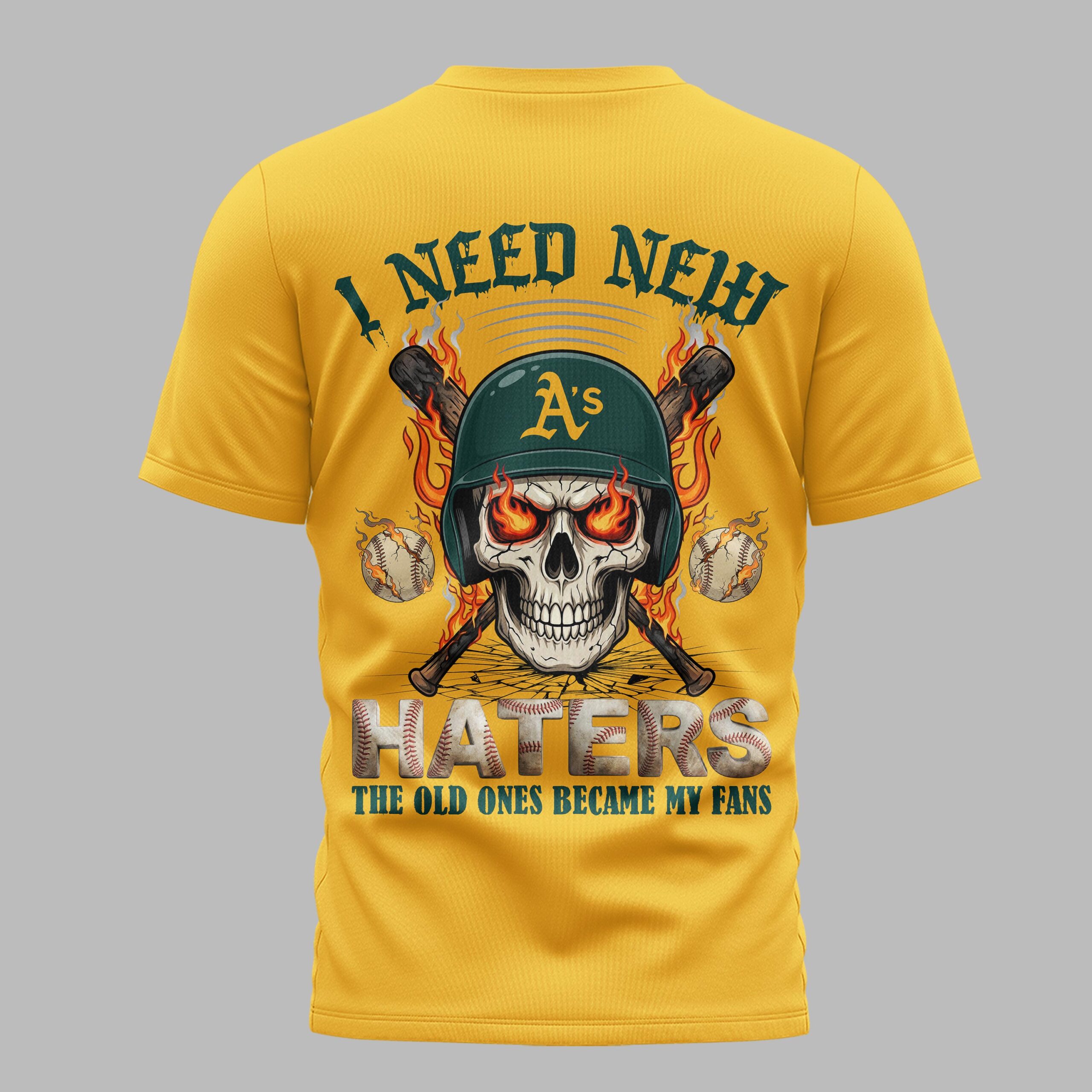 Unleash your ultimate team spirit with this bold Athletics A’s fan tee, designed for those who stand unwavering with their team. This shirt isn’t just apparel; it’s a confident declaration of loyalty, perfect for dedicated fans who embody the grit and determination of their favorite baseball team. The front proudly displays ATHLETICS in a striking, distressed font, accented by classic red baseball stitching and the iconic A’s logo. The back makes an even more powerful statement, featuring a fierce skull donning an A’s baseball helmet, surrounded by flaming baseballs and crossed bats. Below this intense imagery, the compelling message reads, I NEED NEW HATERS THE OLD ONES BECAME MY FANS, set against a dynamic shattered glass effect. Sport this eye-catching tee at the ballpark, your favorite sports bar, or any casual outing. It’s the ideal way to showcase your Oakland Athletics pride and confident attitude, whether you’re cheering from the stands, watching with friends, or simply making a statement every day.