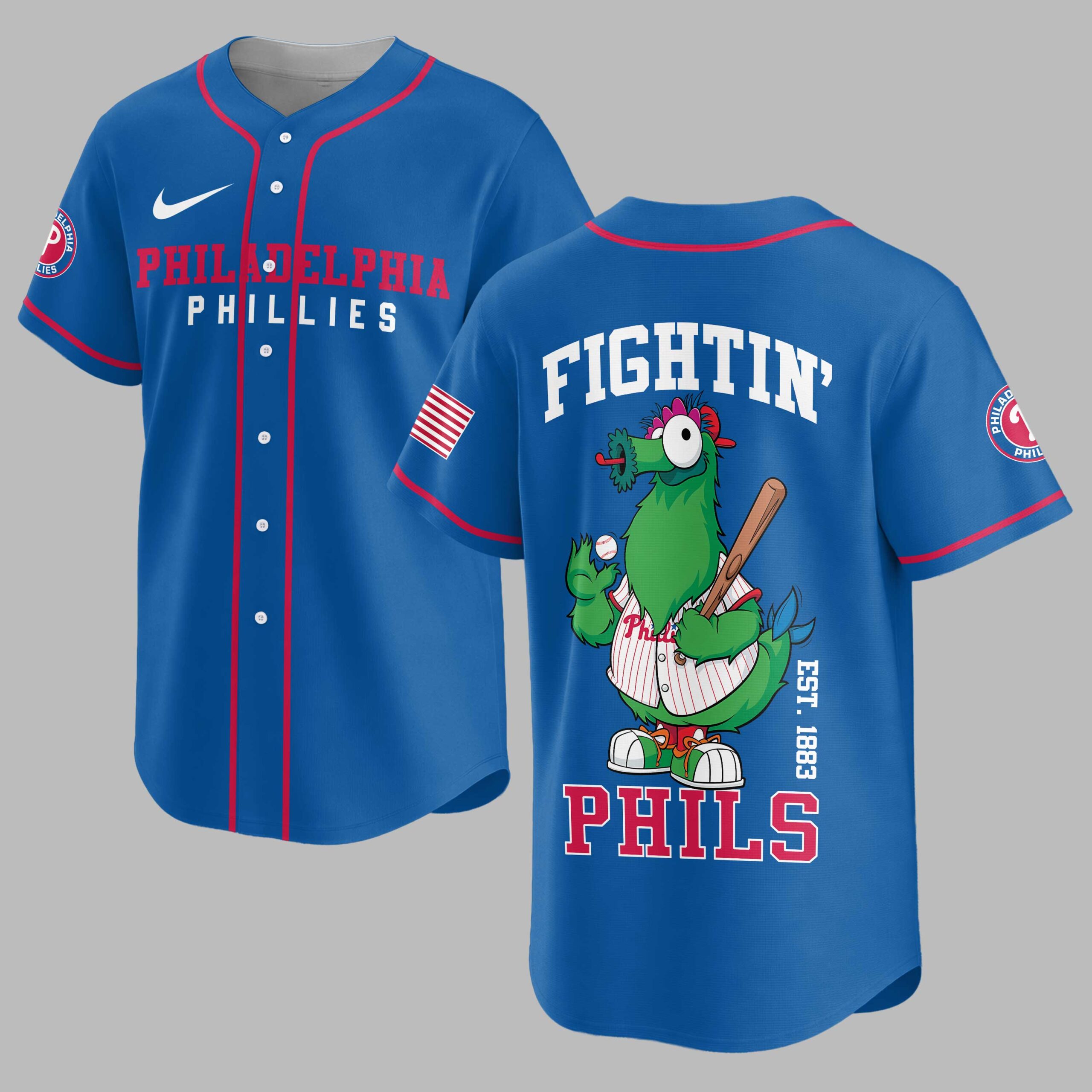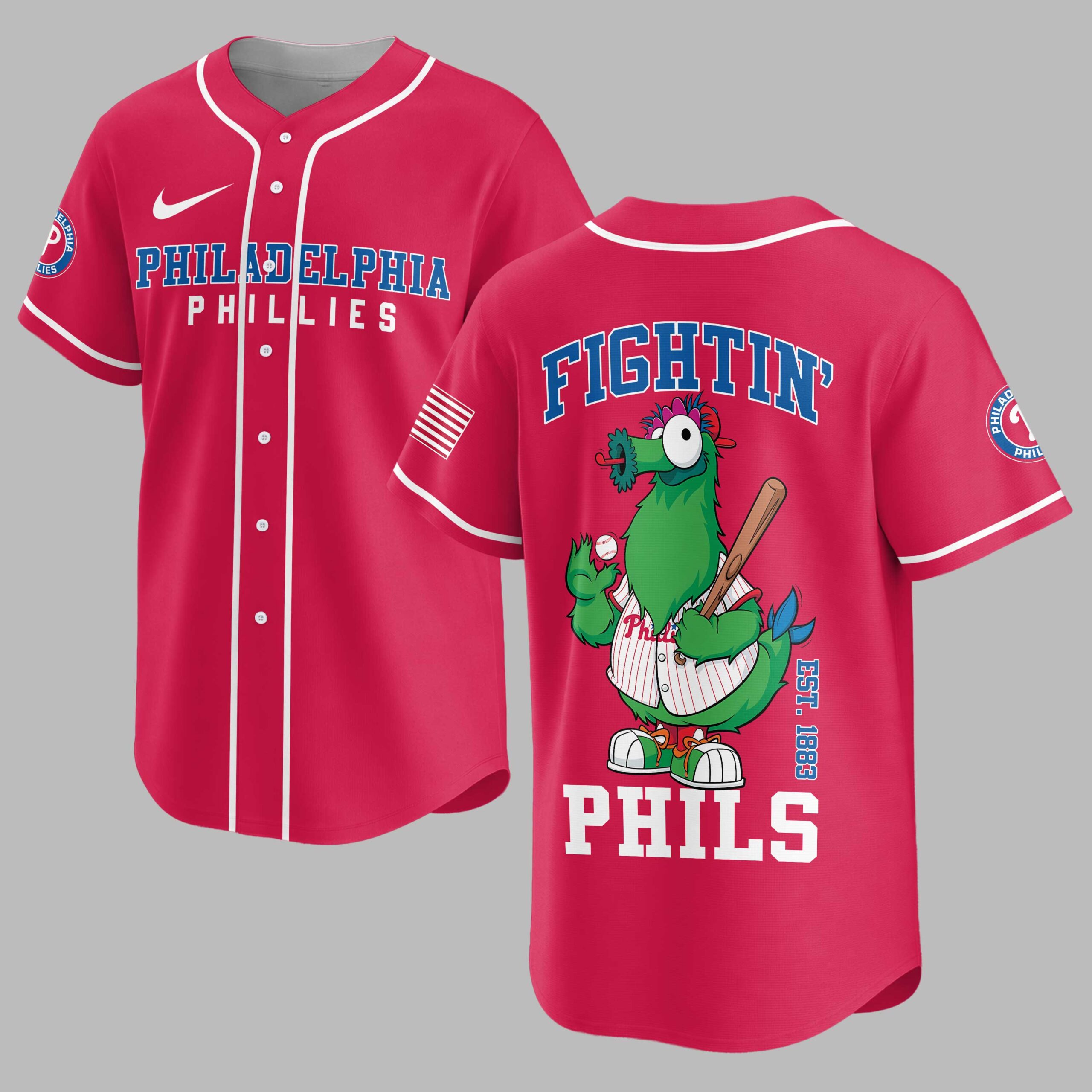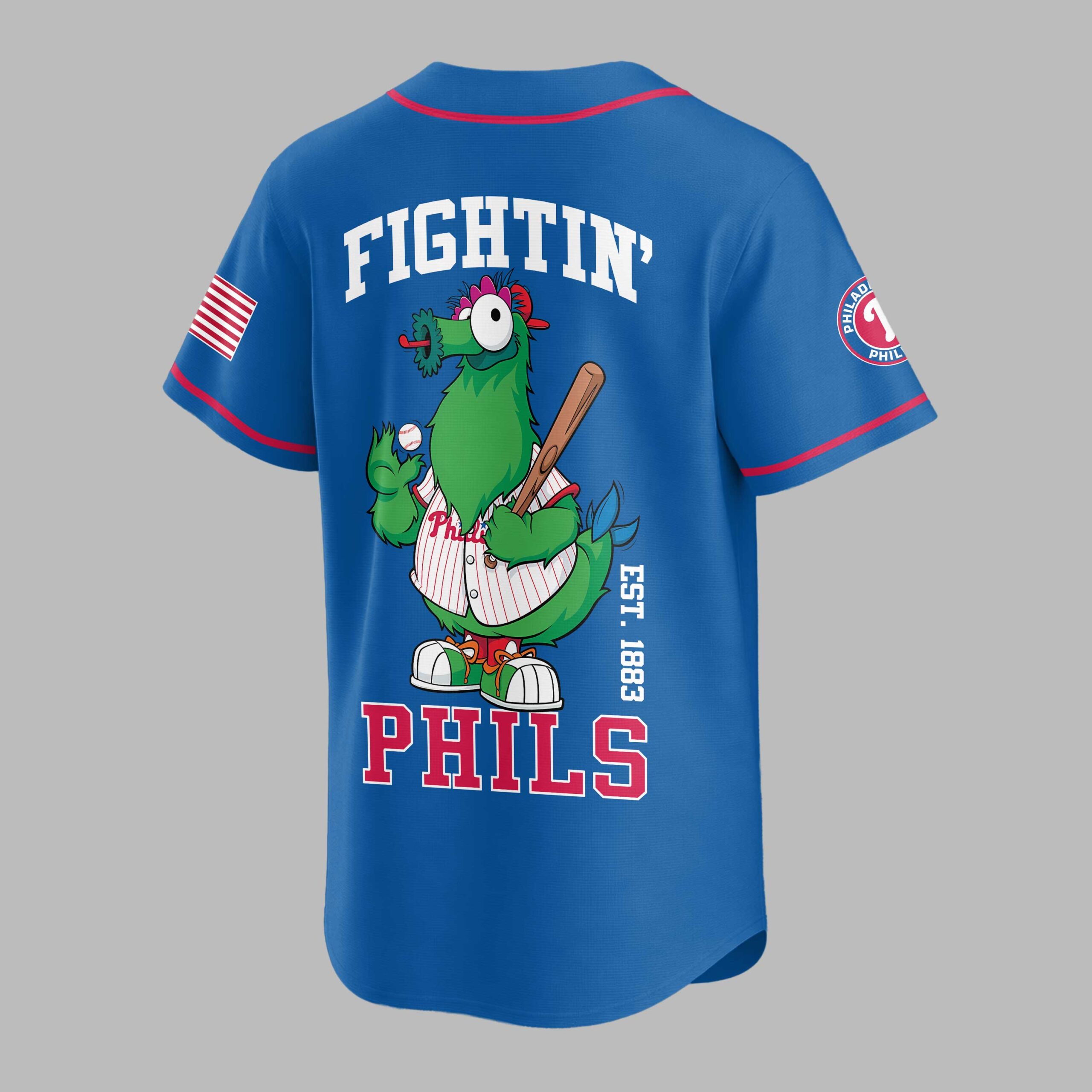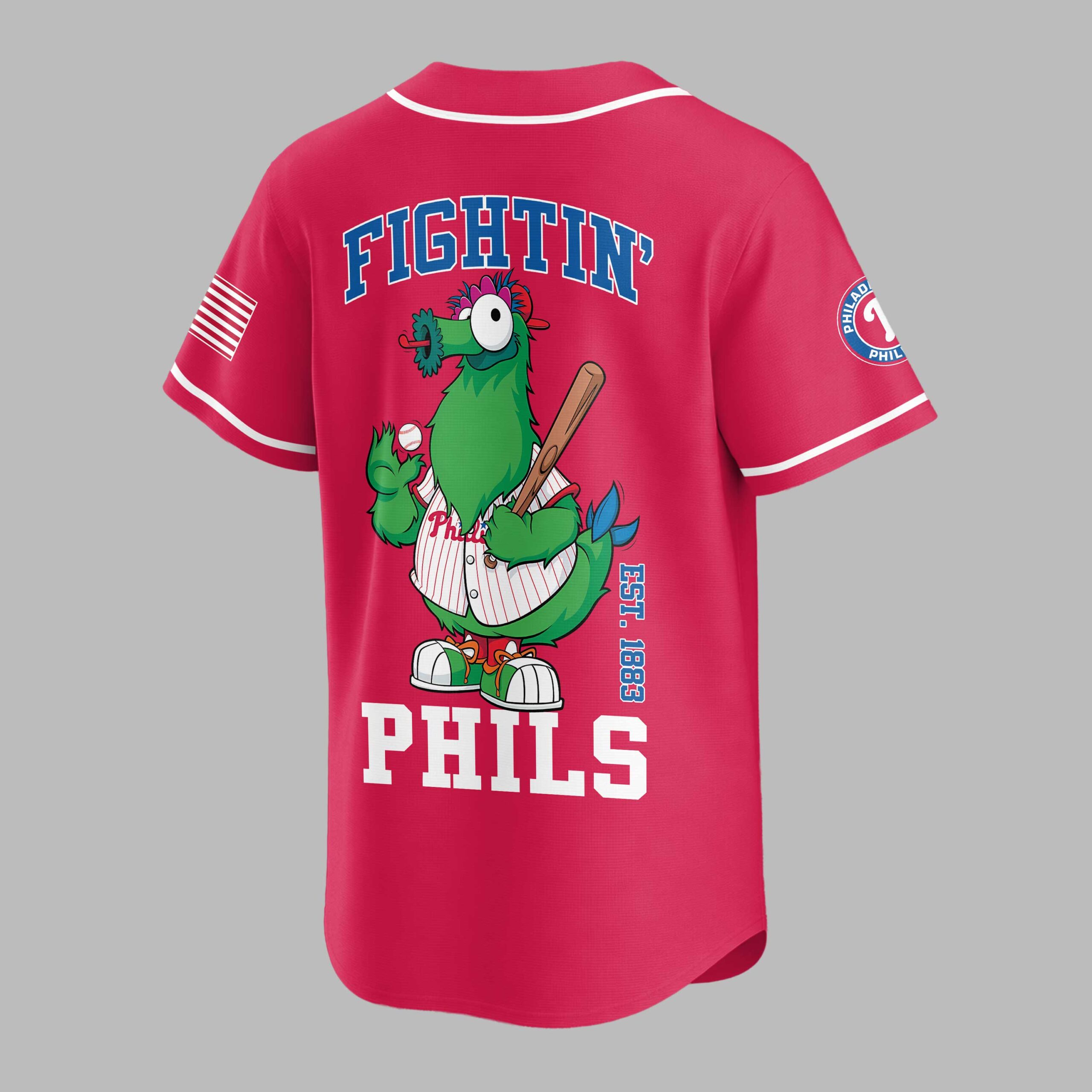 Unleash your ultimate Phillies spirit with this vibrant baseball jersey, celebrating the heart and soul of Philadelphia baseball! This dynamic design lets you proudly display your allegiance to the Fightin’ Phils and their legendary mascot. It’s more than just a jersey; it’s a statement of passion for every pitch and every win. The front of the jersey proudly displays PHILADELPHIA PHILLIES in bold blue lettering across the chest, complemented by the classic P logo on the left sleeve. Turning around, the back explodes with energy, featuring the iconic Philadelphia Phanatic in a ready-to-play stance, bat in hand. Above him, FIGHTIN’ declares the team’s fierce spirit, while PHILS below, alongside EST. 1883, solidifies the team’s deep-rooted history. An American flag design on the left sleeve adds a touch of patriotic pride. Whether you’re cheering from the stands at Citizens Bank Park, gathering with fellow fans for a watch party, or simply showing your team pride around town, this jersey is the perfect way to represent your beloved Phillies. Gear up and let everyone know where your loyalty lies!
