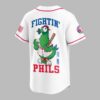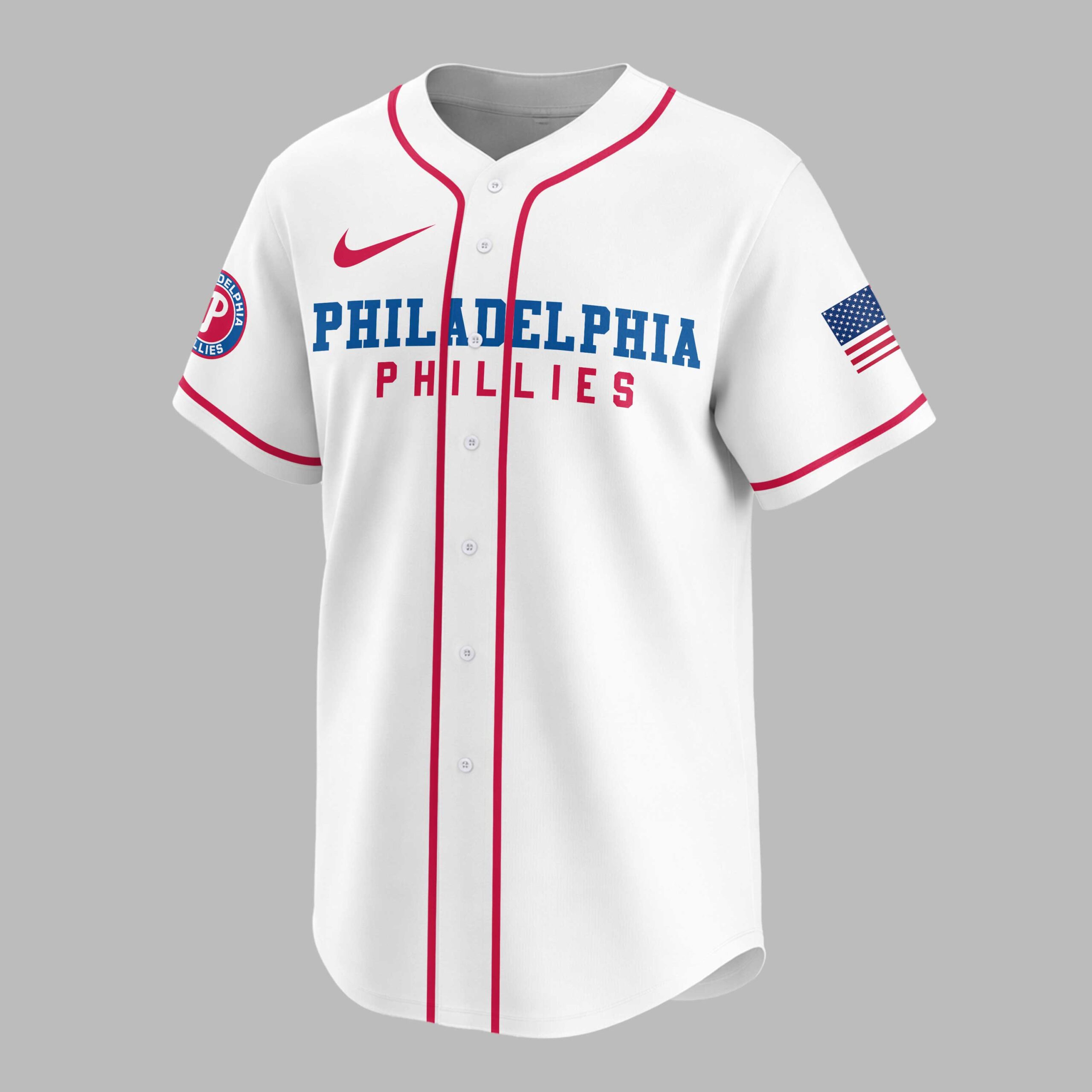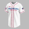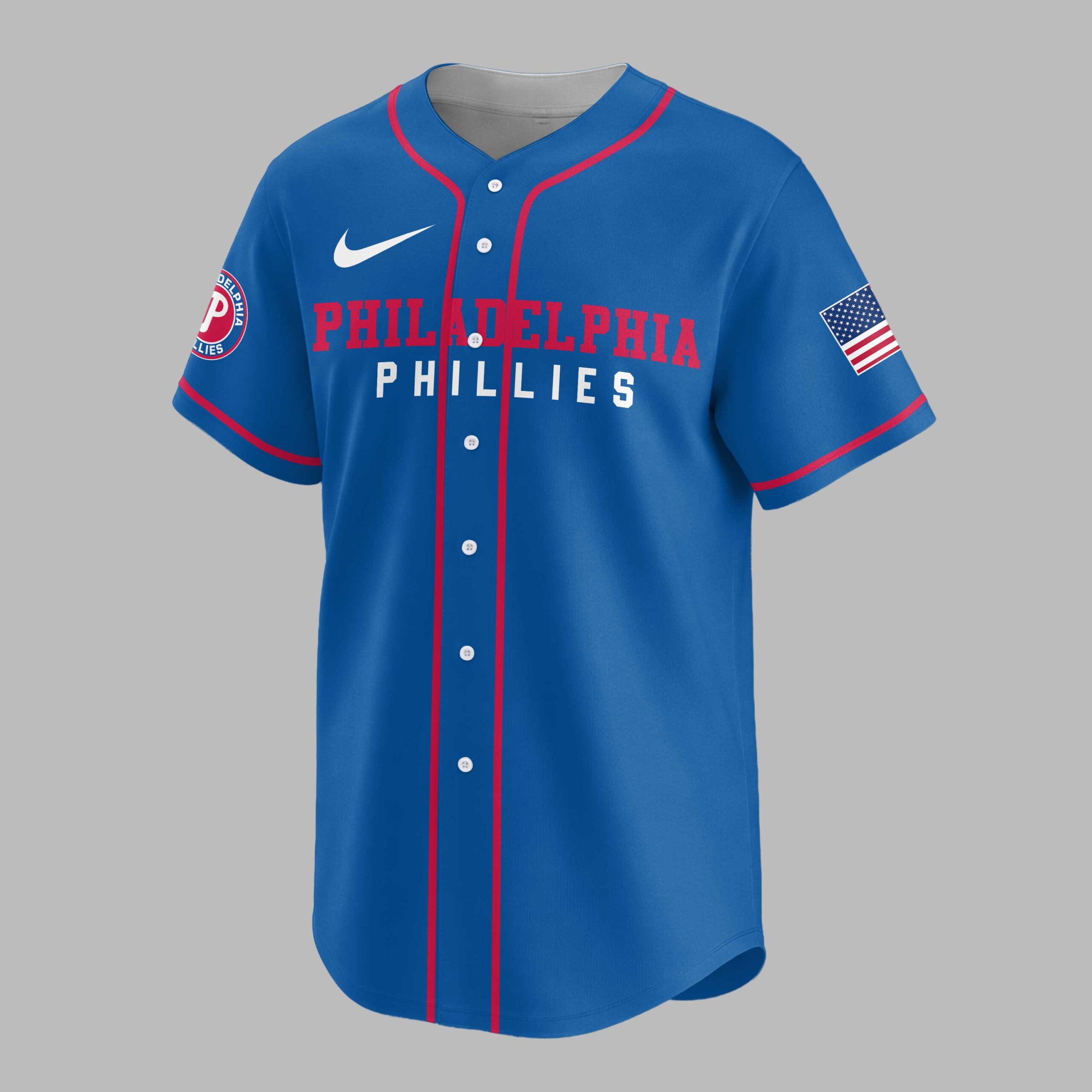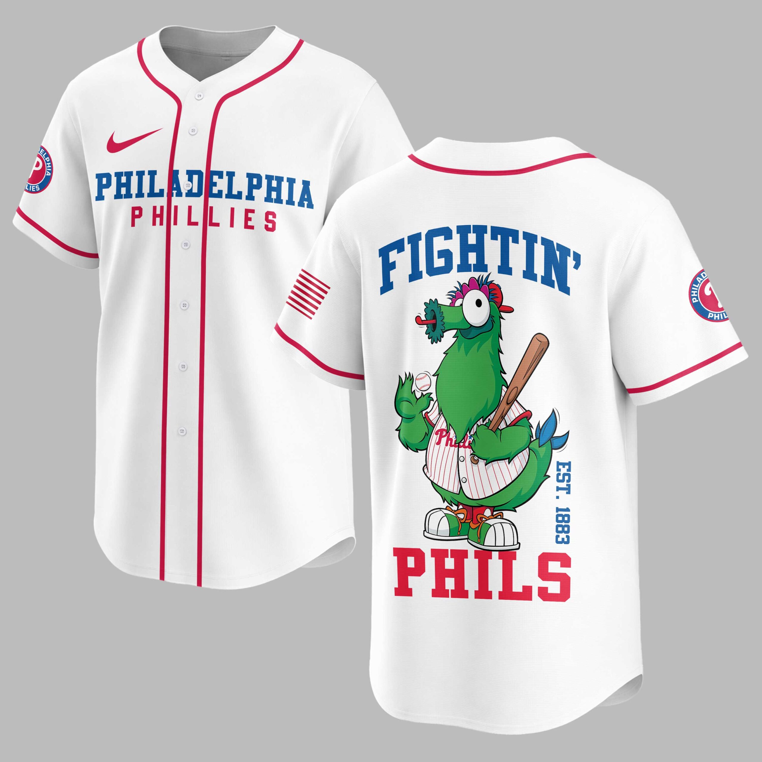 Unleash your ultimate Phillies spirit with this vibrant baseball jersey, celebrating the heart and soul of Philadelphia baseball! This dynamic design lets you proudly display your allegiance to the Fightin’ Phils and their legendary mascot. It’s more than just a jersey; it’s a statement of passion for every pitch and every win. The front of the jersey proudly displays PHILADELPHIA PHILLIES in bold blue lettering across the chest, complemented by the classic P logo on the left sleeve. Turning around, the back explodes with energy, featuring the iconic Philadelphia Phanatic in a ready-to-play stance, bat in hand. Above him, FIGHTIN’ declares the team’s fierce spirit, while PHILS below, alongside EST. 1883, solidifies the team’s deep-rooted history. An American flag design on the left sleeve adds a touch of patriotic pride. Whether you’re cheering from the stands at Citizens Bank Park, gathering with fellow fans for a watch party, or simply showing your team pride around town, this jersey is the perfect way to represent your beloved Phillies. Gear up and let everyone know where your loyalty lies!