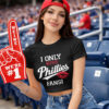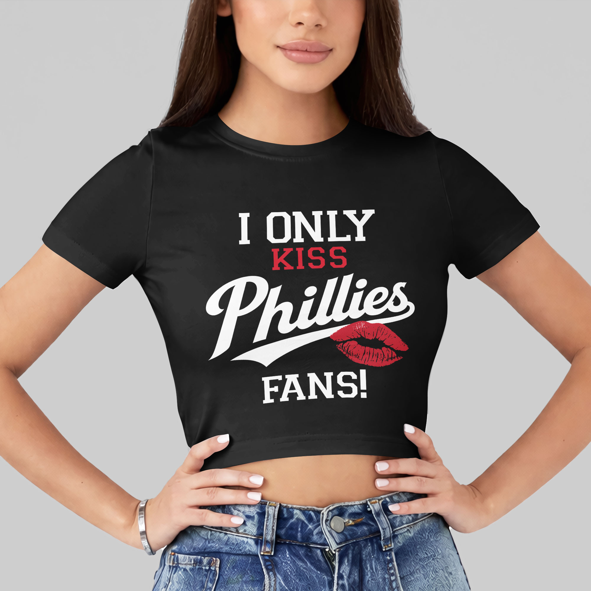 Show off your loyalty to the City of Brotherly Love with a playful twist. This Phillies fan t-shirt perfectly combines your passion for Philadelphia baseball with a bold, spirited attitude. It’s a standout piece that captures the energetic atmosphere of the ballpark and celebrates your love for the game during any patriotic celebration. The front makes a statement with I ONLY KISS Phillies FANS! in a mix of bold block lettering and iconic script. A vibrant red lip graphic adds a fun, flirty touch that pops against the black background. On the back, the classic MLB batter logo sits at the neckline, providing an authentic finishing touch for any dedicated supporter. Rock this look on game days at Citizens Bank Park, at summer tailgates, or during Independence Day festivities. It’s the ultimate choice for everyday fan wear when you want to represent the Phils with pride and a bit of personality.