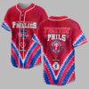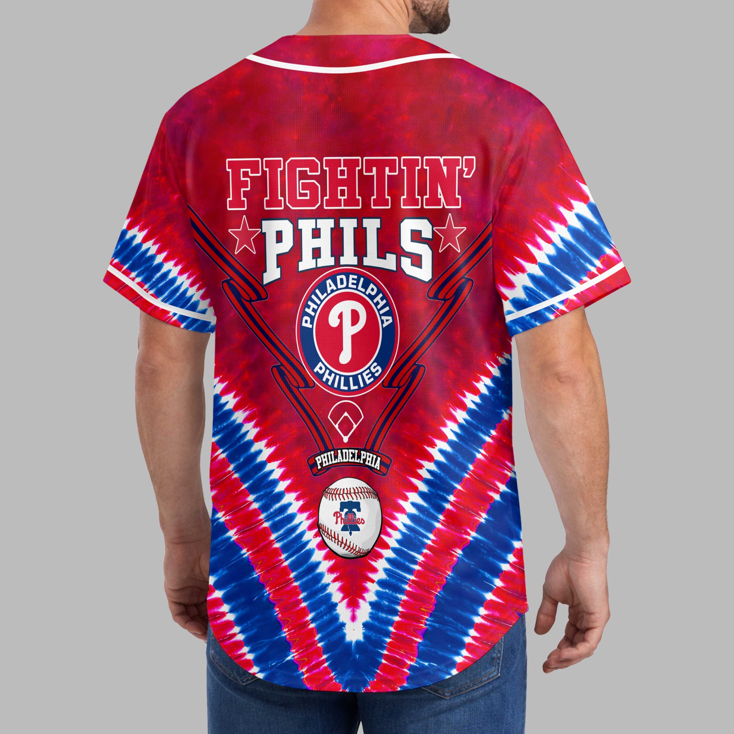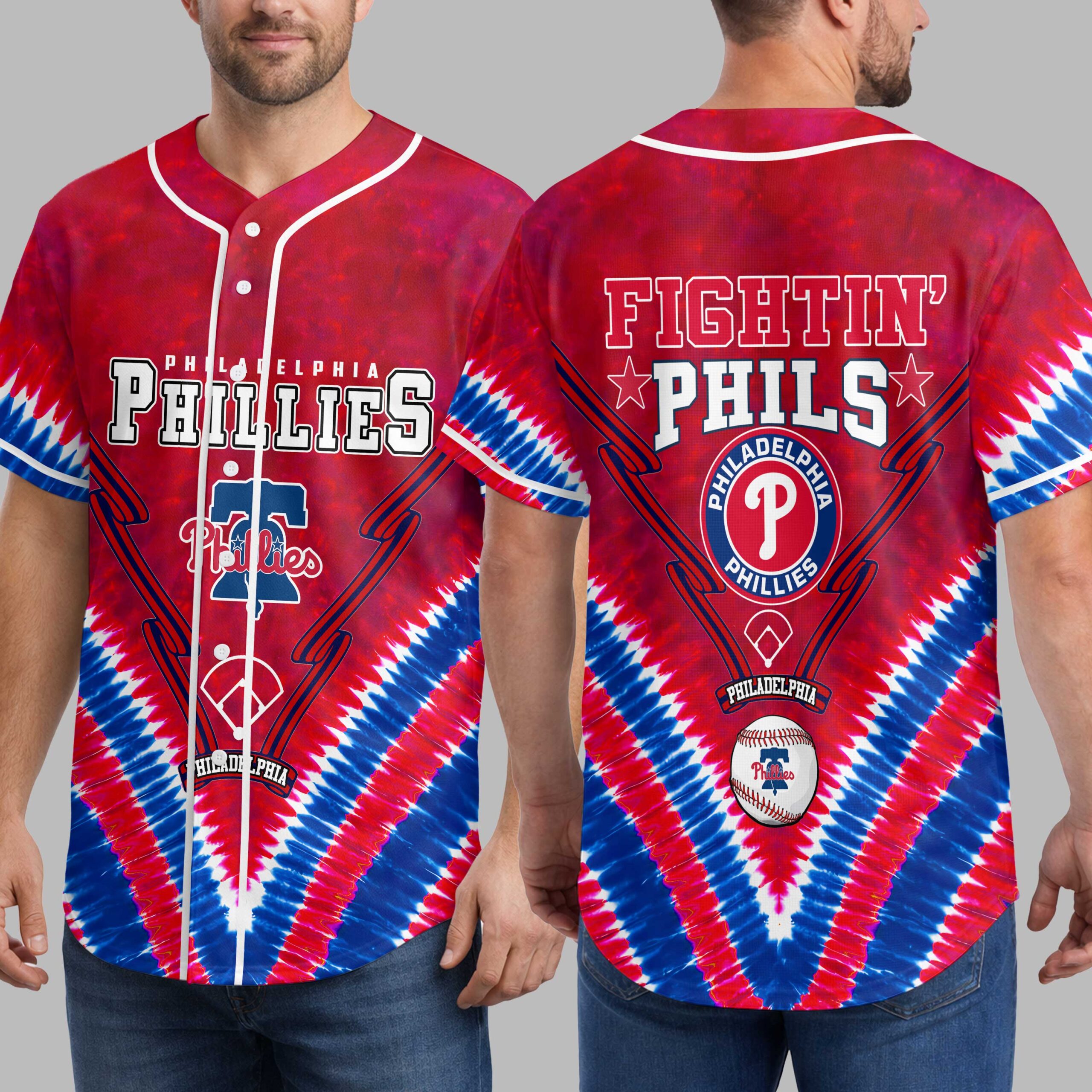 Showcase your unwavering loyalty to the Philadelphia Phillies with this vibrant tie-dye baseball jersey! Perfect for fans who live and breathe Phillies baseball, this shirt captures the energetic spirit of game day and your beloved team. Step out in style and let everyone know you’re a proud member of the Fightin’ Phils faithful, ready to cheer them on to victory. The front proudly displays PHILADELPHIA PHILLIES above the iconic P logo with Phillies in a classic script, all set against a dynamic red tie-dye backdrop. The design is further enhanced with crossed bats and a baseball diamond, adding authentic baseball flair. Turn around and the back shouts FIGHTIN’ PHILS with bold stars, complemented by a circular team logo and another set of crossed bats, ensuring your team spirit is seen from every angle. Blue and white tie-dye patterns add a cool, patriotic touch to the sleeves and sides. This unique jersey is ideal for catching a game at Citizens Bank Park, tailgating with fellow fans, or simply showing off your team pride around town. It’s also a fantastic choice for casual outings, sports bars, or any occasion where you want to celebrate your Phillies. Stand out from the crowd and let your passion shine!