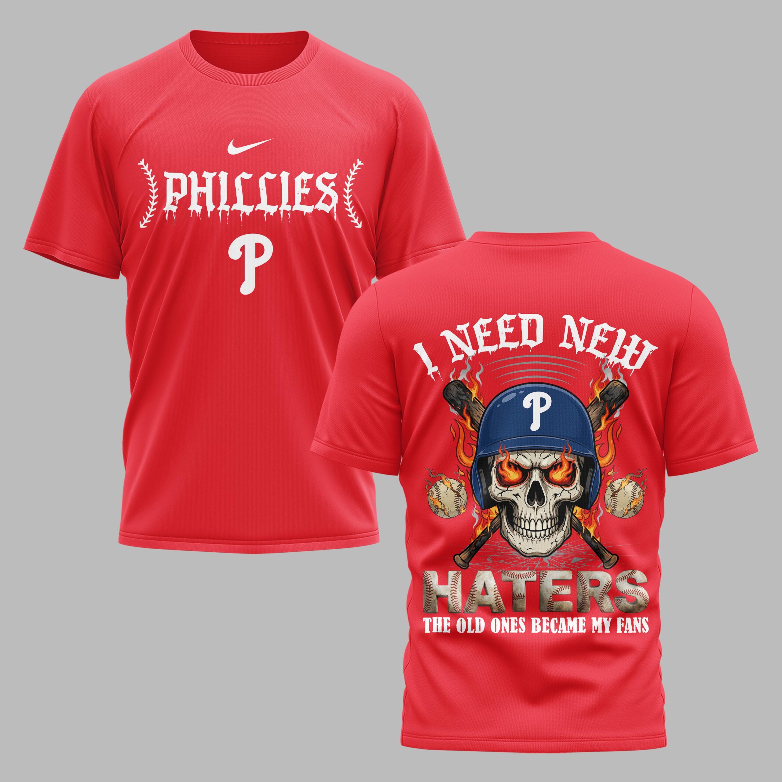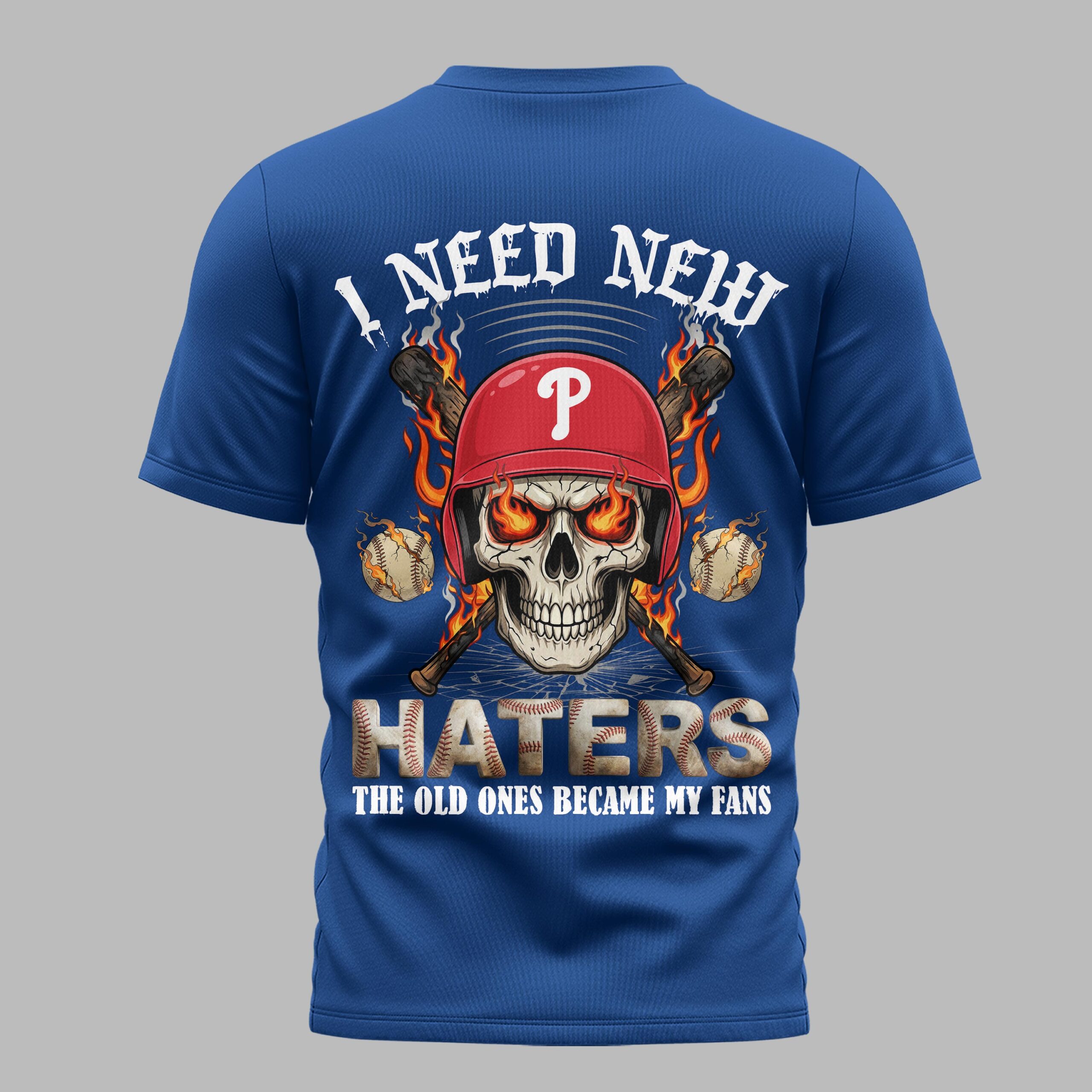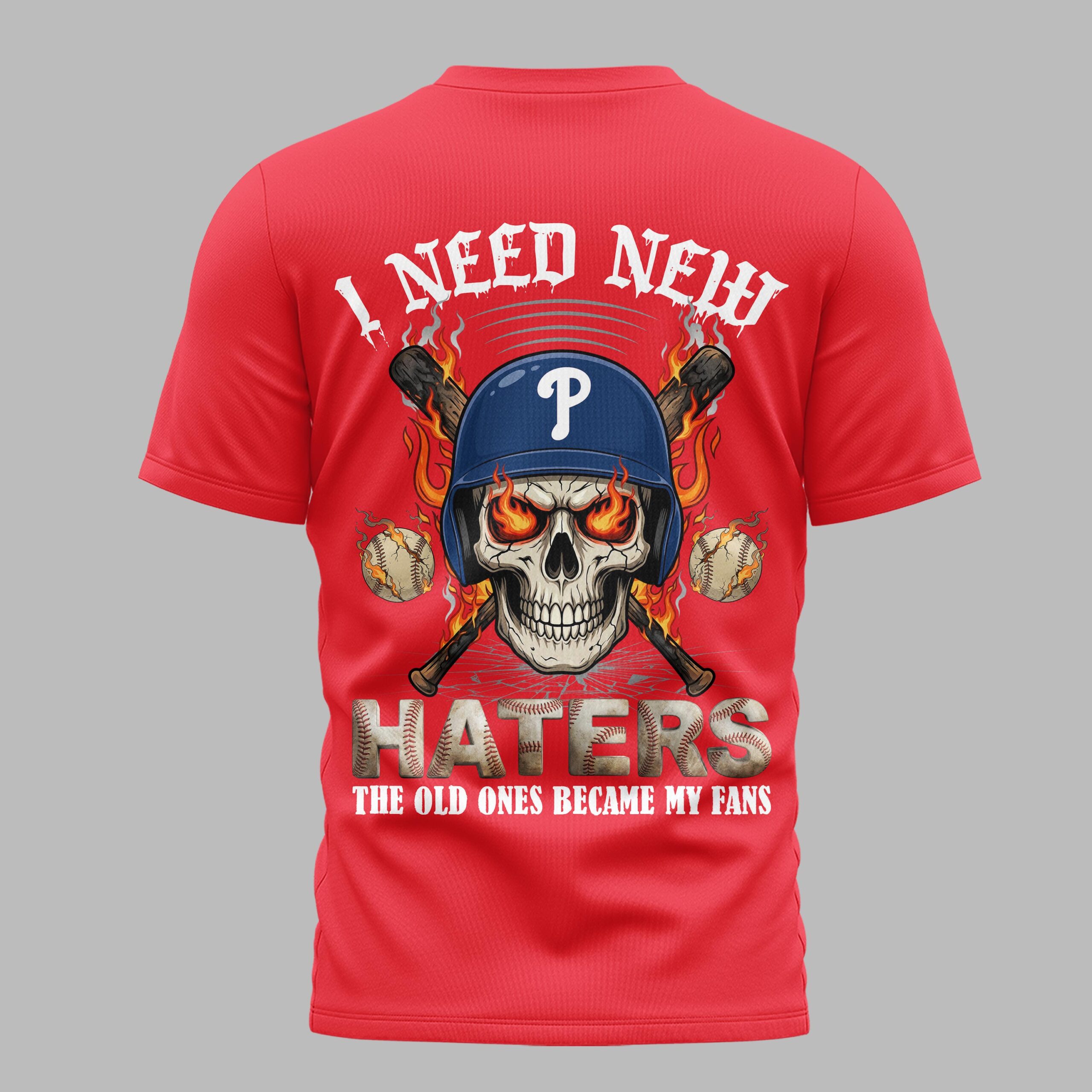 Show your Philadelphia pride with a bold statement that stands out in any crowd. This shirt is designed for the die-hard Phillies fan who stays loyal through every high and low of the season. Perfectly blending team spirit with a gritty edge, it’s the ultimate way to represent the City of Brotherly Love during Independence Day celebrations or the heat of the pennant race. The front features the Phillies name in a striking, distressed font bracketed by baseball stitching, along with the iconic P logo. On the back, a fierce flaming skull wearing a team helmet is surrounded by scorched bats and baseballs. The defiant message, I Need New Haters, captures the authentic, tough-as-nails spirit of the Philadelphia faithful. Wear it to Citizens Bank Park on game day, to a summer barbecue, or while out and about in the city. This gear is built for the fan who wants to show their passion with an undeniable attitude.