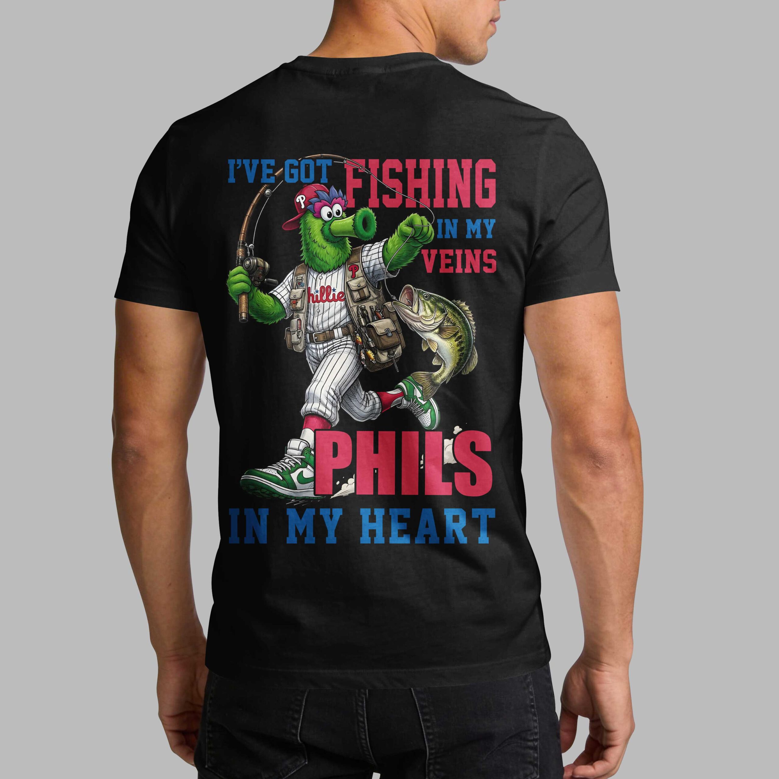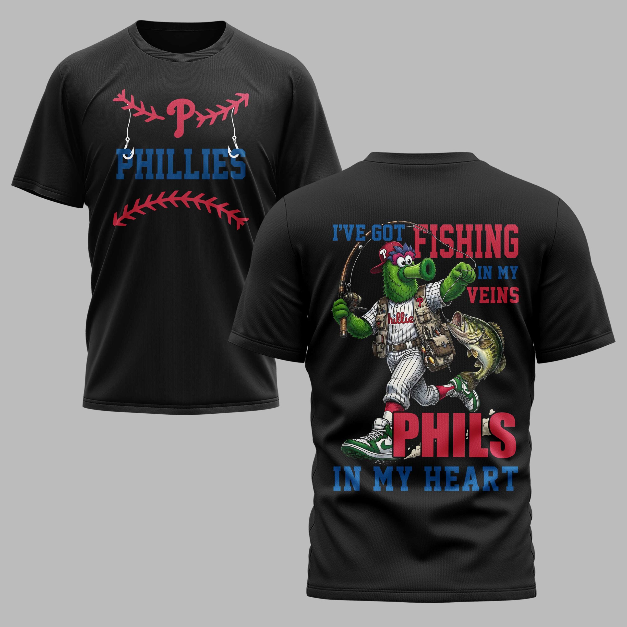 Reel in your ultimate fan gear with this Philadelphia Phillies Fishing T-Shirt! Perfect for devoted Phils fans who also live for the thrill of the catch, this shirt brilliantly blends your two greatest loves into one spirited design. The front proudly features the red Phillies ‘P’ logo, with baseball stitching forming a fishing line and hook, leading to ‘PHILLIES’. On the back, the legendary Phillie Phanatic, in uniform, is ready to fish and proudly holds a caught bass! Artwork boldly declares: ‘I’VE GOT FISHING IN MY VEINS’ and ‘PHIL’S IN MY HEART’. Wear it cheering at Citizens Bank Park, casting a line on the lake, or enjoying any casual day out. Perfect for game days, fishing trips, or celebrating your Phillies spirit and passion for the outdoors.