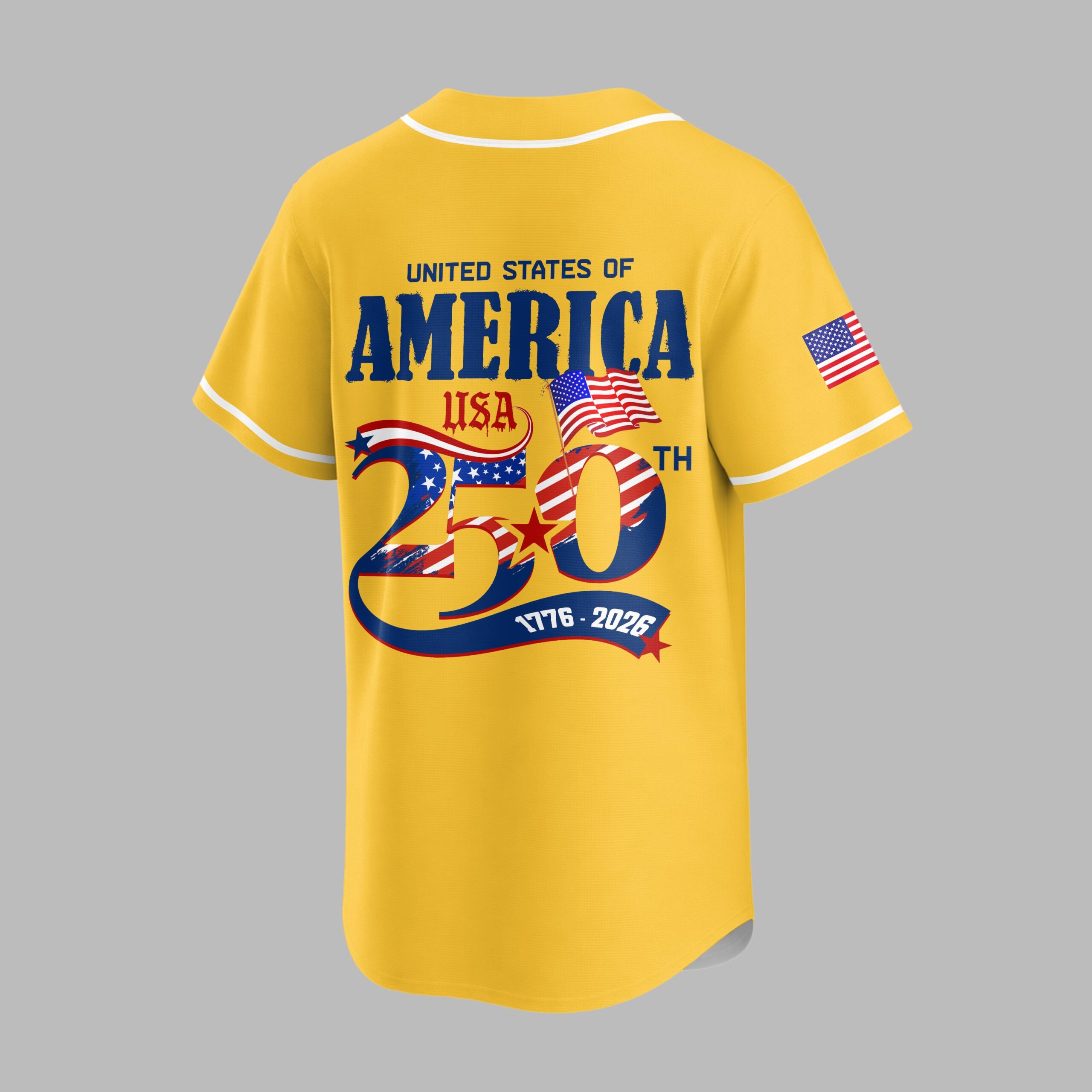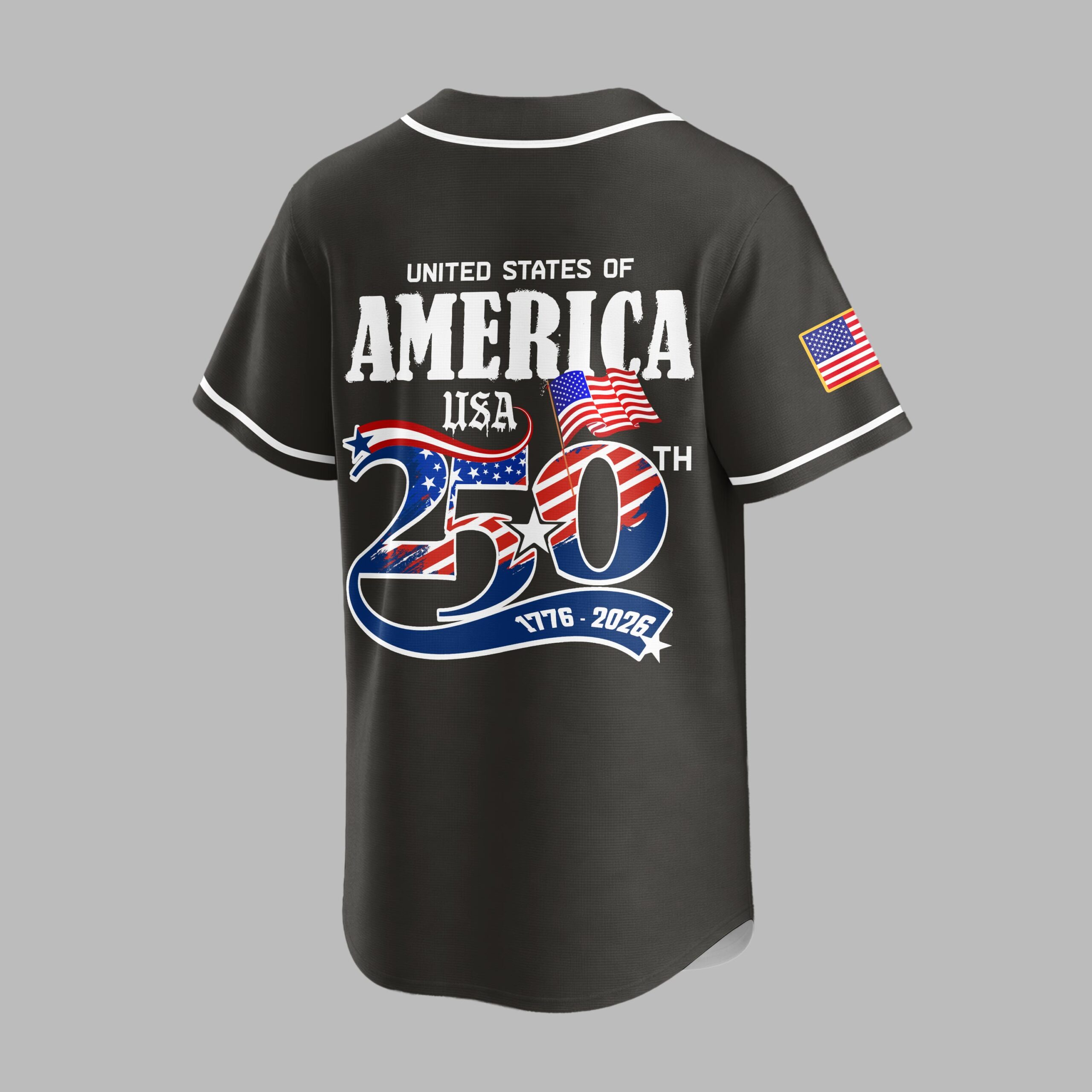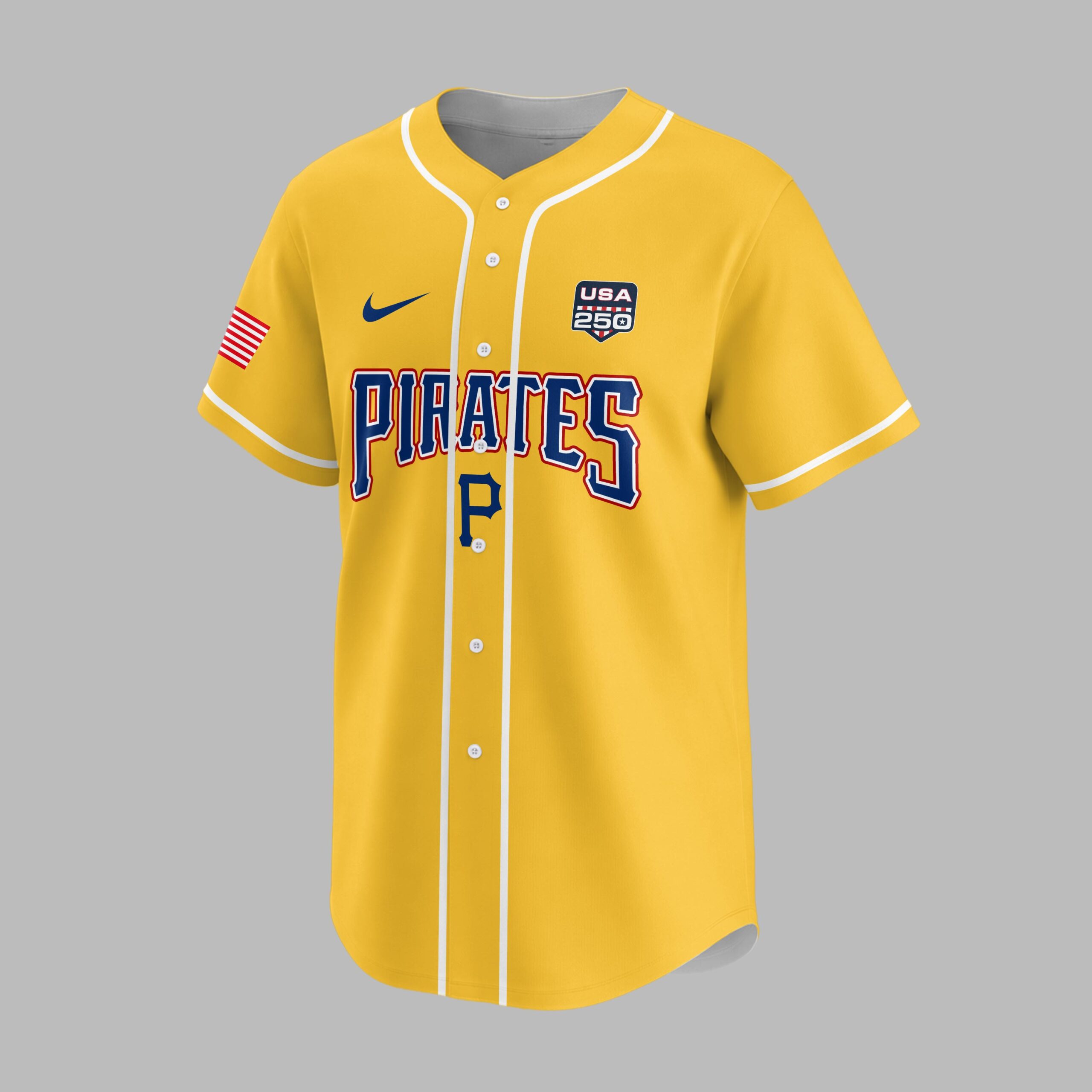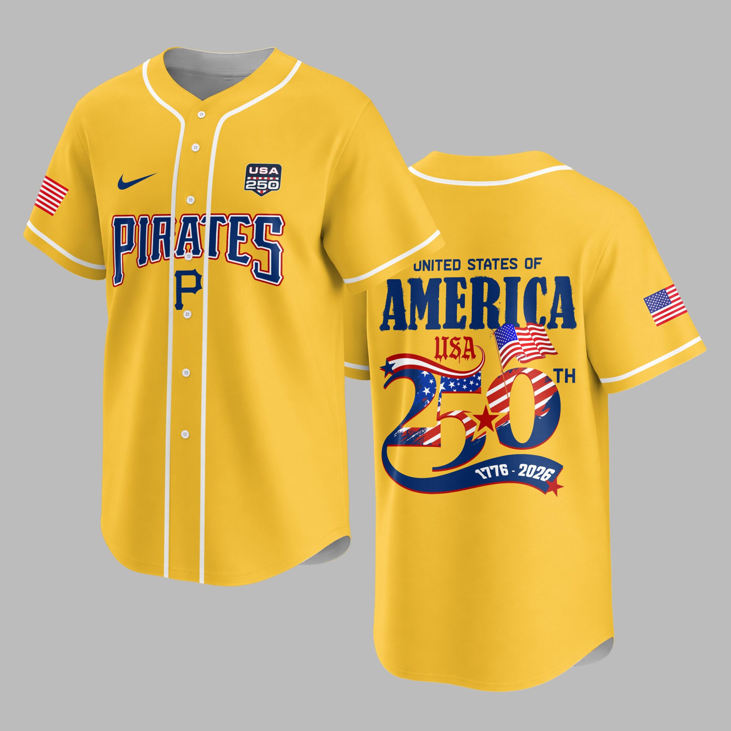 Show your unwavering support for your favorite team and country with this special edition Pirates baseball jersey. This patriotic design celebrates the USA’s 250th anniversary, blending team spirit with national pride for a truly unique look. The front proudly displays ‘PIRATES’ in bold blue lettering with a crisp white outline, accompanied by a prominent ‘P.’ and a ‘USA 250’ emblem near the collar. Both sleeves feature an American flag patch, enhancing the patriotic feel. On the back, ‘UNITED STATES OF AMERICA’ stands above a striking ‘USA 250TH’ design, featuring the iconic stars and stripes. A banner marking ‘1776 – 2026’ and waving American flags complete this powerful tribute. Perfect for game day at the ballpark, Fourth of July celebrations, or any event where you want to display your American pride, this jersey is a true standout. Wear it to rallies, parades, or just when you’re out and about, connecting with fellow fans and patriots with every stride.