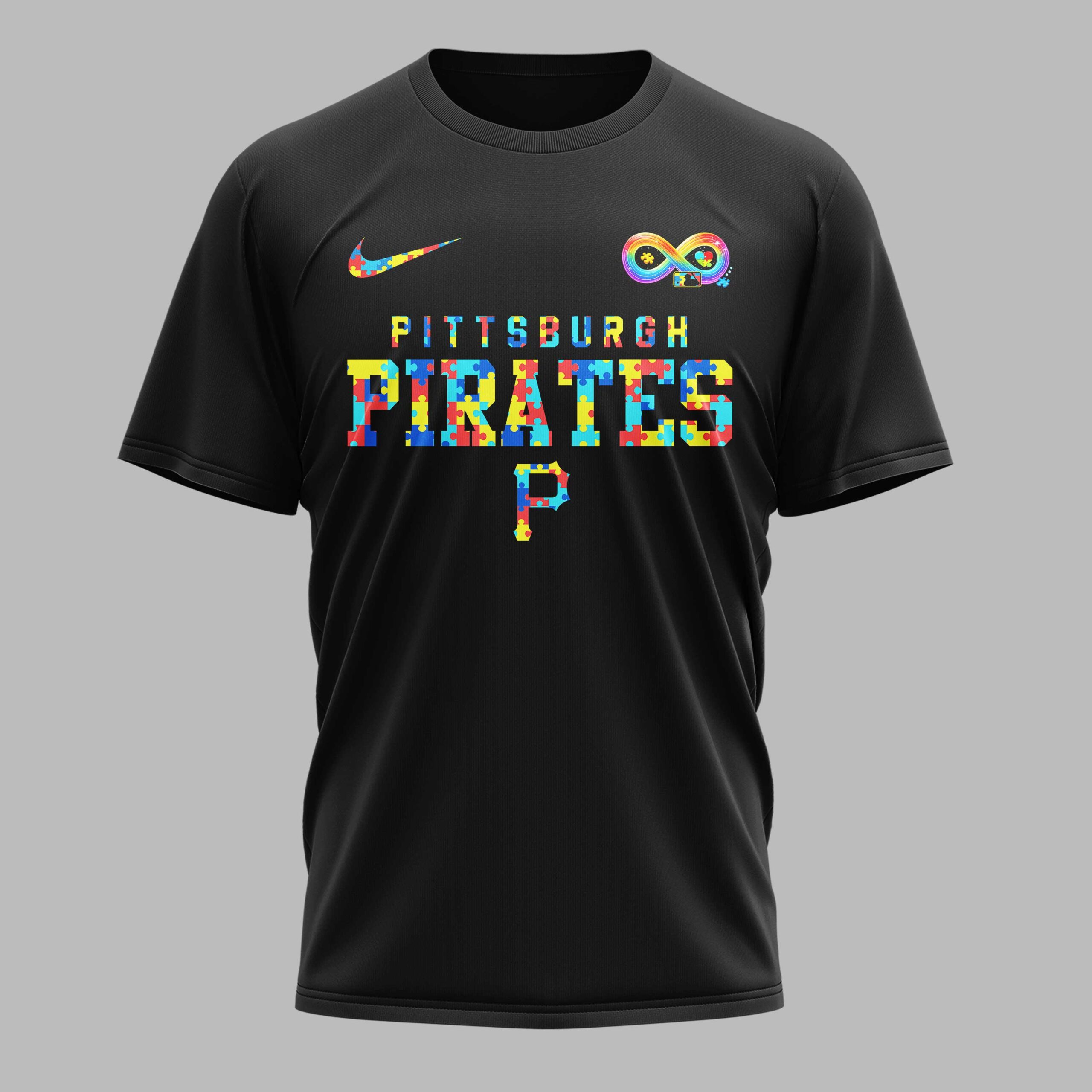 Show your unwavering support for the Pittsburgh Pirates and a vital cause with this vibrant fan tee! It proudly blends team loyalty with a powerful message of autism acceptance, understanding, and love, a meaningful way to cheer on your Bucs. The front features PITTSBURGH PIRATES and a bold P in a multi-colored puzzle piece pattern, symbolizing autism awareness. A rainbow infinity symbol with a baseball graphic and MLB logo, plus a matching puzzle-piece Nike swoosh, completes the front. The back showcases the iconic Pirate Parrot mascot in a puzzle-piece jersey, alongside the impactful message: ACCEPT. UNDERSTAND. LOVE. Perfect for game days, community events, or everyday wear, this shirt is a grand slam for fans embracing both baseball passion and diversity. Wear it with pride and let your support shine!