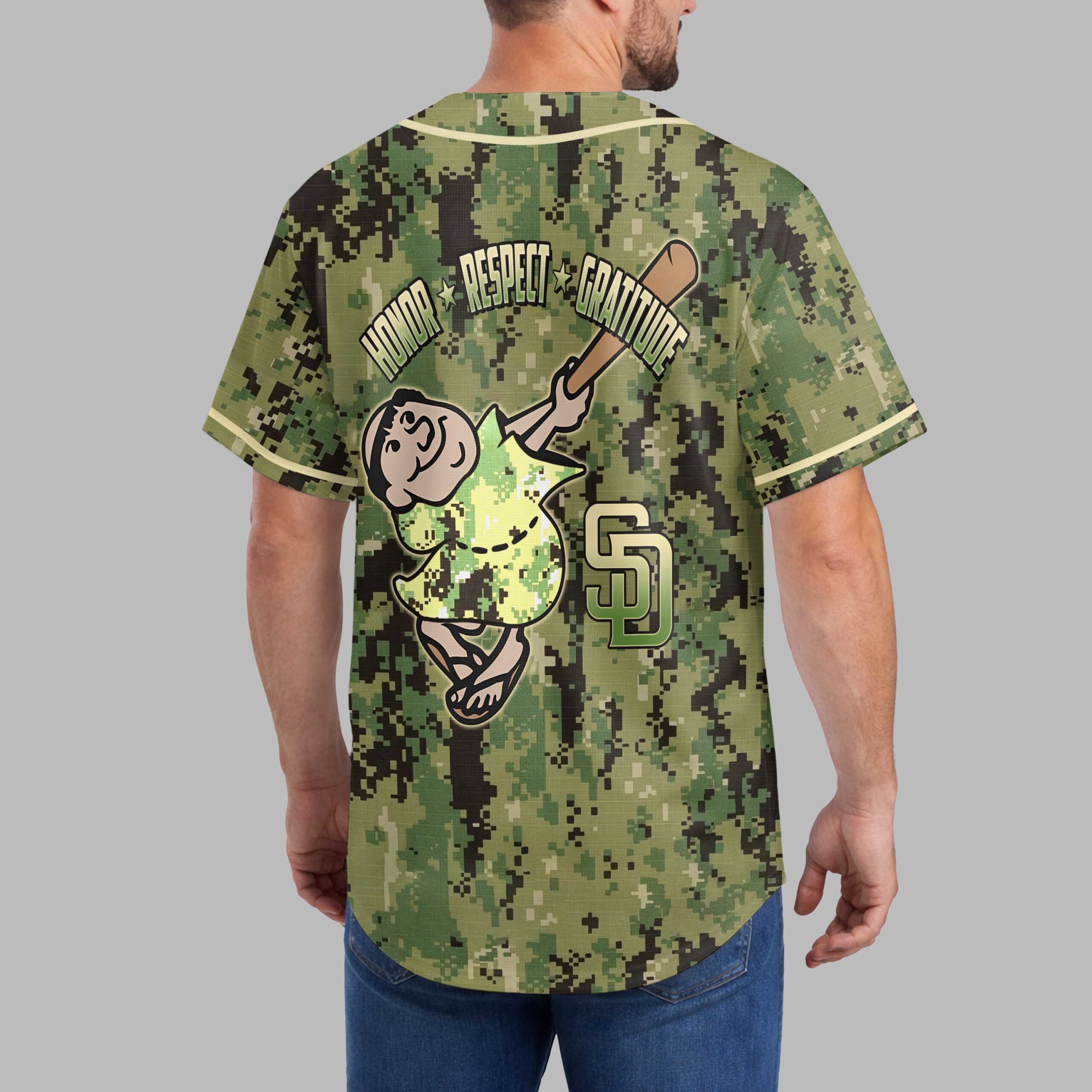 Show your unwavering support for the San Diego Padres with this distinctive baseball jersey, a powerful blend of team spirit and patriotic appreciation. This unique design lets you celebrate your favorite team while honoring values that resonate deeply, making a bold statement both on and off the field. The jersey features a dynamic digital camouflage pattern, with PADRES emblazoned across the chest in a strong, military-inspired font. The back proudly displays a classic Padres friar swinging a bat, accompanied by the inspiring words HONOR, RESPECT, and GRATITUDE. A prominent SD logo completes this special tribute. Perfect for game days at Petco Park, local watch parties, or any casual outing where you want to showcase your San Diego pride and respect for service. This jersey is more than just fan gear; it’s a symbol of loyalty and appreciation, designed for every devoted Padres fan.
