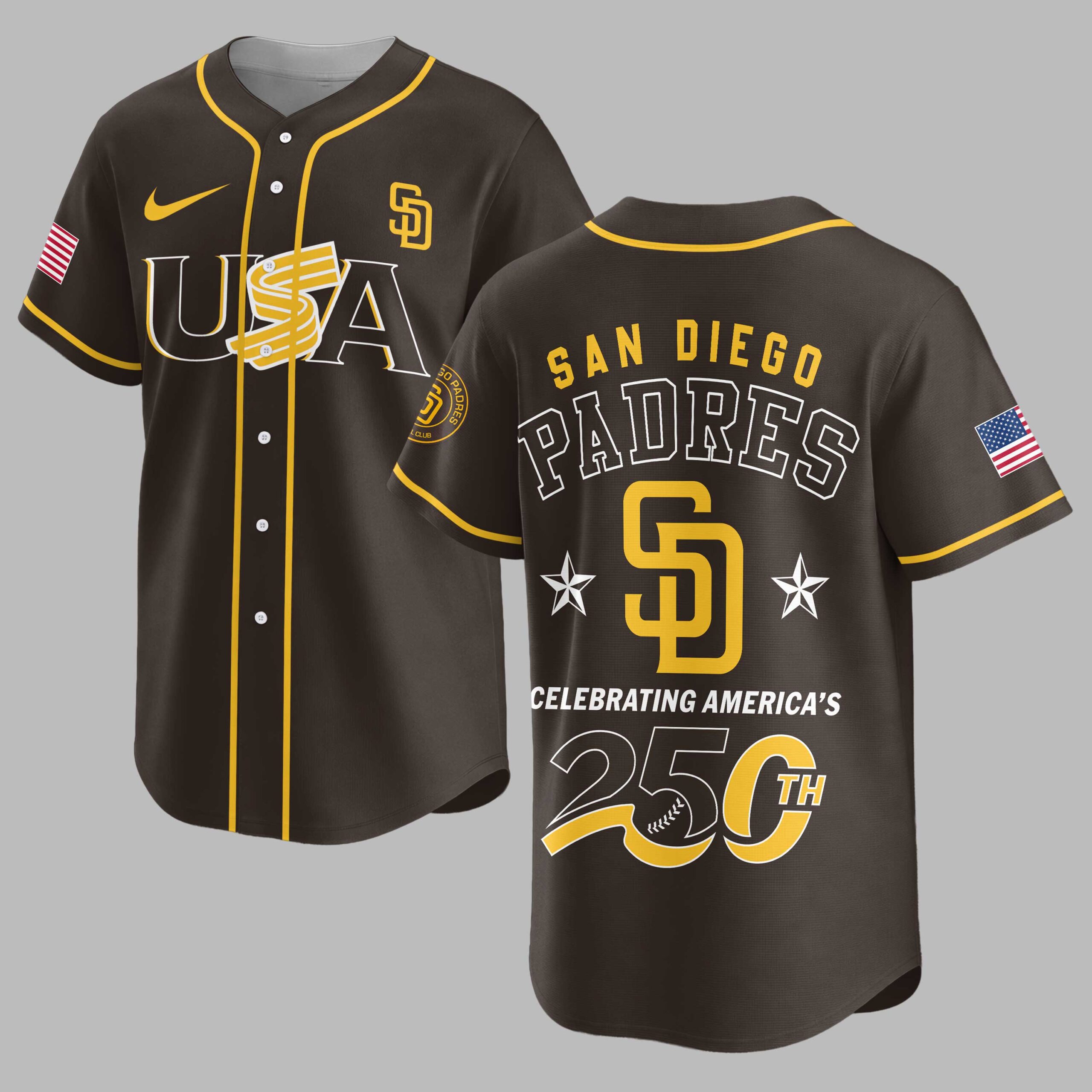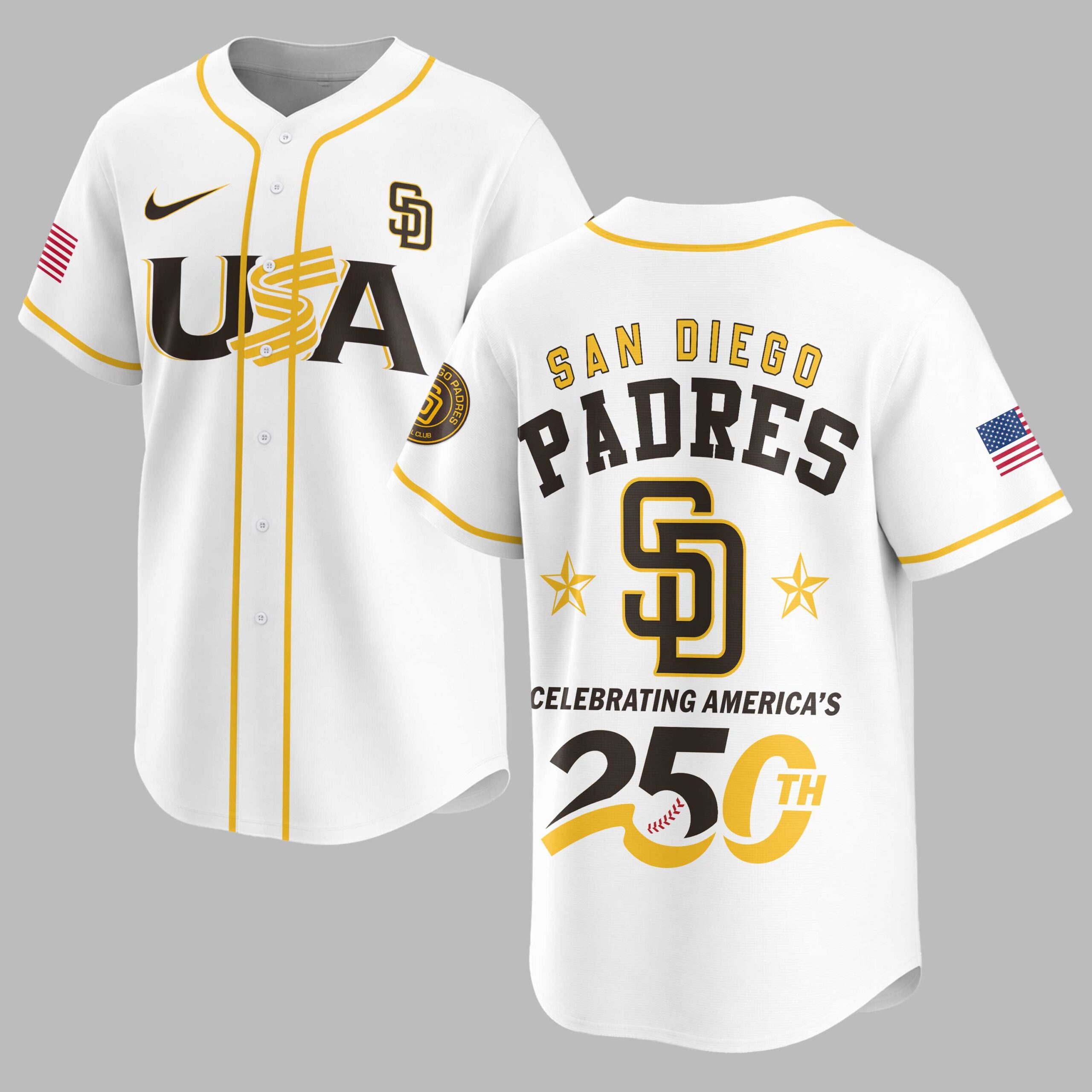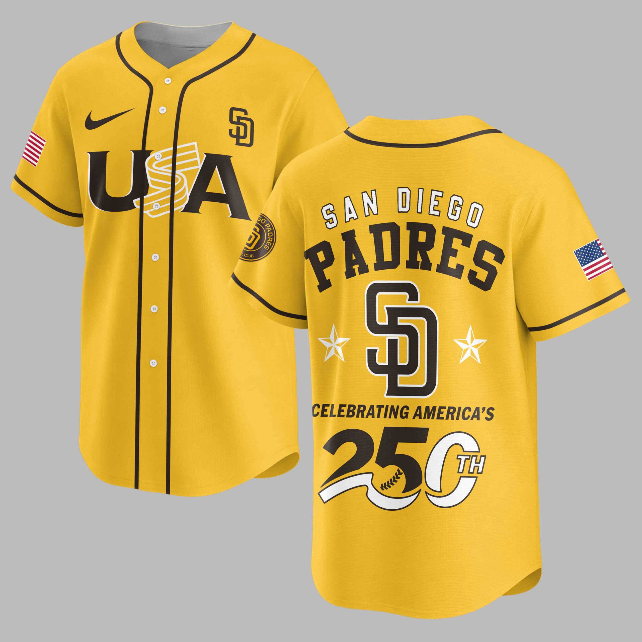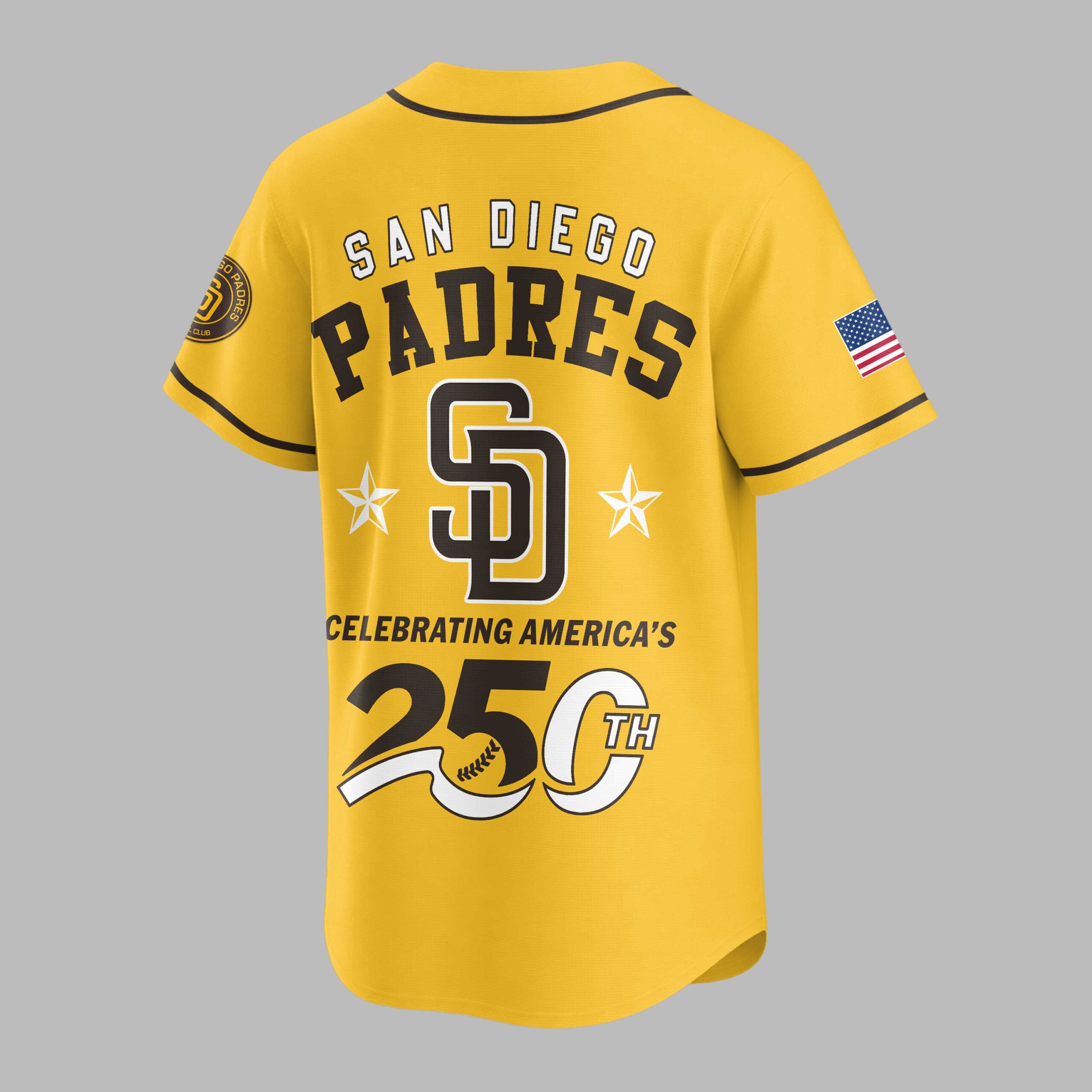 Show your San Diego Padres pride and celebrate a landmark American occasion with this baseball jersey. Merging team spirit with a patriotic tribute, it’s perfect for fans who love their team and country, honoring both the Padres and America’s 250th anniversary. The front proudly displays USA in bold white and yellow, layered over the iconic SD Padres logo. The back features SAN DIEGO PADRES above a large yellow SD logo, flanked by stars. CELEBRATING AMERICA’S 250TH is presented below, with a baseball graphic integrated into the 0. American flag patches adorn the sleeves. Ideal for gamedays, patriotic holidays, or watching the game, this jersey is a must-have. It’s essential for any Padres fan to showcase their loyalty and American spirit during events or daily wear.