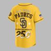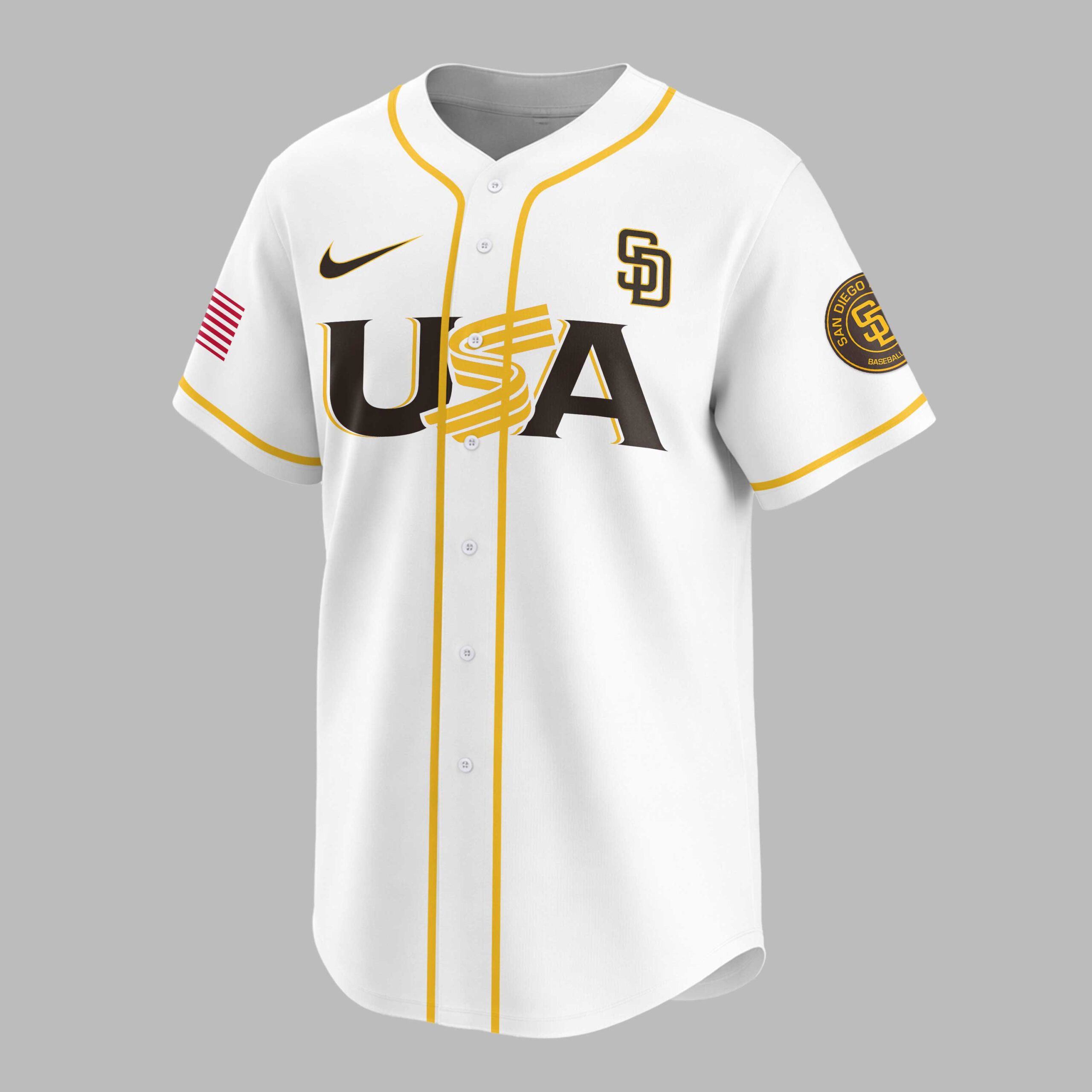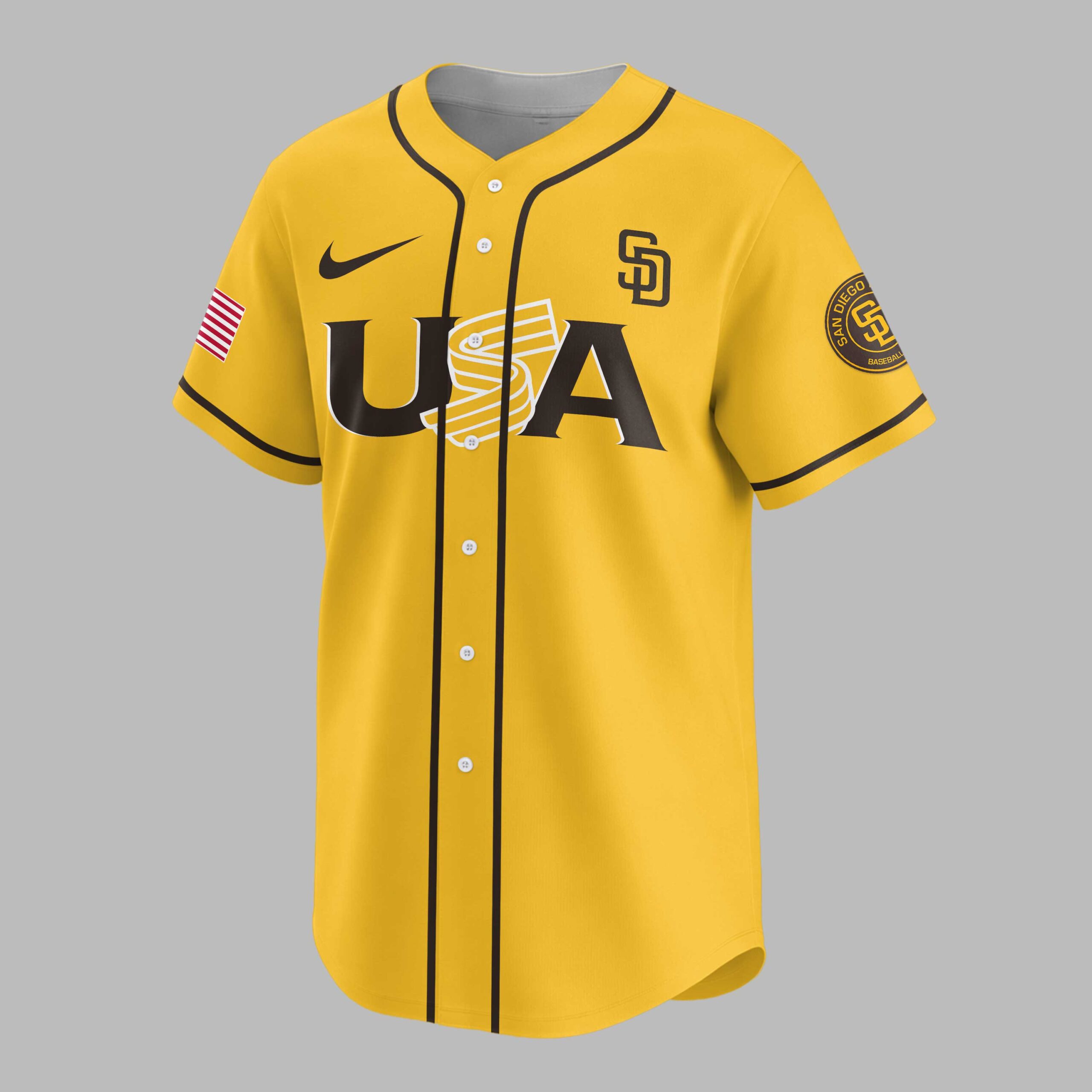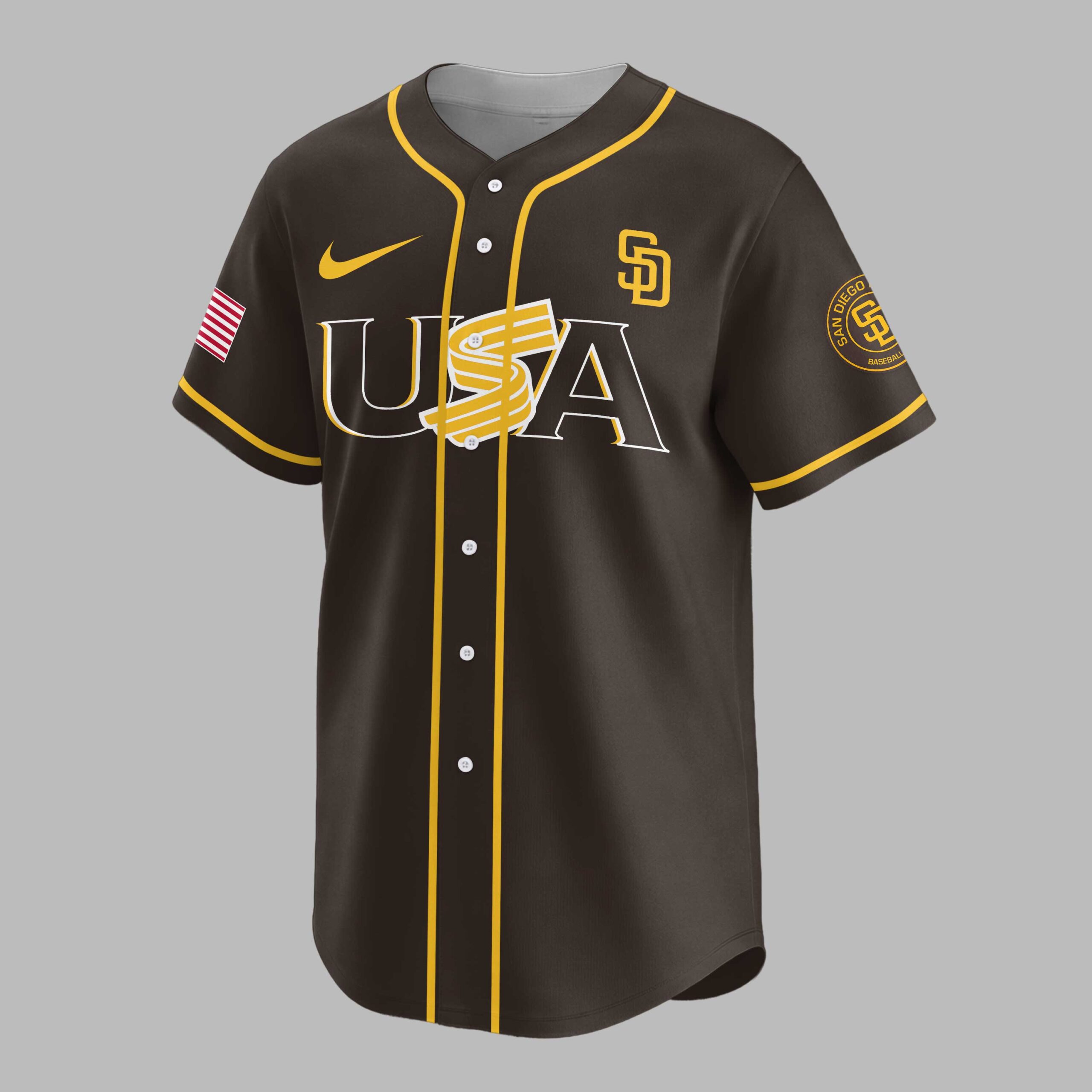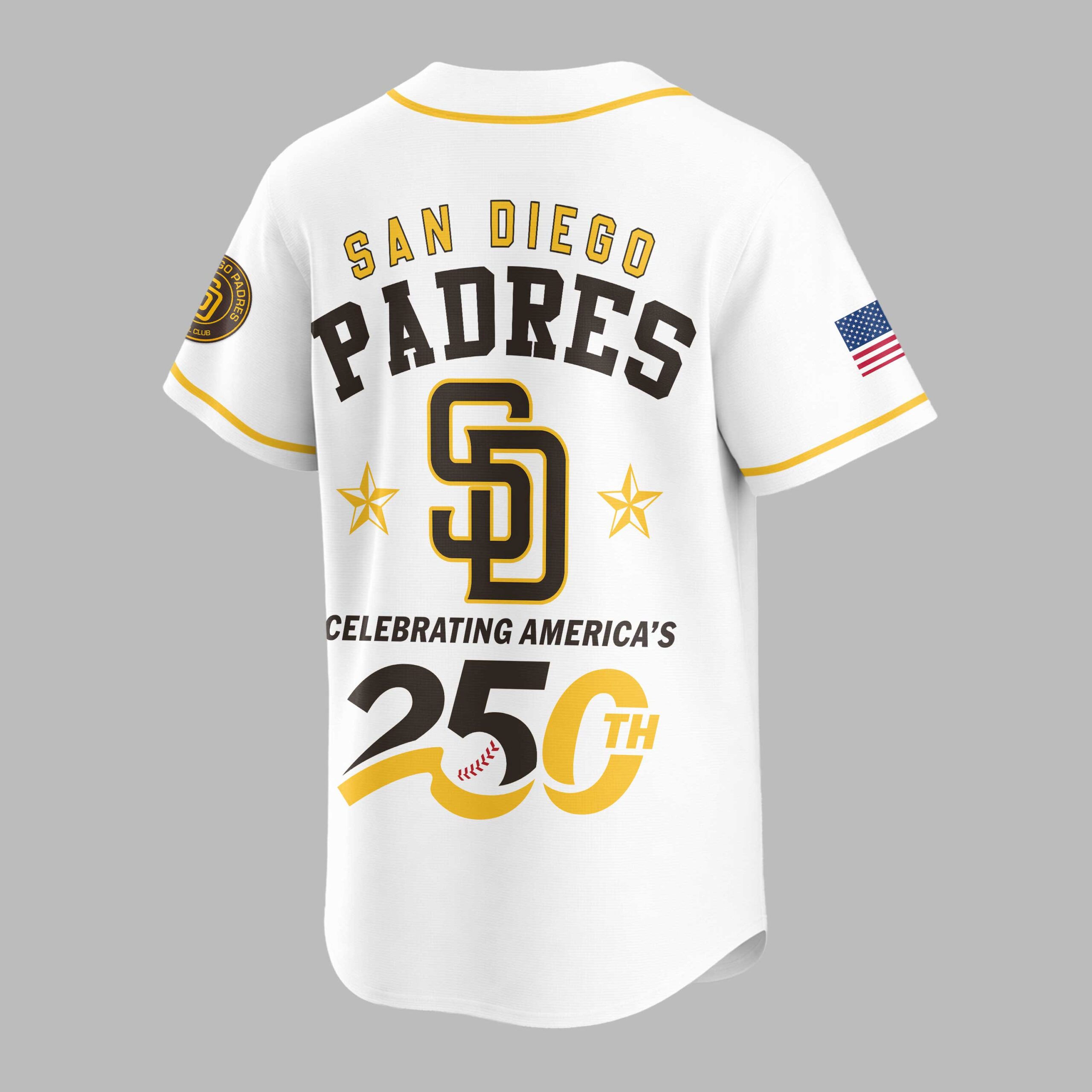 Show your San Diego Padres pride and celebrate a landmark American occasion with this baseball jersey. Merging team spirit with a patriotic tribute, it’s perfect for fans who love their team and country, honoring both the Padres and America’s 250th anniversary. The front proudly displays USA in bold white and yellow, layered over the iconic SD Padres logo. The back features SAN DIEGO PADRES above a large yellow SD logo, flanked by stars. CELEBRATING AMERICA’S 250TH is presented below, with a baseball graphic integrated into the 0. American flag patches adorn the sleeves. Ideal for gamedays, patriotic holidays, or watching the game, this jersey is a must-have. It’s essential for any Padres fan to showcase their loyalty and American spirit during events or daily wear.