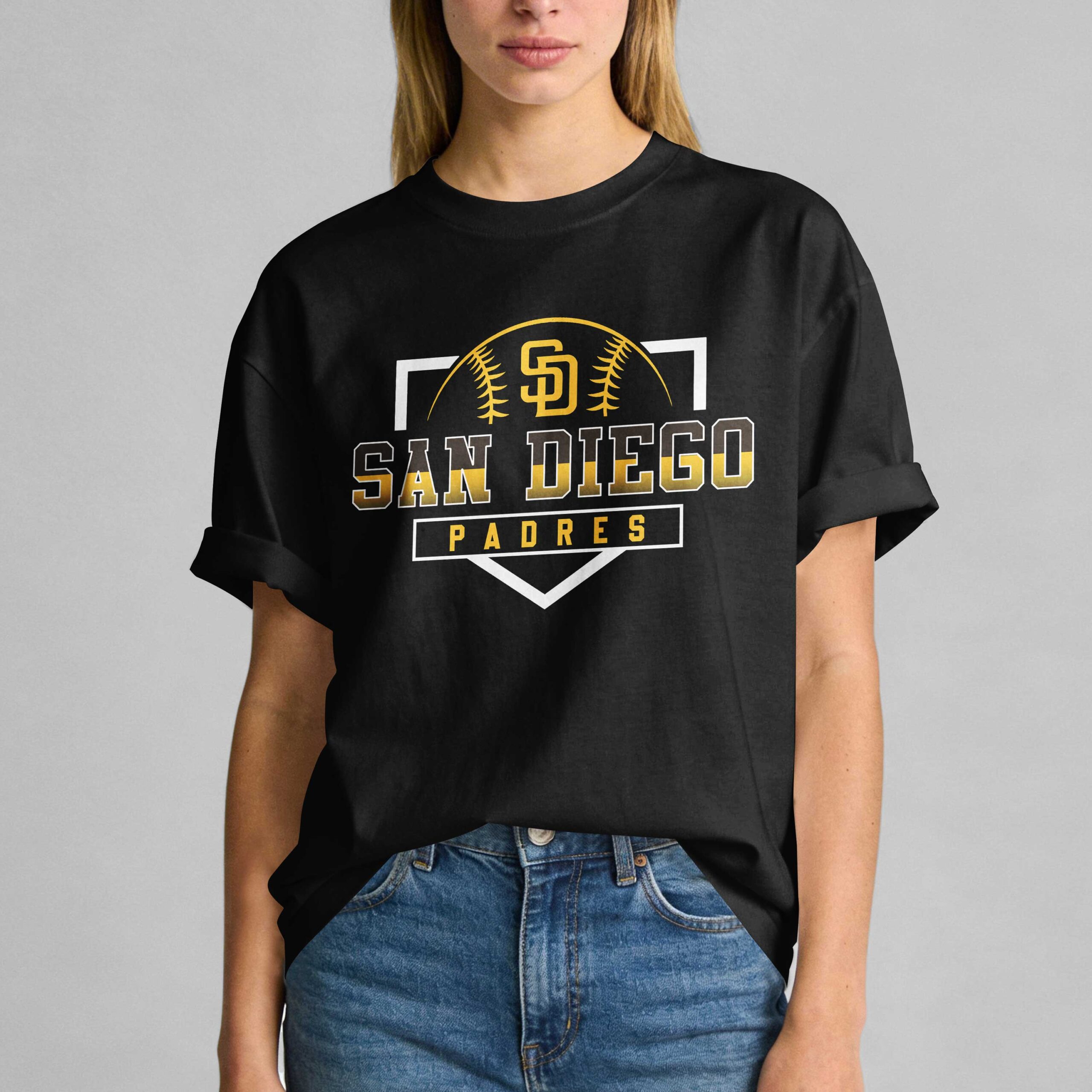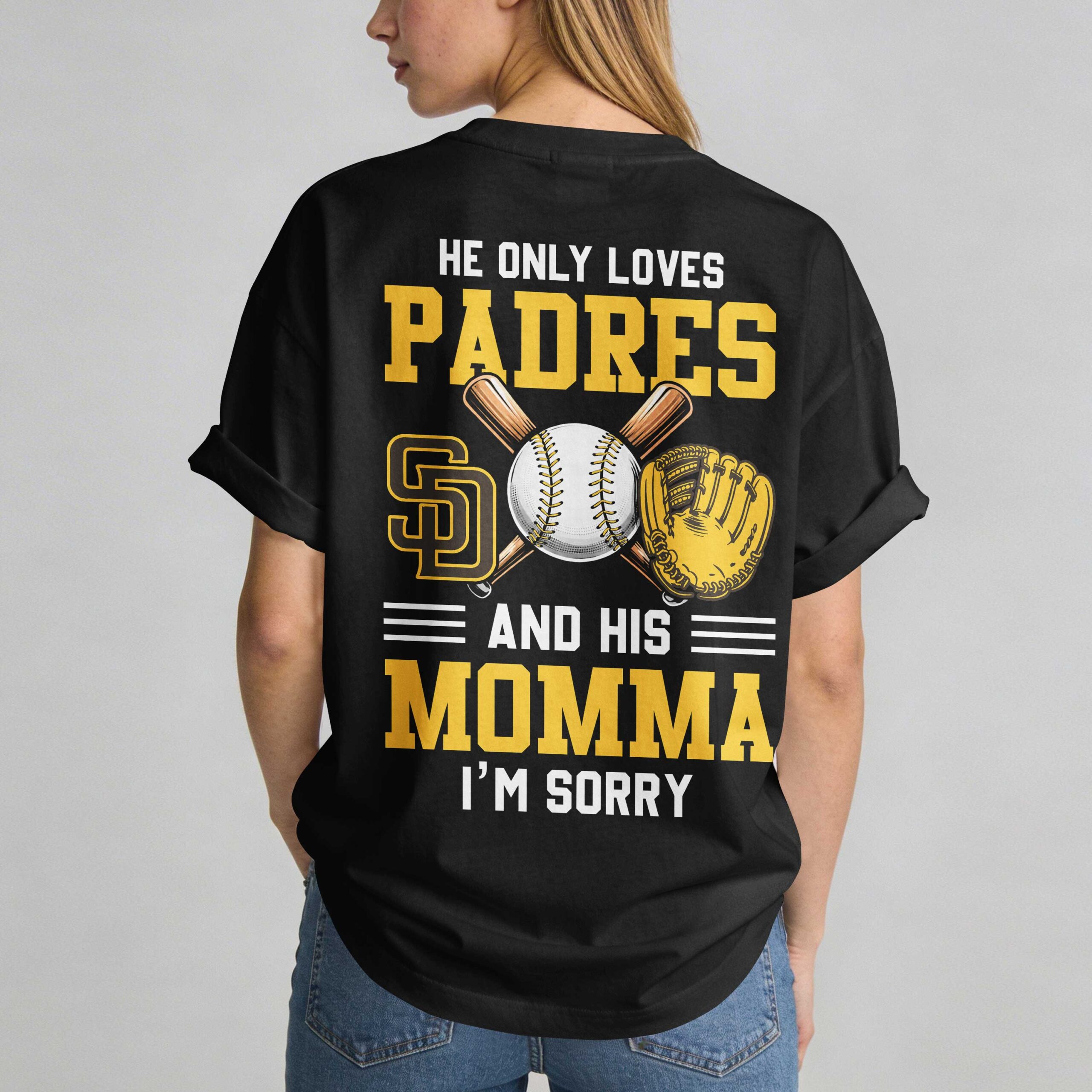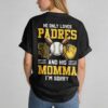 Show off your loyalty to Southern California’s favorite team with this bold San Diego Padres T-shirt. Designed for dedicated fans, this shirt combines a classic sporty look with a touch of modern personality. Whether you’re cheering from the stands at Petco Park or representing your city from afar, this piece is the ultimate way to display your Padres pride and spirit. The front features a clean San Diego Padres graphic centered around the iconic interlocking SD logo set inside a stylized baseball and home plate frame. The back showcases a high-energy design with a playful message: He only loves Padres and his momma, I’m sorry. This back graphic is complete with the team logo, crossed wooden bats, a baseball, and a detailed fielder’s glove. This shirt is perfect for game day, ballpark visits, or Independence Day celebrations. It’s a versatile choice for any fan, making a statement from the stadium to casual everyday wear.