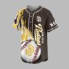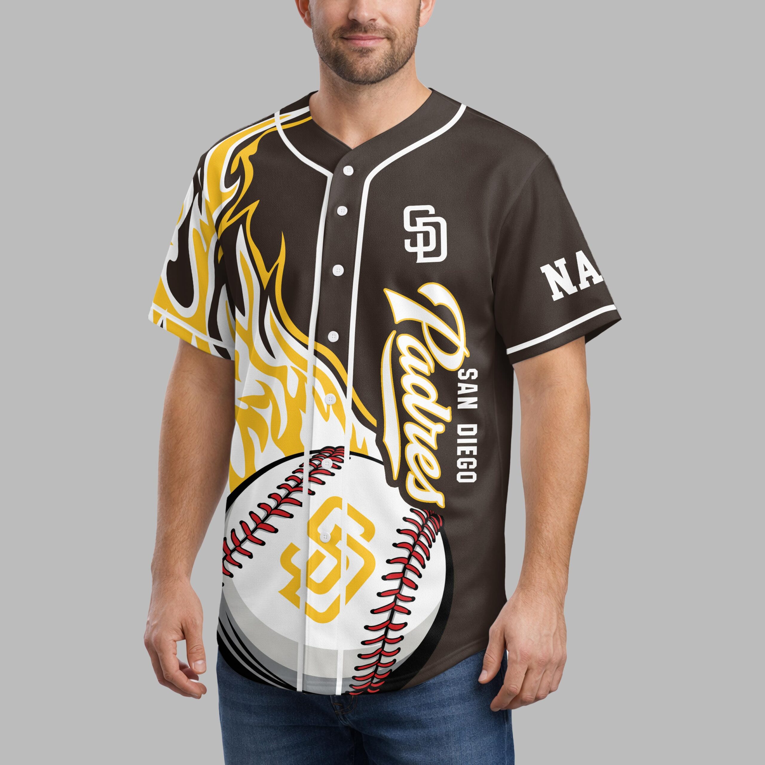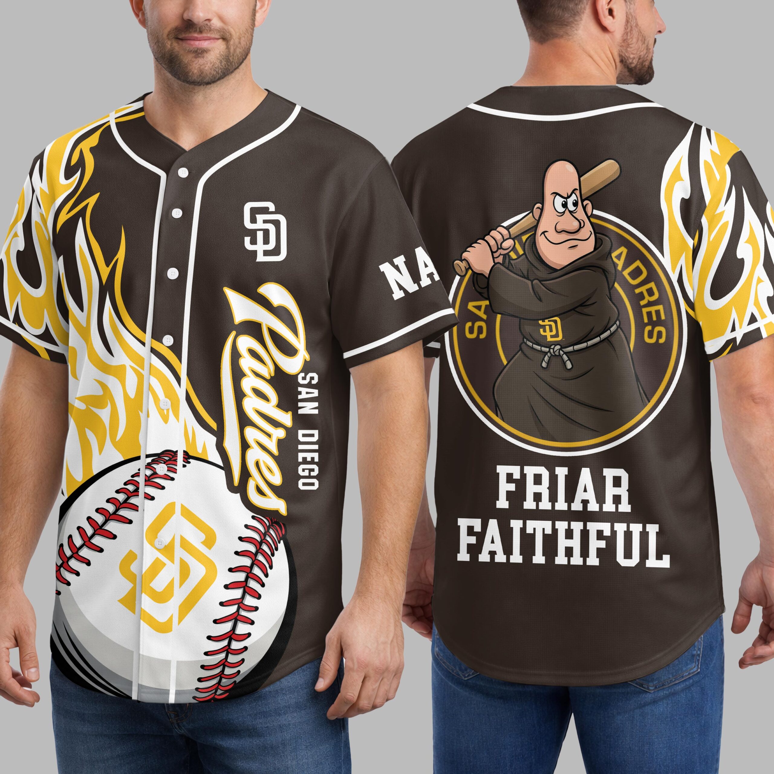 Showcase your unwavering team spirit with this custom-designed San Diego Padres baseball jersey! Perfect for the ultimate Friar Faithful, this unique piece lets you celebrate your favorite team with bold style. Stand out in the crowd and let everyone know where your loyalty lies, whether you’re at the ballpark or cheering from home. The front of the jersey features dynamic yellow and white flame graphics, igniting the classic Padres script and SAN DIEGO text, complemented by the iconic SD logo and a striking baseball graphic. The back boasts an energetic cartoon friar mascot, bat in hand, encircled by SAN DIEGO PADRES, with the bold declaration FRIAR FAITHFUL beneath. You can even add your custom name above the friar for a personal touch! This vibrant jersey is ideal for game days at Petco Park, watch parties with friends, or simply showing off your Padres pride around town. It’s more than just a shirt; it’s a statement of dedication for every passionate San Diego fan.