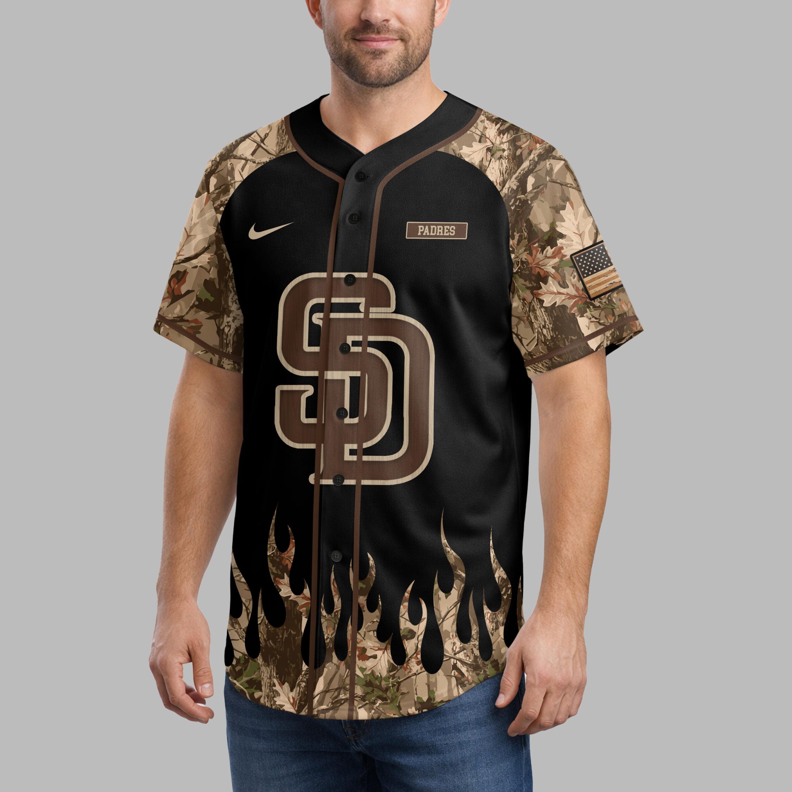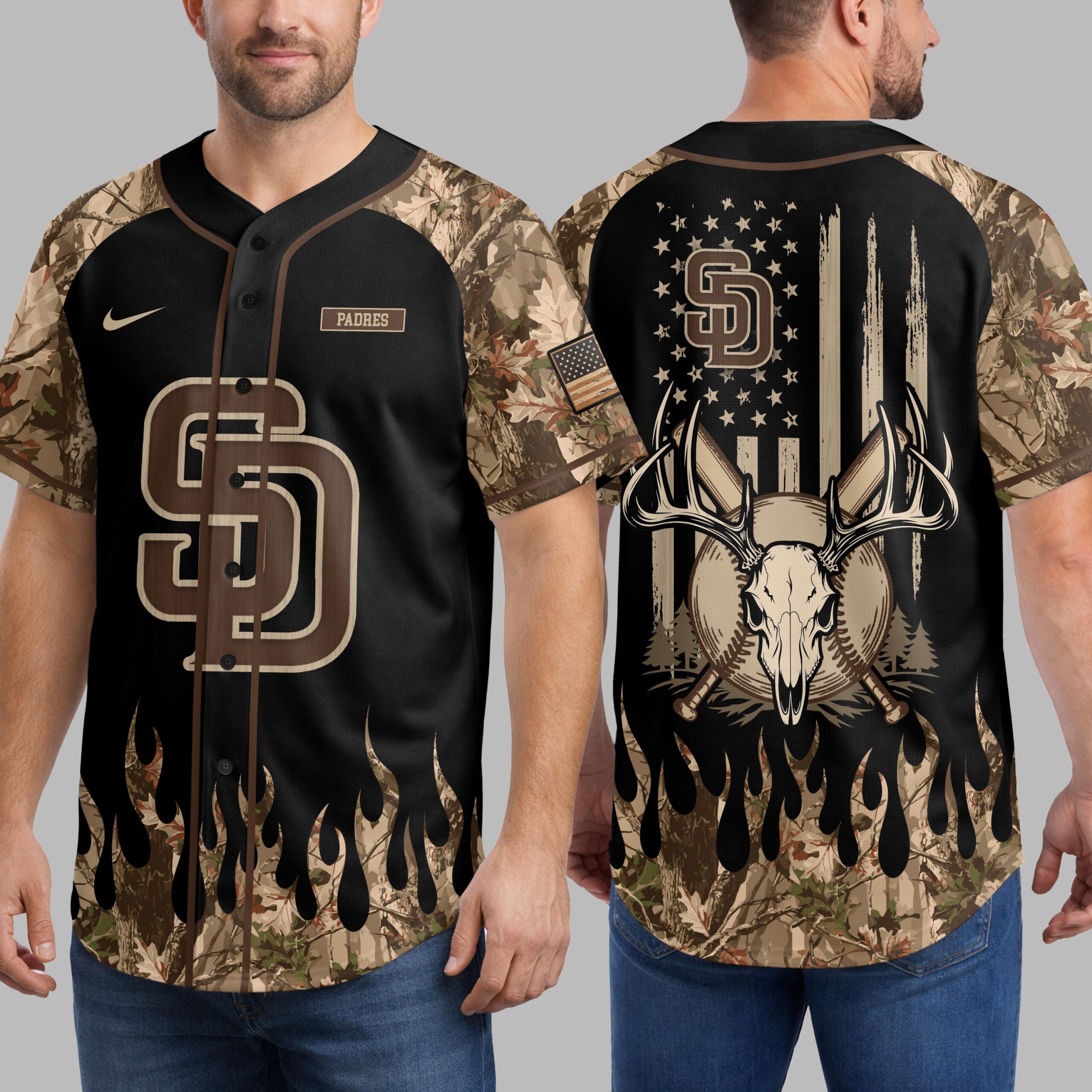 Unleash your ultimate fan spirit with this San Diego Padres Camo Hunt Baseball Jersey! Perfect for those who live and breathe Padres baseball while also embracing their passion for the great outdoors. This unique jersey masterfully blends iconic team pride with a rugged, adventurous style, making it a standout piece for any devoted fan. The front proudly displays the bold SD logo in a rich, wood-grain brown, accented by a PADRES patch on the right shoulder. Camouflage sleeves and a distinctive camo flame design along the bottom add an edgy, wilderness-inspired touch. Turn around to reveal a striking distressed American flag background, emblazoned with a deer skull and antlers, a classic baseball, and crossed bats – all beneath another powerful SD emblem. Whether you’re cheering from the stands at Petco Park, heading out for a weekend adventure, or simply showing off your dual loyalties around town, this jersey is designed to impress. It’s the ideal way to represent your team and your love for hunting and country, all in one powerful statement. Get ready to show off your Padres pride with a wild side!