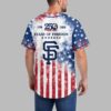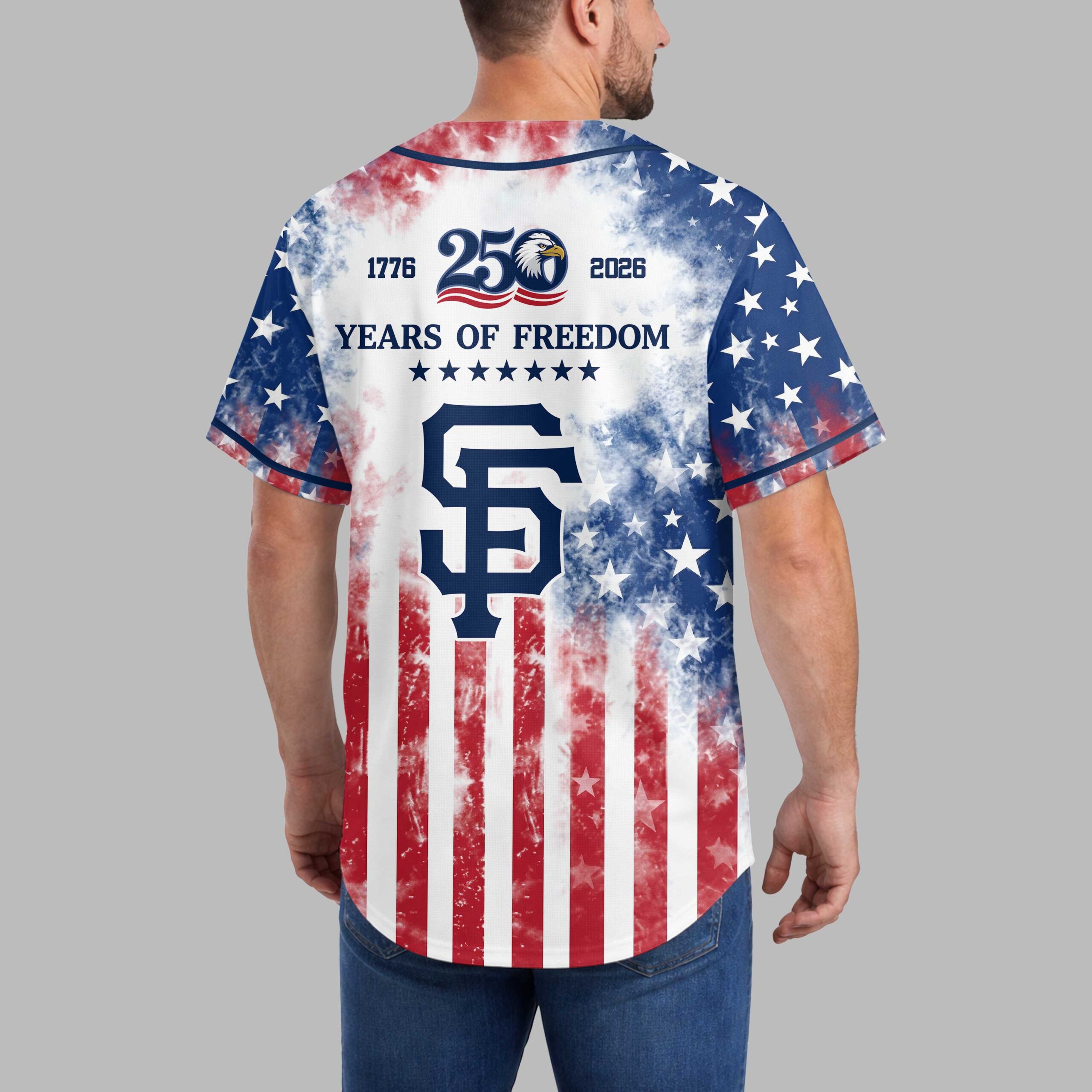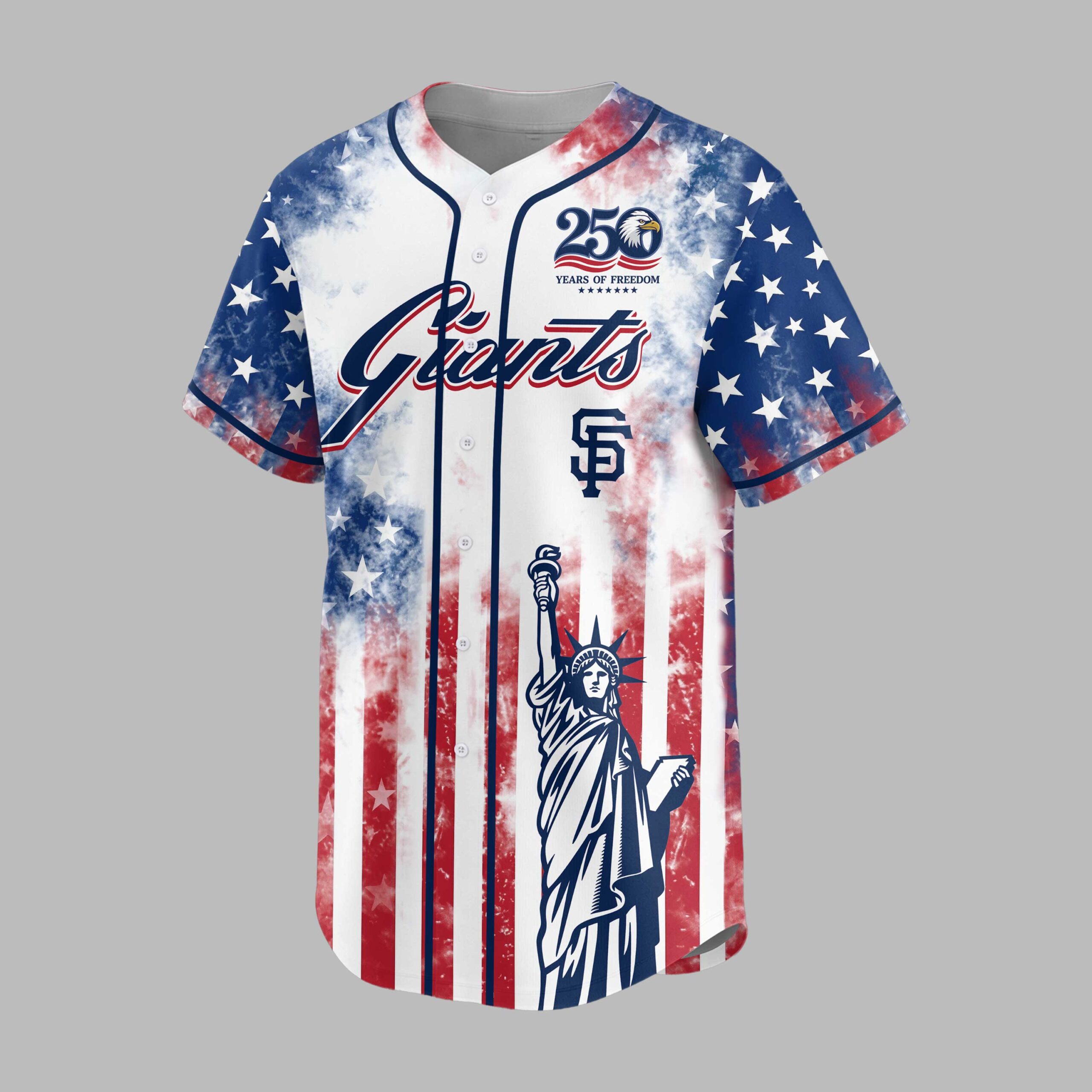 Show your American and San Francisco Giants pride with this commemorative patriotic baseball jersey. Celebrating 250 years of freedom, this unique shirt blends national heritage with spirited team loyalty, perfect for dedicated fans. The front showcases the iconic ‘Giants’ script and ‘SF’ logo on a distressed American flag backdrop, featuring the Statue of Liberty. A ‘250 Years of Freedom’ emblem with a majestic bald eagle marks this anniversary. The back displays ‘1776 – 2026’ and the ‘SF’ logo, all integrated into the patriotic stars and stripes. Ideal for game days, Fourth of July, Memorial Day, or any event to proudly display your spirit and fandom. Wear it to parades, gatherings, or as a bold everyday statement. It’s a powerful symbol of tradition, freedom, and team loyalty.