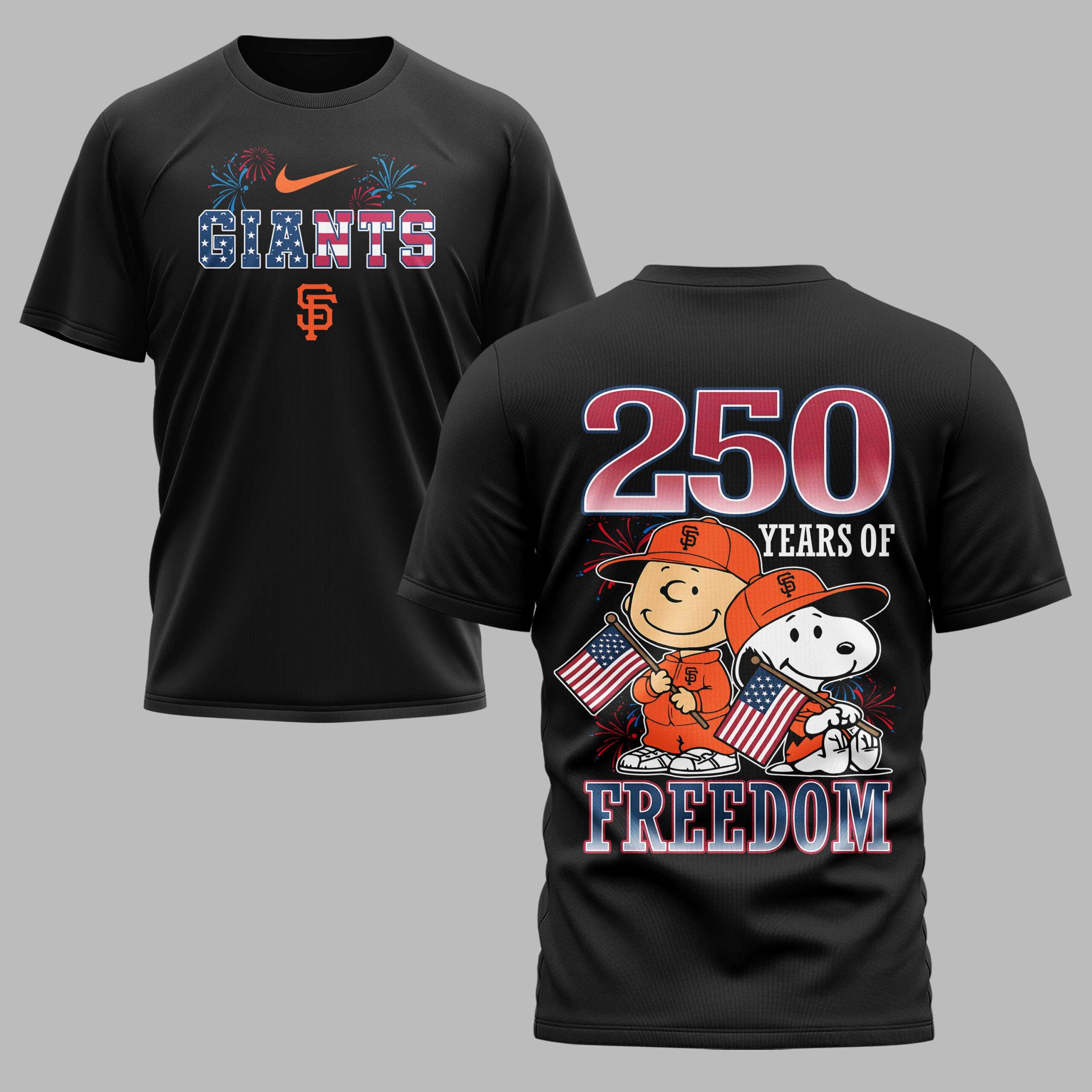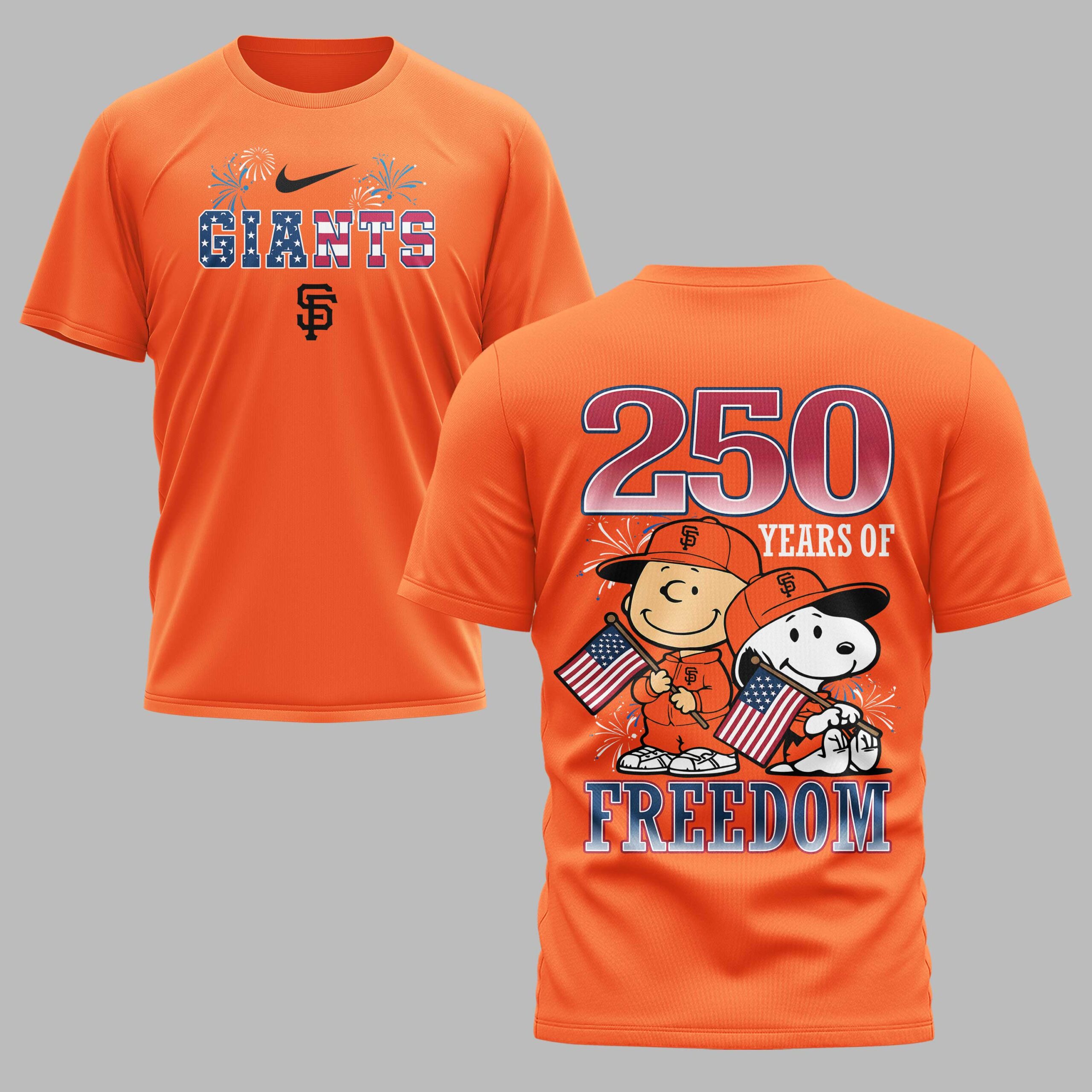Celebrate your San Francisco Giants pride and American spirit with this commemorative tee! This unique design blends your love for the Giants with freedom’s essence, featuring beloved Peanuts characters. Honor a historical milestone while enthusiastically supporting your team. The front proudly displays GIANTS in a stars and stripes pattern, accented by the iconic SF logo and vibrant fireworks. The back makes a grand statement: 250 YEARS OF FREEDOM, showcasing Charlie Brown and Snoopy in Giants hats, each waving an American flag amid dazzling fireworks. Perfect for Fourth of July, Memorial Day, or any San Francisco Giants game, this shirt lets you showcase team loyalty and patriotism. Wear it to the ballpark, a family gathering, or community event – a fantastic way to express your dual passions for baseball and country.