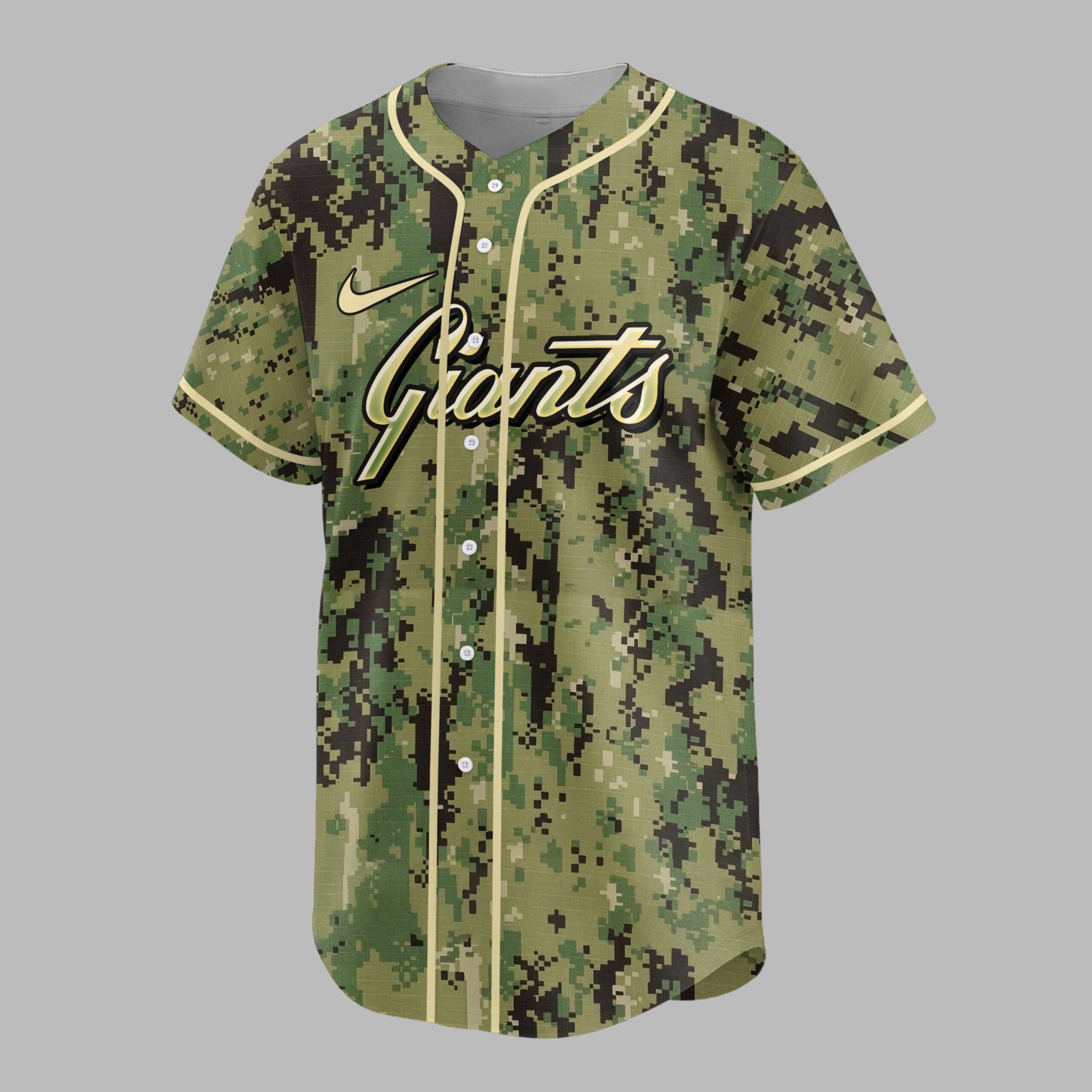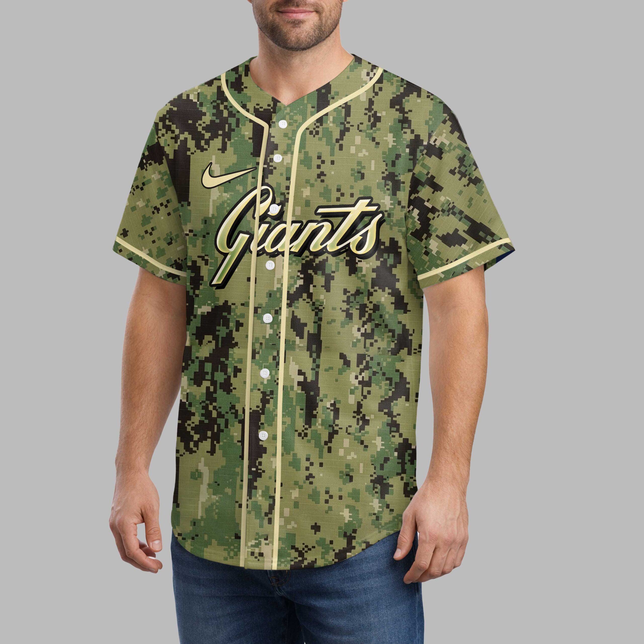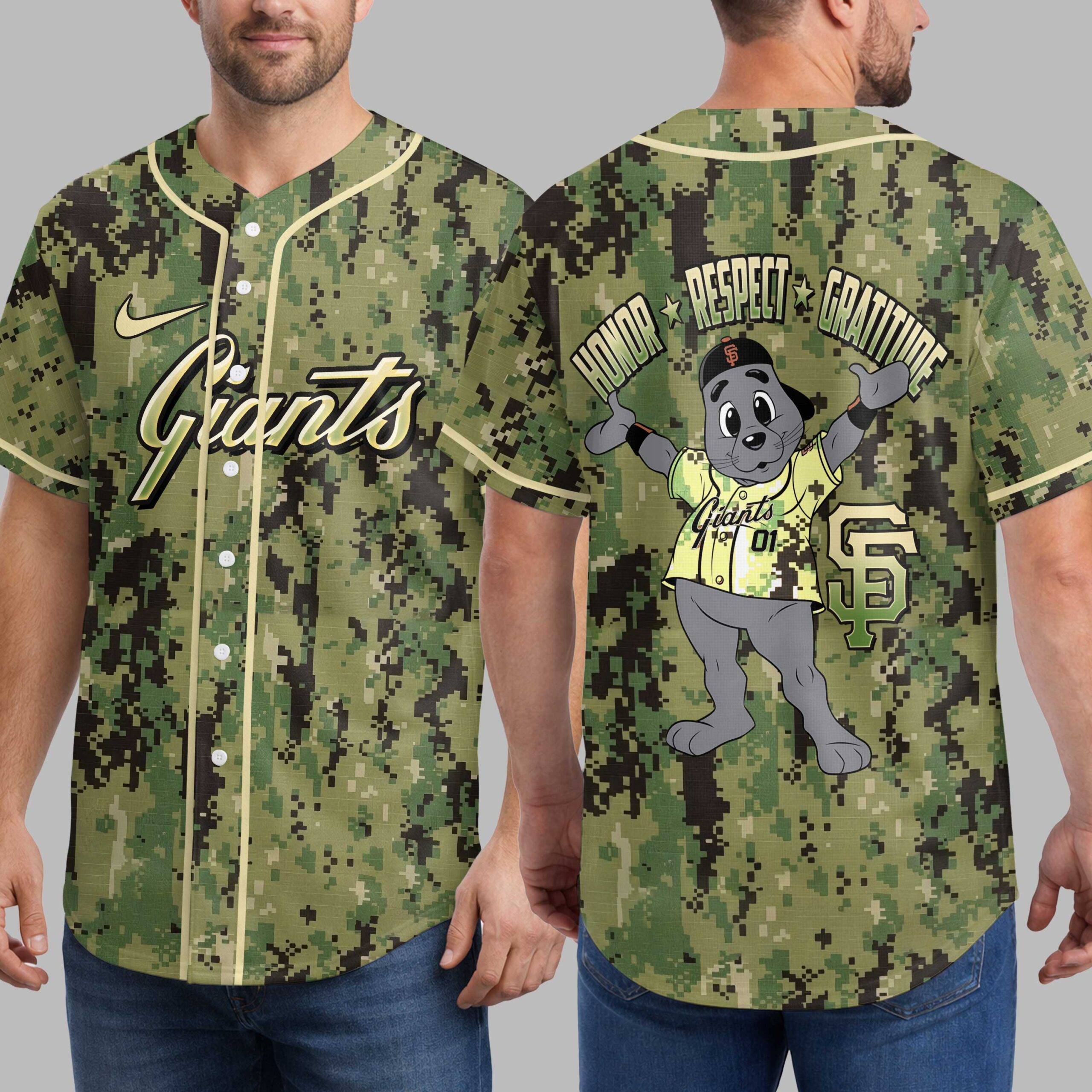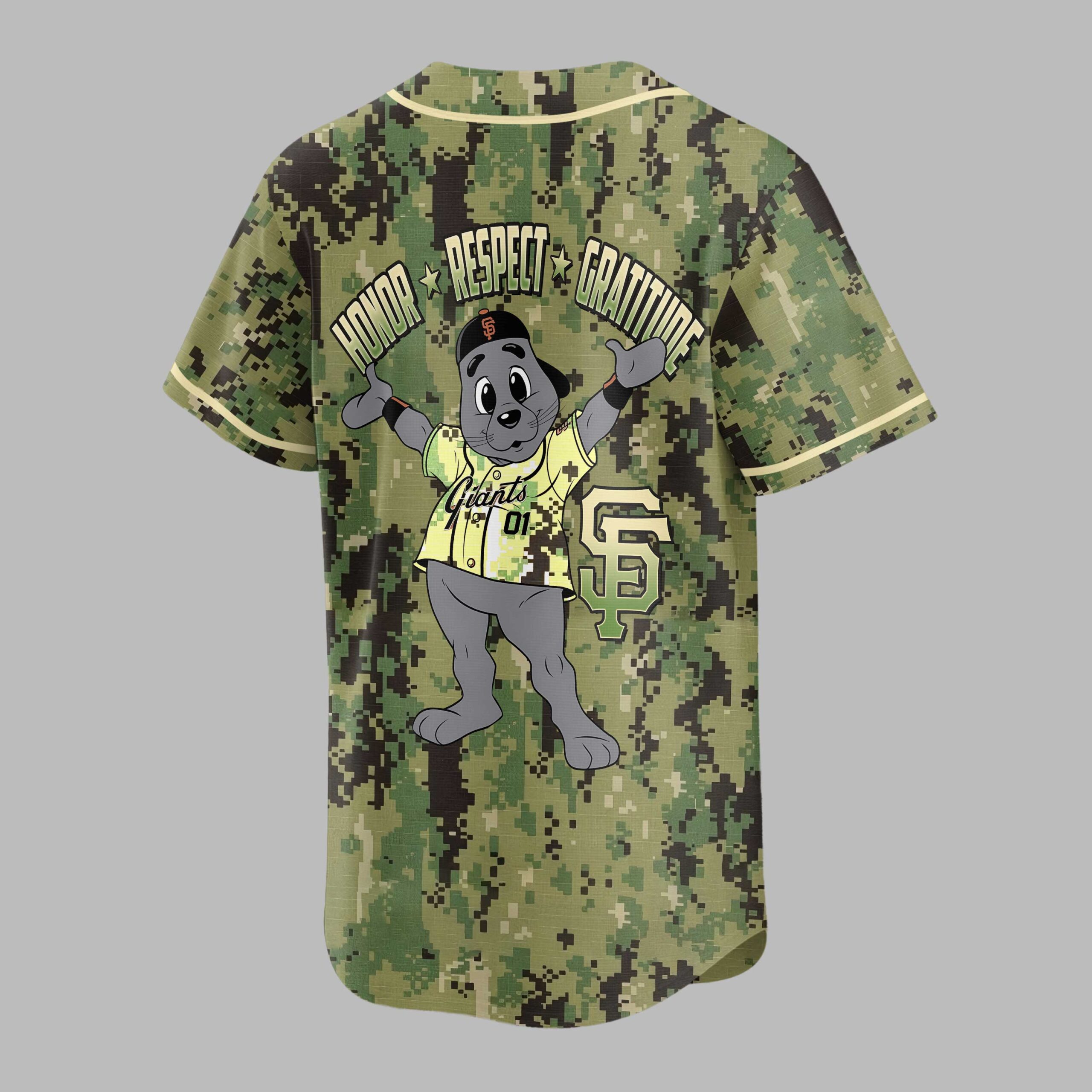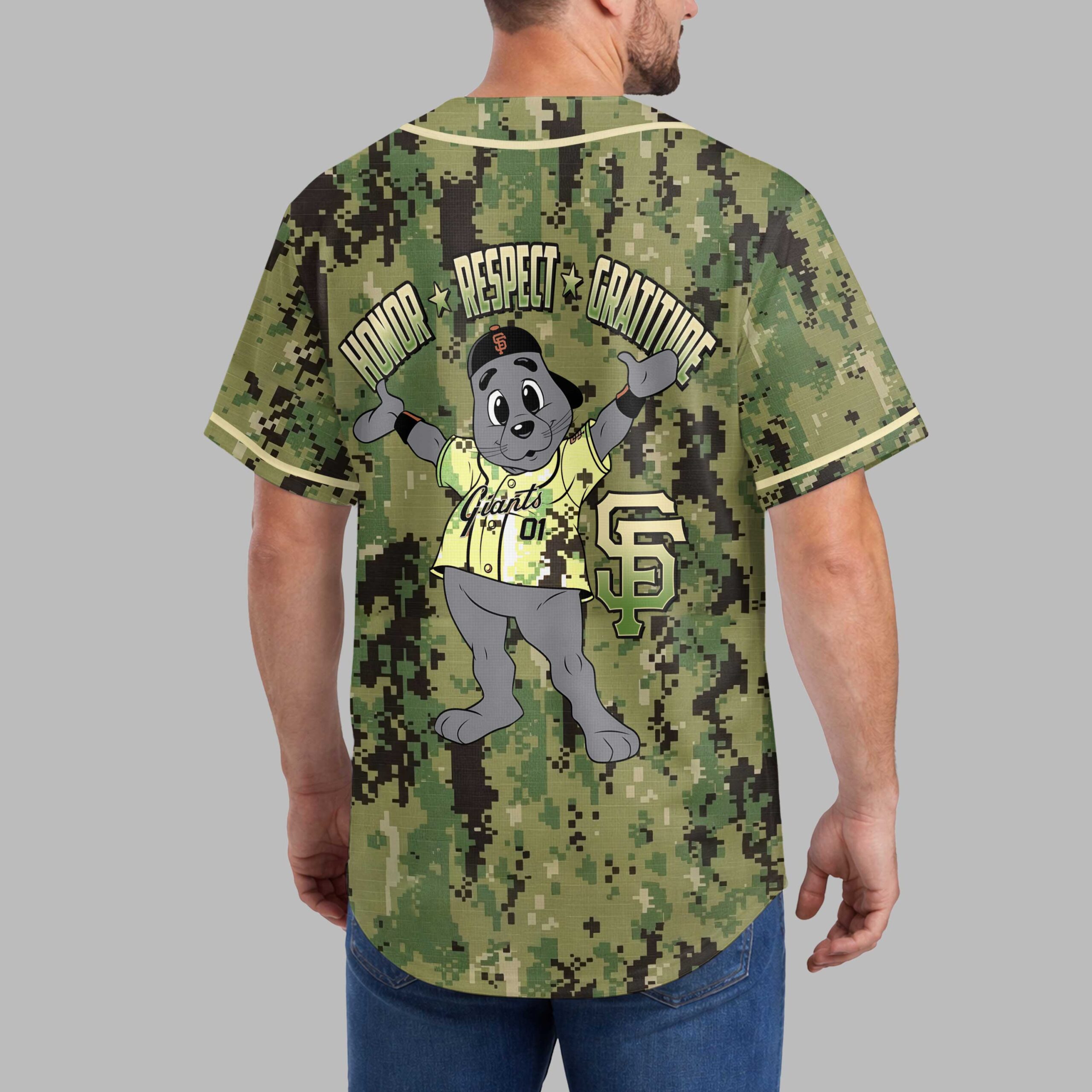 Show your unwavering pride for the San Francisco Giants with a powerful tribute! This unique baseball jersey perfectly blends your passion for the team with a heartfelt salute to service. It’s more than just fan apparel; it’s a statement of loyalty and appreciation, designed for those who stand tall for their team and their country. The front proudly displays the iconic ‘Giants’ script in bold cream and black against a striking digital camouflage pattern, accented with classic light yellow piping. Turn heads with the back design featuring an energetic Giants mascot in team gear, holding signs that declare ‘HONOR’ and ‘RESPECT,’ with ‘GRATITUDE’ arched above. A prominent ‘SF’ logo completes this dynamic and meaningful design. Perfect for game days at the ballpark, military appreciation events, or simply everyday wear to express your dedicated fan spirit. This jersey is an impactful way to celebrate both the San Francisco Giants and the values of honor and respect. Gear up and let your team and patriotic spirit shine!
