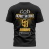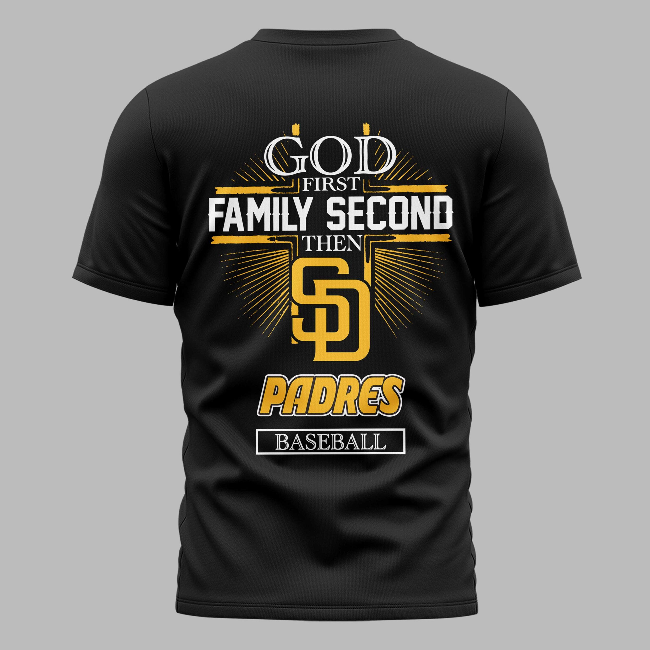 Step up your fan game with a design that reflects your deepest values and your love for San Diego baseball. This shirt captures the essence of being a true Padres supporter, combining undeniable team spirit with a clear statement of pride that resonates far beyond the diamond. The front showcases the classic San Diego Padres wordmark and interlocking SD logo integrated into a sharp, energetic baseball graphic. The back makes a powerful impact with a God First, Family Second declaration, placing Padres baseball as the ultimate priority. The vibrant yellow accents and sunburst backdrop create a dynamic, radiating look that stands out in any crowd. Ideal for game days at the stadium, local Independence Day celebrations, or casual outings around town, this tee is built for the energetic fan. Show everyone where your heart lies while representing San Diego with conviction every time you step out.