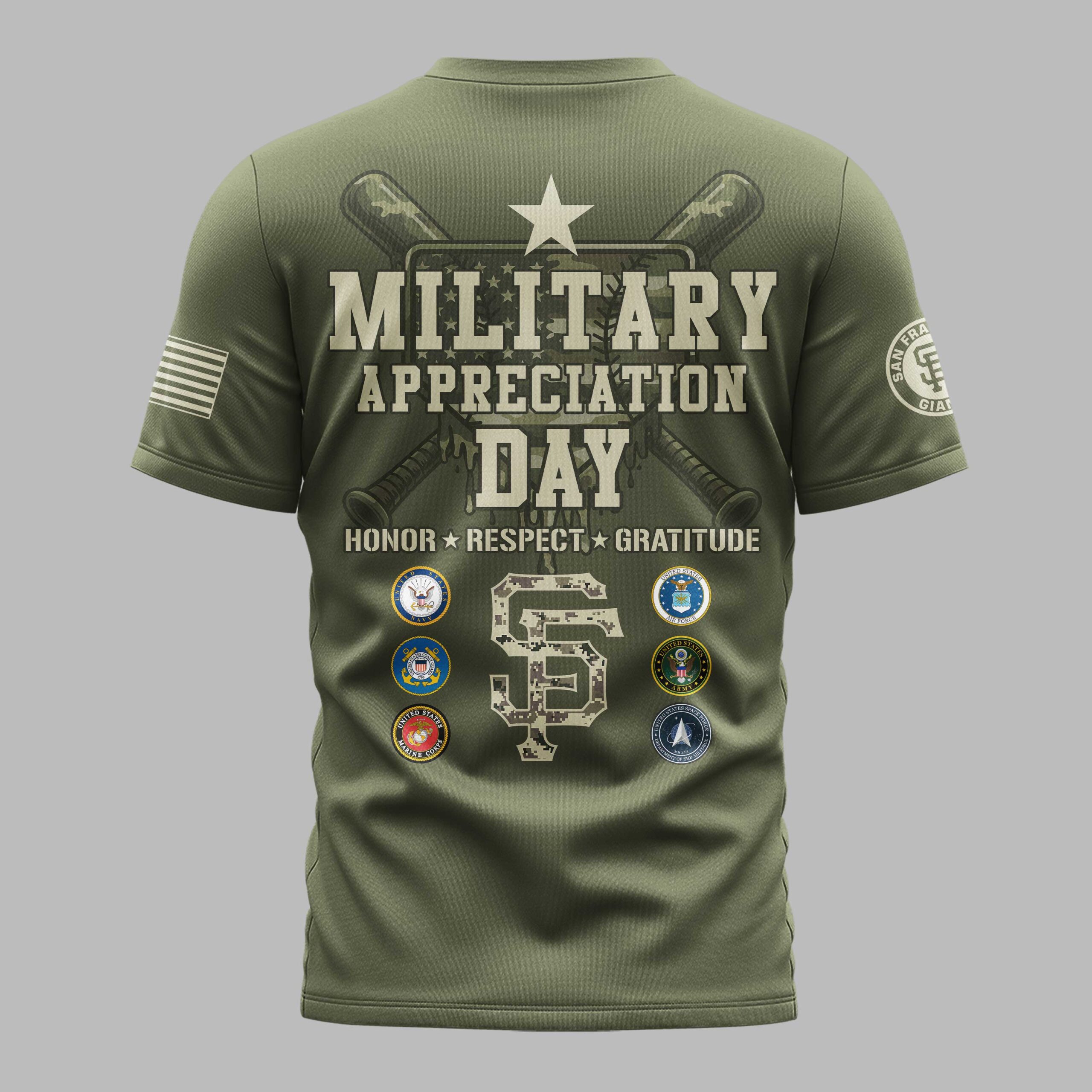 Show your unwavering support for both your favorite team and the brave men and women of our armed forces with this striking San Francisco Giants Military Appreciation Day T-Shirt. The front proudly displays ‘SAN FRANCISCO GIANTS’ in a distinctive camo-filled font, complemented by a patriotic American flag on the right sleeve and the classic team logo on the left. The back features a powerful design declaring ‘MILITARY APPRECIATION DAY’ above crossed baseball bats. Below, the iconic ‘SF’ logo is rendered in a matching camo pattern, surrounded by the emblems of the United States Navy, Marine Corps, Army, Air Force, Coast Guard, and Space Force, all underscored by ‘HONOR * RESPECT * GRATITUDE’. This shirt is perfect for game day at Oracle Park, a Veterans Day parade, or any occasion where you want to proudly display your Giants fandom and your heartfelt gratitude for military service. Wear it to show your spirit and appreciation for those who protect our nation.