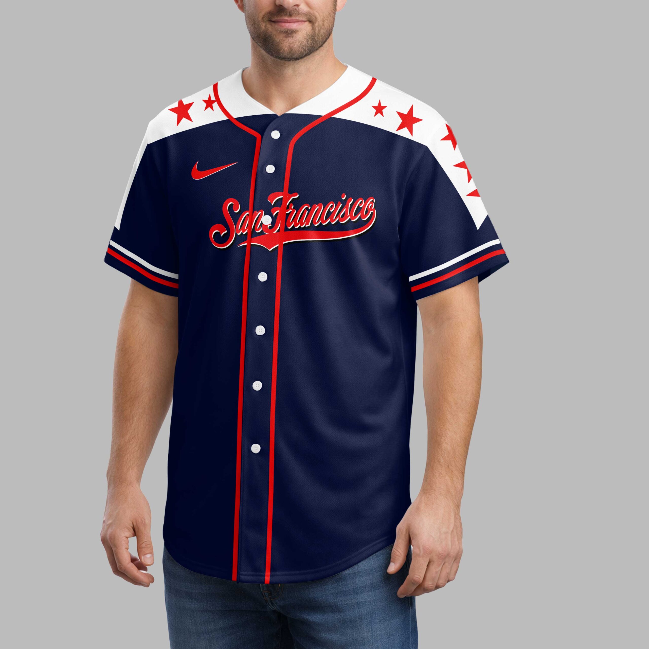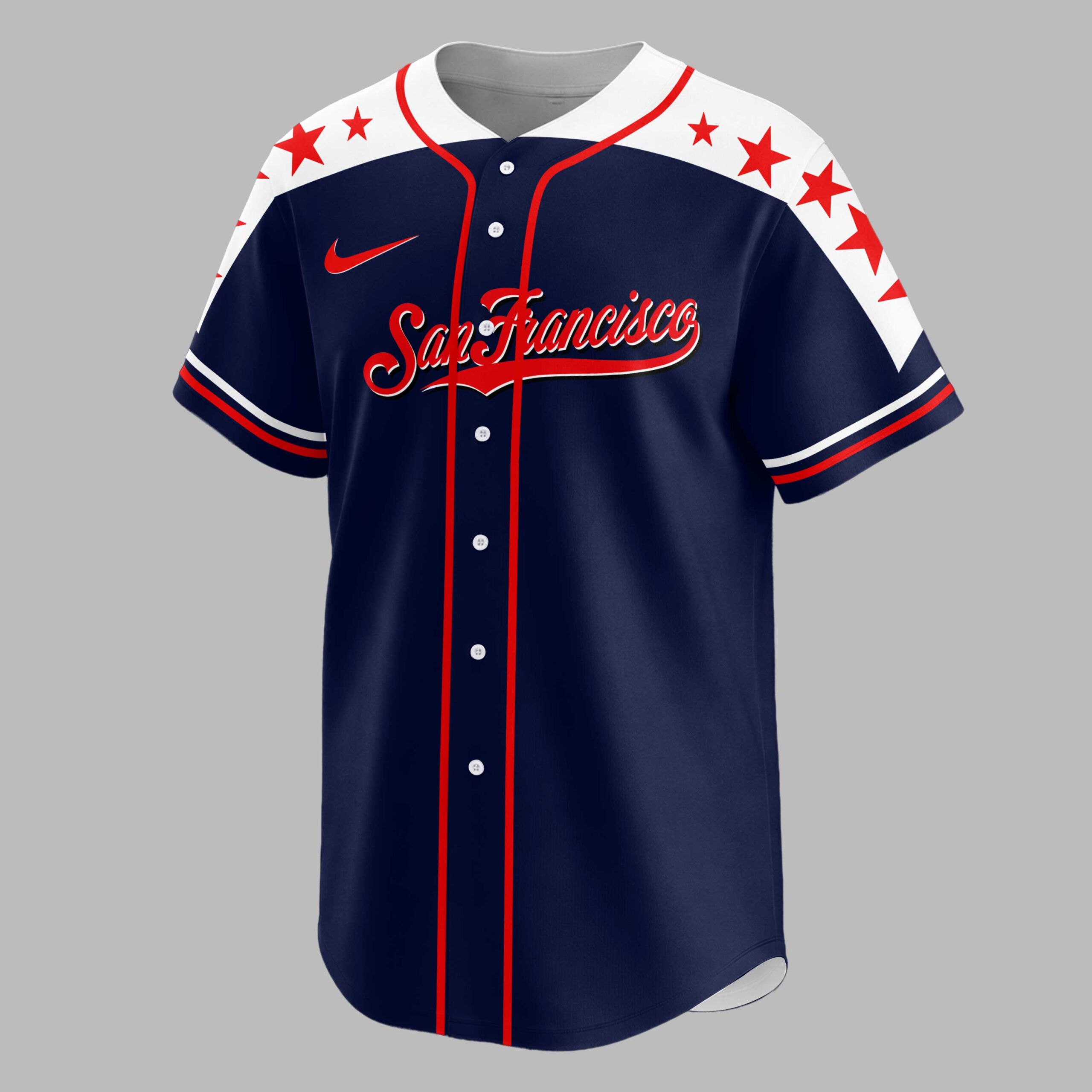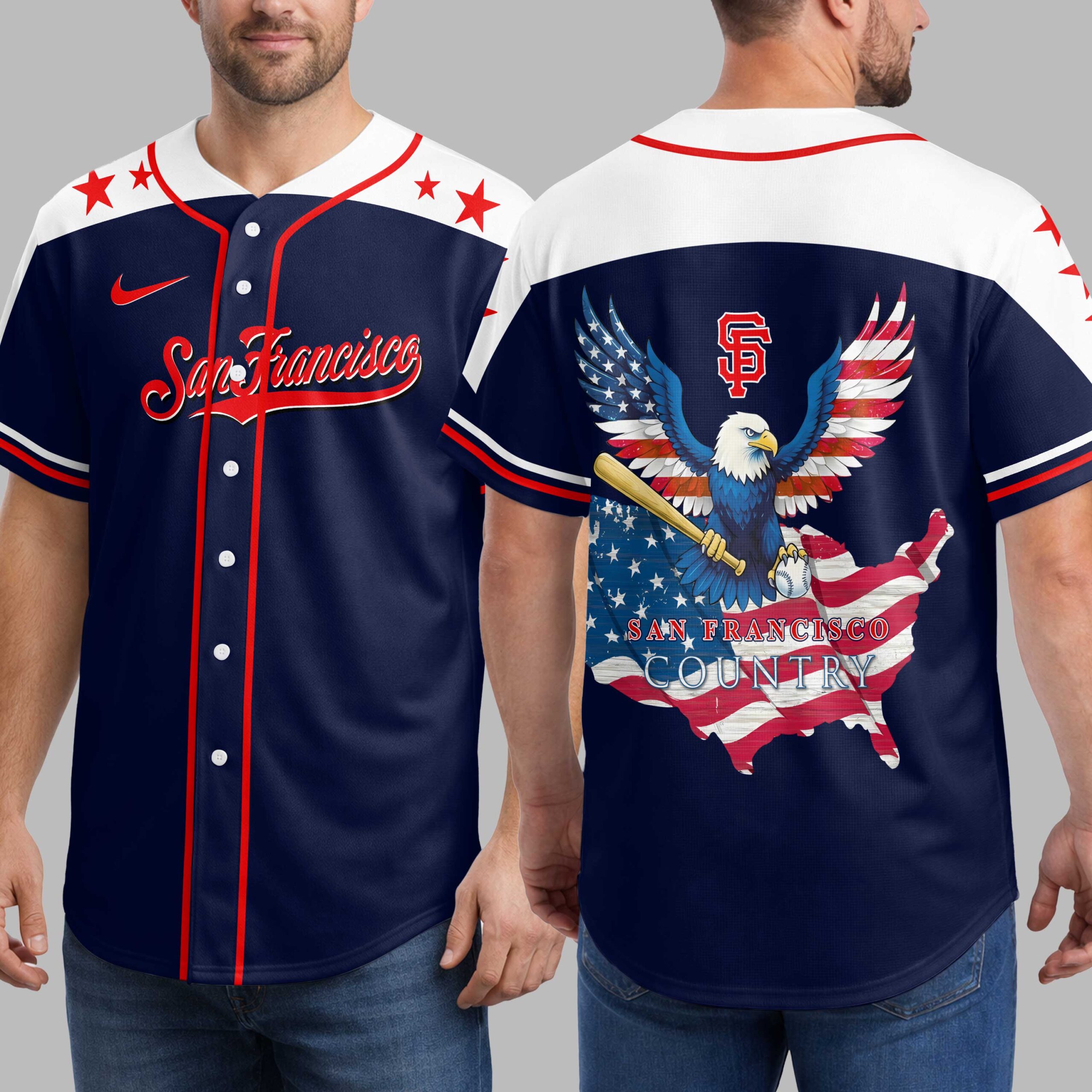 Hit a home run with your San Francisco baseball pride in this captivating patriotic jersey! It perfectly blends your passion for the game with unwavering love for your country. Designed for true fans, showcase your spirit with enthusiasm at every pitch and beyond. The front boldly features San Francisco in elegant script, framed by vibrant red stars across the shoulders and crisp red piping. The back makes a powerful statement: a majestic bald eagle with American flag wings clutches a bat and ball over a distressed U.S. map. The iconic SF logo sits above, and SAN FRANCISCO COUNTRY proudly declares your dual devotion. Perfect for cheering at the ballpark, celebrating national holidays, or simply expressing your pride daily. This jersey unites San Francisco team spirit with American patriotism. Wear it proudly and let your allegiance shine, wherever you go!