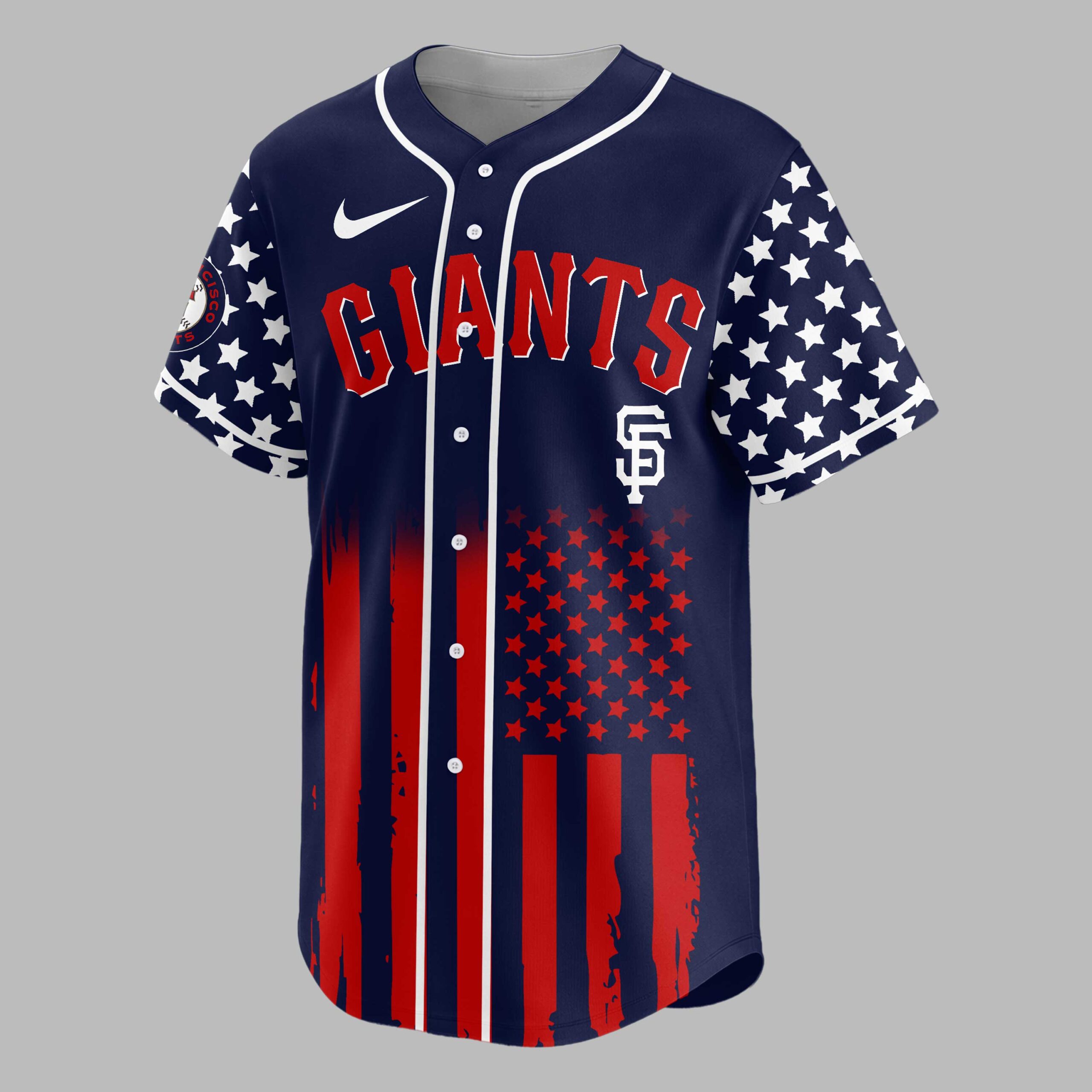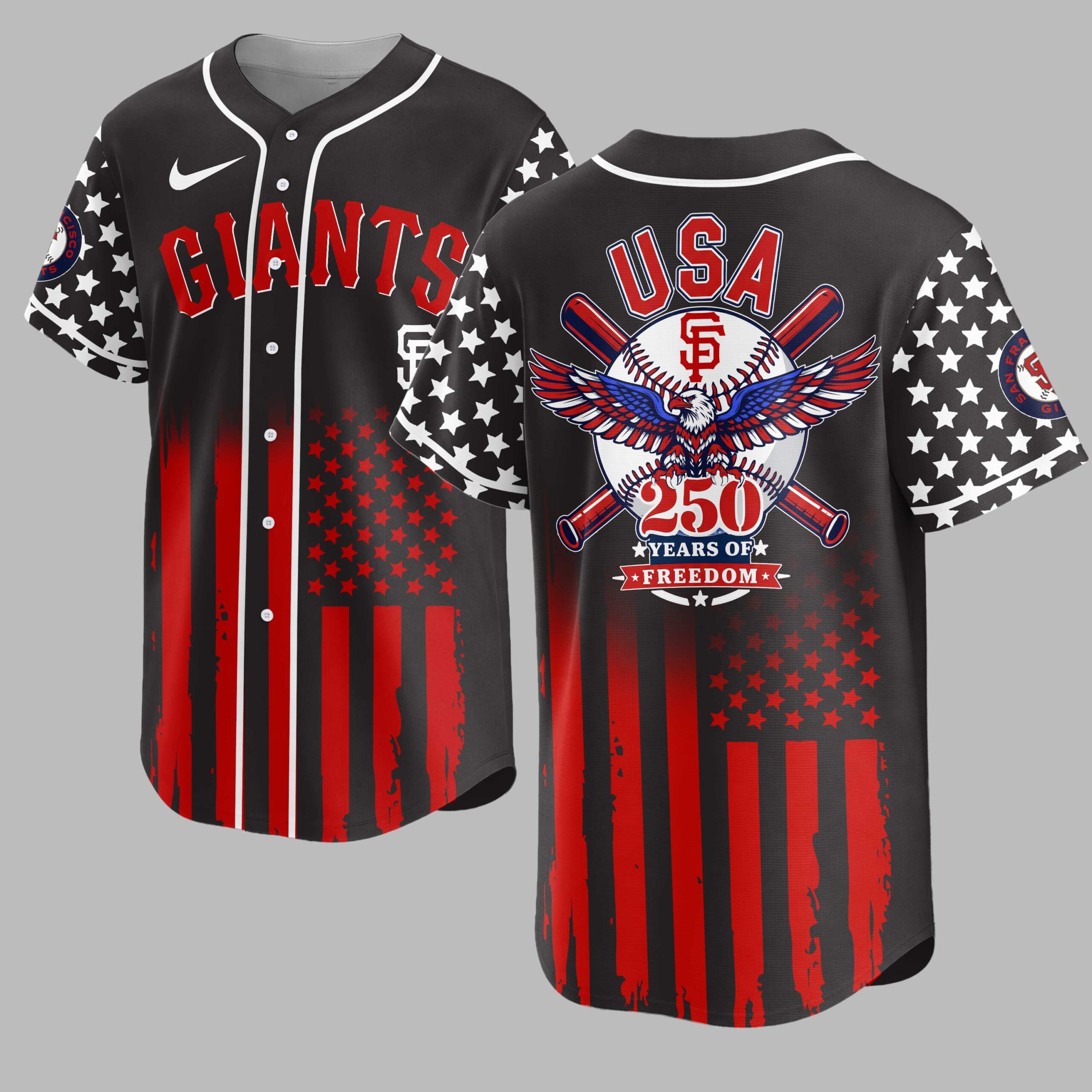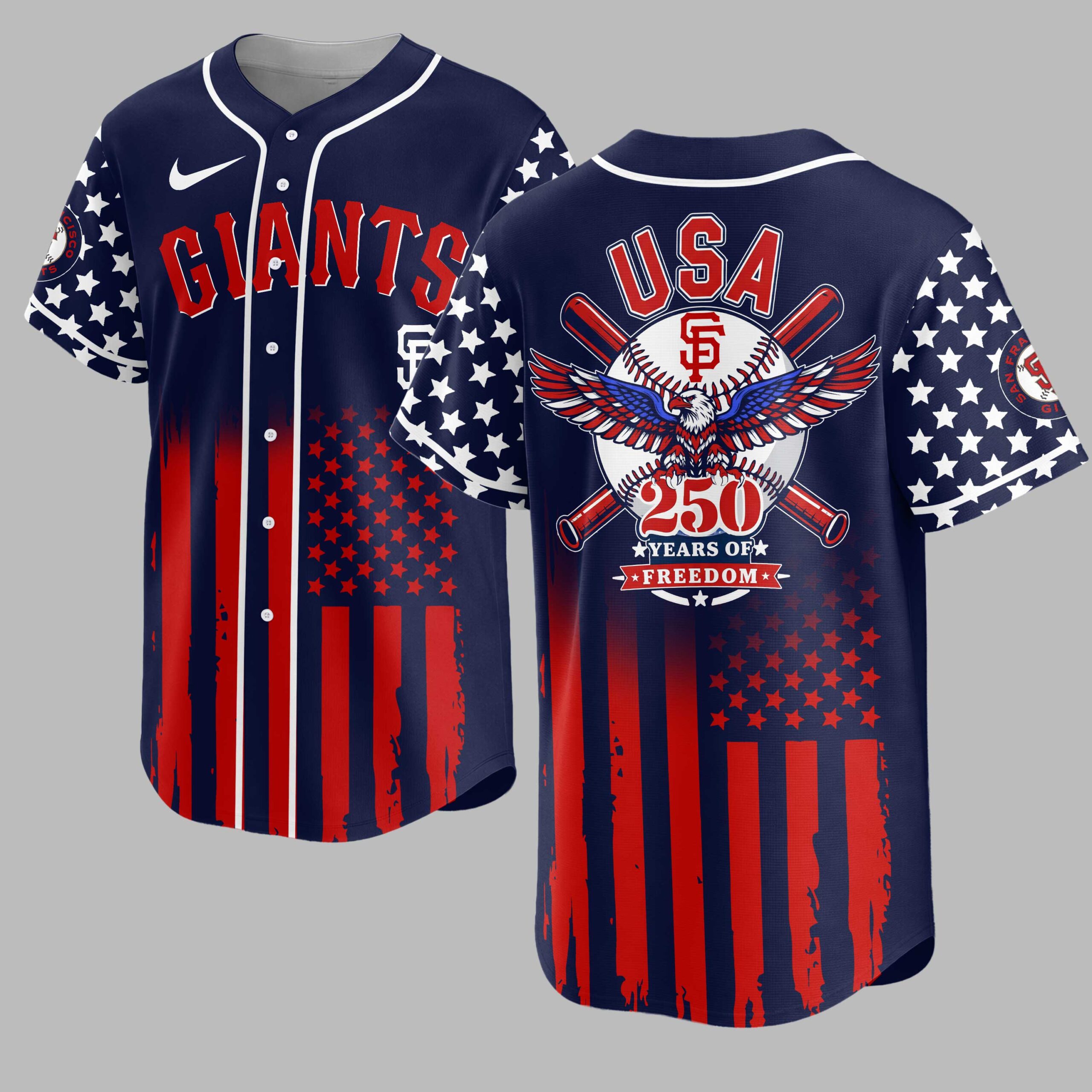 Show your unwavering pride for the San Francisco Giants and celebrate American freedom with this striking patriotic baseball jersey! This design perfectly blends your passion for baseball with a deep appreciation for the nation, making it an essential piece for any fan who loves their team and their country. The front proudly displays GIANTS in bold red lettering, complemented by a distressed American flag design featuring red stripes along the bottom and white stars adorning the sleeves. Turn around to reveal a powerful back design with USA at the top, an iconic eagle clutching a baseball with the SF logo, crossed bats, and the commemorative message 250 YEARS OF FREEDOM in a classic banner. The distressed flag pattern continues, accented by red stars. This jersey is perfect for gamedays, Fourth of July celebrations, Memorial Day gatherings, or any occasion where you want to display both your team spirit and national pride. Wear it to the ballpark, a BBQ, or just out and about to share your love for baseball and the USA in a unique and memorable way.