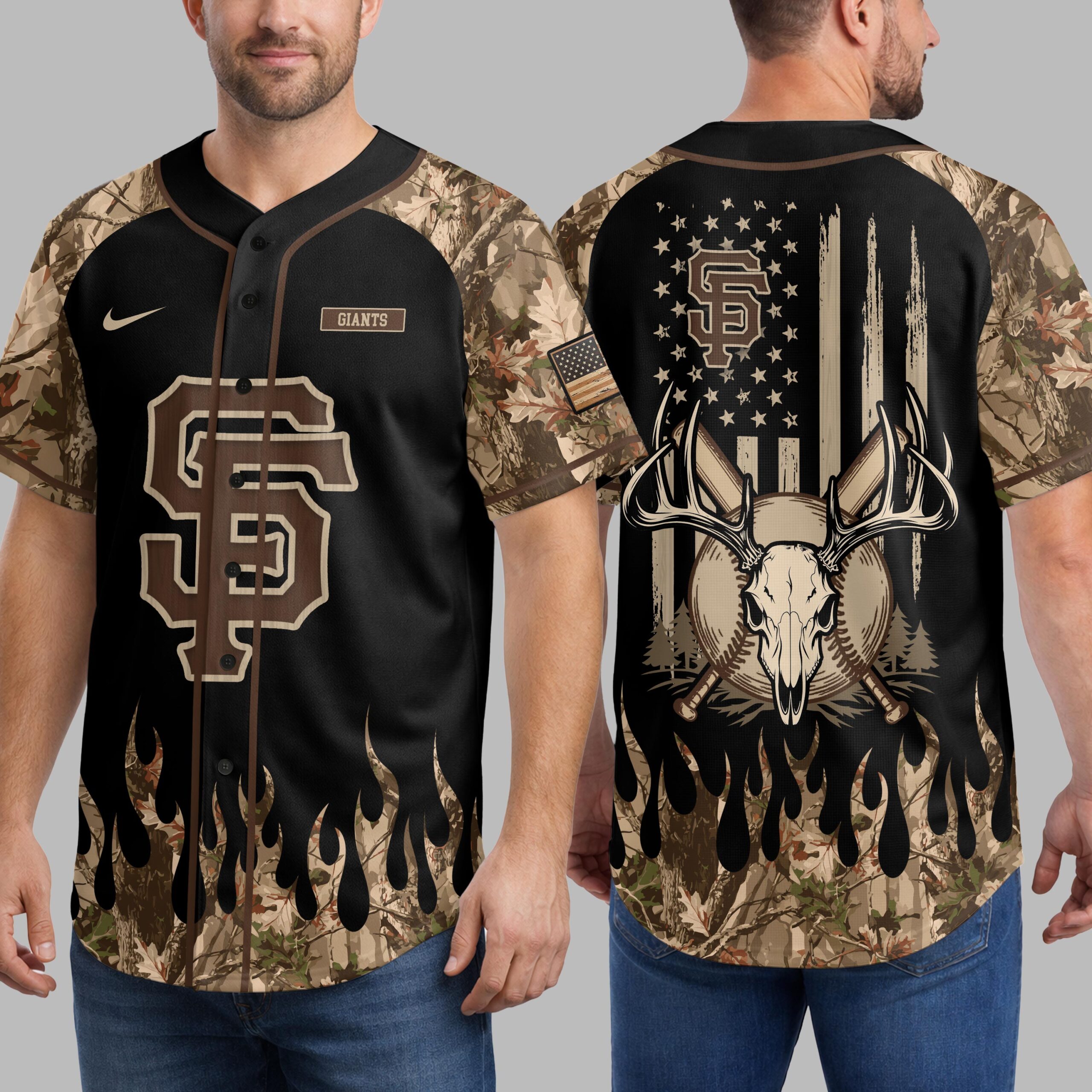 This unique jersey celebrates the San Francisco Giants with an adventurous twist, blending classic team pride with a rugged outdoor spirit. Perfect for fans who love both the thrill of the game and the call of the wild, this shirt lets you represent your team in a bold, distinctive way. The front features the iconic SF logo in a rich wood grain texture, complemented by a GIANTS patch, all set against a sharp black backdrop. Camouflage sleeves flow into an eye-catching flame design along the bottom. Turn around to reveal a striking distressed American flag on the back, proudly displaying the SF emblem, alongside a deer skull with majestic antlers, crossed baseball bats, and pine trees, embodying a true hunter’s devotion. Whether you’re at Oracle Park cheering on the Giants, out in nature, or simply showing off your versatile style, this jersey is designed to stand out. It’s ideal for game days, hunting trips, casual outings, or just making a statement about your dual passions.