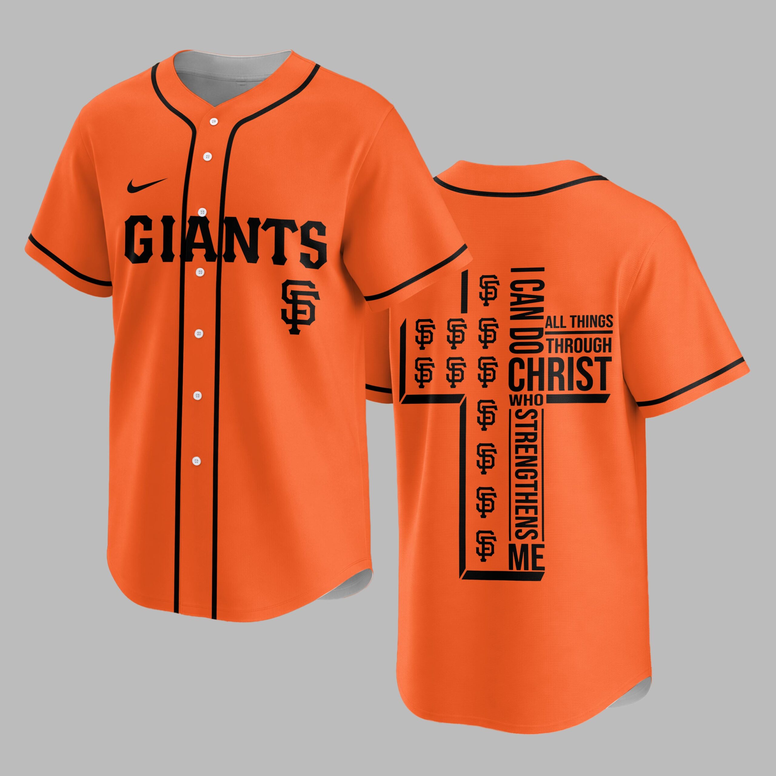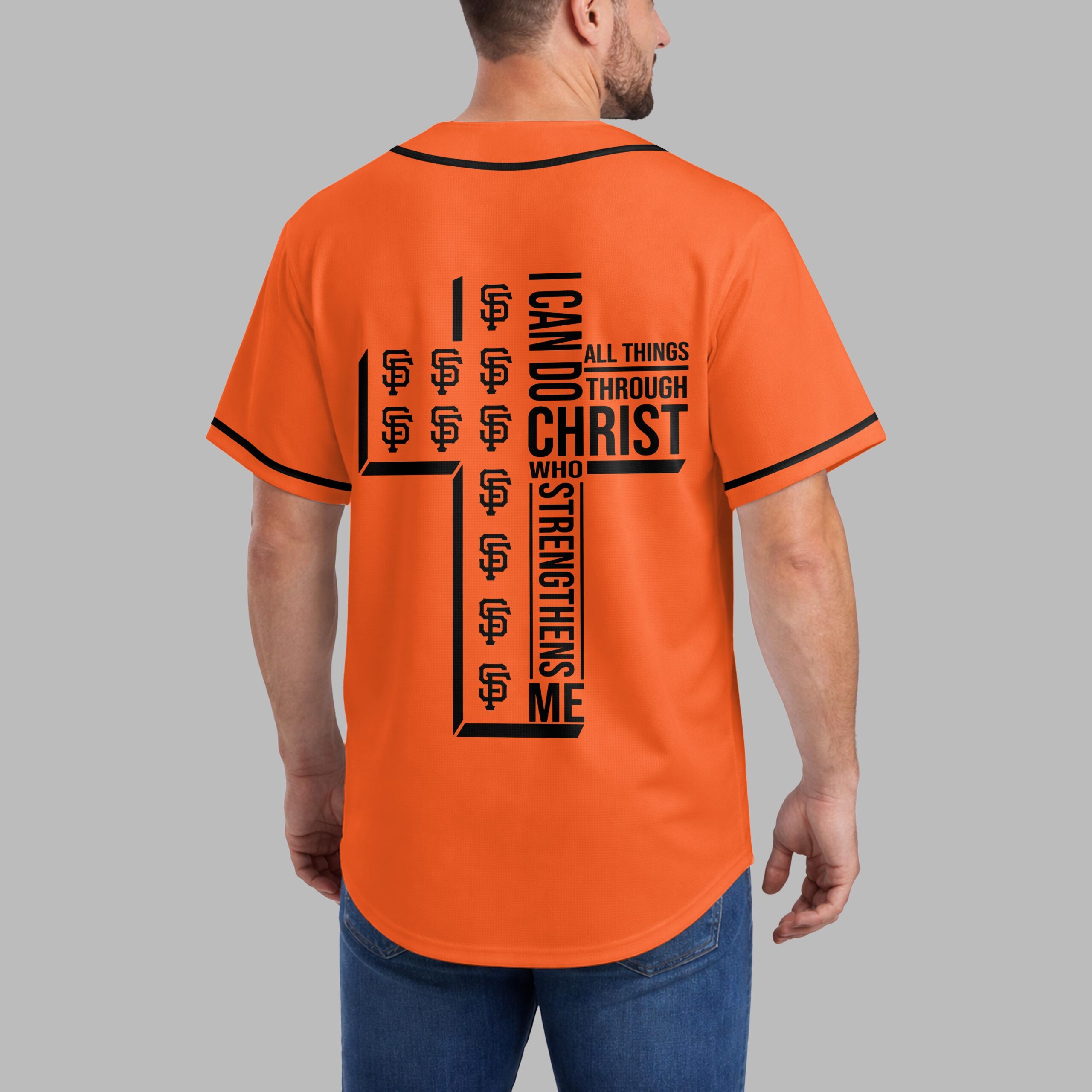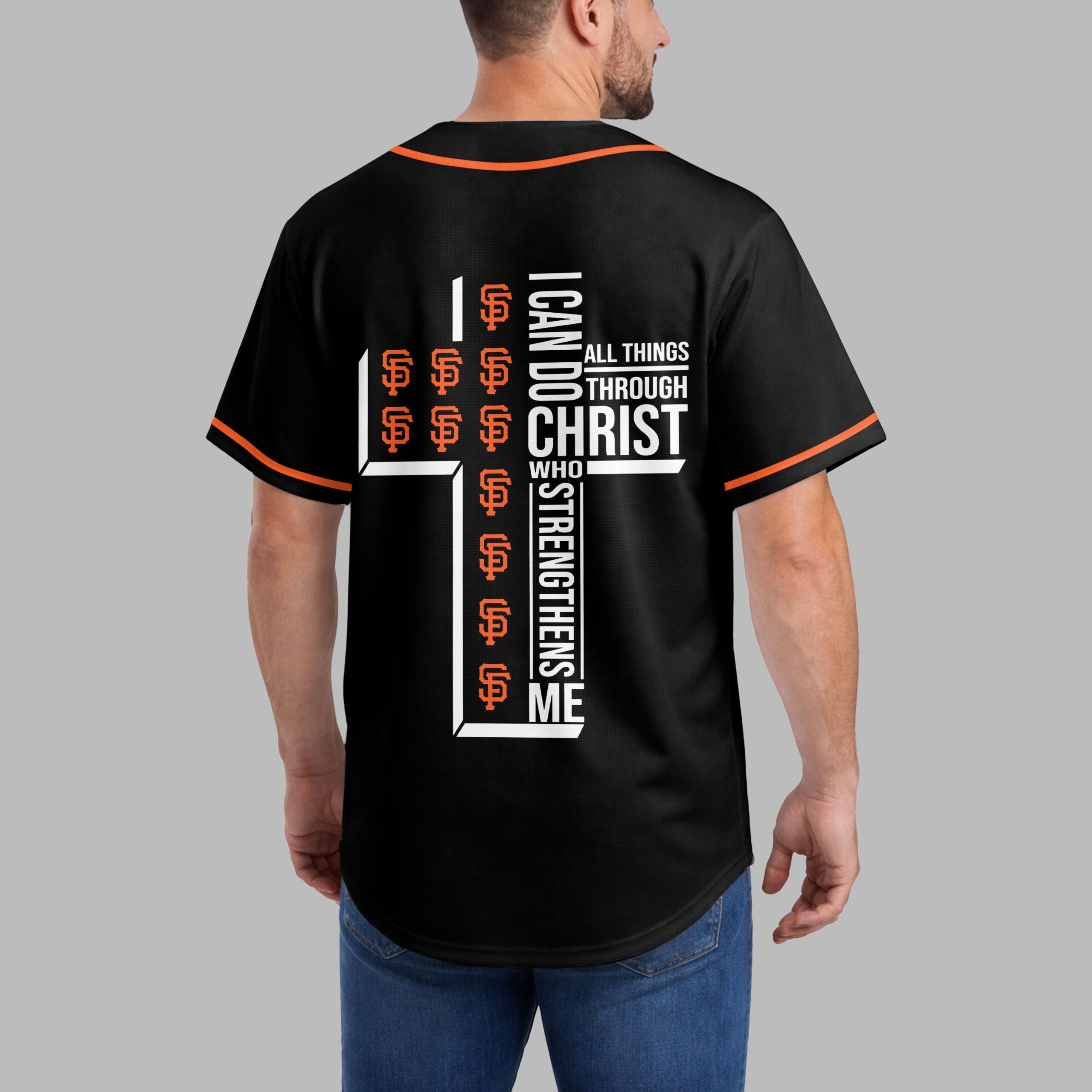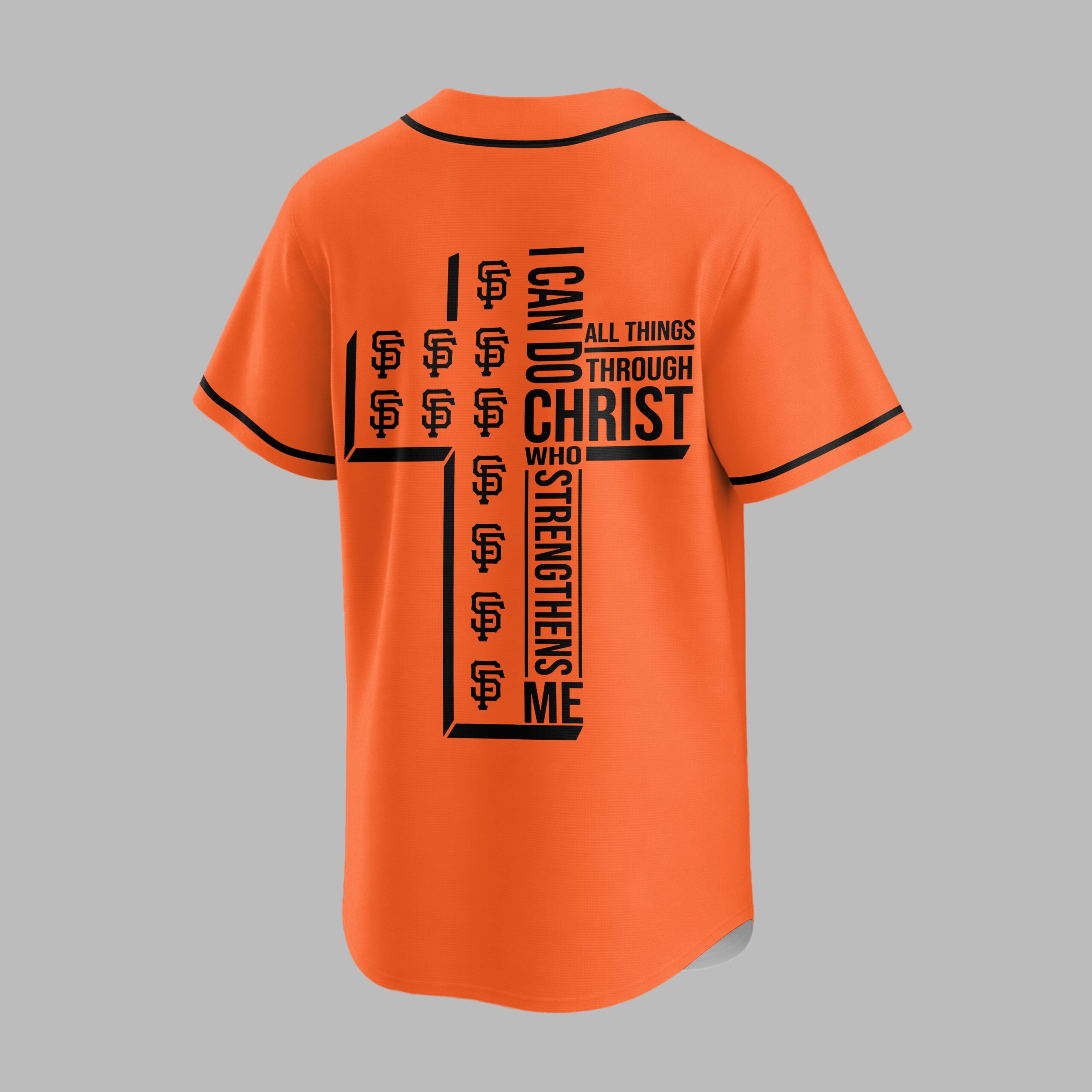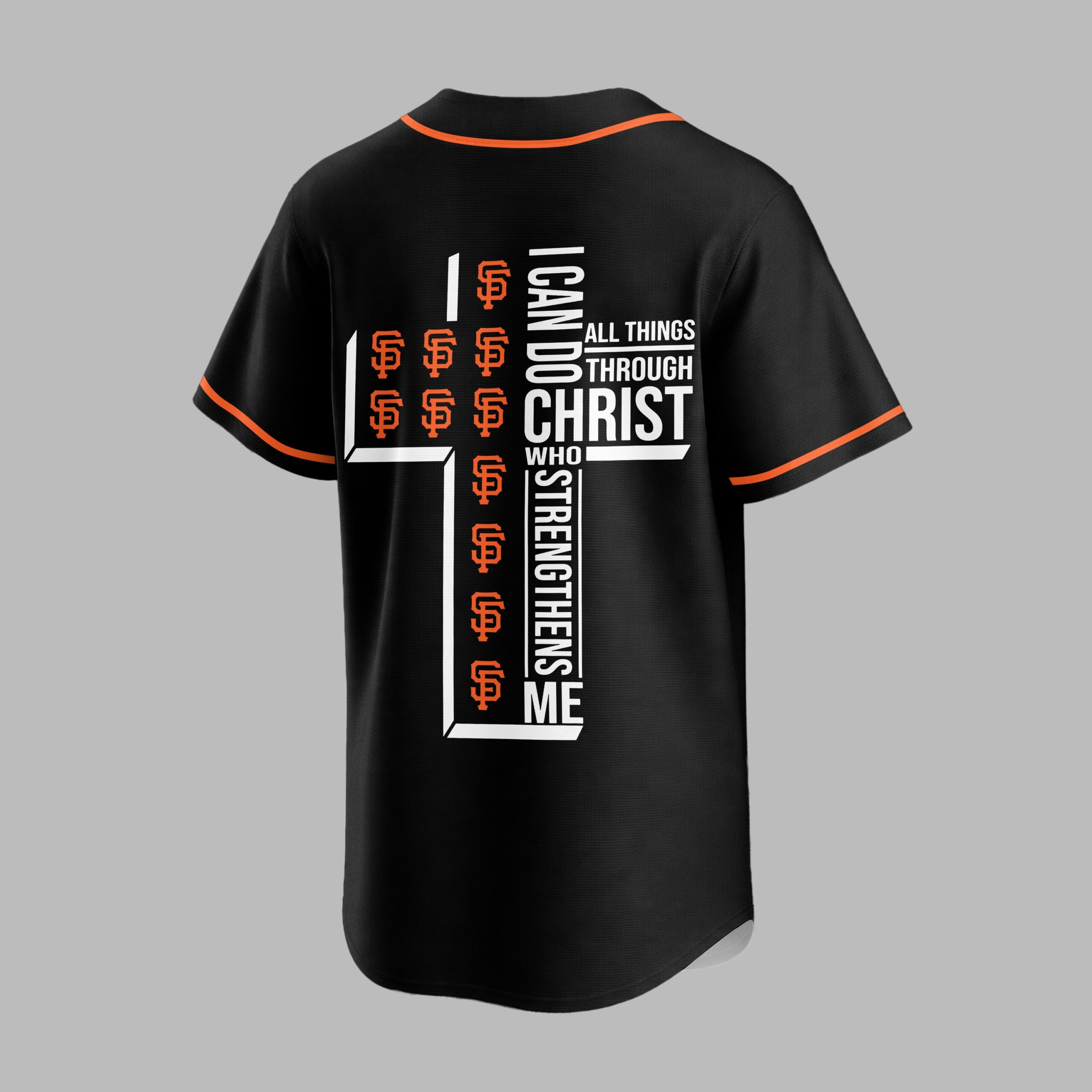 Step up to the plate with a powerful statement of both team spirit and personal faith. This striking black baseball jersey is designed for the ultimate San Francisco Giants fan who carries their beliefs as proudly as their team colors. It’s the perfect blend of energetic athletic style and spiritual inspiration. The front features GIANTS in bold orange block lettering across the chest, complemented by the iconic SF logo and classic orange piping. On the back, a large, modern white cross anchors the design, uniquely filled with repeating orange team logos. Alongside the cross, the powerful scripture I can do all things through Christ who strengthens me is displayed in crisp white typography, creating a visually stunning and meaningful tribute. Whether you’re cheering from the stands during a night game or enjoying a casual weekend outing, this jersey makes a bold impact. It’s an ideal choice for game days, church league events, or any occasion where you want to showcase your loyalty and your devotion.