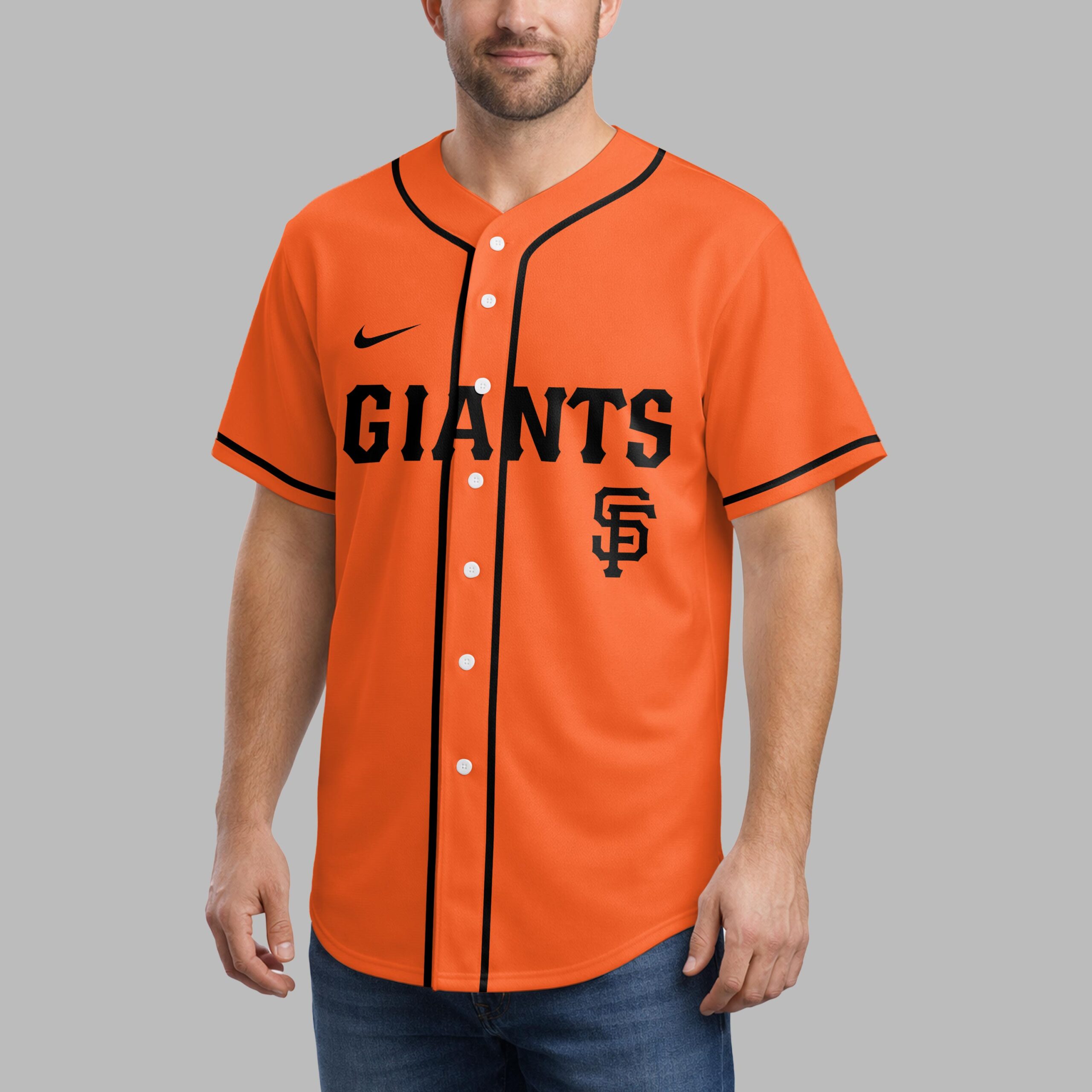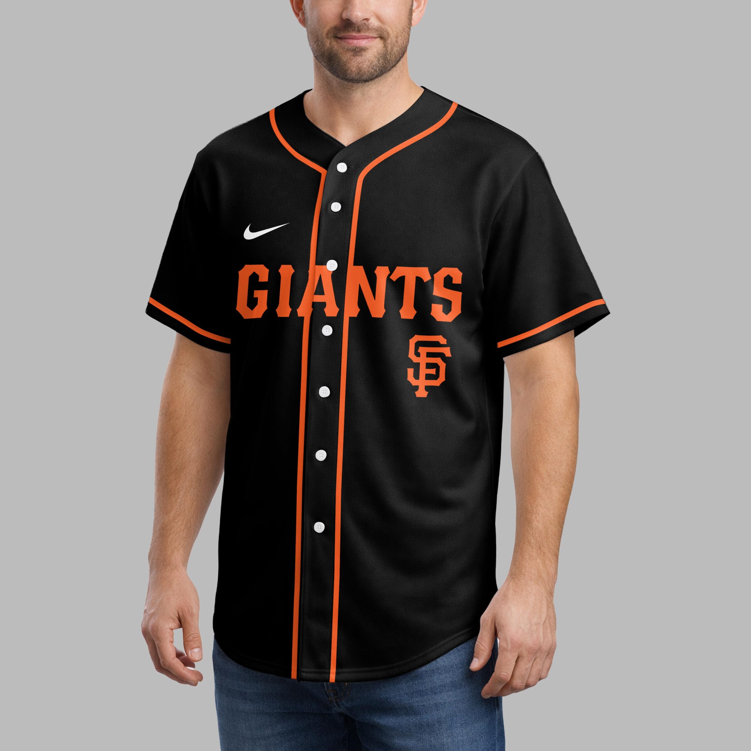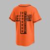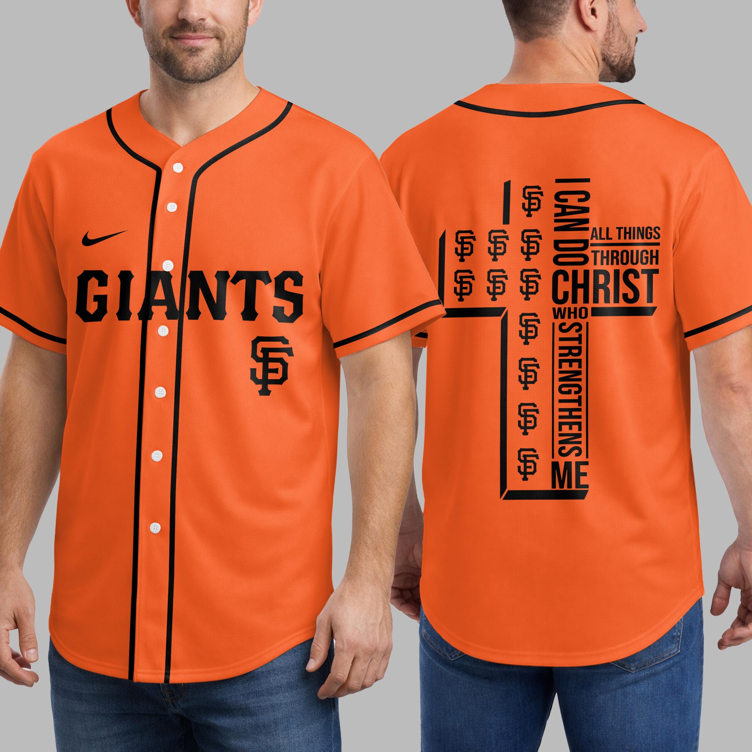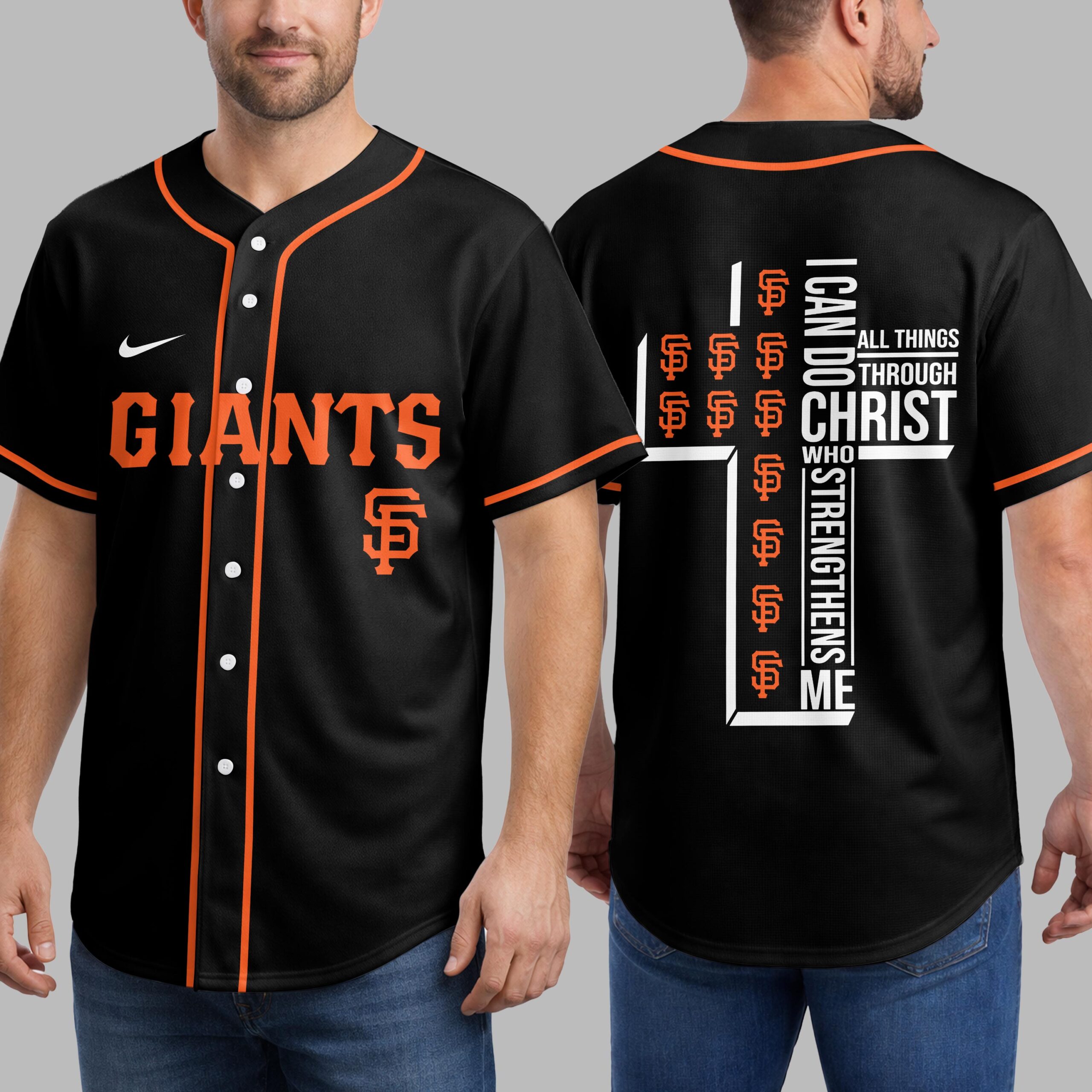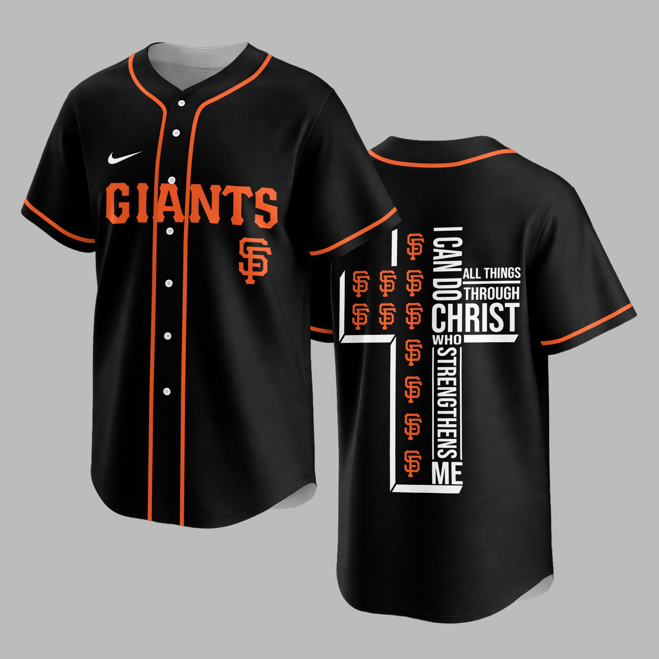 Step up to the plate with a powerful statement of both team spirit and personal faith. This striking black baseball jersey is designed for the ultimate San Francisco Giants fan who carries their beliefs as proudly as their team colors. It’s the perfect blend of energetic athletic style and spiritual inspiration. The front features GIANTS in bold orange block lettering across the chest, complemented by the iconic SF logo and classic orange piping. On the back, a large, modern white cross anchors the design, uniquely filled with repeating orange team logos. Alongside the cross, the powerful scripture I can do all things through Christ who strengthens me is displayed in crisp white typography, creating a visually stunning and meaningful tribute. Whether you’re cheering from the stands during a night game or enjoying a casual weekend outing, this jersey makes a bold impact. It’s an ideal choice for game days, church league events, or any occasion where you want to showcase your loyalty and your devotion.