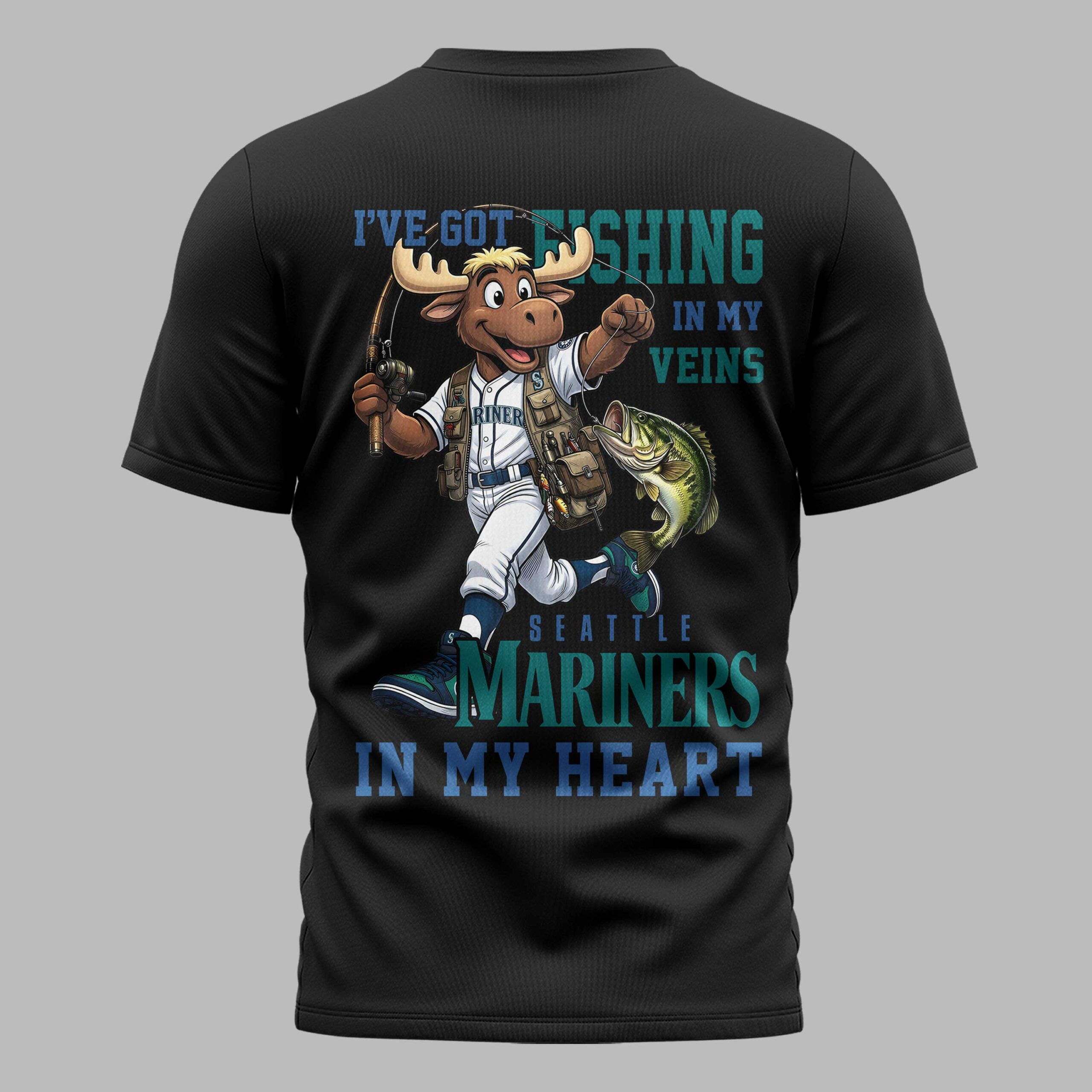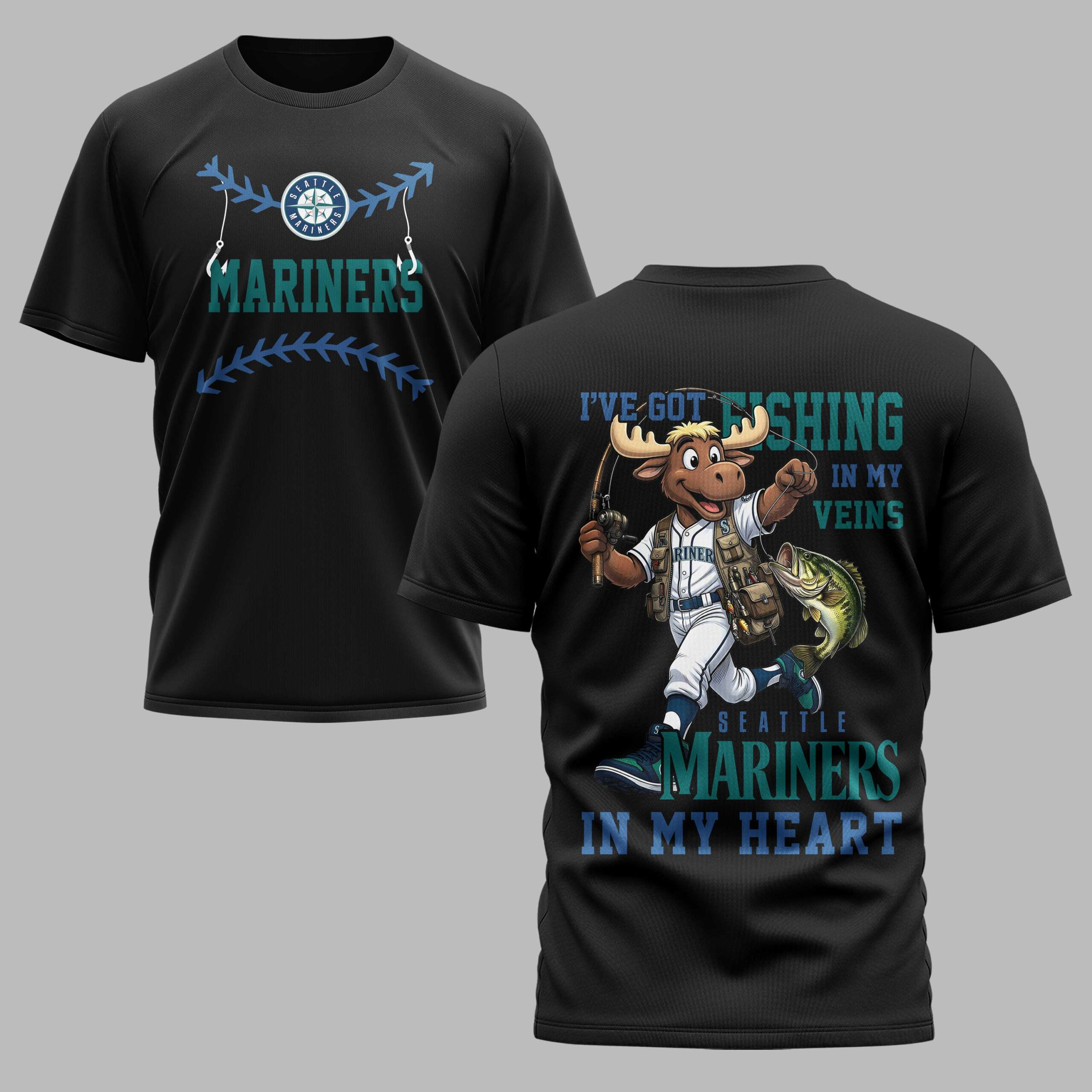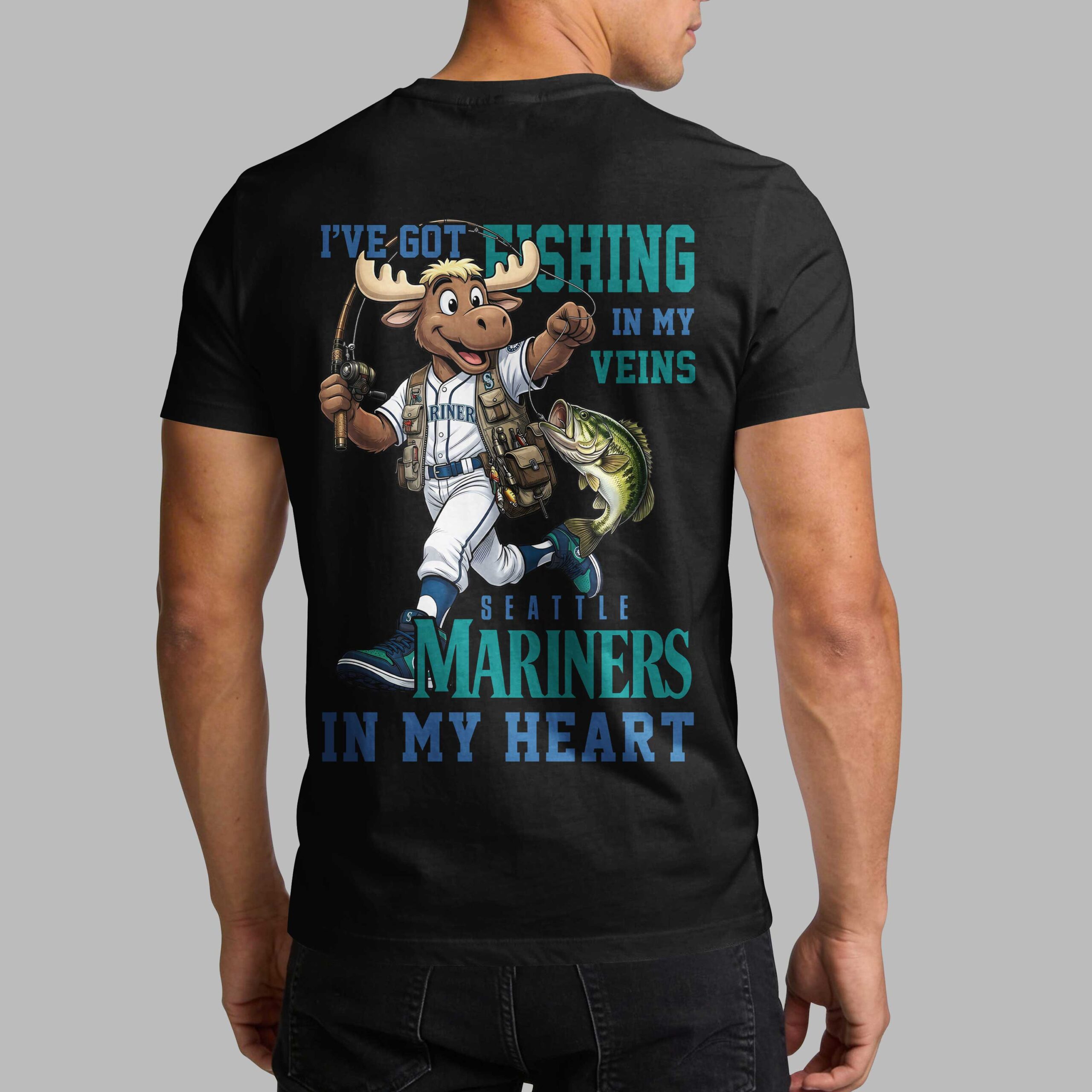 Showcase your unique devotion with this dynamic Seattle Mariners fan shirt, perfect for anyone whose heart belongs to both the ballpark and the open water. This tee is a vibrant tribute to your dual passions, celebrating the thrill of baseball and the peaceful joy of fishing in one spirited design. The front proudly displays the iconic Seattle Mariners compass logo, cleverly integrated with classic baseball stitching and a fishing hook, while the bold MARINERS text declares your allegiance. The back of the shirt features an energetic cartoon moose mascot, decked out in a Mariners uniform, reeling in a catch. Complementing this lively scene are the phrases I’VE GOT FISHING IN MY VEINS and SEATTLE MARINERS IN MY HEART, encapsulating your ultimate loyalties. This shirt is ideal for game days at T-Mobile Park, relaxing fishing trips, or any casual outing where you want to express your Mariners pride and love for angling. It’s a perfect blend of fandom and hobby, making it an excellent addition to any enthusiast’s wardrobe.