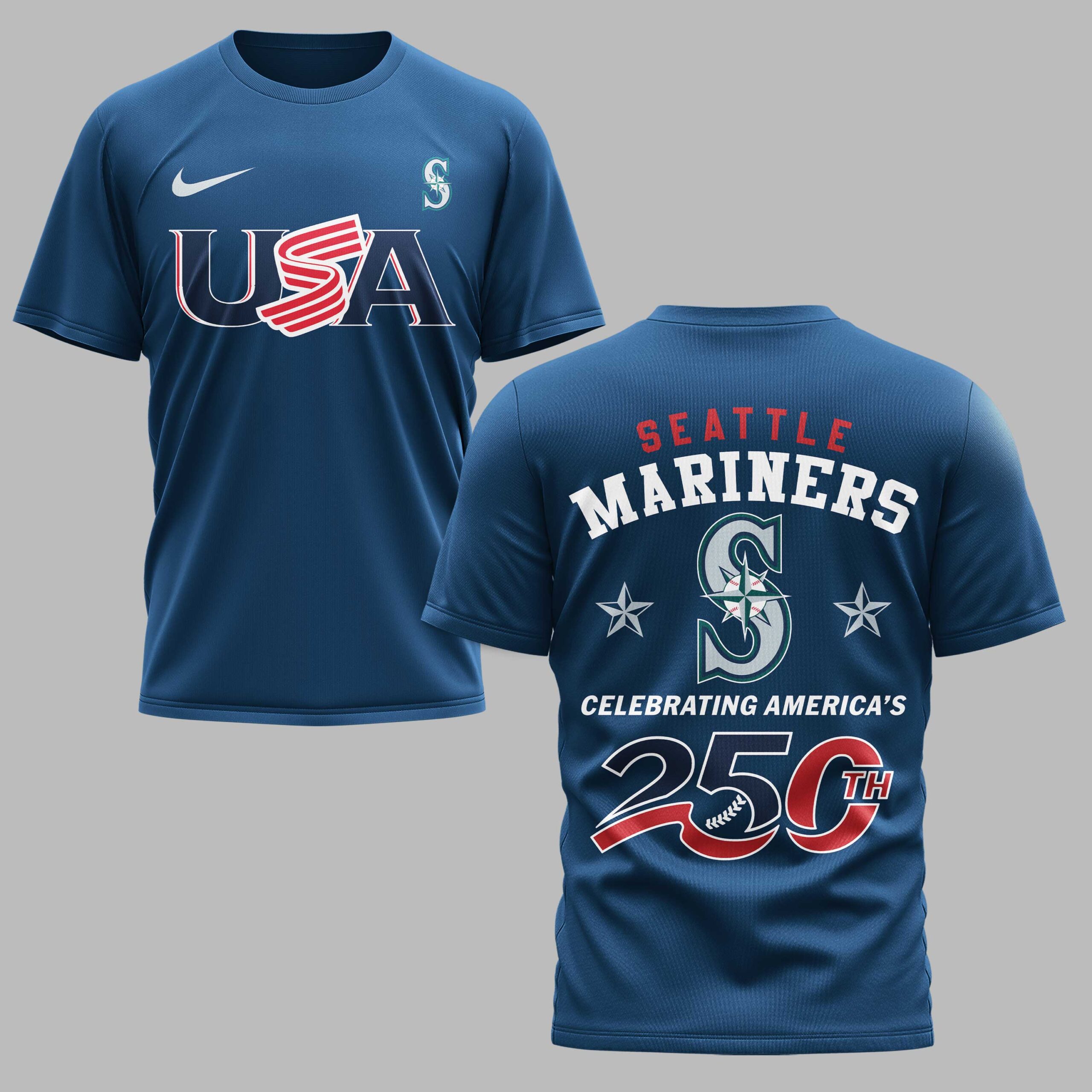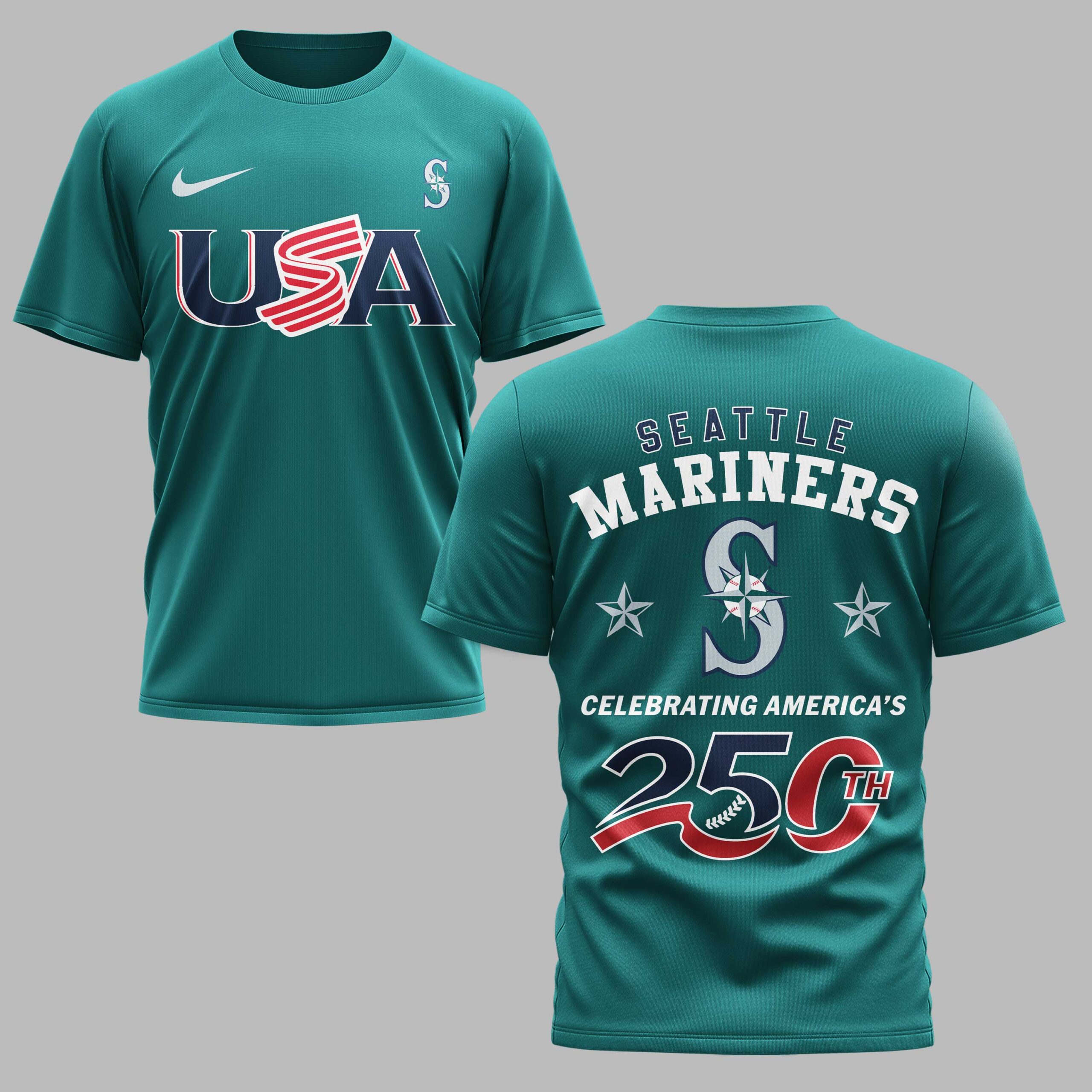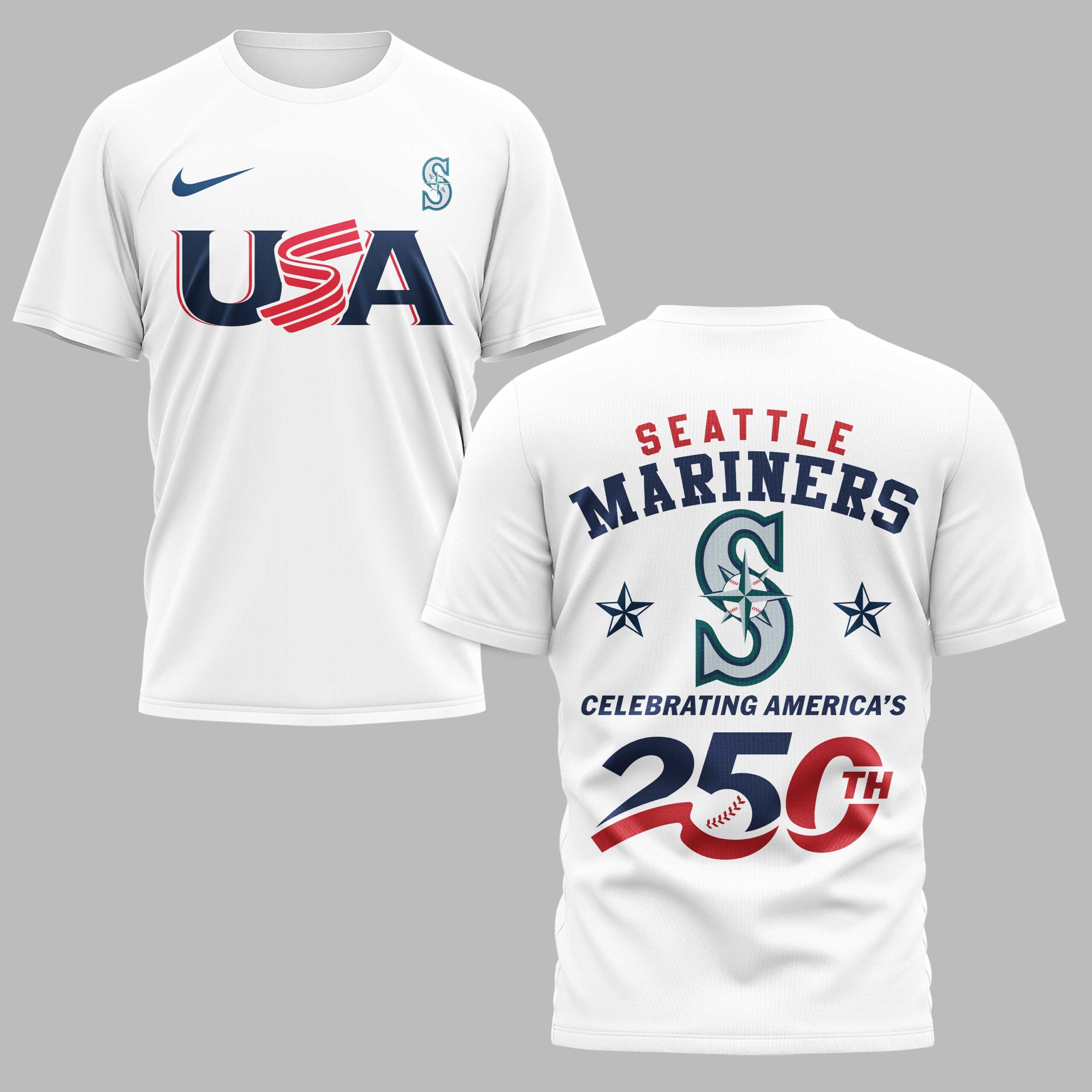 Seattle Mariners USA 250 Independence Baseball Fan T-Shirt Celebrate a historic milestone for the nation while showing your unwavering support for the Seattle Mariners. This striking tee blends Northwest pride with a bold patriotic theme, honoring the 250th anniversary of American independence. It’s the perfect way for M’s fans to represent both their team and national spirit in one high-energy design. The front features a prominent USA graphic alongside the Mariners S logo. The back goes even bigger with Seattle Mariners arched over a large team insignia flanked by stars. The centerpiece is a dynamic 250th graphic with a flowing red ribbon and baseball stitch accents, symbolizing a quarter-millennium of history and the sport we love. Wear it to the ballpark for a summer game, a Fourth of July barbecue, or any occasion to show your colors. It’s built for the fan who wants to stand out during game days and major national celebrations alike.