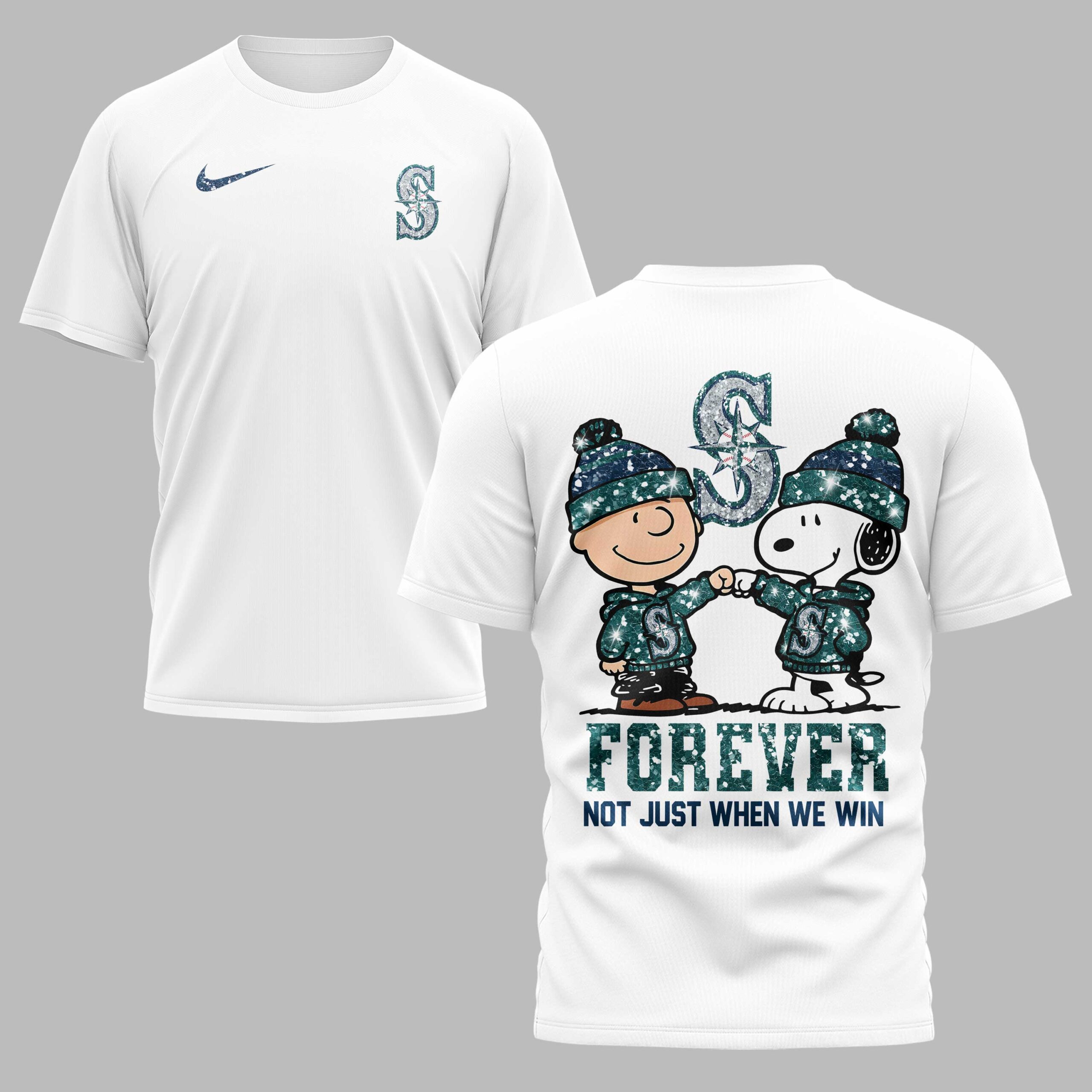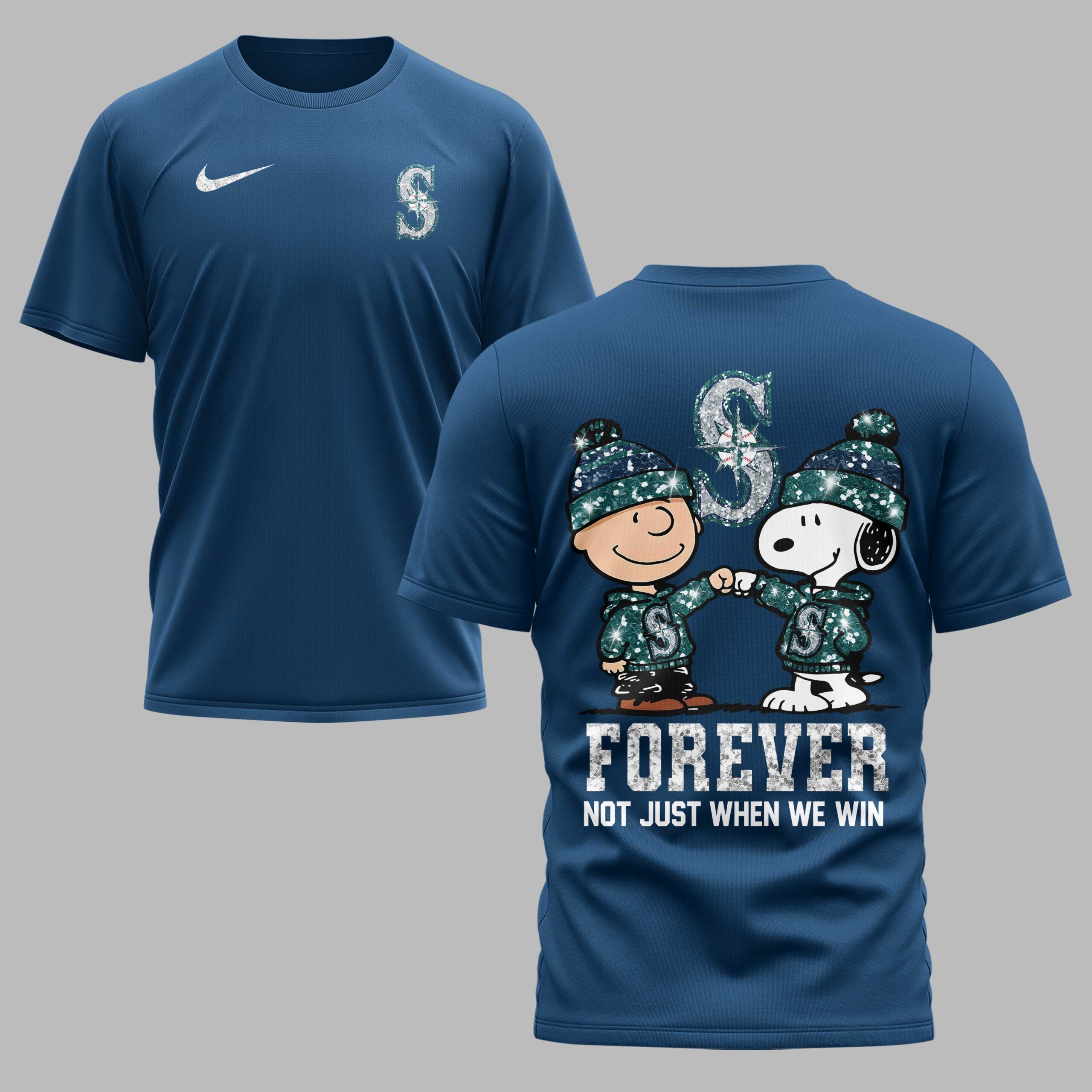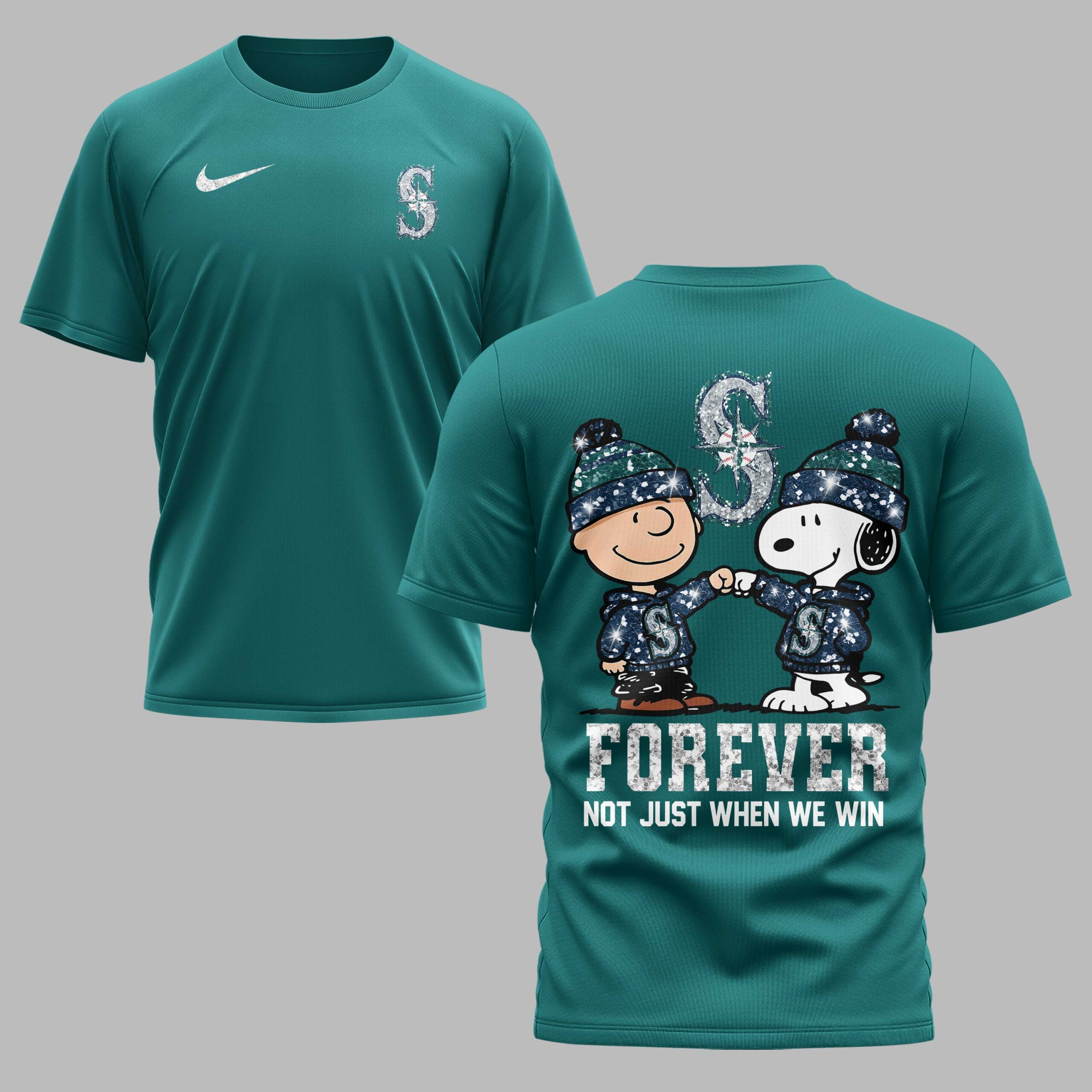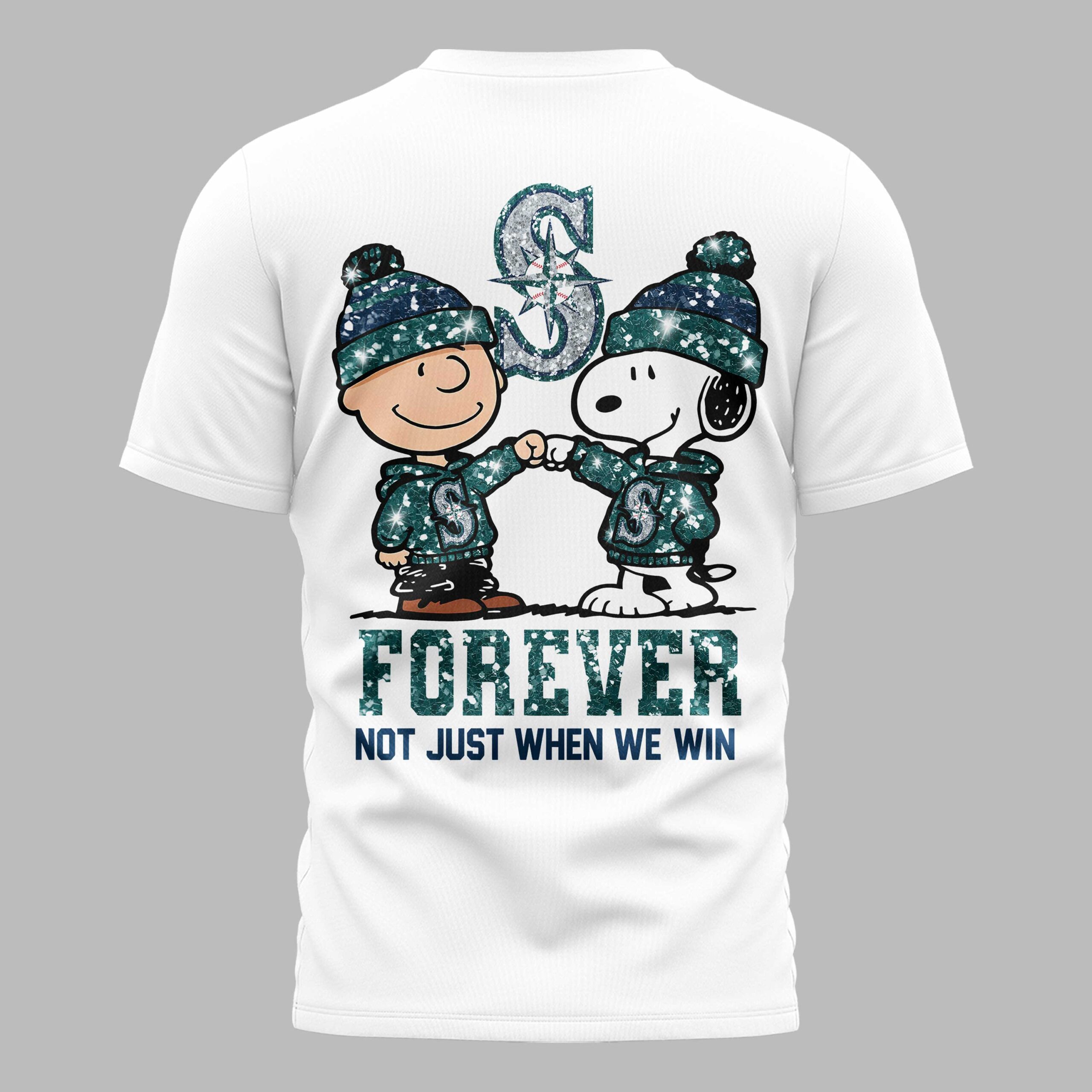 Declare your unwavering devotion to the Seattle Mariners with this charming and spirited fan tee! It’s more than just a shirt; it’s a symbol of loyalty, bringing together the timeless appeal of Peanuts with your favorite baseball team. Perfect for every true fan, this shirt celebrates the spirit of sticking with your team, win or lose. The front of the shirt proudly displays the classic Seattle Mariners S logo, infused with a sparkling, glitter-like texture that catches the eye. On the back, an adorable graphic takes center stage, featuring Charlie Brown and Snoopy, both sporting Mariners-themed beanies and hoodies, sharing a fist bump of solidarity. Above them, a larger, shimmering Mariners logo stands tall, while below, the bold statement FOREVER NOT JUST WHEN WE WIN resonates with undeniable team pride. Whether you’re heading to T-Mobile Park, hosting a game day watch party, or simply out and about, this shirt is the ultimate way to showcase your Mariners passion. It’s an ideal pick for those who bleed teal and navy, making it a fantastic gift for any dedicated fan who cherishes their team through every season.