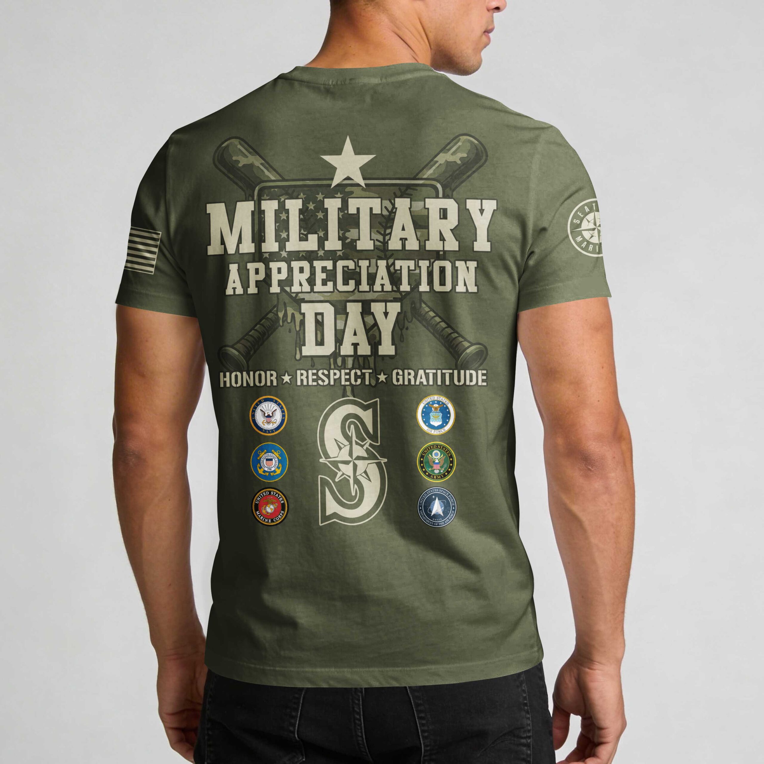 Show your unwavering support for the Seattle Mariners and proudly honor our nation’s heroes with this special Military Appreciation Day shirt. This tee is a powerful tribute, blending your passion for baseball with deep respect and gratitude for the brave men and women of the US Armed Forces. The front features SEATTLE in a striking digital camouflage pattern, with MARINERS boldly displayed below, accented by an American flag patch on the sleeve. The back is a profound statement, showcasing MILITARY APPRECIATION DAY above a star, crossed bats, and the inspiring message HONOR * RESPECT * GRATITUDE. Flanking a large Mariners S logo are the emblems of all six US military branches, making it clear where your allegiance lies. Perfect for game days, military appreciation events, Memorial Day, Veterans Day, or simply as a daily display of pride, this shirt is a must-have for any Mariners fan who cherishes freedom and honors service. Wear it with pride and let your patriotism shine!