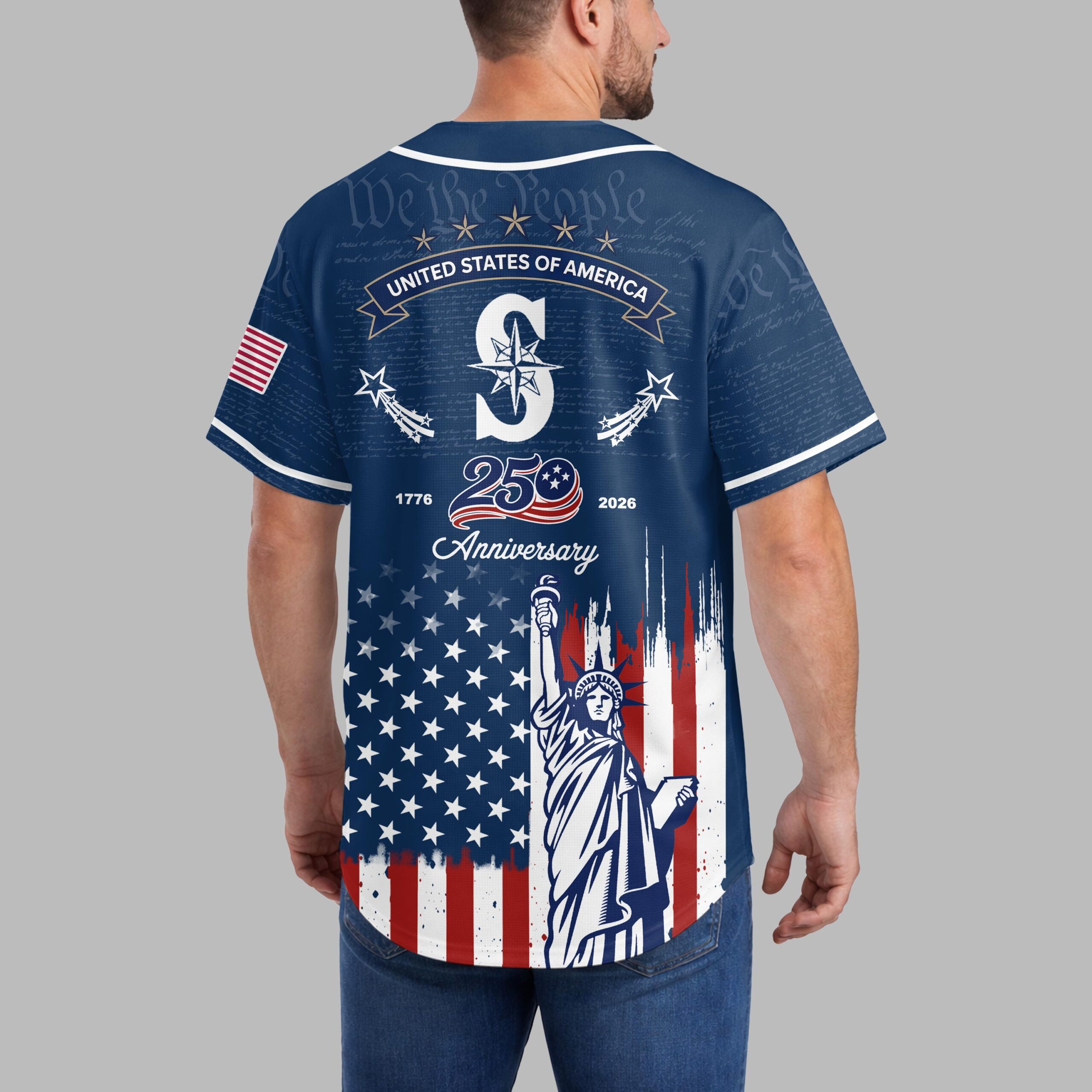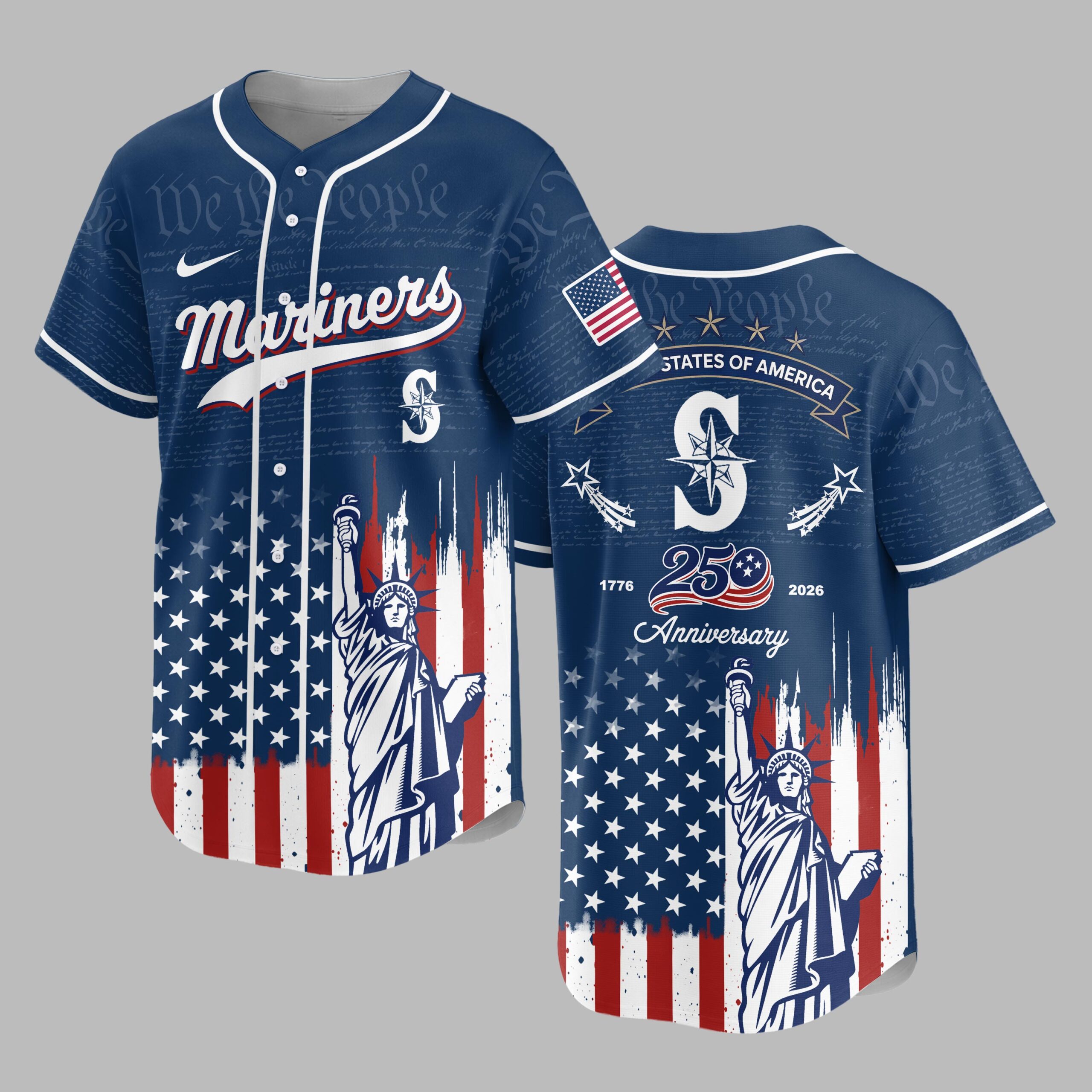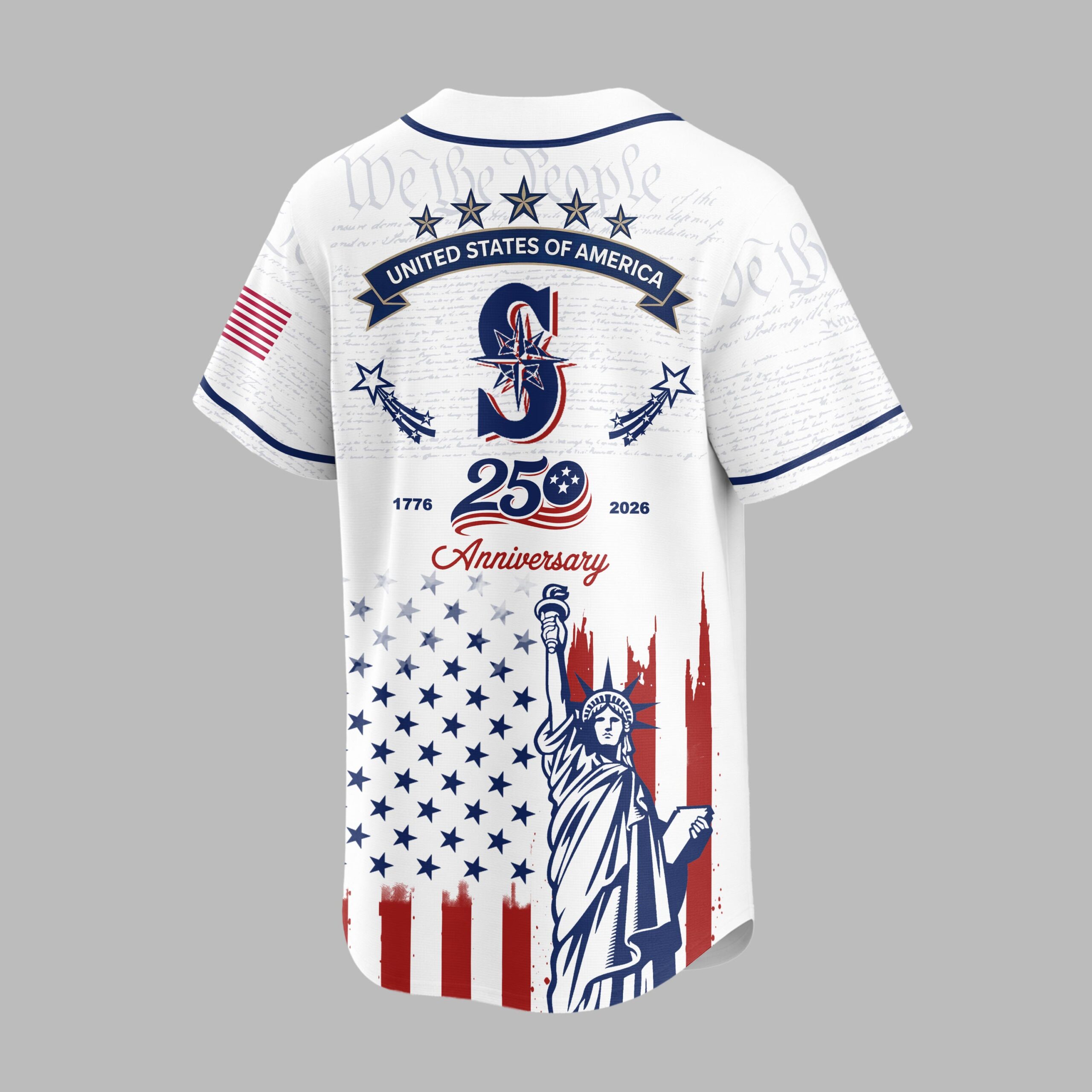 Celebrate the spirit of America and your love for the Mariners with this commemorative baseball jersey! This unique design masterfully blends your passion for the game with a powerful tribute to 250 years of American independence, perfect for fans who cherish both their team and their nation’s heritage. Crafted with striking details, the jersey features Mariners across the chest, complemented by the team’s iconic S logo. The background subtly showcases We the People text, while the lower half is adorned with a distressed American flag motif alongside a majestic image of the Statue of Liberty. The back proudly displays STATES OF AMERICA and highlights the 1776 250 2026 Anniversary milestone, surrounded by patriotic stars and stripes. Whether you’re cheering at the ballpark, celebrating the Fourth of July, or attending any patriotic event, this jersey is a bold statement of pride. It’s an ideal way to honor a significant American anniversary while representing your favorite team in style, making it a must-have for any dedicated fan and patriot.