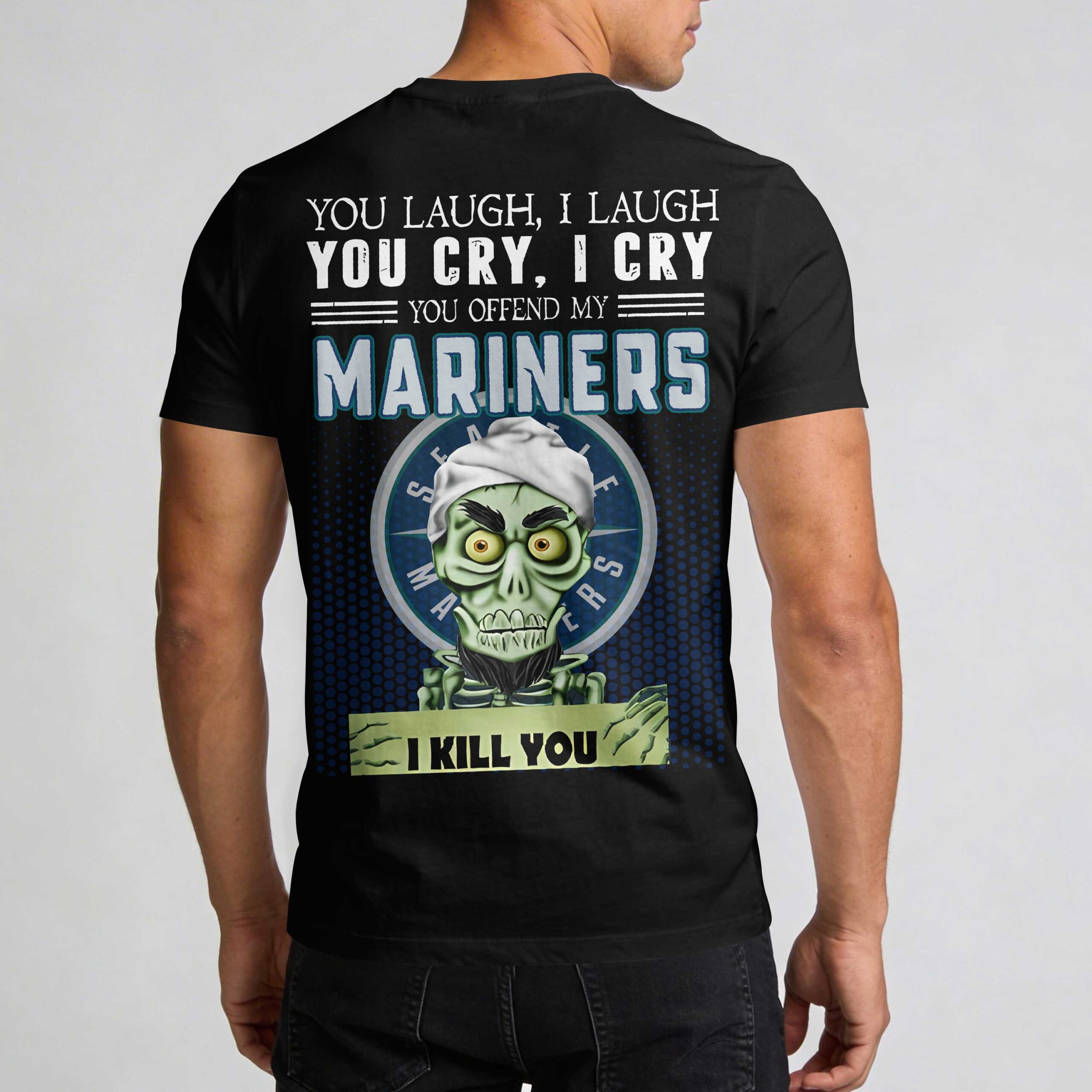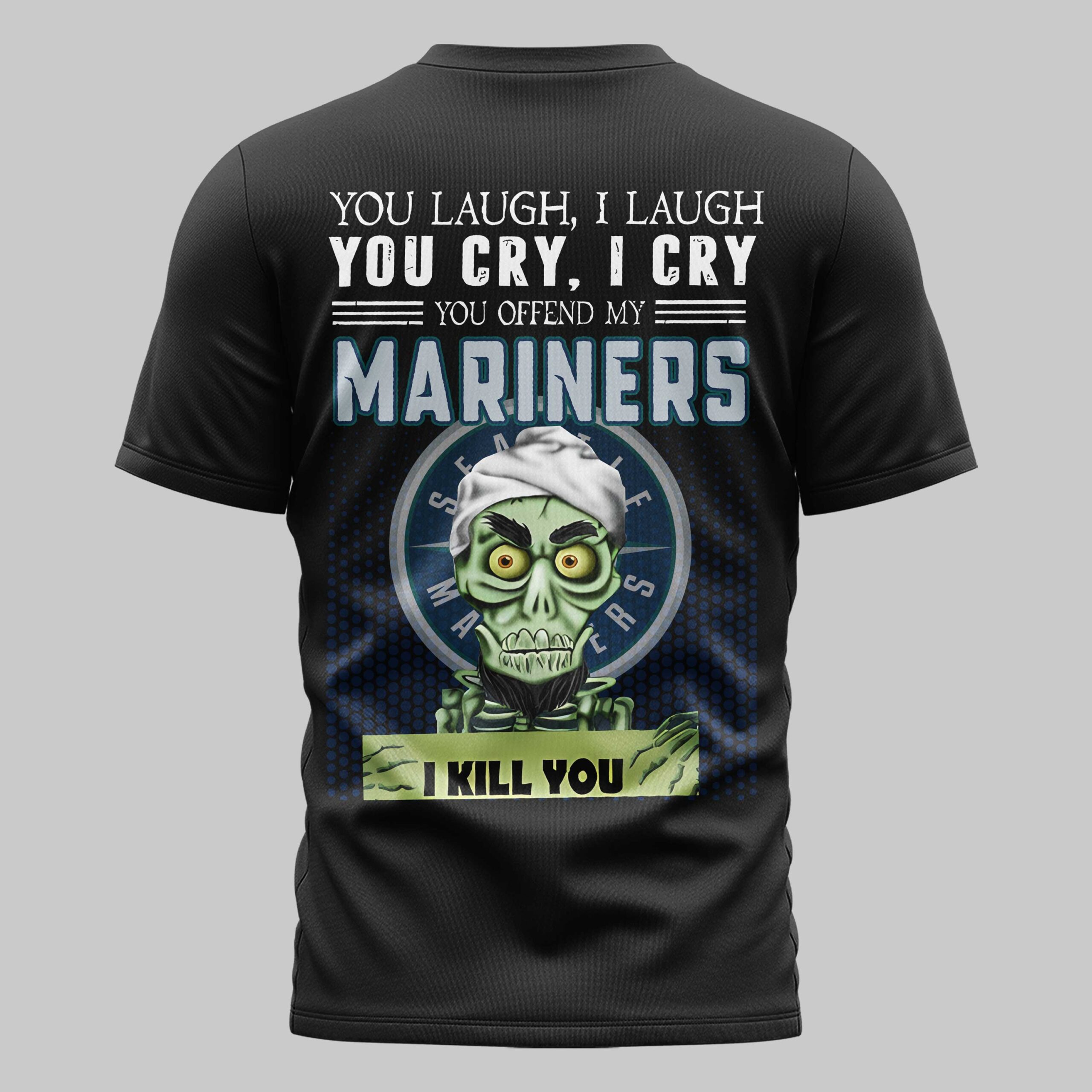 Celebrate the spirit of American baseball and your Seattle Mariners pride with this striking fan T-shirt. Designed for the boldest supporters, this piece blends fierce team loyalty with a celebratory nod to the independent spirit of the game. It’s a powerful statement of your dedication to the M’s and a must-have for any true fan. The front features the iconic Seattle ‘S’ compass logo on the chest for a sharp, classic look. The back makes a loud statement with a detailed graphic of a skeletal figure and the firm warning: You offend my Mariners, I kill you. Set against a textured navy circle, the bold block lettering ensures your message is clear to every rival fan. Wear it to the ballpark or an Independence Day celebration to show everyone your true colors. Ideal for game days or everyday wear, this shirt is the ultimate way to prove your Mariners spirit is second to none.