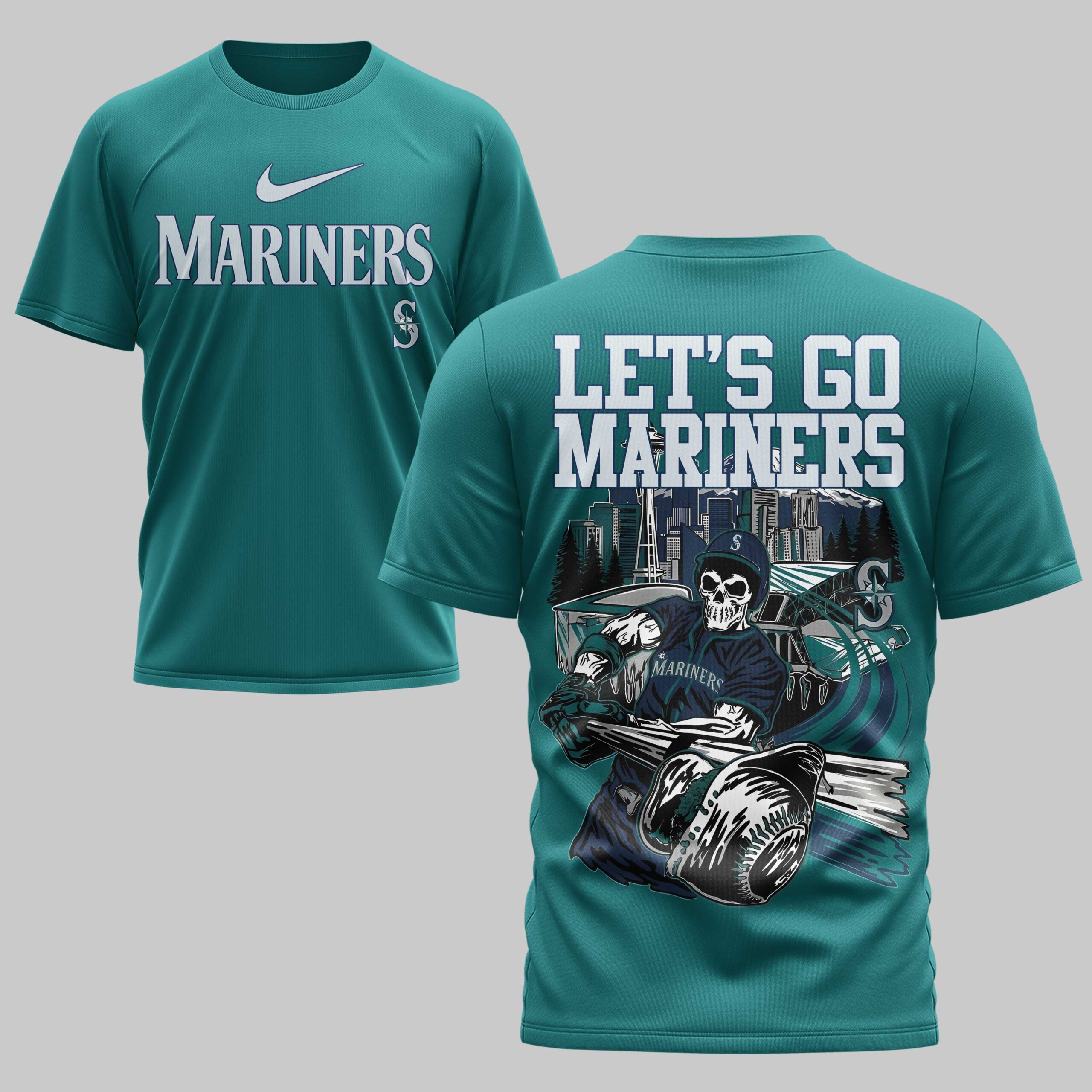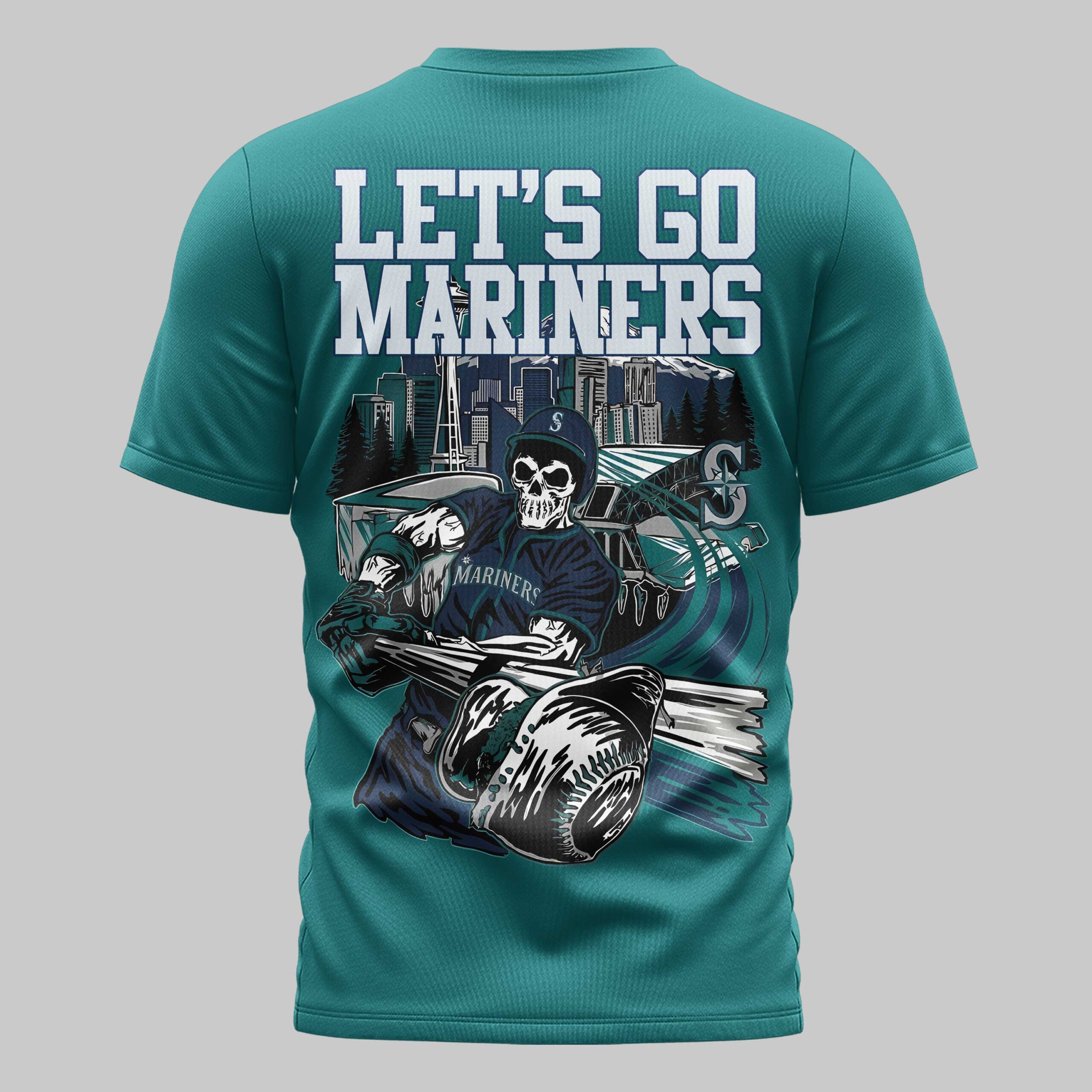 Step up to the plate and show your support for Seattle with a shirt that blends hometown pride and high-octane energy. This Mariners tee is a standout piece for die-hard fans looking to represent their team during the nation’s biggest celebrations. It’s designed for those who live and breathe baseball in the Pacific Northwest and want their gear to reflect that passion. The front features a clean MARINERS wordmark and the iconic team logo. The back showcases a powerhouse graphic: a skeleton slugger crushing a ball, set against a detailed Seattle skyline including the Space Needle. The bold LET’S GO MARINERS text ensures your loyalty is visible from every angle of the stadium. Perfect for Independence Day festivities, summer games at the ballpark, or casual weekend wear, this shirt is a must-have for your fan collection. Wear it with pride and let everyone know you’re backing Seattle through every inning.