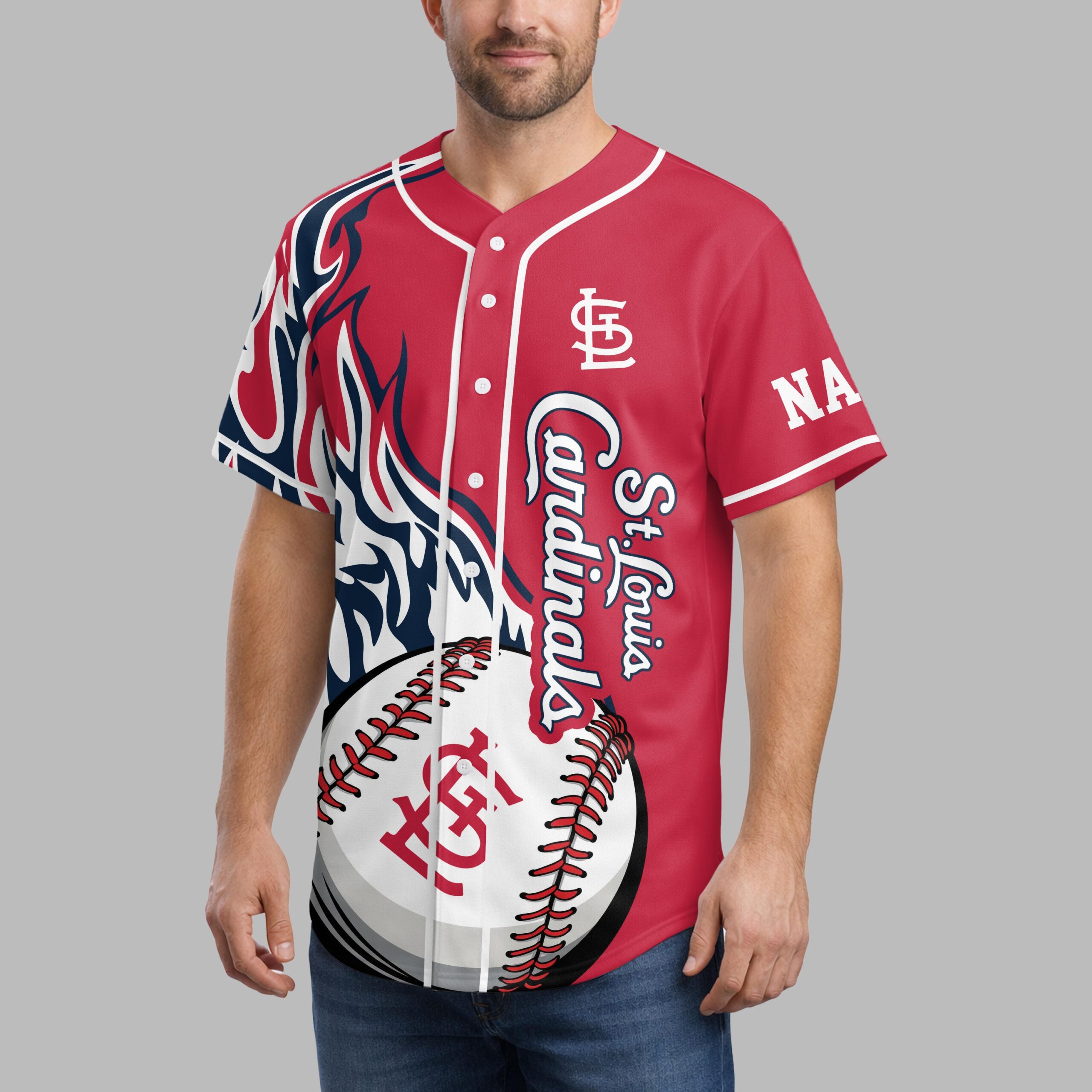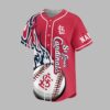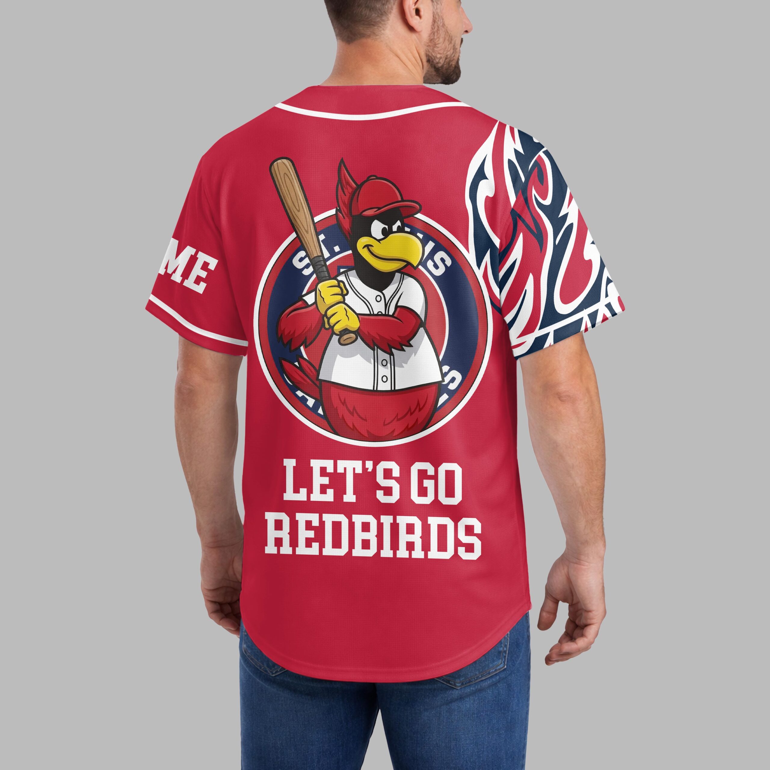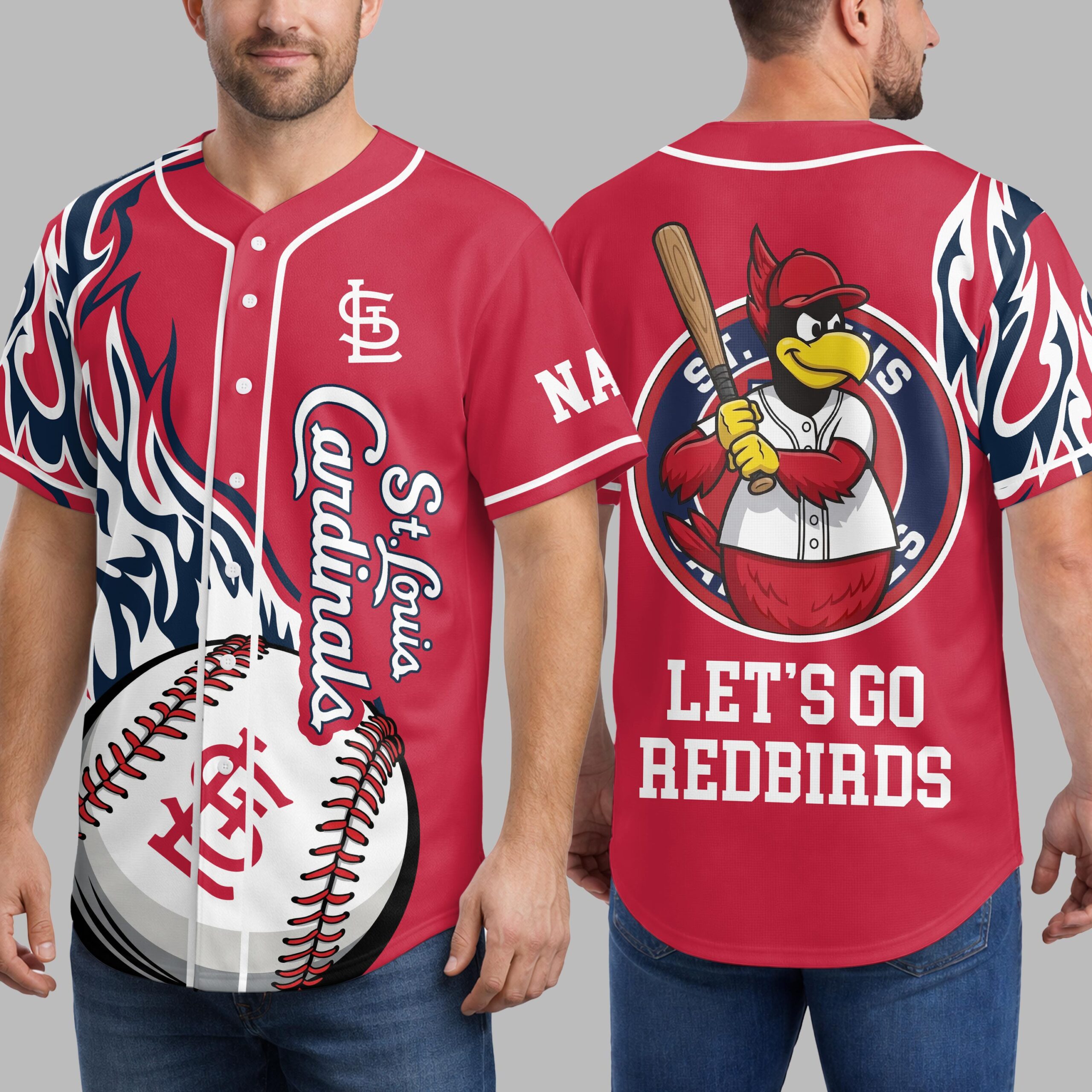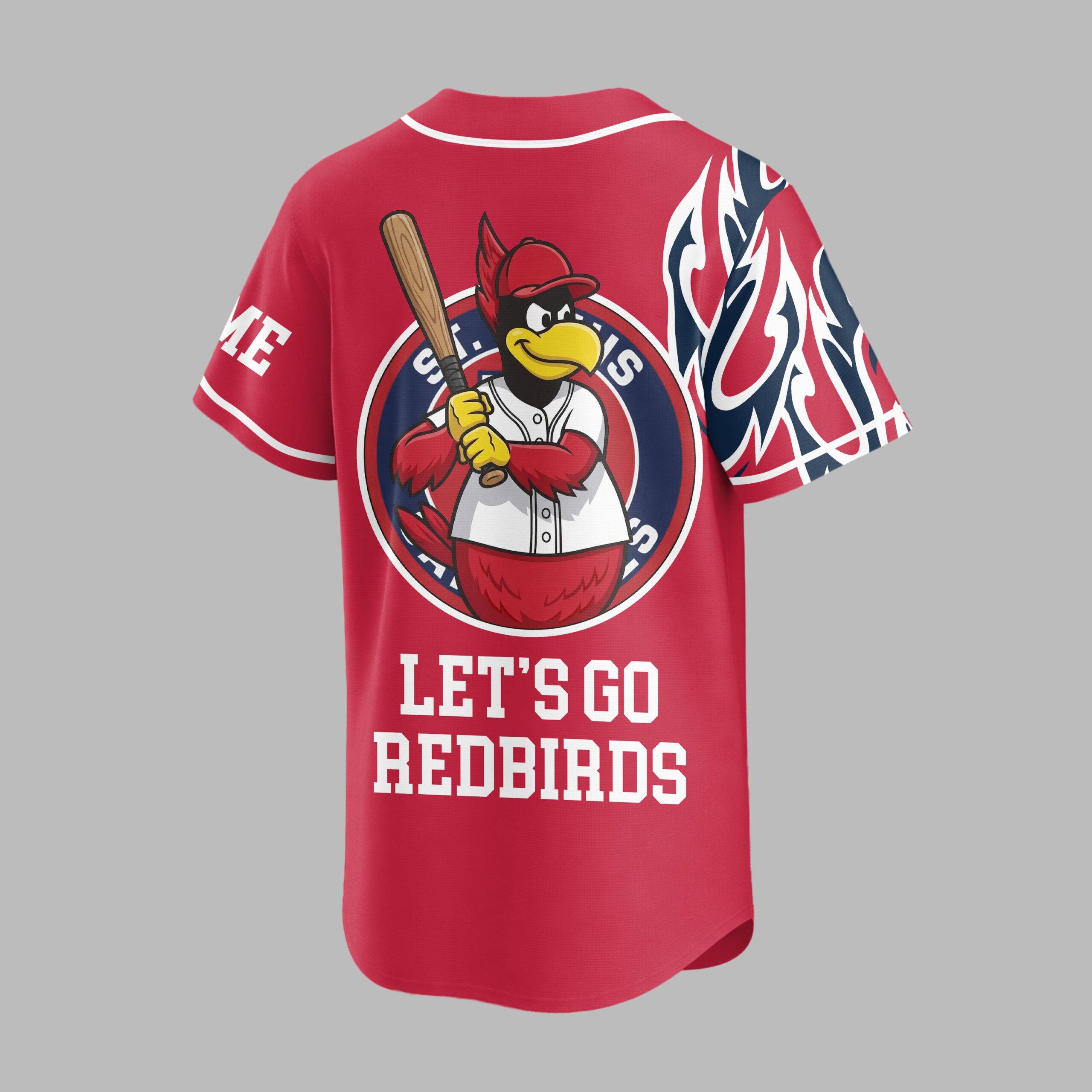 Ignite your passion for baseball with this vibrant St. Louis Cardinals jersey, perfect for showing off your unwavering team pride. Designed for the ultimate fan, this shirt captures the dynamic spirit of game day and celebrates your favorite Redbirds in energetic style. The front of the jersey features bold St. Louis Cardinals script alongside a striking baseball graphic integrated with the iconic SL logo. Dynamic blue, white, and red flame-like patterns adorn the sleeves, adding an extra burst of flair. On the back, a cheerful cardinal mascot, baseball bat in hand, rallies the crowd with the spirited message, LET’S GO REDBIRDS, making your allegiance unmistakable. Whether you’re catching a live game at the ballpark, hosting a watch party, or simply out and about, this jersey is your go-to for showcasing your St. Louis Cardinals fandom. Wear it to feel the excitement, connect with fellow fans, and cheer on every home run with unmatched enthusiasm.
