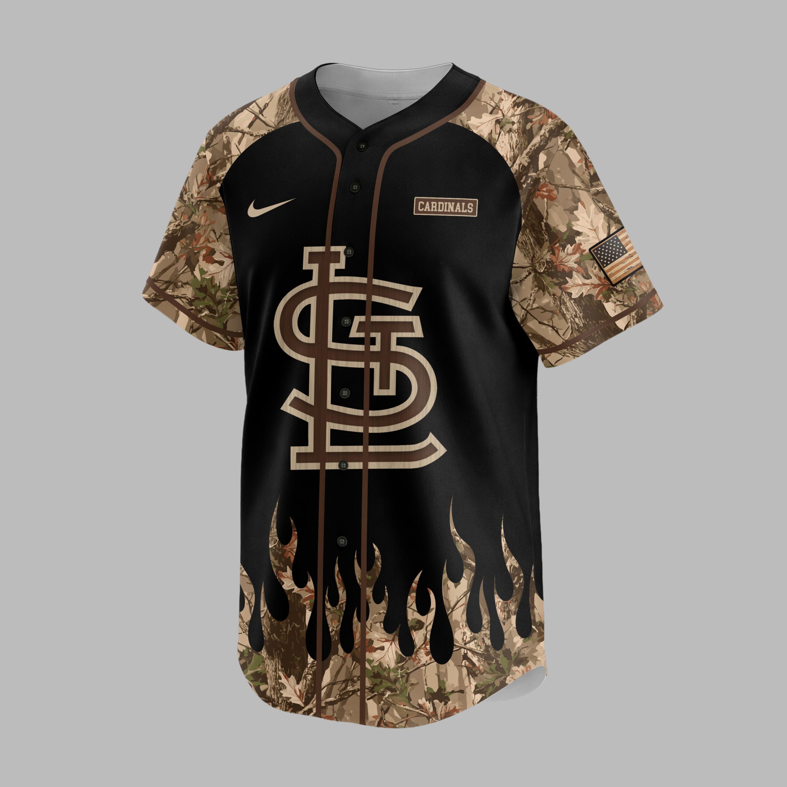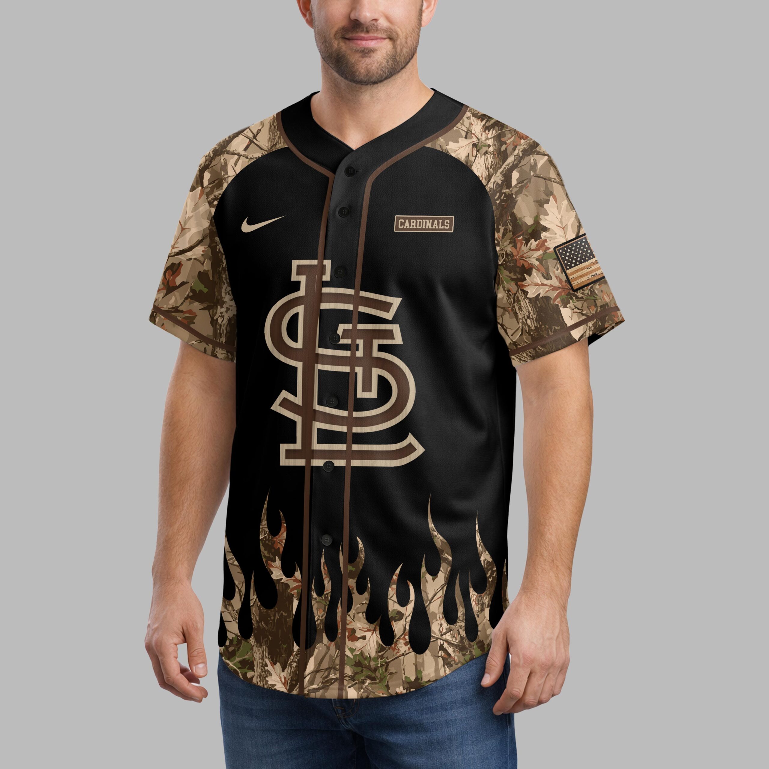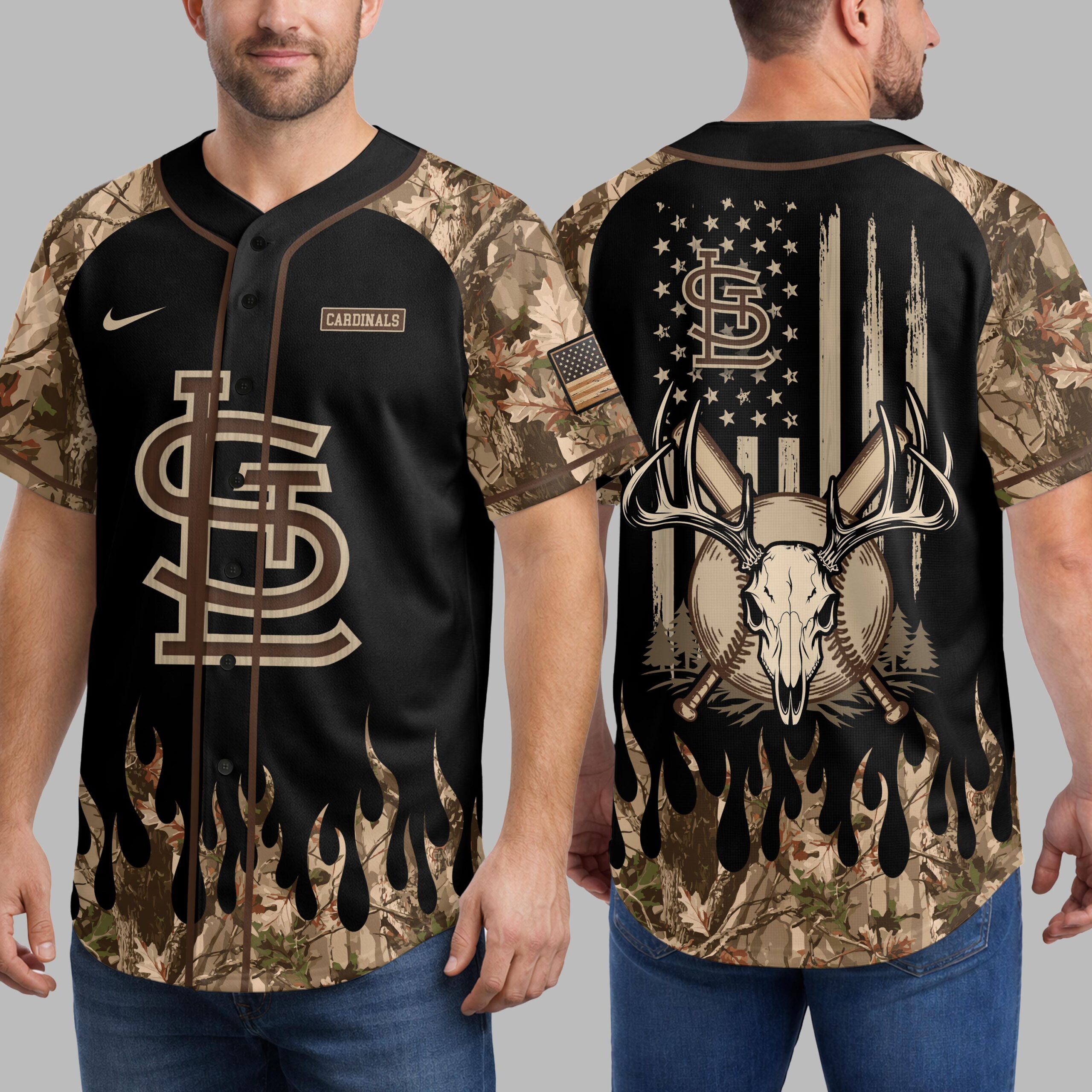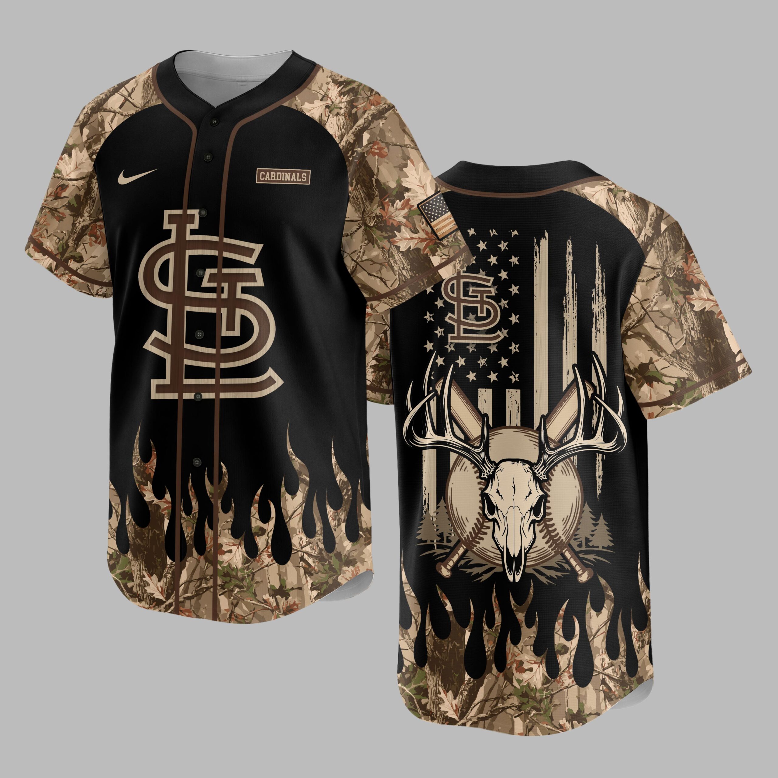Show your St. Louis Cardinals pride with a rugged outdoor spirit! This unique jersey blends baseball passion with a love for the hunt, creating a powerful statement. Perfect for devoted fans who live for game day and the call of the wild, it showcases unwavering team loyalty and an adventurous persona. The front features the SL logo in wood-grain texture on black, with camouflage sleeves and a dynamic camo flame hem. The back displays a distressed American flag, topped by another SL logo. A powerful deer skull with antlers, crossed baseball bats, and a ball are centered amidst pine trees, celebrating sports and hunting. Perfect for game days at the ballpark, hunting trips, or any outdoor adventure. This versatile jersey lets you proudly represent your Cardinals and your dedication to the great outdoors. Ideal for tailgates, camping, or simply making a bold statement about your unique blend of loyalties.