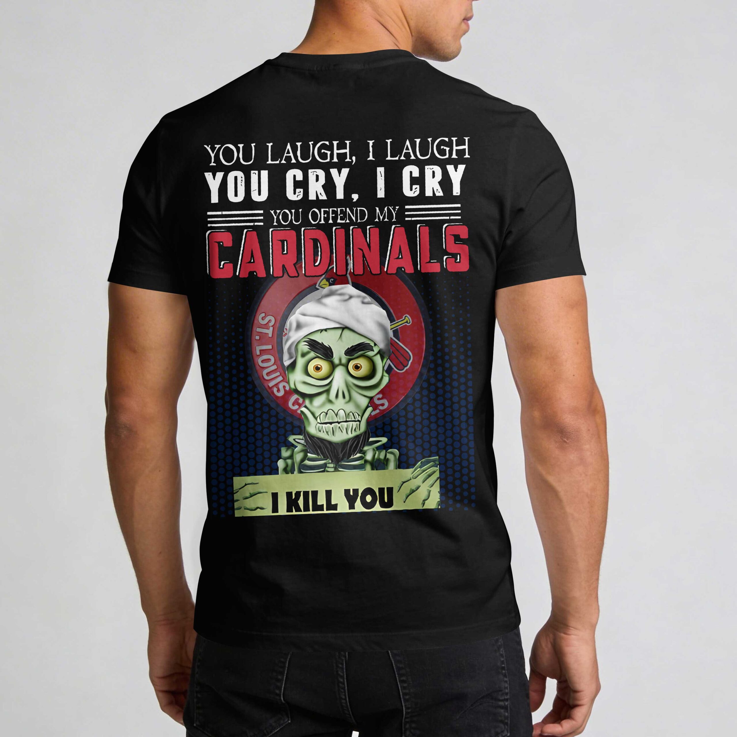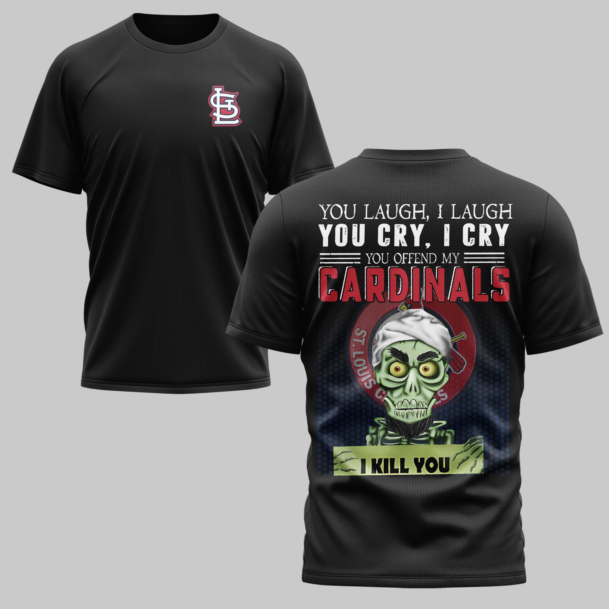 Showcase your unwavering St. Louis Cardinals passion with this bold, humorous fan tee! Perfect for the loyal supporter, this shirt embodies the fierce spirit of game day. It’s more than apparel; it’s a declaration of intense Cardinals pride, leaving no doubt where your heart truly lies. The front features the iconic STL Cardinals logo. The back is a true showstopper: a detailed, yellow-eyed zombie character against a St. Louis themed circular backdrop. The unforgettable slogan, YOU LAUGH, I LAUGH YOU CRY, I CRY YOU OFFEND MY CARDINALS I KILL YOU, makes a powerful, playful statement of ultimate fan devotion. This unique tee is for those who live and breathe Cardinals baseball. Wear it to exhilarating game days at Busch Stadium, spirited watch parties, or to make a bold statement. It’s perfect for sparking conversations and celebrating your team with unmatched enthusiasm!