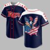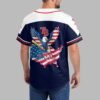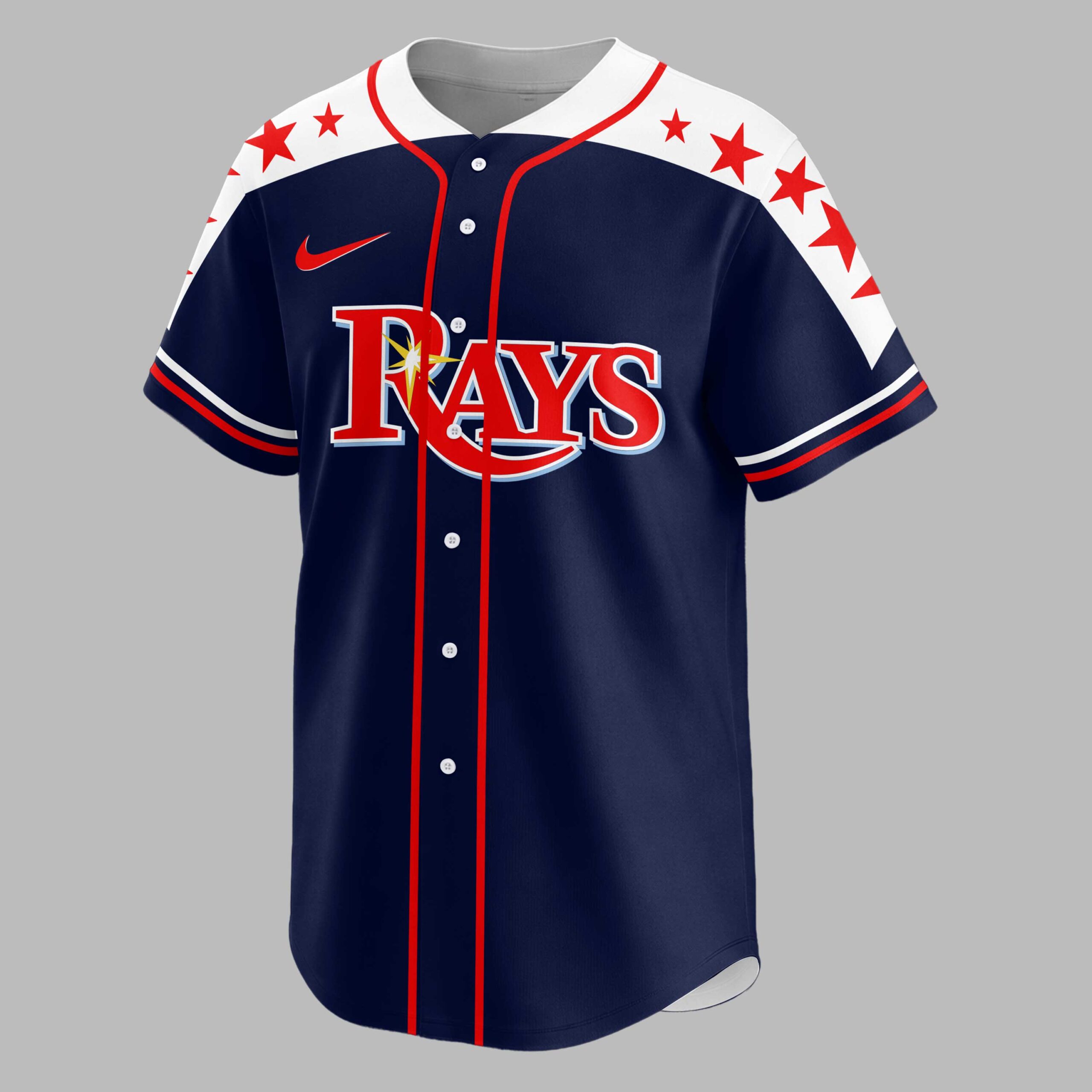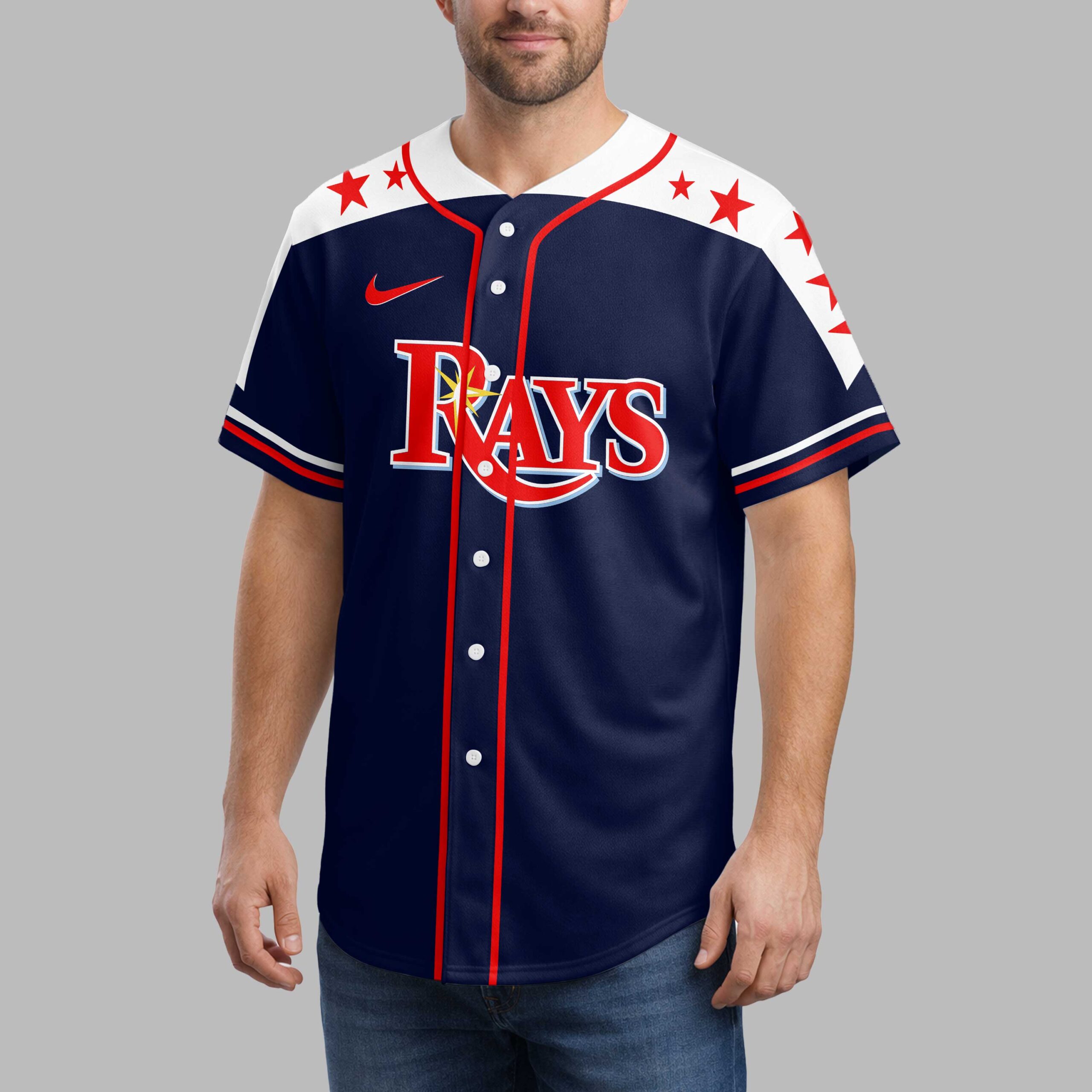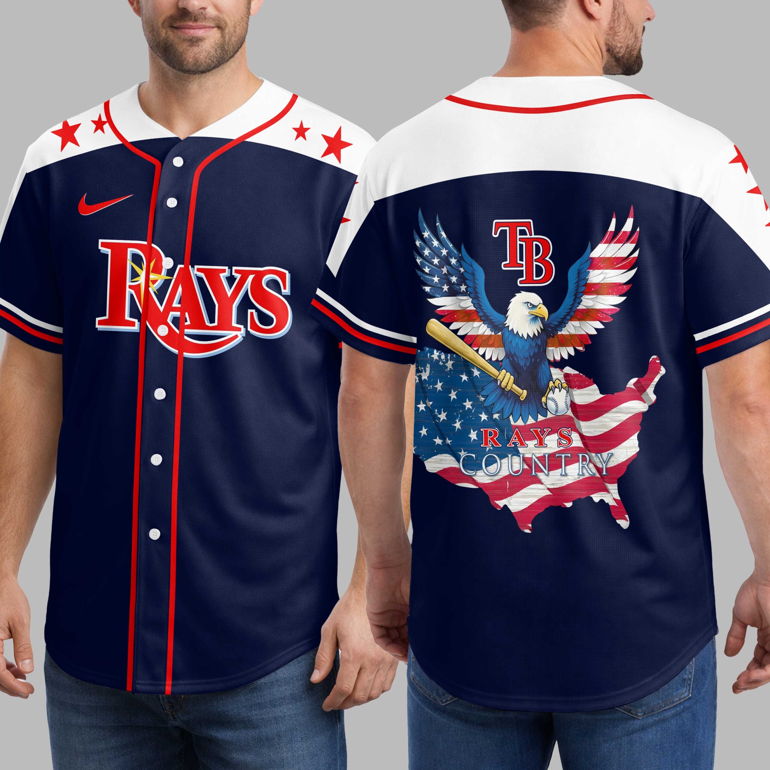 Show your unwavering support for the Rays and your American pride with this dynamic baseball jersey! Perfect for game day, this shirt captures the spirit of both your favorite team and your country, making a bold statement wherever you go. The front proudly displays RAYS in vibrant red, accented with a striking sunburst detail, complemented by classic red piping and bold red stars across the shoulders. The back is a true showstopper, featuring a majestic bald eagle with wings in an American flag design, clutching a baseball bat. Below, a distressed US map, also adorned with the Stars and Stripes, proclaims RAYS COUNTRY with the TB logo above the eagle. This patriotic Rays jersey is ideal for cheering at the ballpark, celebrating national holidays, or simply showcasing your devotion to both baseball and America. Wear it to watch parties, family BBQs, or as a spirited everyday piece that highlights your passion and pride.