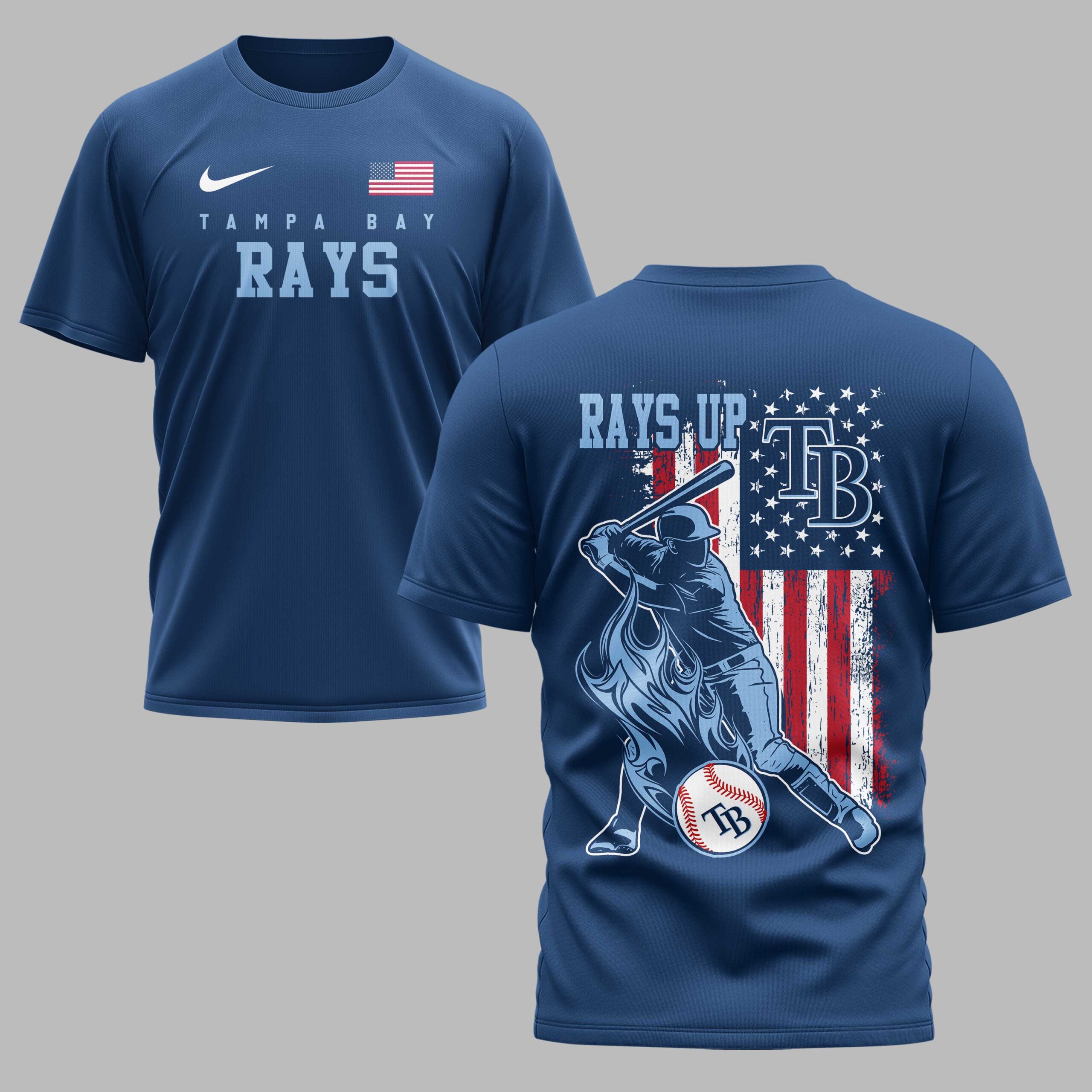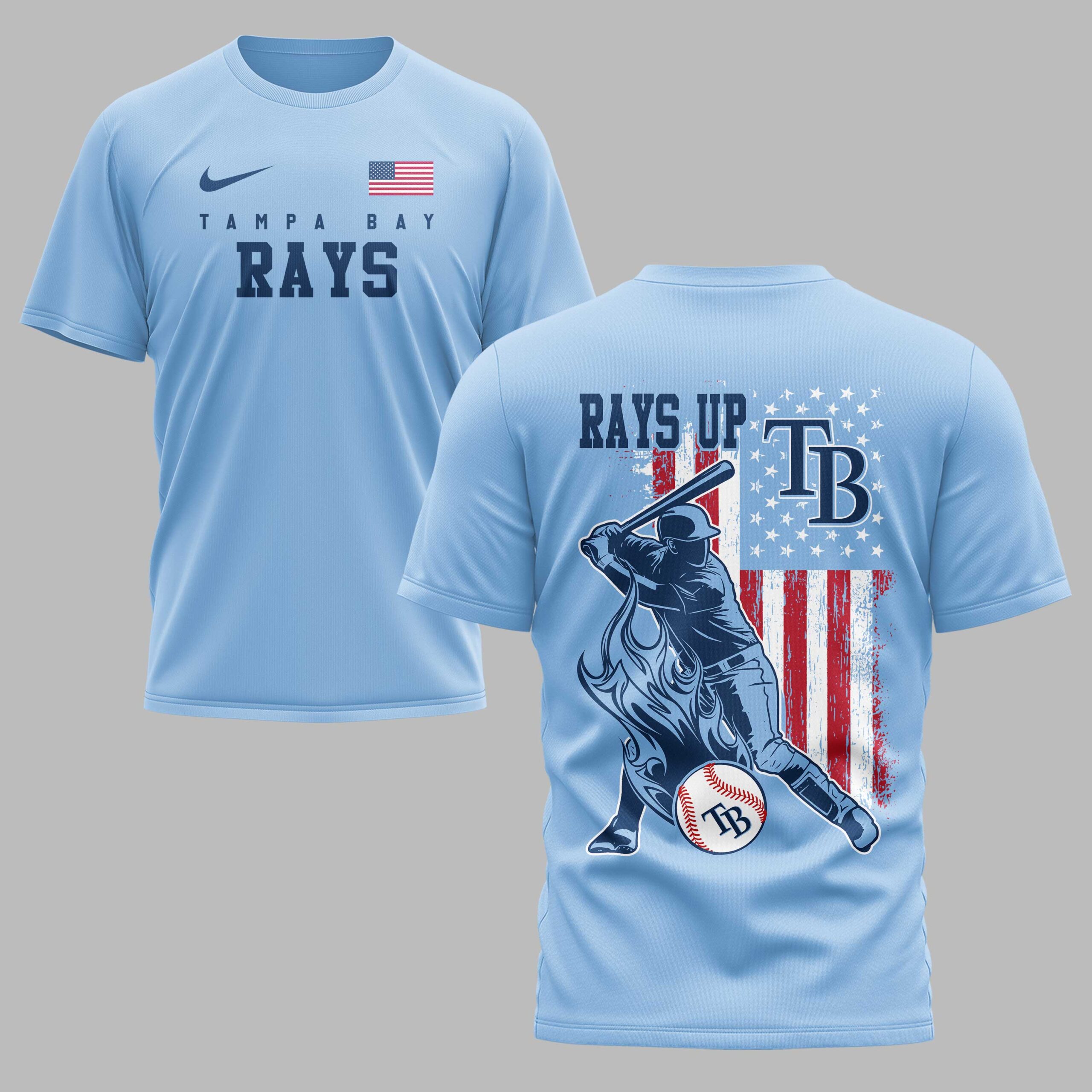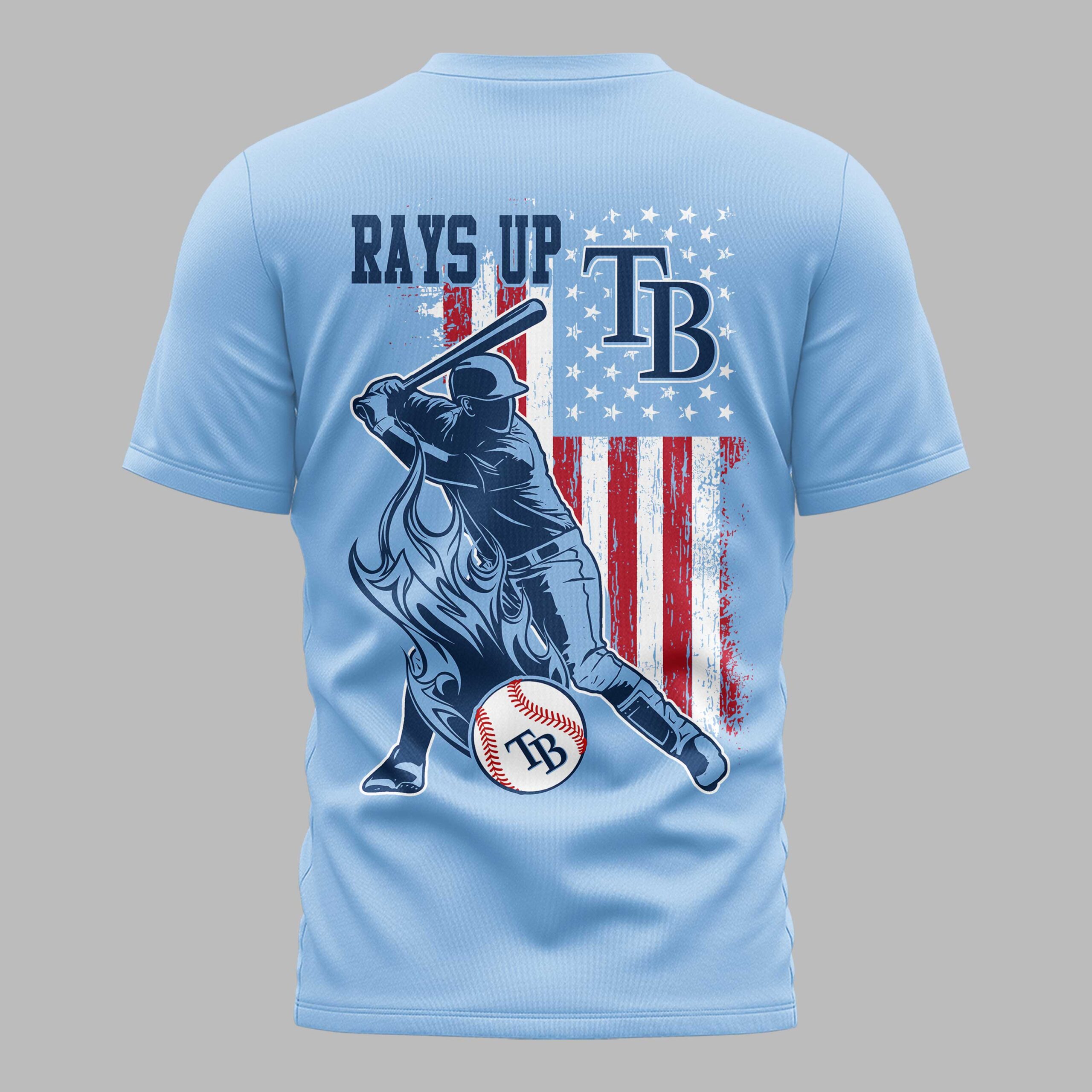 Show your ultimate support for the Tampa Bay Rays with this dynamic and patriotic t-shirt! Perfect for every devoted fan, this tee embodies the spirit of American baseball and your passionate team pride, making it an essential addition to your game day wardrobe. The front displays ‘TAMPA BAY RAYS’ in light blue, highlighted by an American flag. The back design features a powerful baseball player mid-swing over a distressed American flag. ‘RAYS UP’ is boldly written above, with the ‘TB’ logo incorporated into the flag and on a baseball, completed by dynamic flame graphics. Perfect for cheering at the ballpark, fan gatherings, or casual wear, this shirt is designed to make a statement. Showcase your loyalty to the Rays and your love for the game at every event or daily outing.