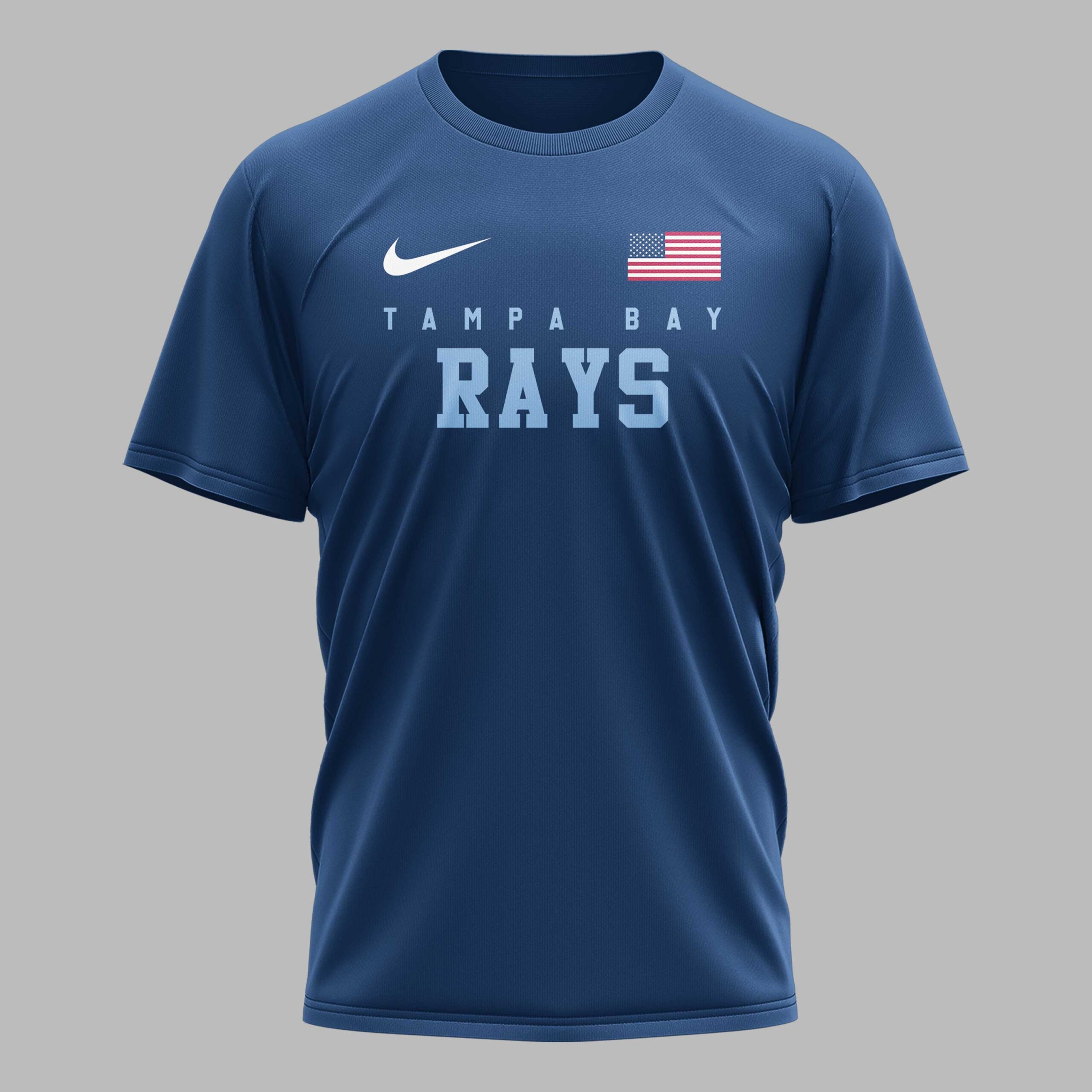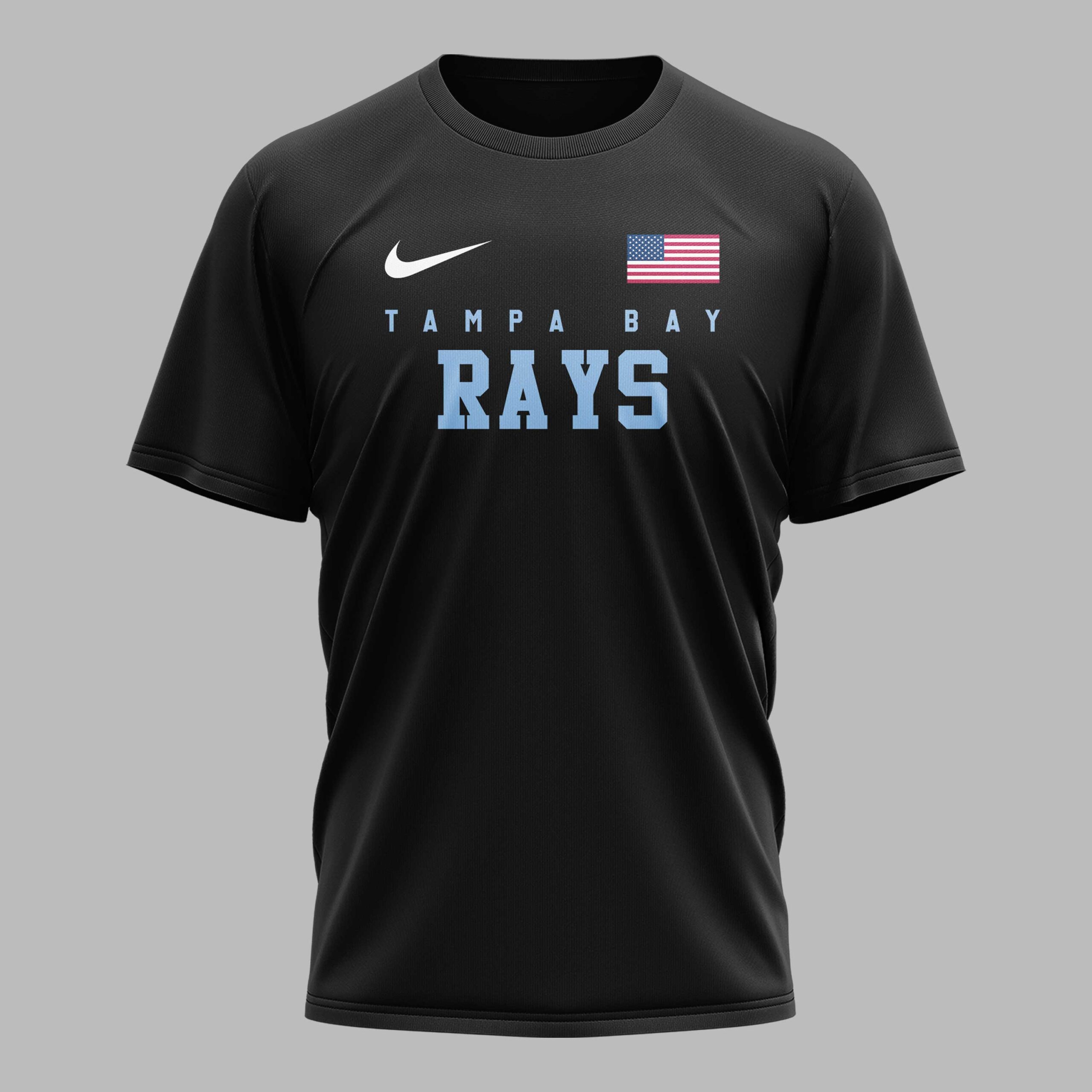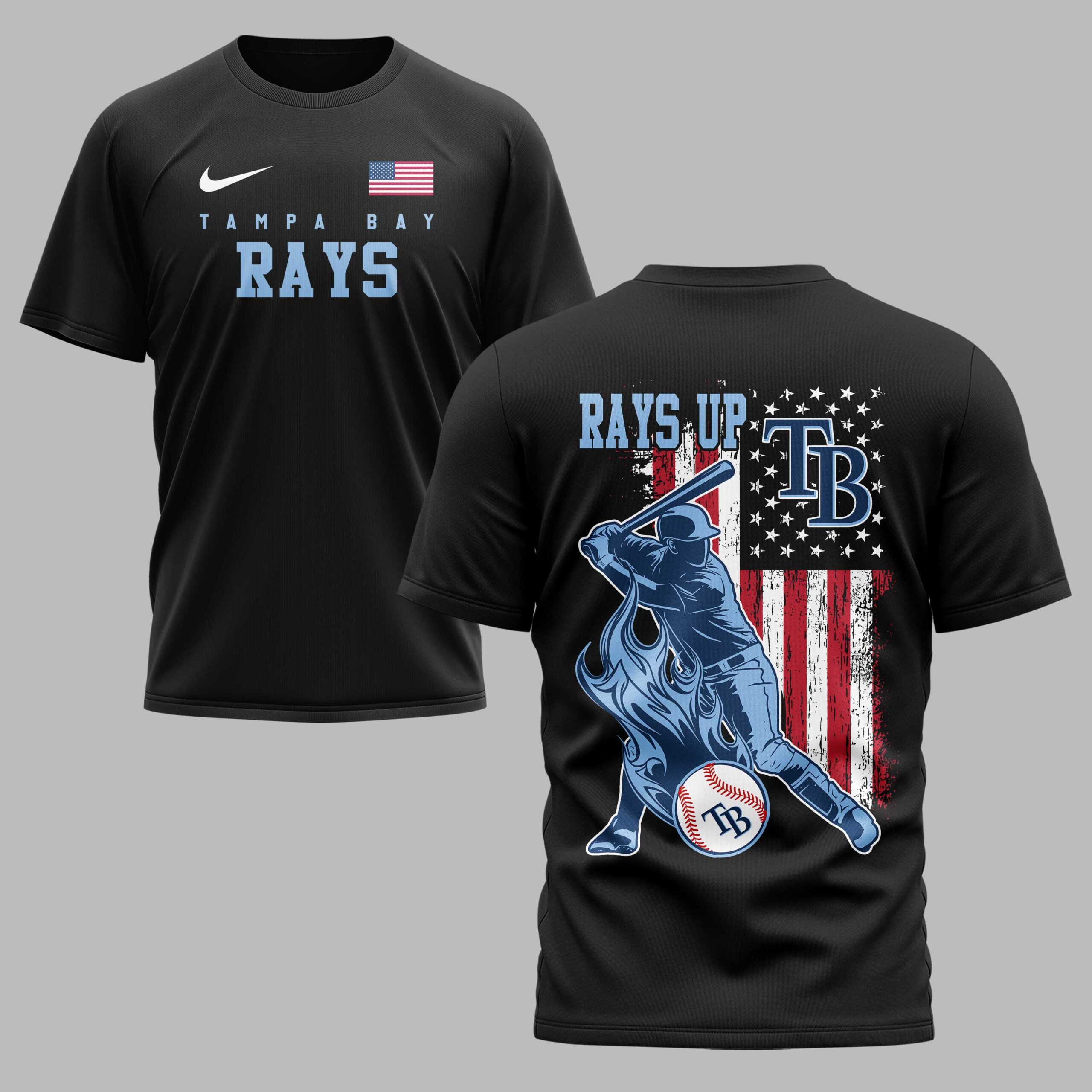 Show your ultimate support for the Tampa Bay Rays with this dynamic and patriotic t-shirt! Perfect for every devoted fan, this tee embodies the spirit of American baseball and your passionate team pride, making it an essential addition to your game day wardrobe. The front displays ‘TAMPA BAY RAYS’ in light blue, highlighted by an American flag. The back design features a powerful baseball player mid-swing over a distressed American flag. ‘RAYS UP’ is boldly written above, with the ‘TB’ logo incorporated into the flag and on a baseball, completed by dynamic flame graphics. Perfect for cheering at the ballpark, fan gatherings, or casual wear, this shirt is designed to make a statement. Showcase your loyalty to the Rays and your love for the game at every event or daily outing.
