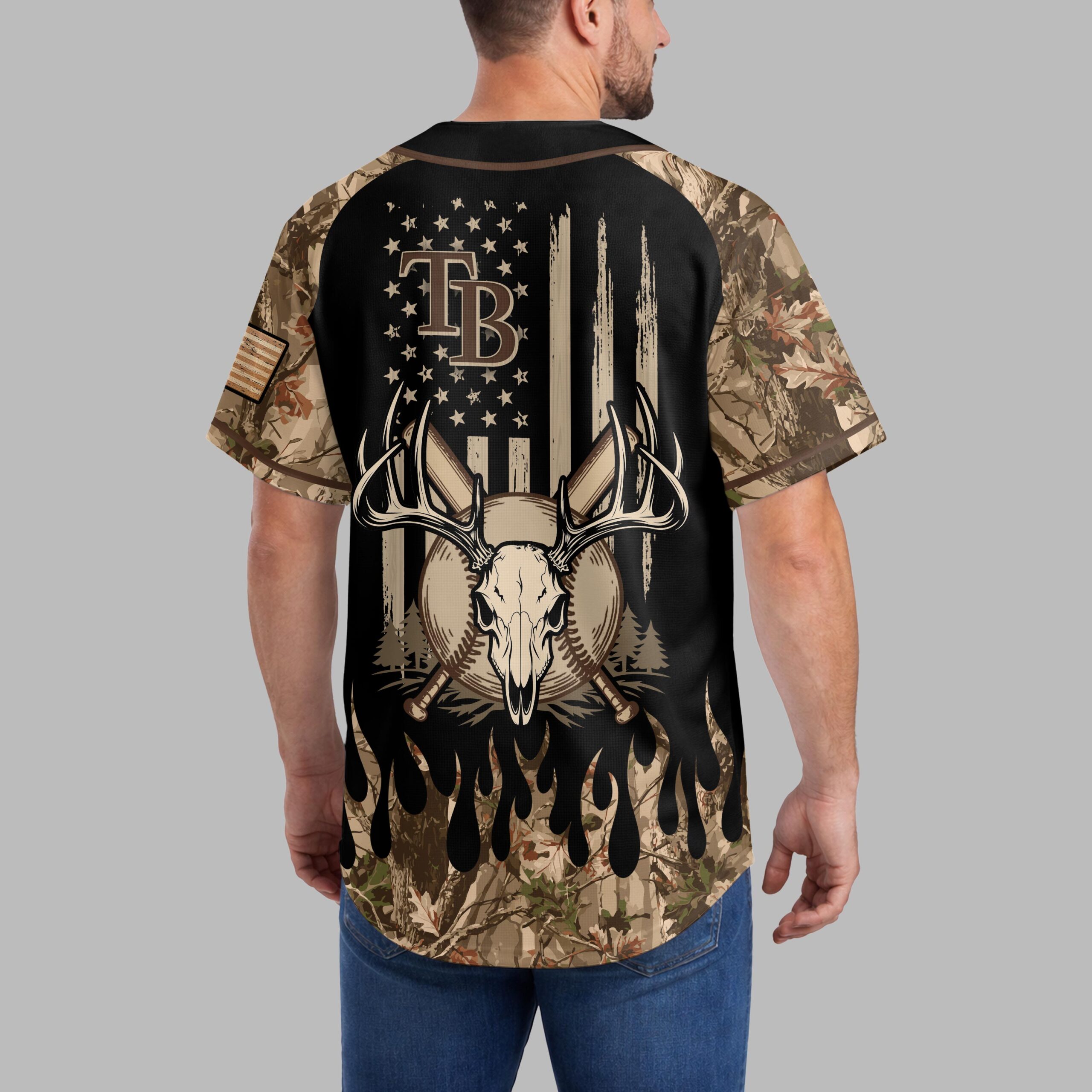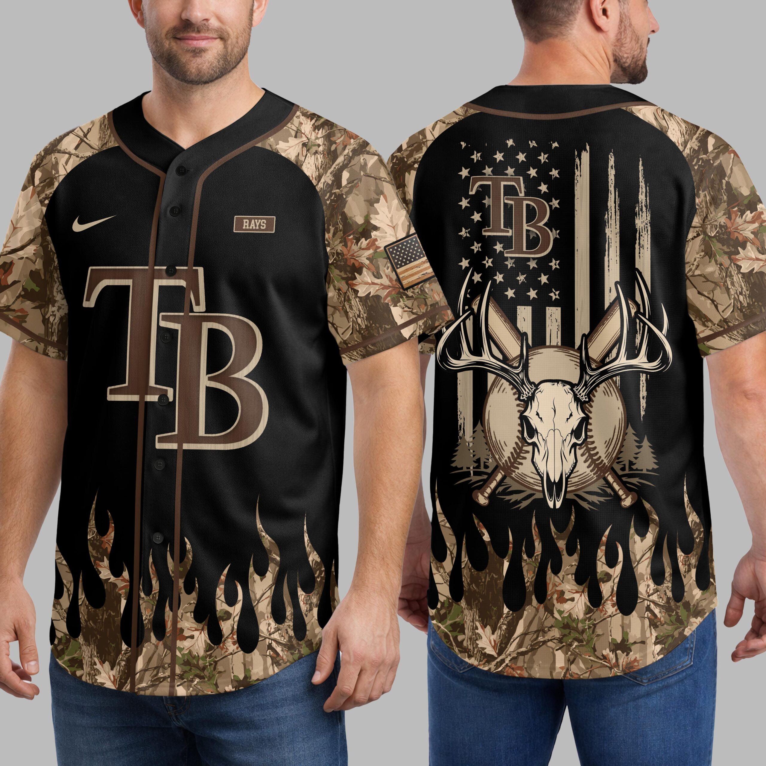 Unleash your dual passion for Tampa Bay baseball and the call of the wild with this striking jersey! Perfect for fans who live for game day and the great outdoors, this shirt blends team pride with rugged outdoor style, making it a true standout. The front proudly displays the iconic TB initials in a bold, wood-grain inspired design, framed by earthy camouflage sleeves and an aggressive camo flame pattern along the hem. Turn around, and the back showcases a powerful distressed American flag backdrop, with the TB initials prominent above a detailed deer skull, crossed baseball bats, and a silhouette of pine trees. A subtle flag patch adorns the sleeve, adding a touch of patriotic flair. Whether you’re cheering on the Rays at the ballpark, casting a line at the lake, heading to a hunting camp, or simply enjoying a casual day out, this unique jersey is designed to make a statement. It’s the ultimate gear for demonstrating your unwavering loyalty and adventurous spirit.
