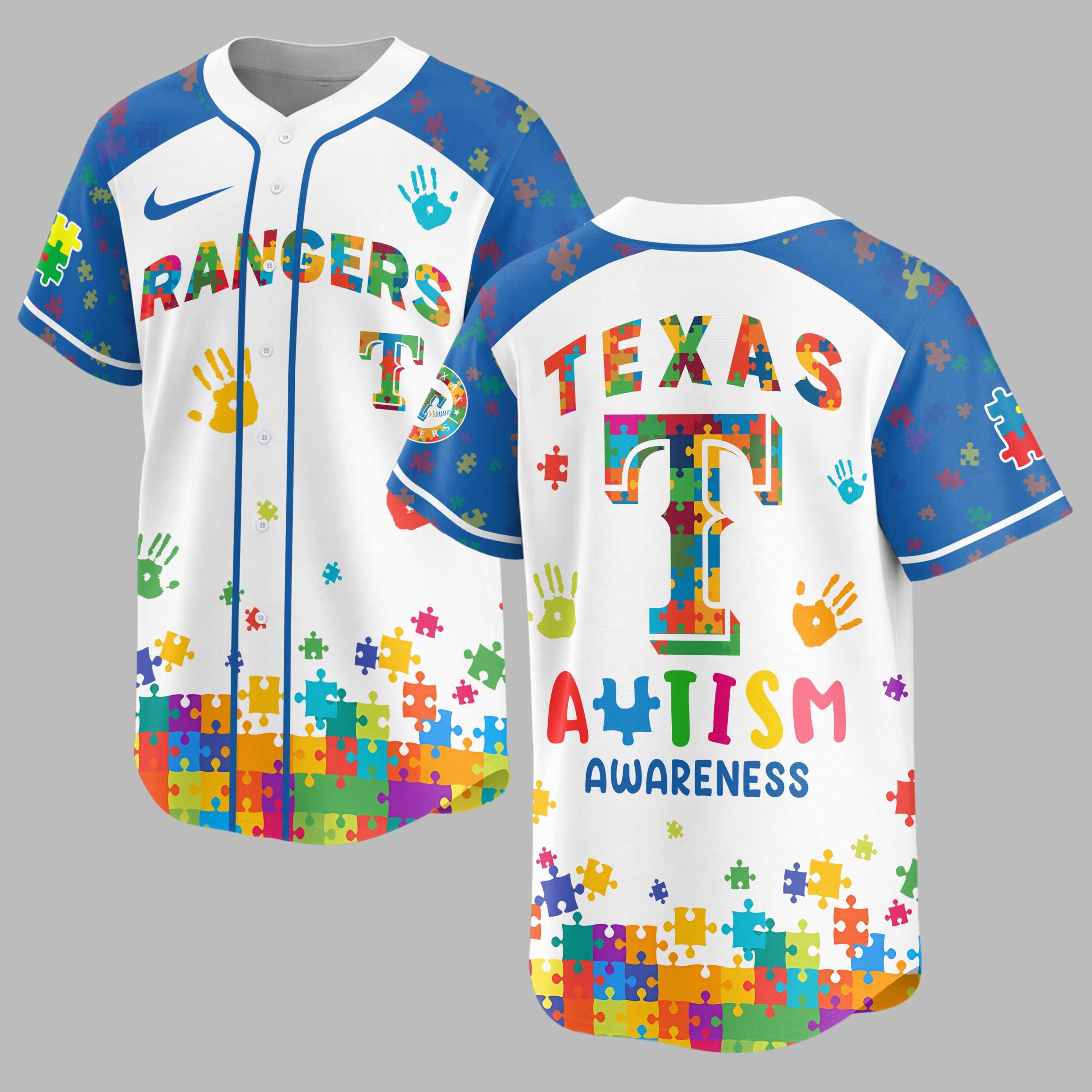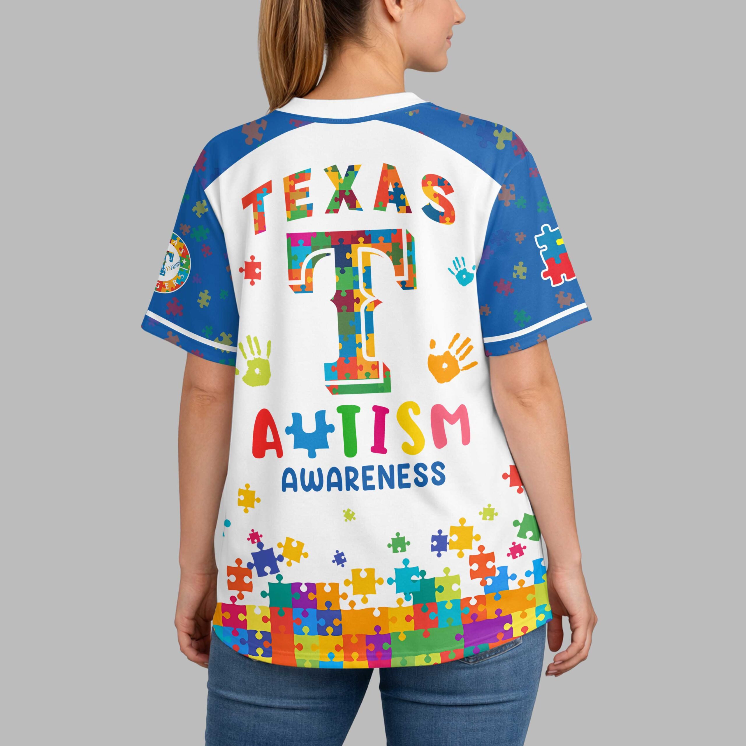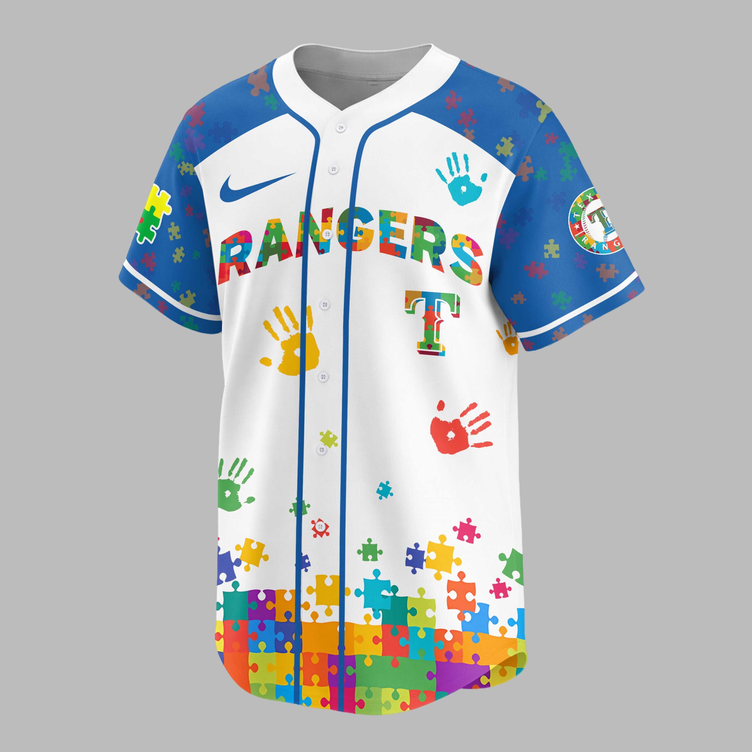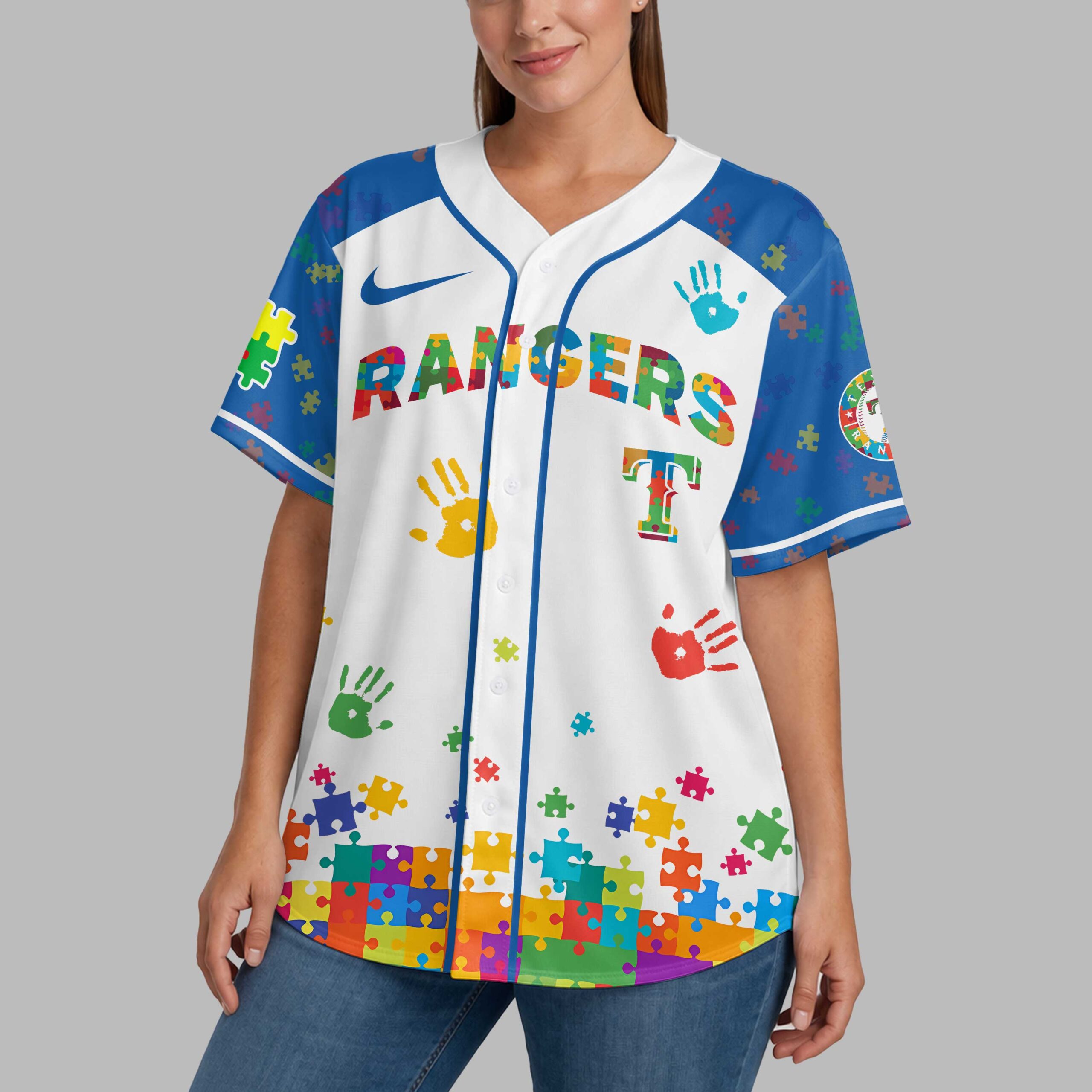 Show your unwavering support for the Texas Rangers and spread a vital message with this vibrant Autism Awareness baseball jersey! This unique design beautifully merges your passion for baseball with a heartwarming commitment to a cause close to many hearts. It’s more than just game day attire; it’s a symbol of unity and understanding. The front proudly displays RANGERS in eye-catching, colorful puzzle piece letters, accented with playful handprints and scattered puzzle pieces. The back features a bold TEXAS and a large T made of dynamic puzzle pieces, alongside AUTISM AWARENESS to clearly champion the cause. Both the front and back are finished with a vibrant band of puzzle pieces along the bottom hem, symbolizing the beautiful complexity of the autism community. Perfect for cheering on the Rangers at the ballpark, attending autism awareness events, or simply showcasing your pride and support in your daily life. Wear it with heart to every game, community gathering, or casual outing to make a meaningful statement and connect with others.