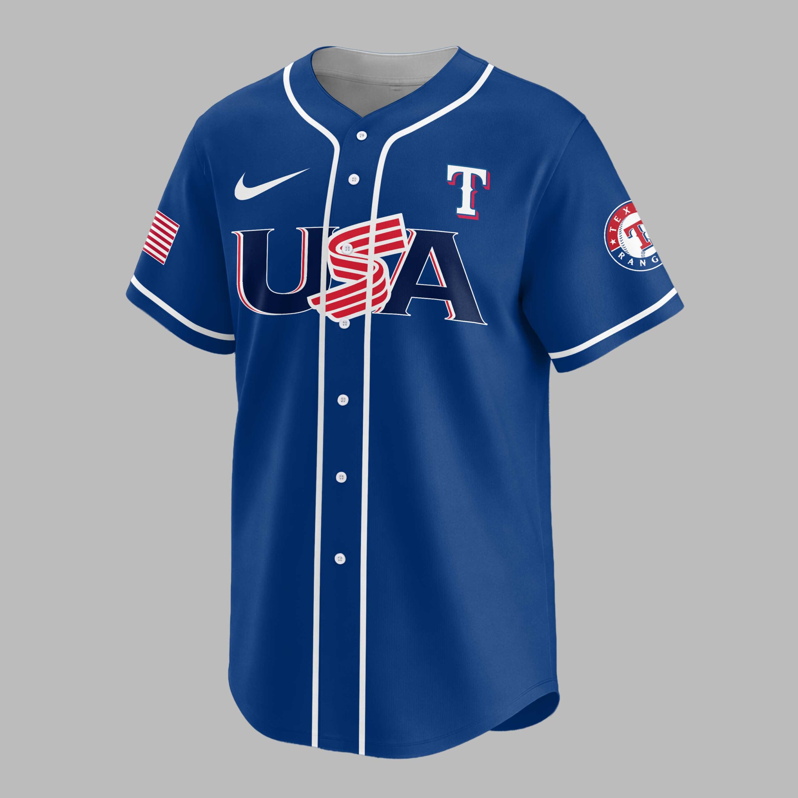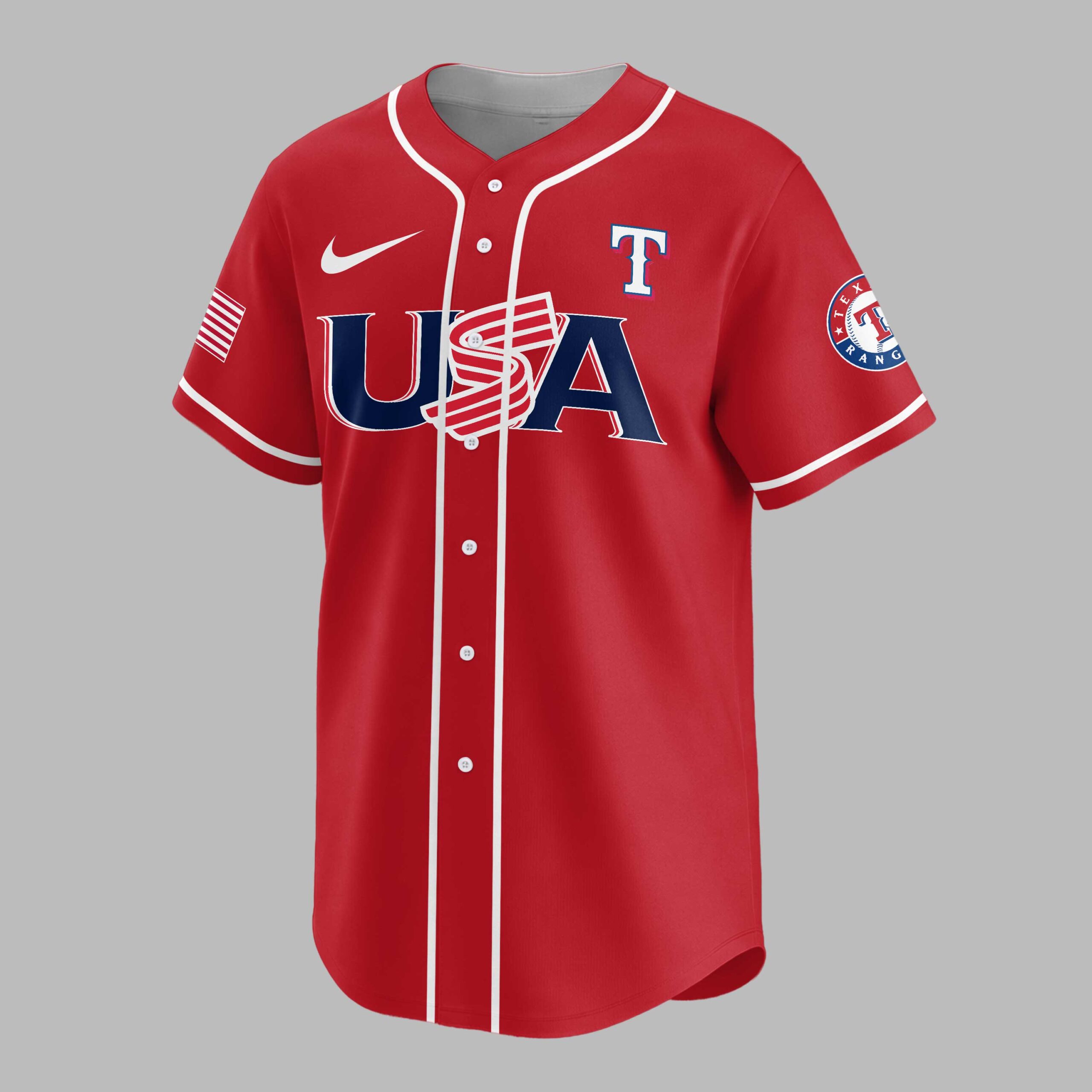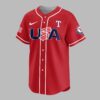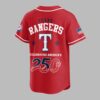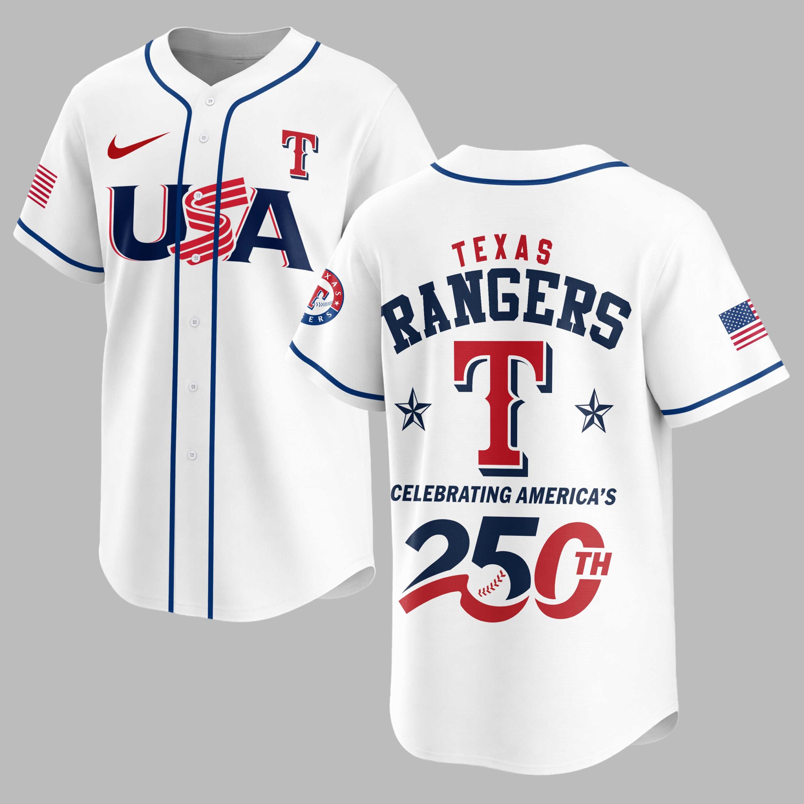Celebrate your Texas Rangers pride and America’s 250th anniversary with this vibrant red baseball jersey! It’s the ultimate fan gear, blending team spirit and national patriotism to honor your favorite squad and a monumental moment in US history. The front boldly features USA in blue with stripes, plus the iconic Texas Rangers T logo and Nike swoosh. Sleeves showcase a stylized American flag and the team’s emblem. The back commands attention with TEXAS RANGERS above a large T, and the prominent CELEBRATING AMERICA’S 250TH, where the ‘0’ cleverly forms a baseball, flanked by patriotic stars and a full American flag. Perfect for electrifying game days, Fourth of July celebrations, or any event to proudly showcase your dual loyalty. Wear it to the ballpark or any gathering, making a spirited statement of pride for the Rangers and USA.