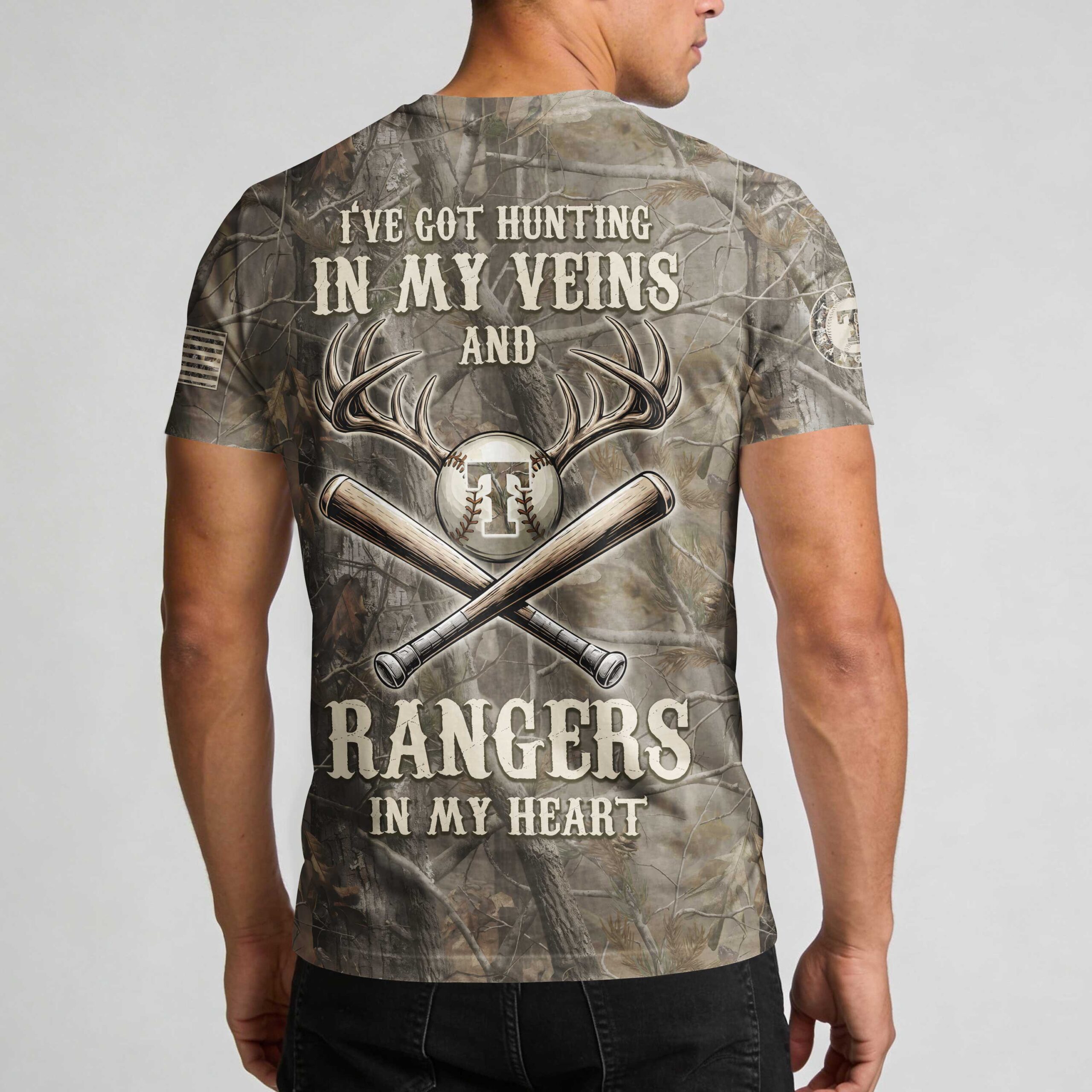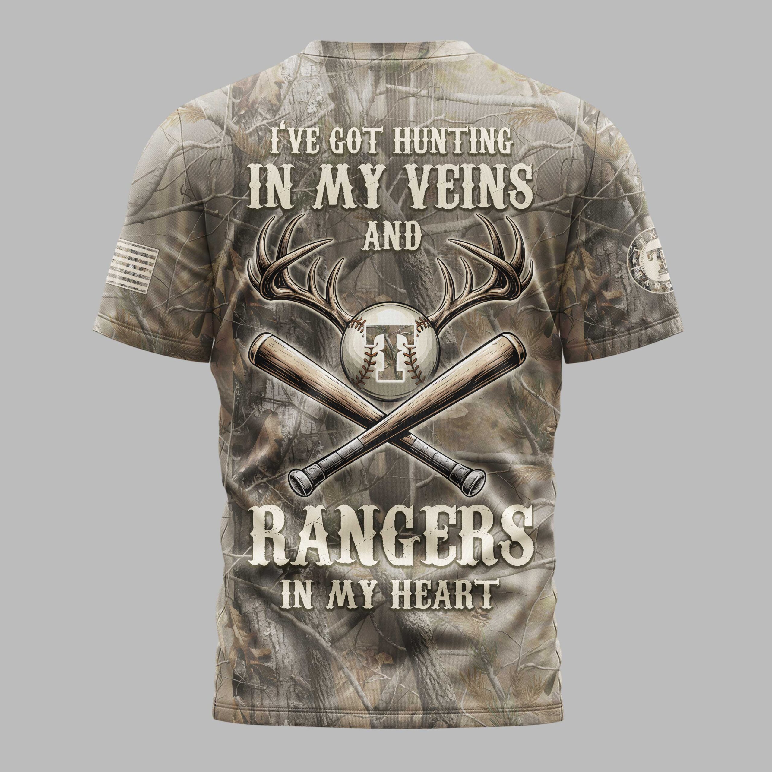 Showcase your unwavering passion for the Texas Rangers and the great outdoors with this distinctive camouflage t-shirt. This unique tee perfectly blends team spirit with your love for hunting, making a bold statement about your true Texas allegiance. The front proudly displays TEXAS RANGERS in a distressed font against woodland camo. The back declares, I’VE GOT HUNTING IN MY VEINS AND RANGERS IN MY HEART, with a deer antler, team logo baseball, and crossed bats. An American flag detail adorns the sleeve. Perfect for game days, hunting trips, tailgates, or everyday comfort. This shirt is more than clothing; it’s a declaration of your lifestyle, proudly worn from the diamond to the deer stand.