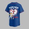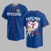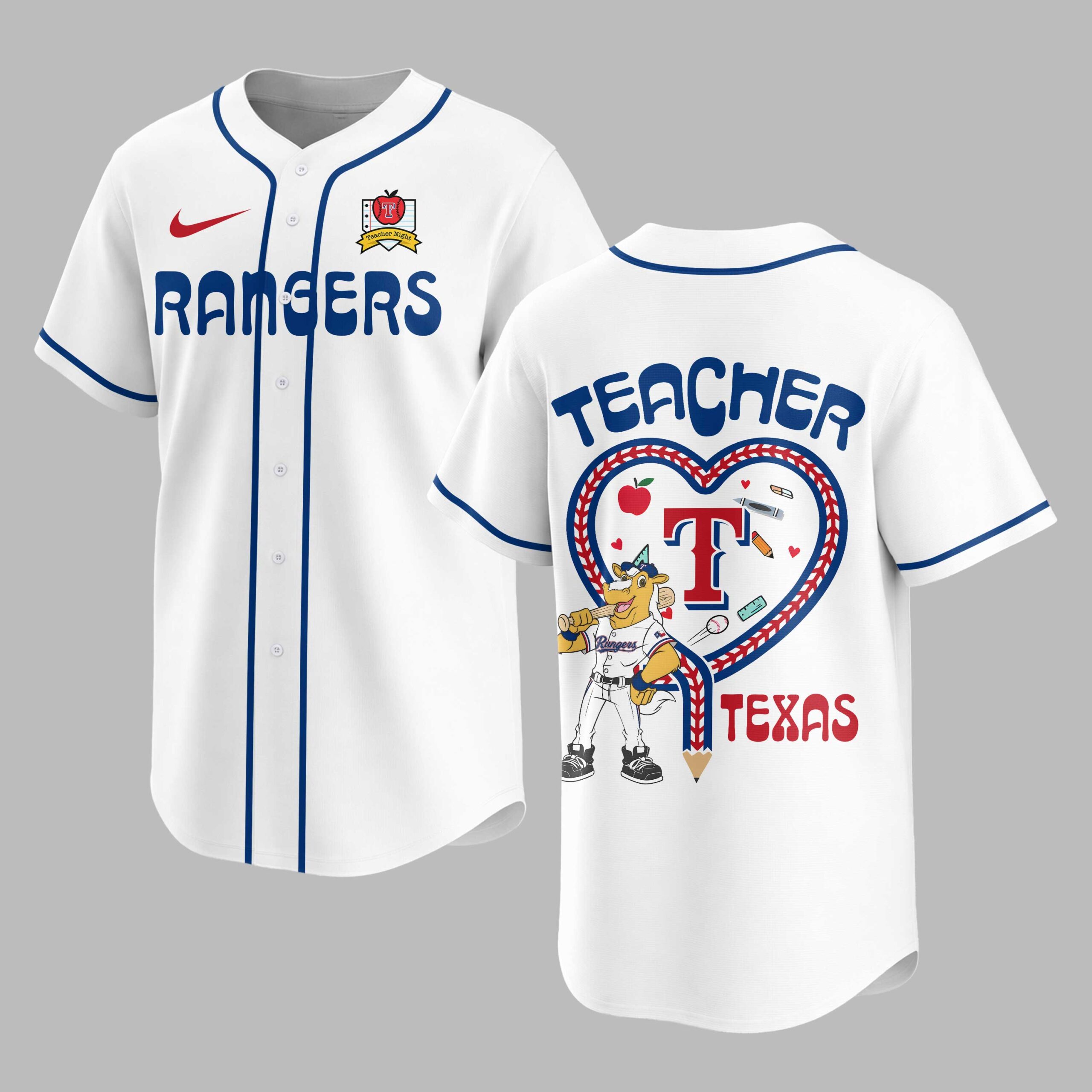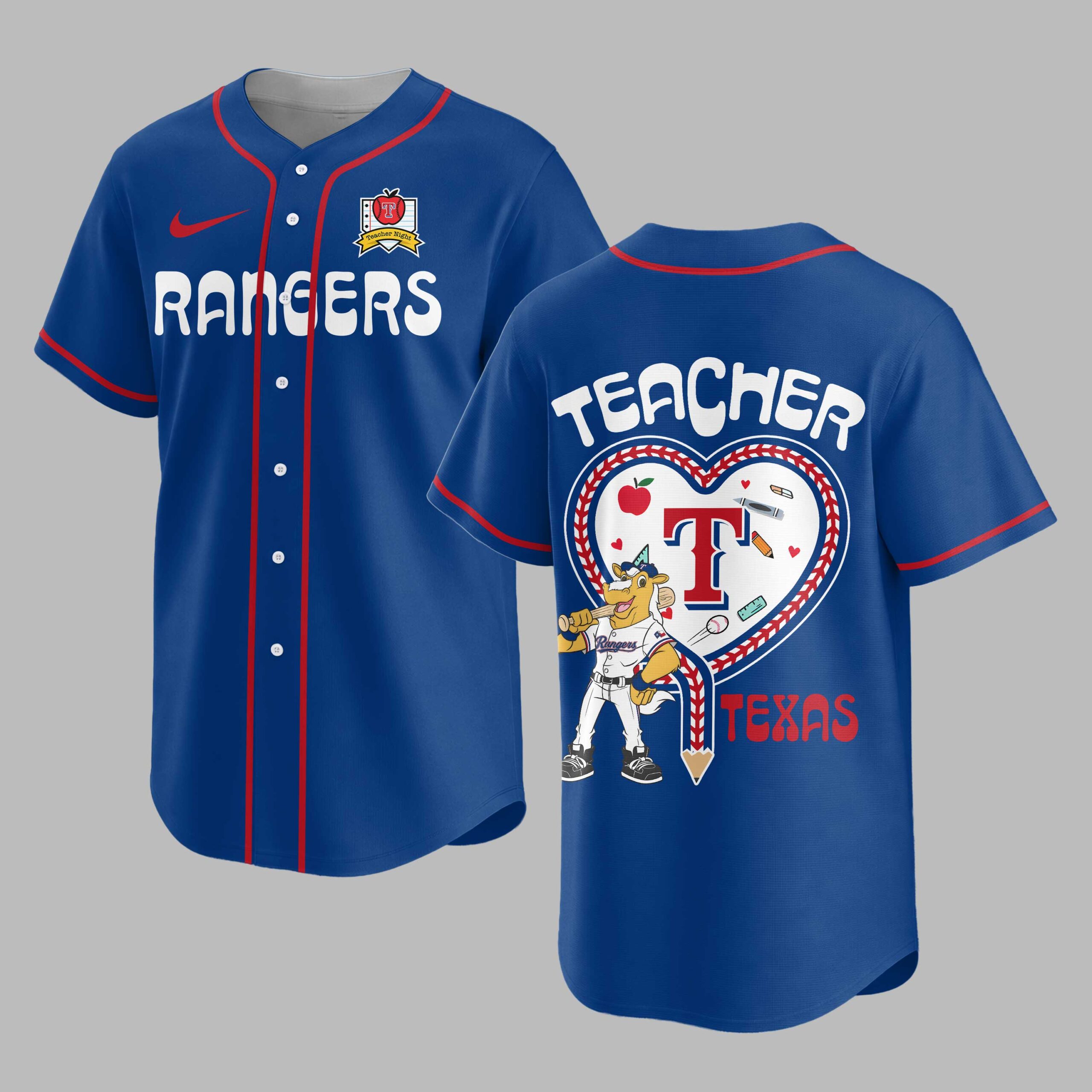 Celebrate your passion for teaching and your love for the Texas Rangers with this unique baseball jersey! Designed for dedicated educators and devoted fans, this shirt is the perfect way to show off your dual pride. It beautifully combines the spirit of the game with a heartfelt tribute to the teaching profession. The front proudly displays the RANGERS name in bold blue, accented by a subtle Nike swoosh and a special Teacher Night emblem featuring an apple and a baseball-themed T. The back is a true masterpiece, with TEACHER emblazoned above a large heart outline made of baseball stitches. Inside the heart, an adorable Rangers mascot swings a bat alongside school essentials like an apple, crayons, and a T with a flag pattern, all capped by TEXAS below. Two pencils smartly form the base of the heart, adding a charming touch. This jersey is ideal for cheering on the Rangers at the ballpark, especially during Teacher Appreciation events. It’s also perfect for casual Fridays at school, community gatherings, or simply showcasing your educator and fan identity every day.