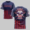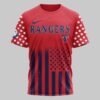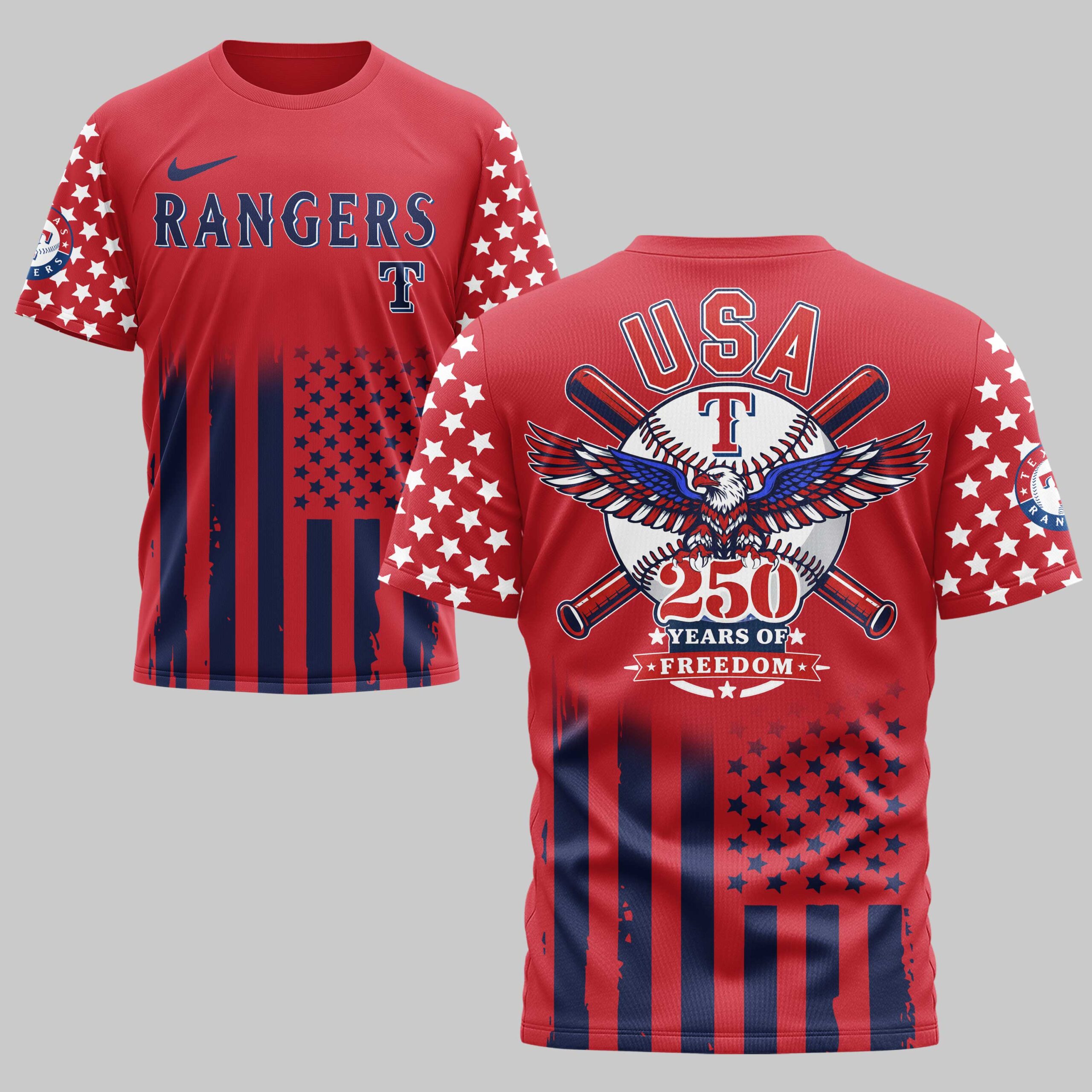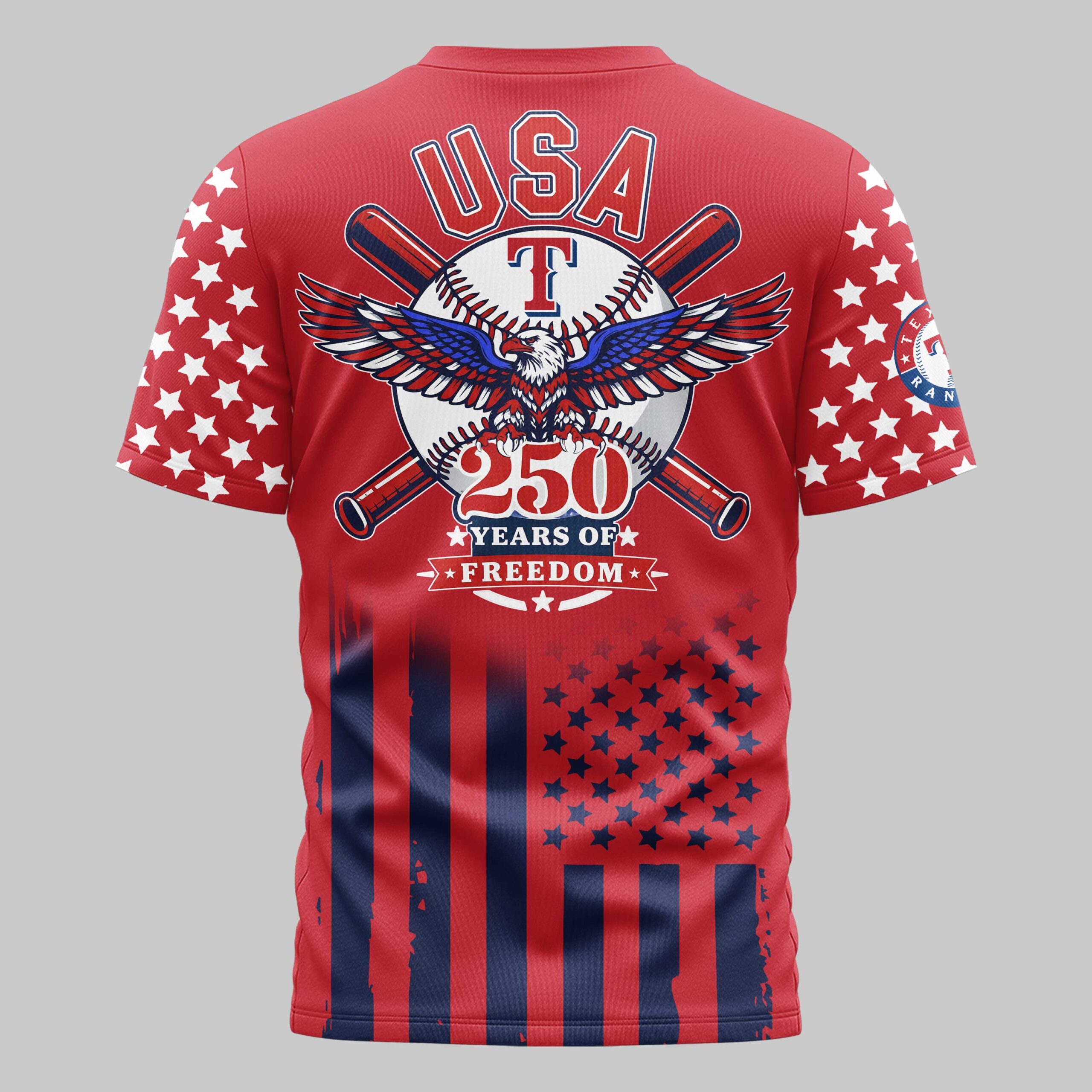 Show your unwavering Texas Rangers pride while honoring a historic national milestone with the Texas Rangers USA 250 Independence Baseball Fan T-Shirt. This energetic design seamlessly blends your passion for the game with a powerful patriotic tribute, making it a standout piece for any true fan. The front prominently displays RANGERS and the signature T logo over a distressed red and blue American flag pattern that flows into star-spangled sleeves. The back features an intricate graphic of a majestic bald eagle in front of a large baseball, framed by crossed bats and the USA 250 Years of Freedom commemorative text. This detailed artwork creates a bold, celebratory aesthetic that captures the heart of American baseball. Perfect for a sunny day at the ballpark, a Fourth of July celebration, or casual everyday wear, this shirt ensures you represent Texas with pride. Stand tall and celebrate your team and country in style.