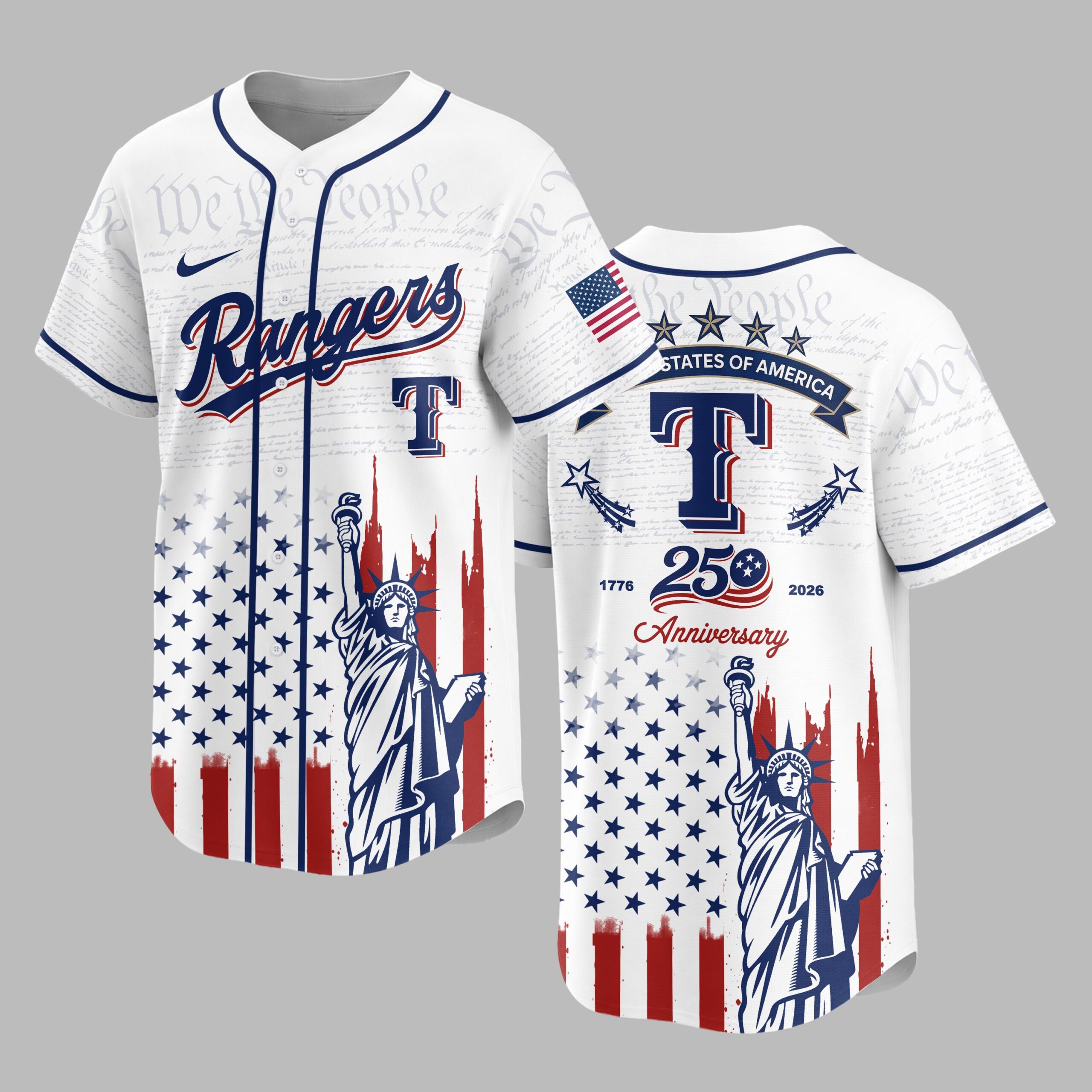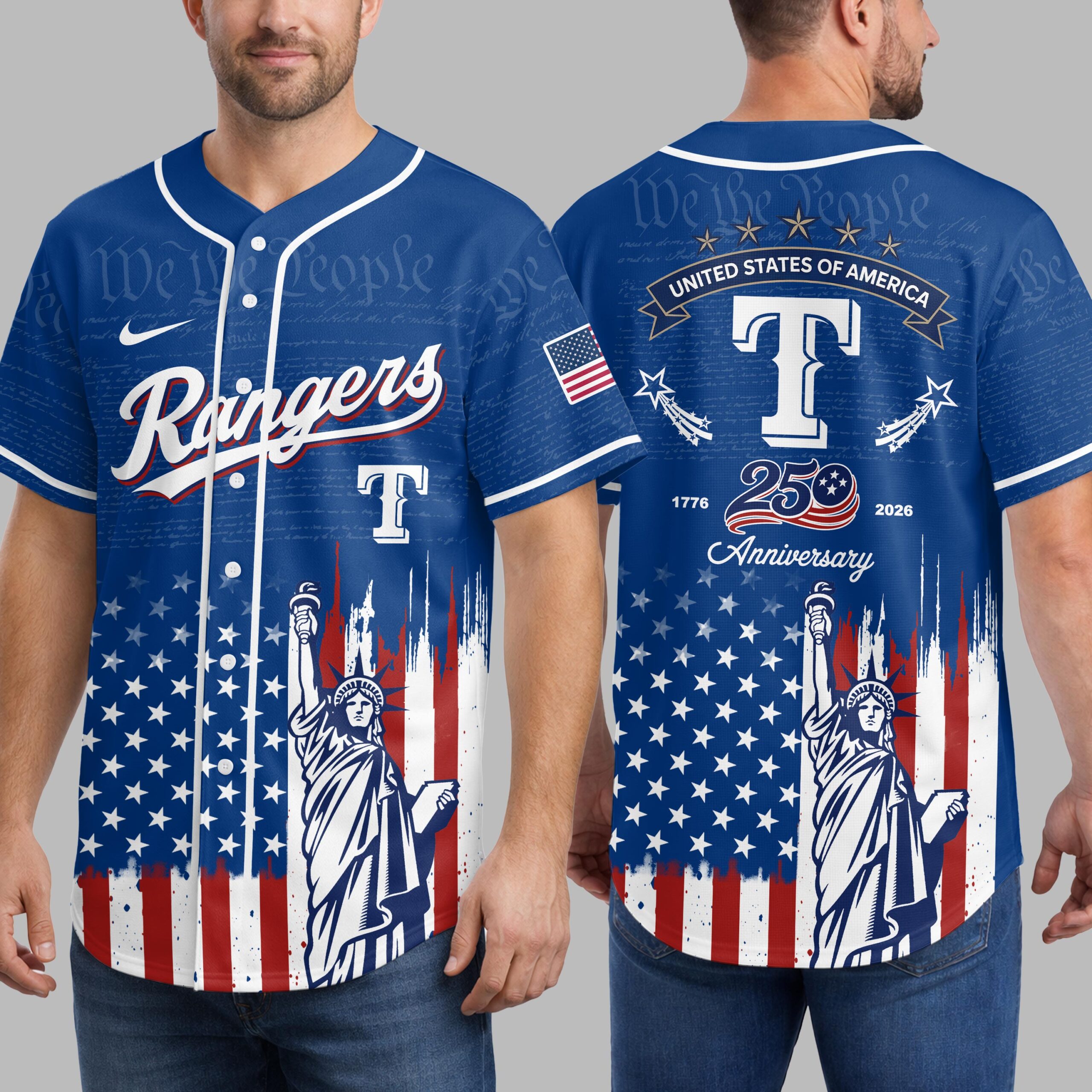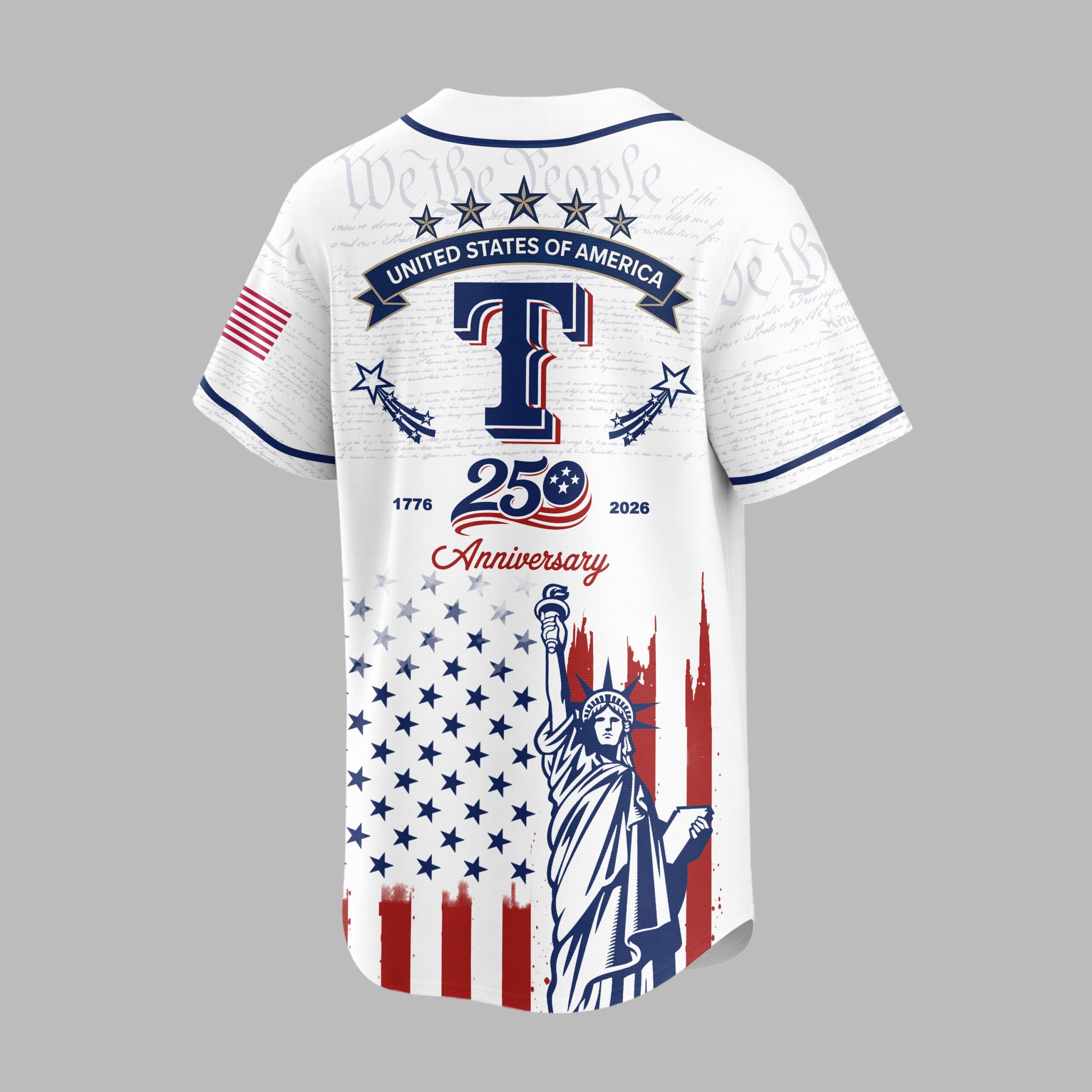 Celebrate both your team and your nation with this unique Rangers patriotic baseball jersey! This shirt beautifully blends the spirit of American independence with your passion for the game, commemorating the historic 250th anniversary of the United States. It’s a bold declaration of pride for both your favorite team and the enduring values of the USA. The front features Rangers in a classic script over a large T, set against a subtle background of We the People from the Constitution. Below, a distressed American flag design unfurls, proudly showcasing the iconic Statue of Liberty. The back continues this powerful theme with an American flag patch, STATES OF AMERICA banner, and a prominent 250 Anniversary graphic, flanked by 1776 and 2026, all atop the distressed flag and Statue of Liberty motif. Perfect for game days, Fourth of July celebrations, historical commemorations, or any occasion where you want to display your American pride alongside your team allegiance. This jersey is ideal for showing off your patriotism and love for baseball in one powerful statement.