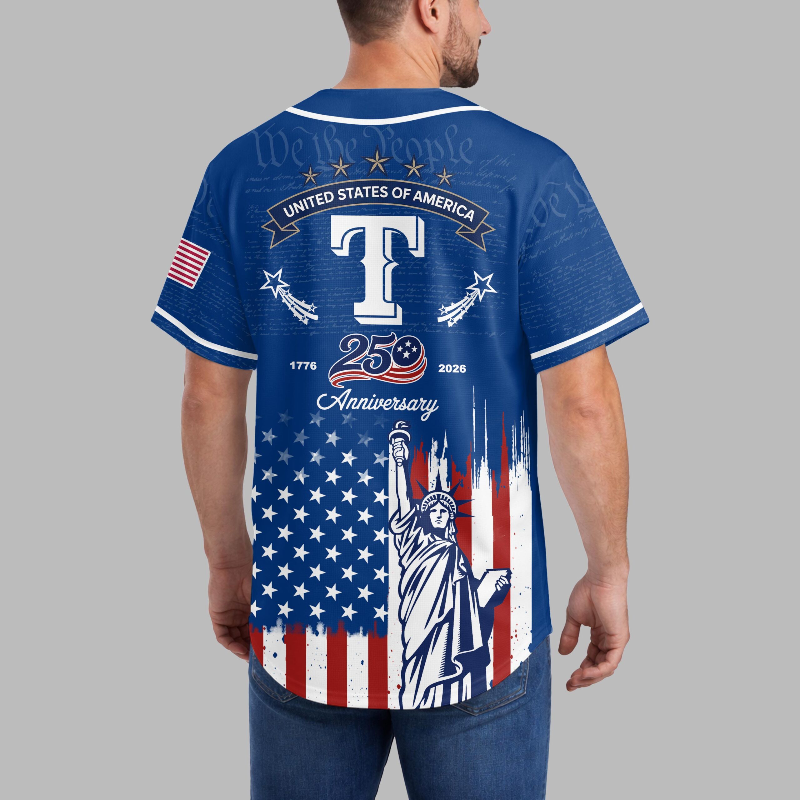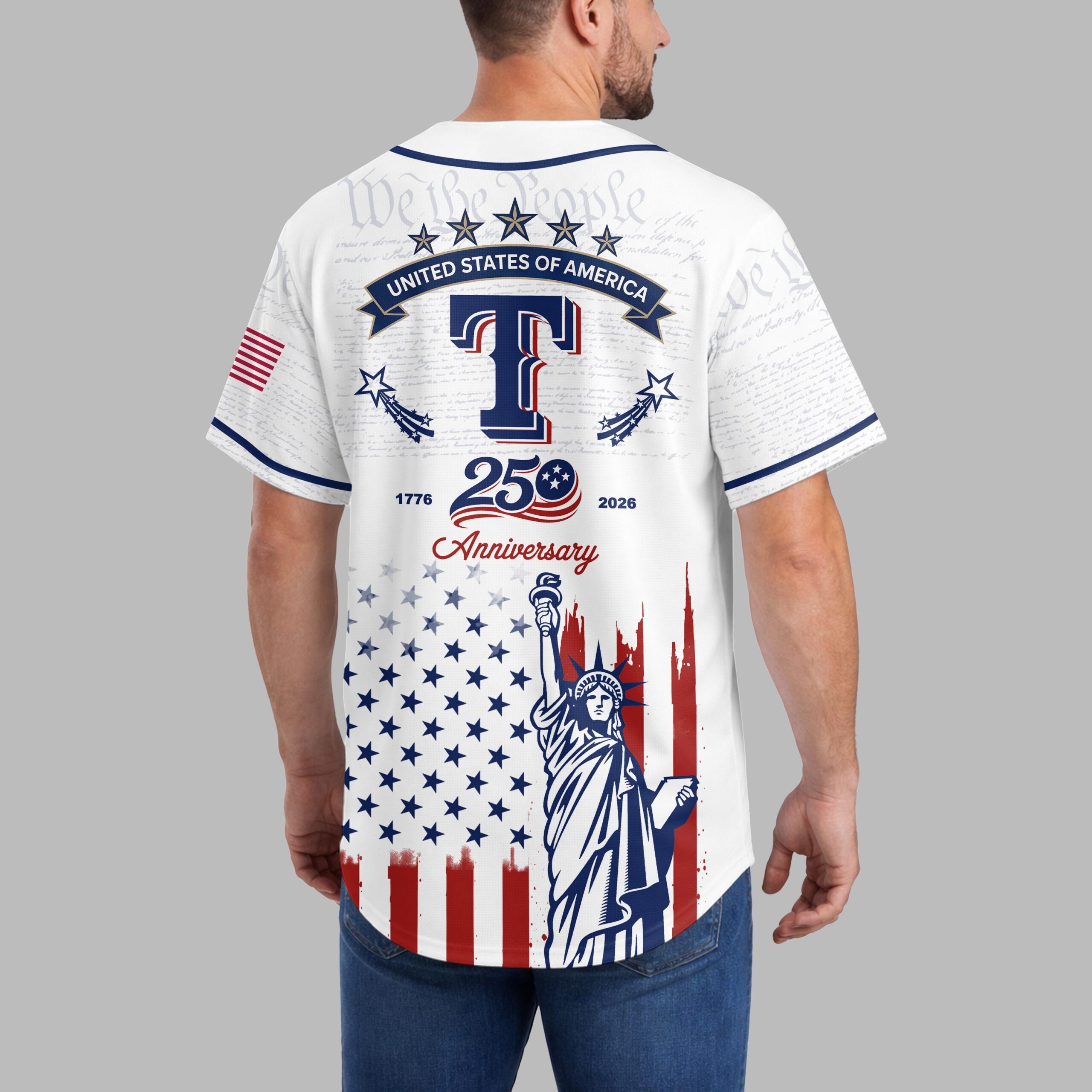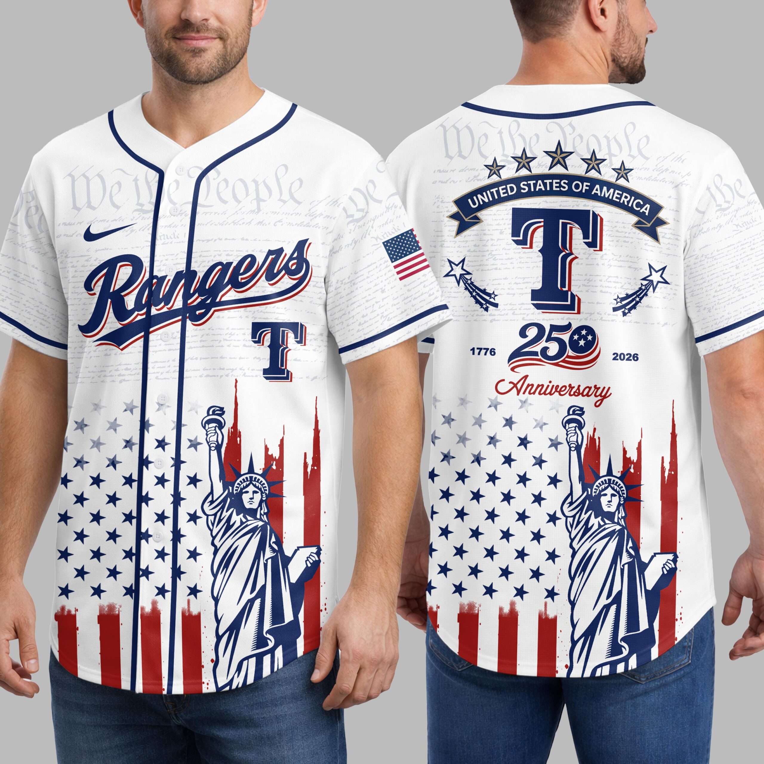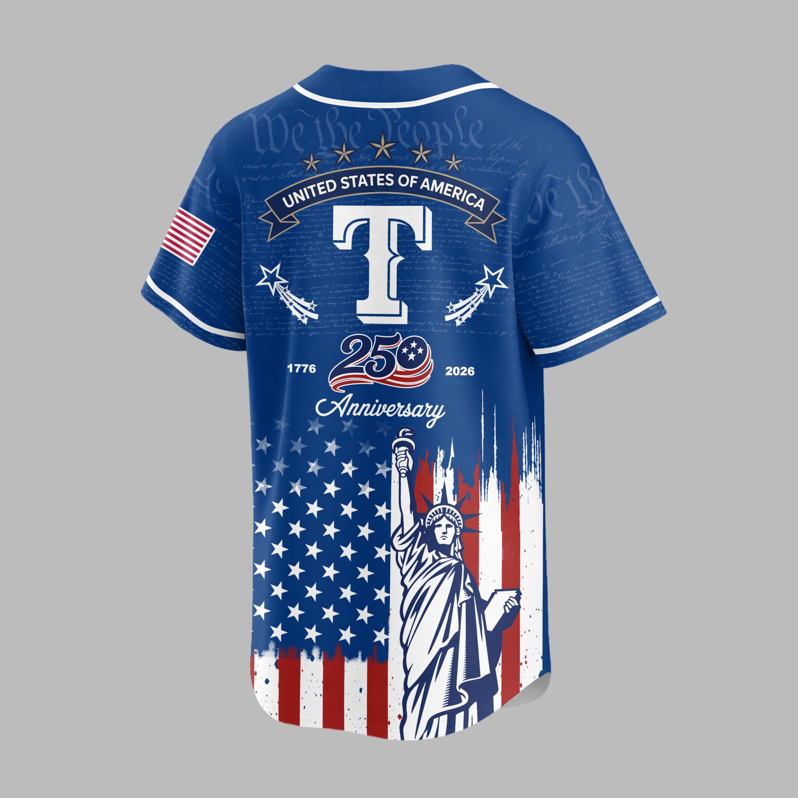 Celebrate both your team and your nation with this unique Rangers patriotic baseball jersey! This shirt beautifully blends the spirit of American independence with your passion for the game, commemorating the historic 250th anniversary of the United States. It’s a bold declaration of pride for both your favorite team and the enduring values of the USA. The front features Rangers in a classic script over a large T, set against a subtle background of We the People from the Constitution. Below, a distressed American flag design unfurls, proudly showcasing the iconic Statue of Liberty. The back continues this powerful theme with an American flag patch, STATES OF AMERICA banner, and a prominent 250 Anniversary graphic, flanked by 1776 and 2026, all atop the distressed flag and Statue of Liberty motif. Perfect for game days, Fourth of July celebrations, historical commemorations, or any occasion where you want to display your American pride alongside your team allegiance. This jersey is ideal for showing off your patriotism and love for baseball in one powerful statement.