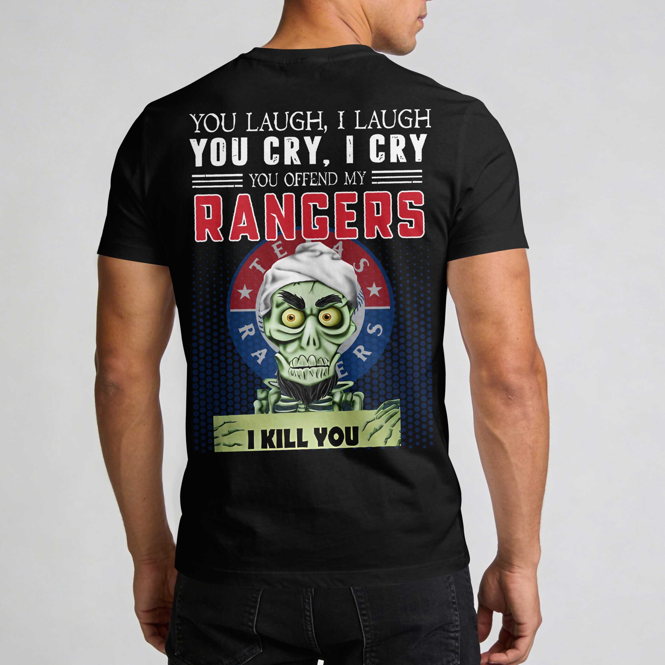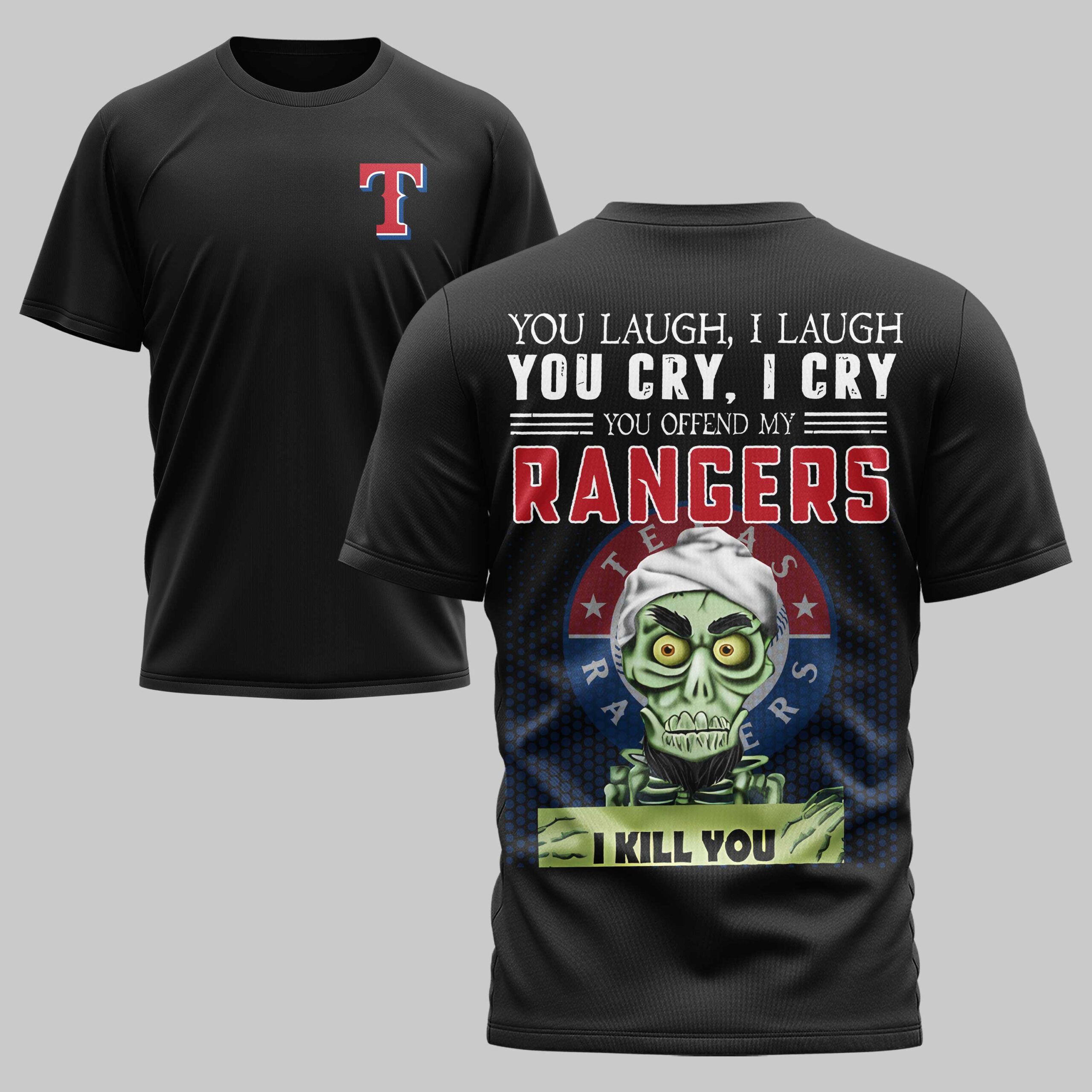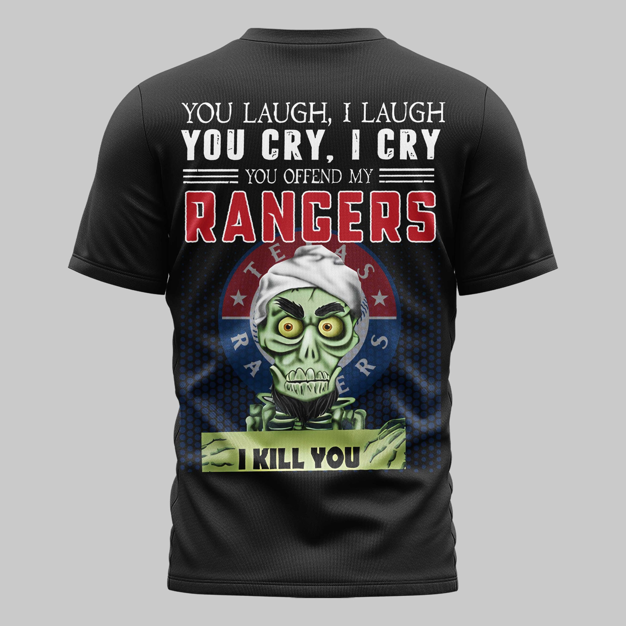 Show your unwavering loyalty to the Lone Star State’s favorite team with this bold Texas Rangers gear. This shirt captures the fierce spirit of Rangers fans, offering a unique way to stand out in the crowd while honoring the team’s legacy. It is designed specifically for die-hard supporters who live and breathe every inning, combining team pride with a touch of rugged attitude. The front features the iconic red and blue T logo on the chest for a classic look. The back makes a powerful statement with a humorous and intimidating graphic reading, You offend my Rangers, I kill you, paired with a stylized skeletal character. This eye-catching design is layered over the official Texas Rangers roundel, making your team allegiance undeniable from every angle. Perfect for game days at Globe Life Field or Independence Day celebrations, this shirt is a must-have for any wardrobe. Whether you are at the ballpark, a summer BBQ, or just out on the town, represent your team with total pride.
