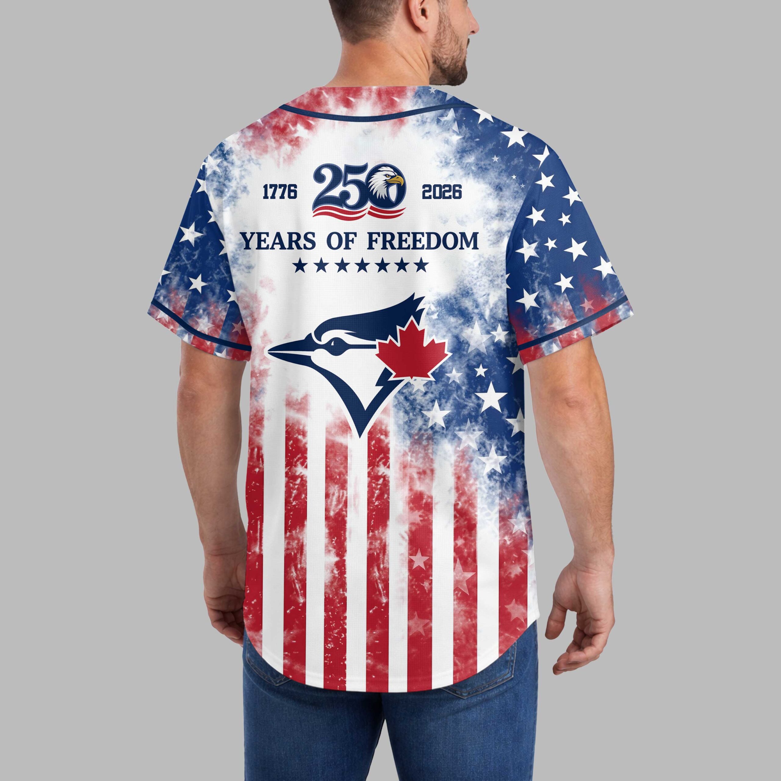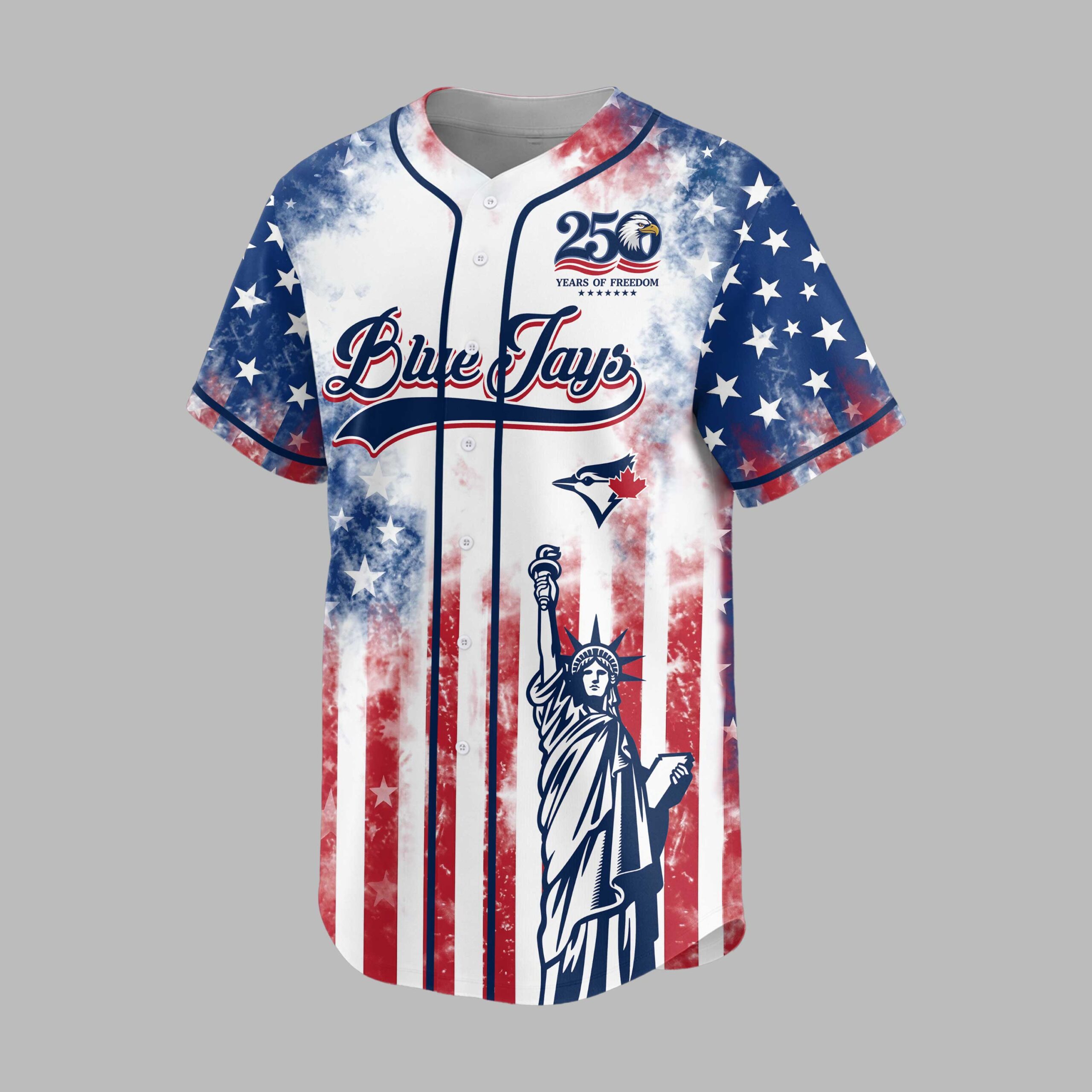 Celebrate your passion for baseball and American liberty with this dynamic Blue Jays patriotic jersey! It blends team spirit with a powerful message of freedom, perfect for fans cherishing their team and national pride. Honor a significant anniversary while supporting the Blue Jays. The vivid design features a distressed American flag background with bold red and white stripes and scattered stars. The front proudly displays Blue Jays script, the iconic Statue of Liberty, and a prominent 250 YEARS OF FREEDOM emblem with an eagle. The back showcases 1776 250 2026 YEARS OF FREEDOM and the distinctive Blue Jays logo. This striking jersey is ideal for game days, Fourth of July, or any event displaying patriotism and team loyalty. Stand out and commemorate 250 years of independence with unmistakable style.